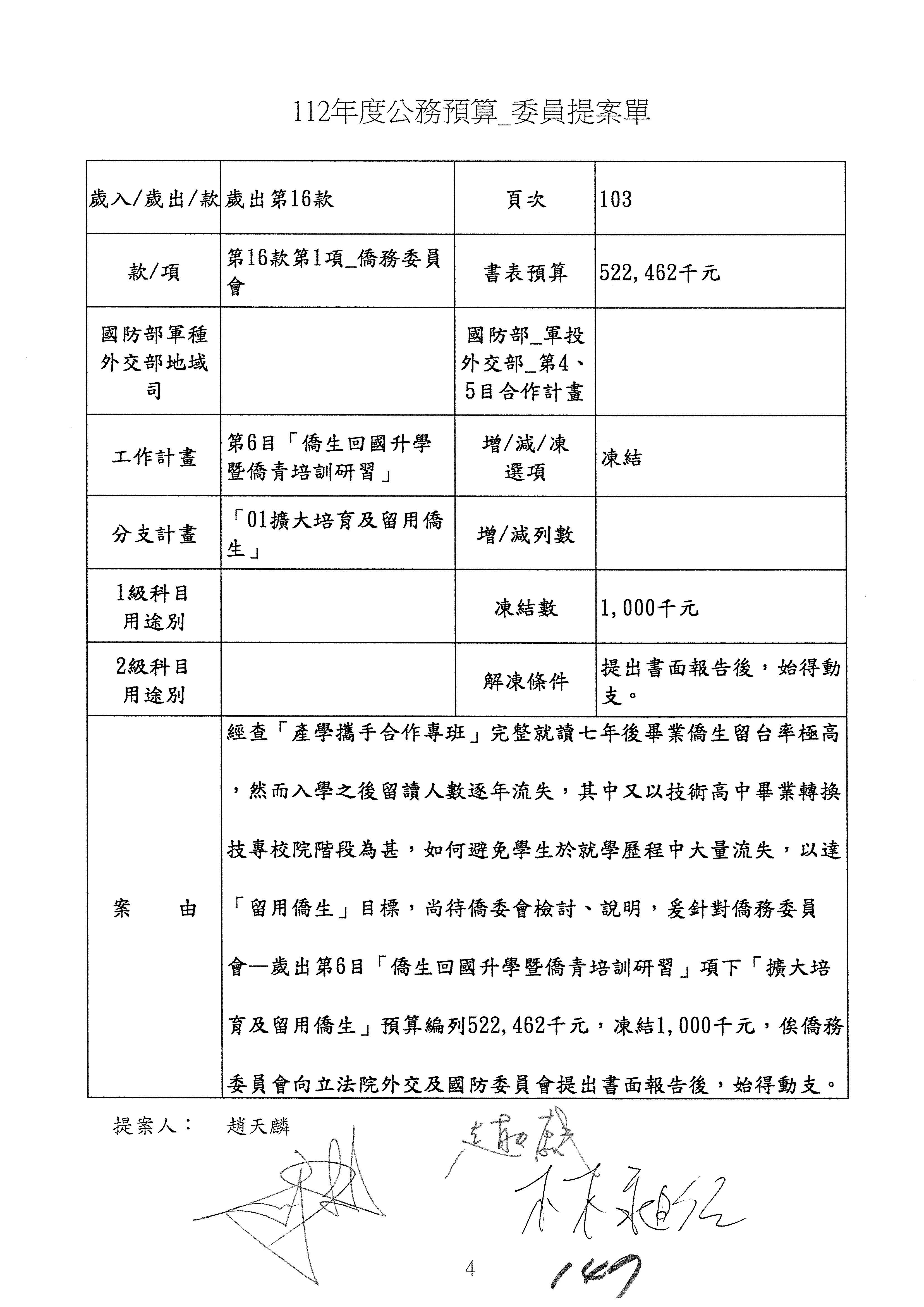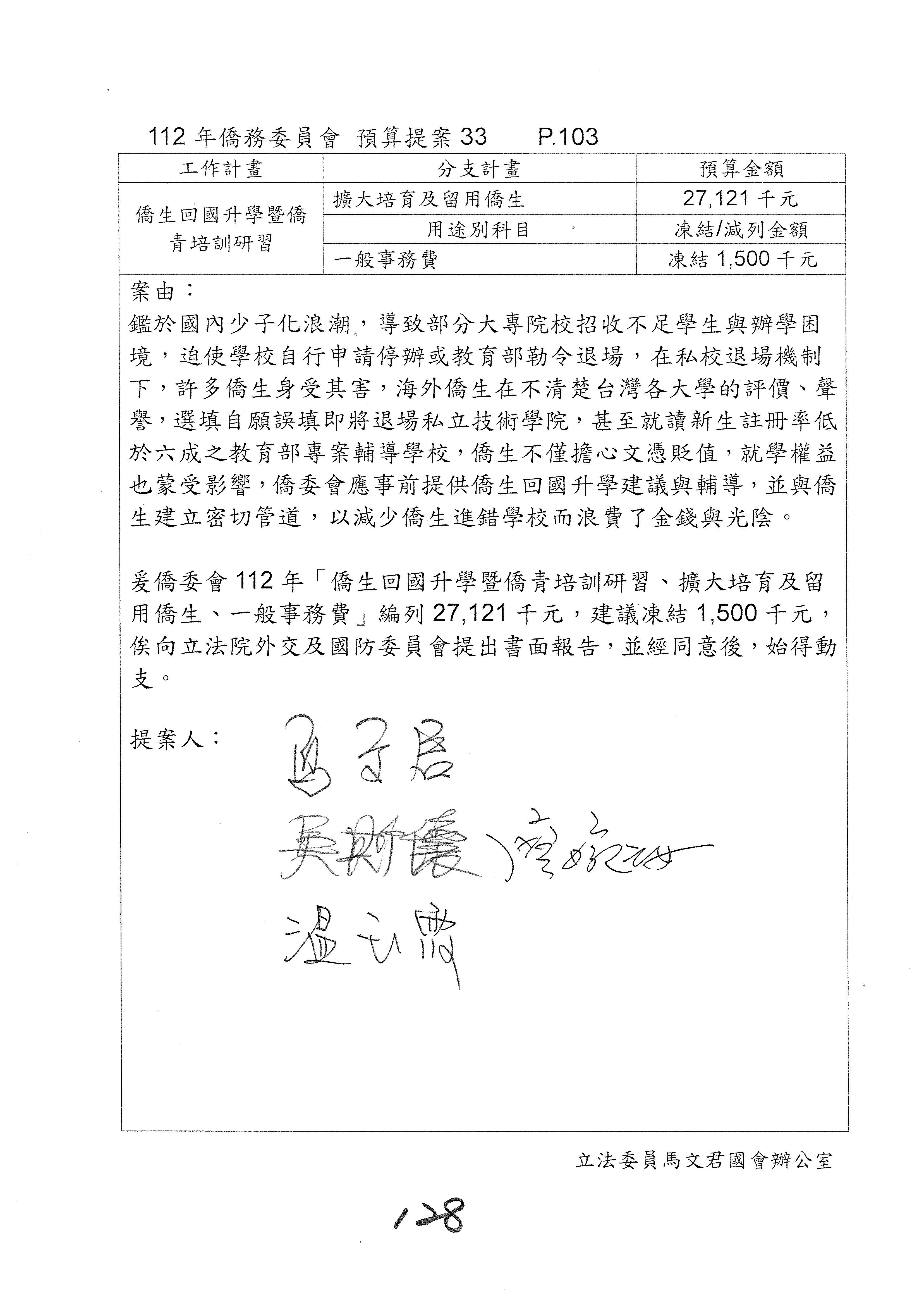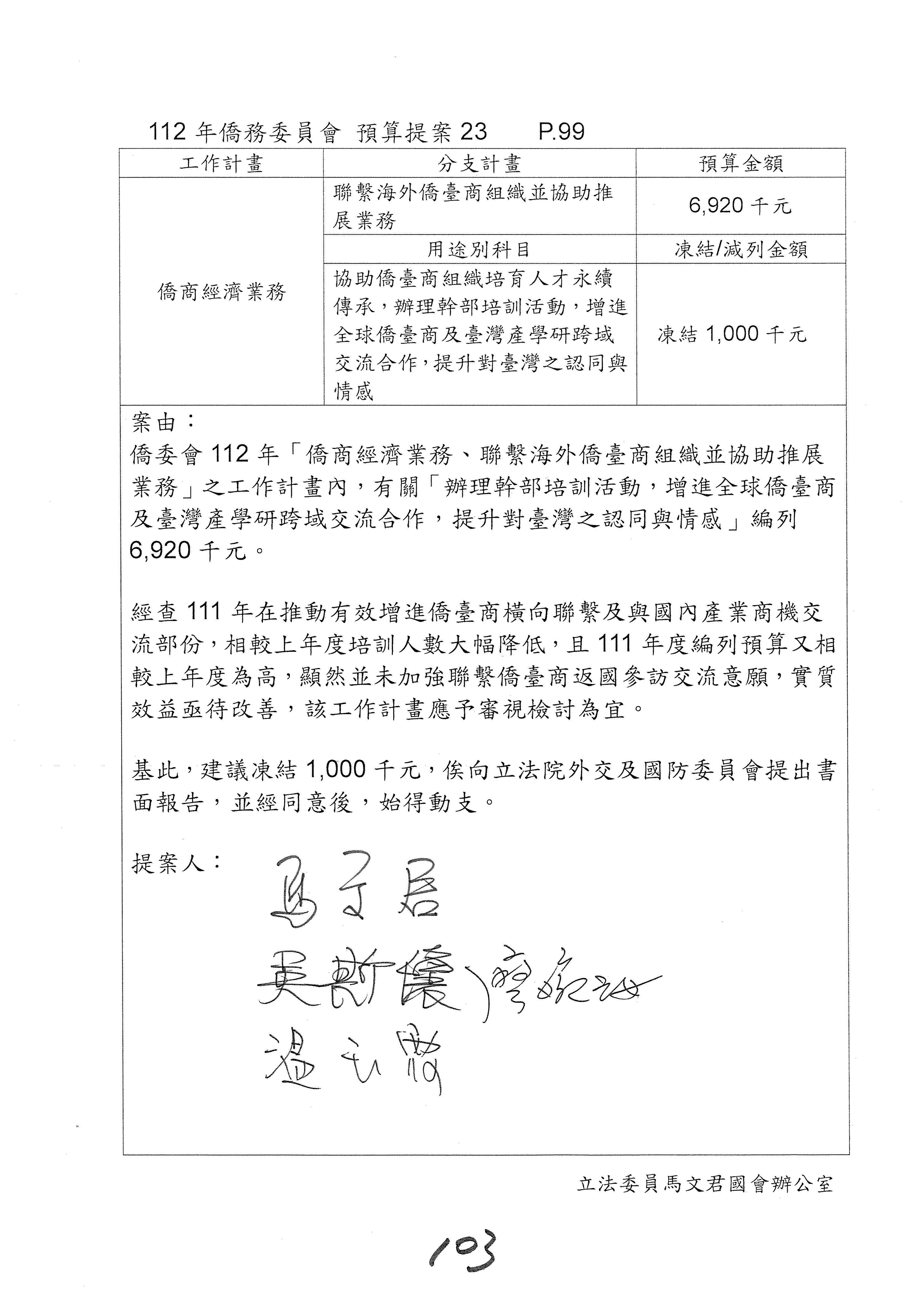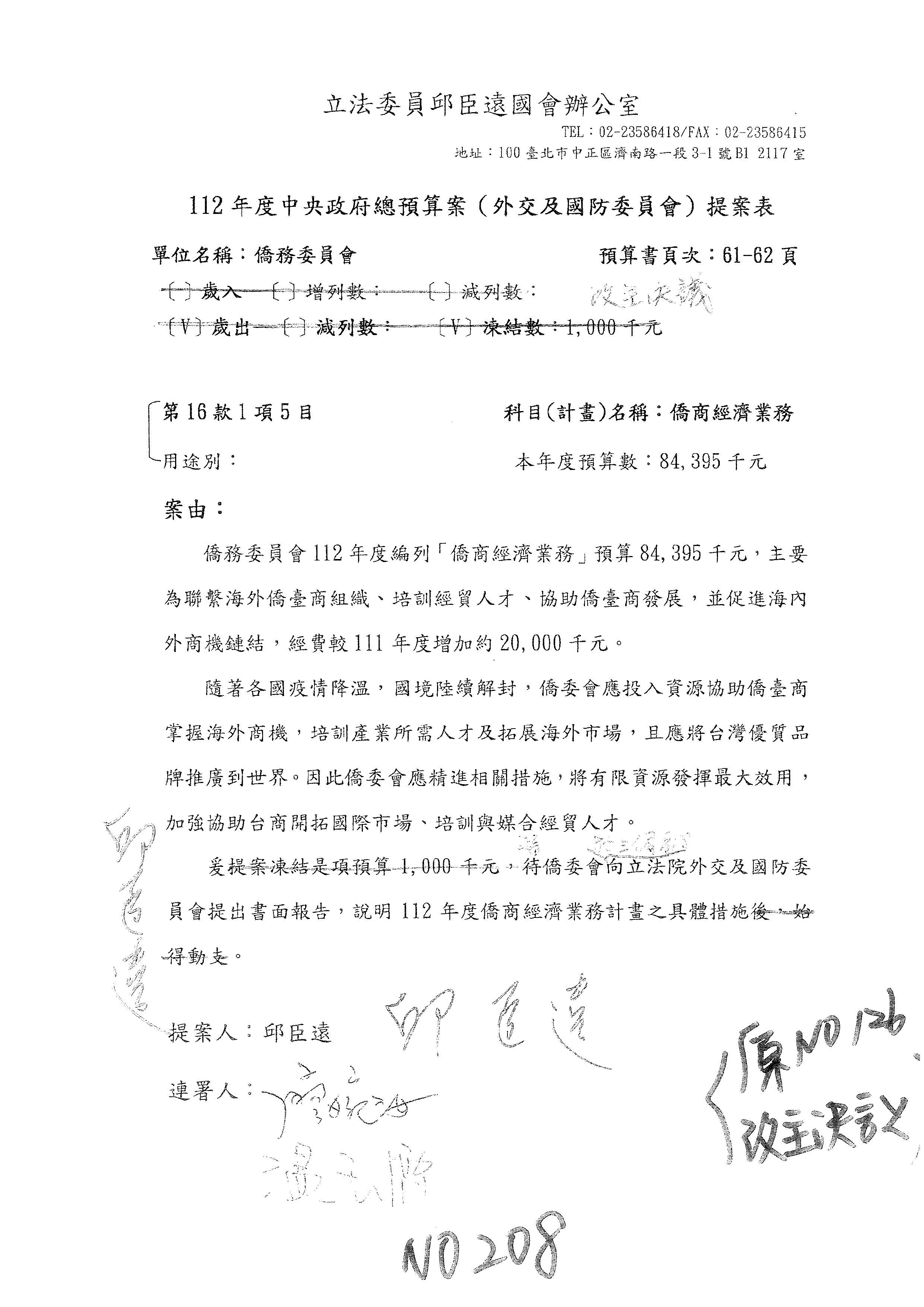 童委員長振源:有,他的提案是寫「建請僑務委員會調整計畫內容」,是不是可以將這幾個字拿掉,就接後面的「明確劃分業務內容」,將「調整計畫內容,」這幾個字拿掉,因為調整計畫內容會涉及到中長程計畫,這會比較……