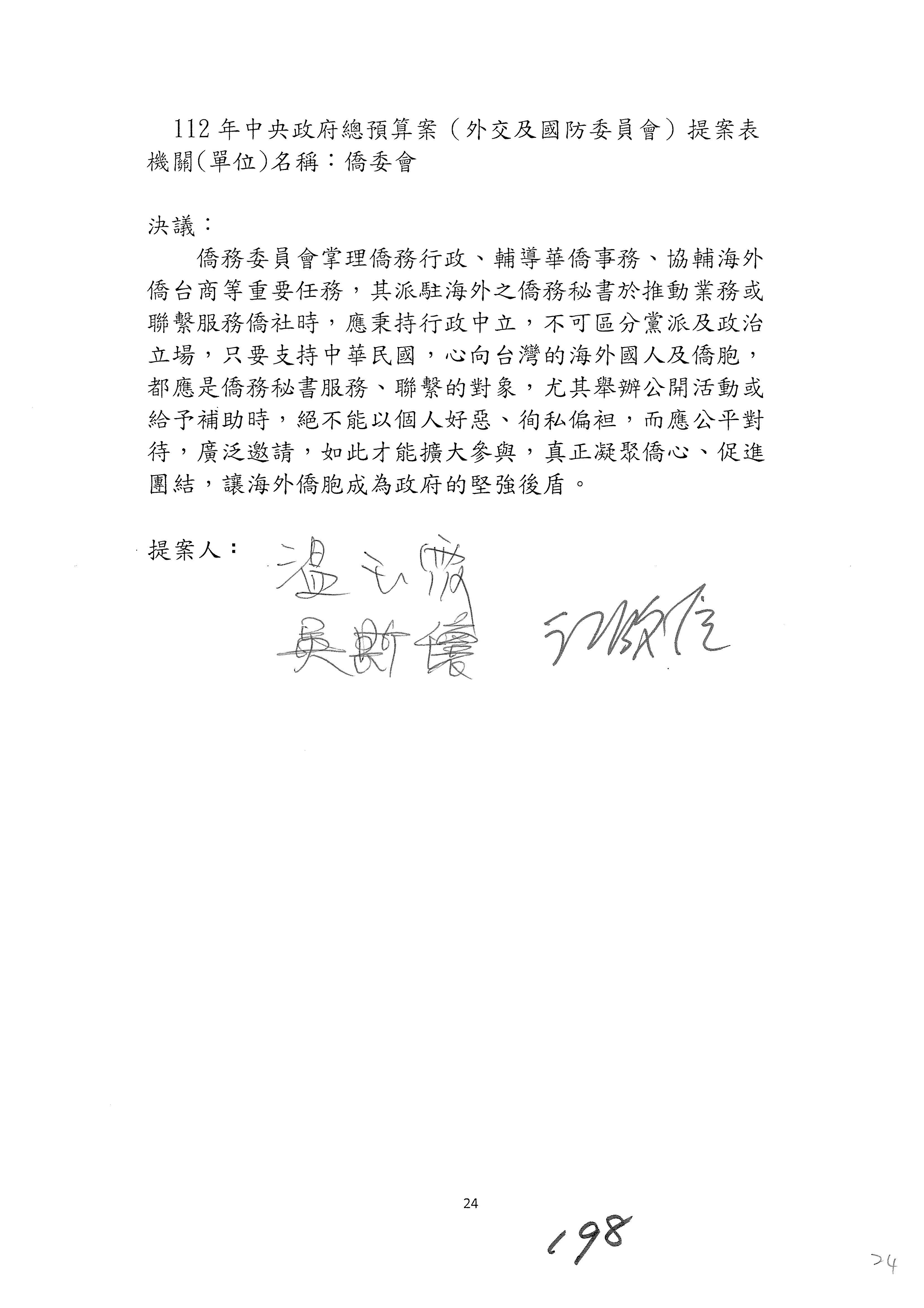 112年度中央政府總預算案關於僑務委員會主管收支公開及機密的部分,以及信託基金:莊守耕公益基金、受理捐贈僑生獎助學金及艱困地區僑民學校師資輔助金基金業已處理完畢,送請財政委員會彙整後,提報院會。院會審議前,不須交由黨團協商。院會審議時,請推派一位委員作補充說明,請推派。