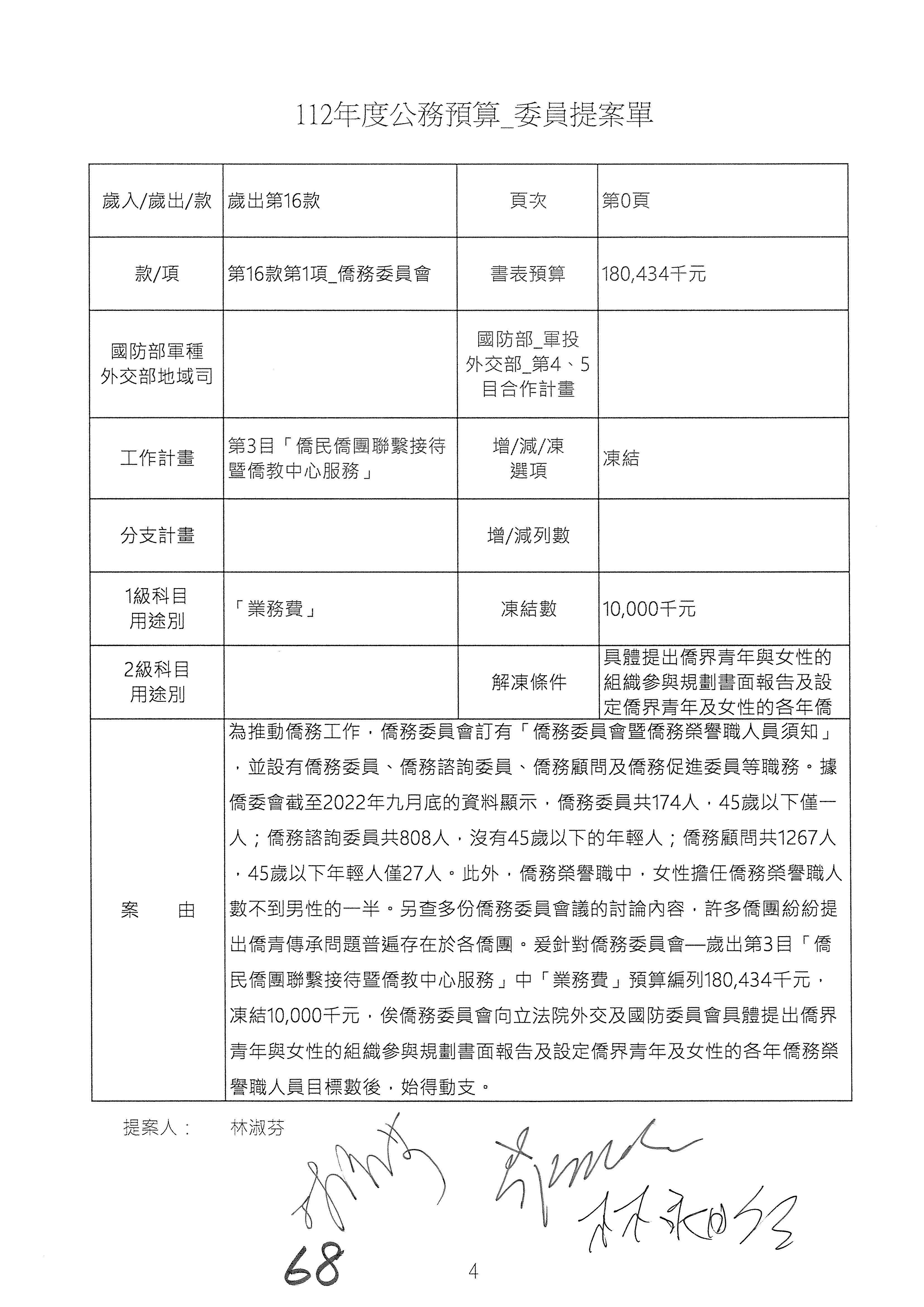 主席:本次僑務委員會的預算審查,我們先處理公開部分,公開部分處理完畢後再處理機密預算,僑務委員會預算原則上以一級科目作為併案依據。