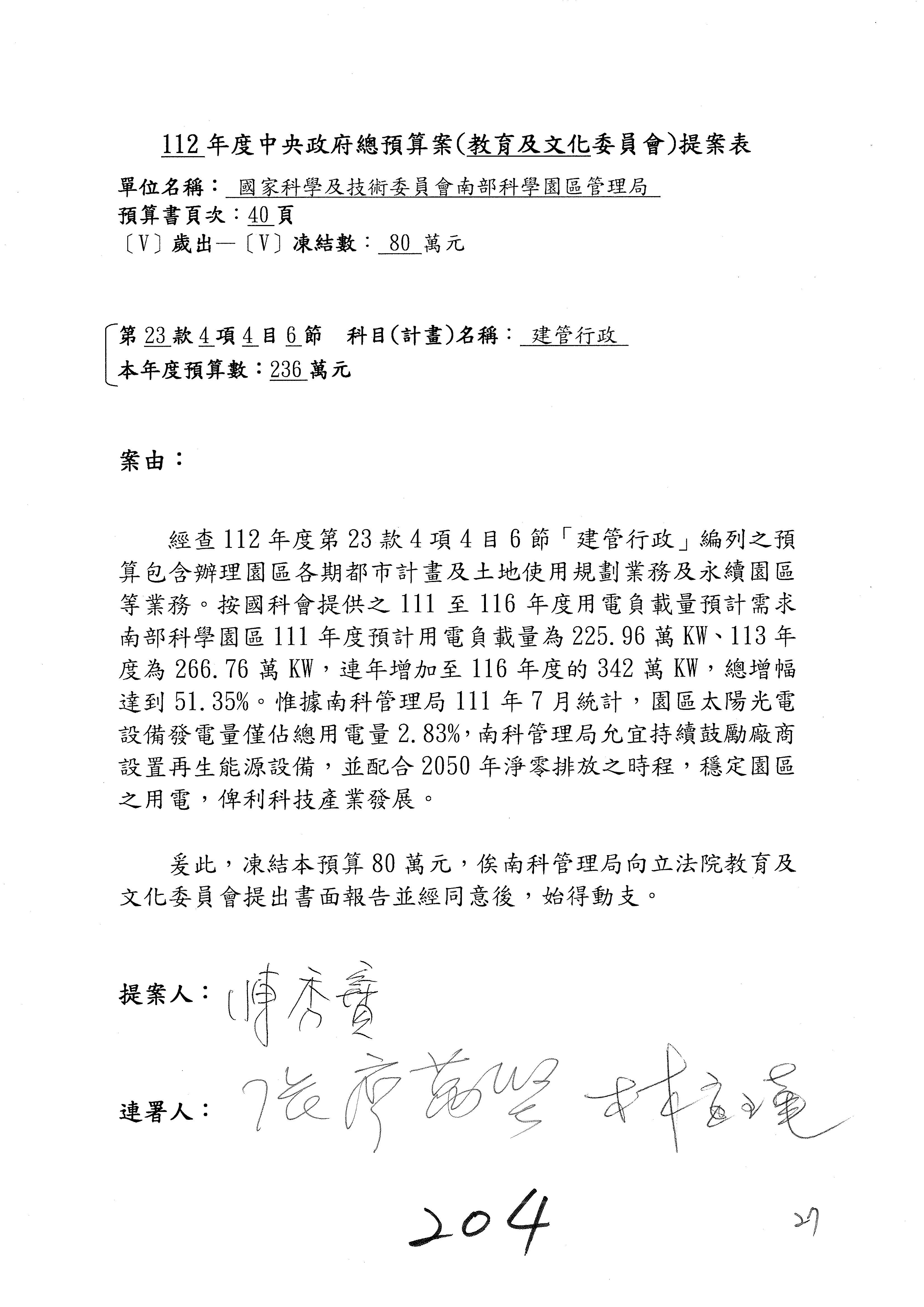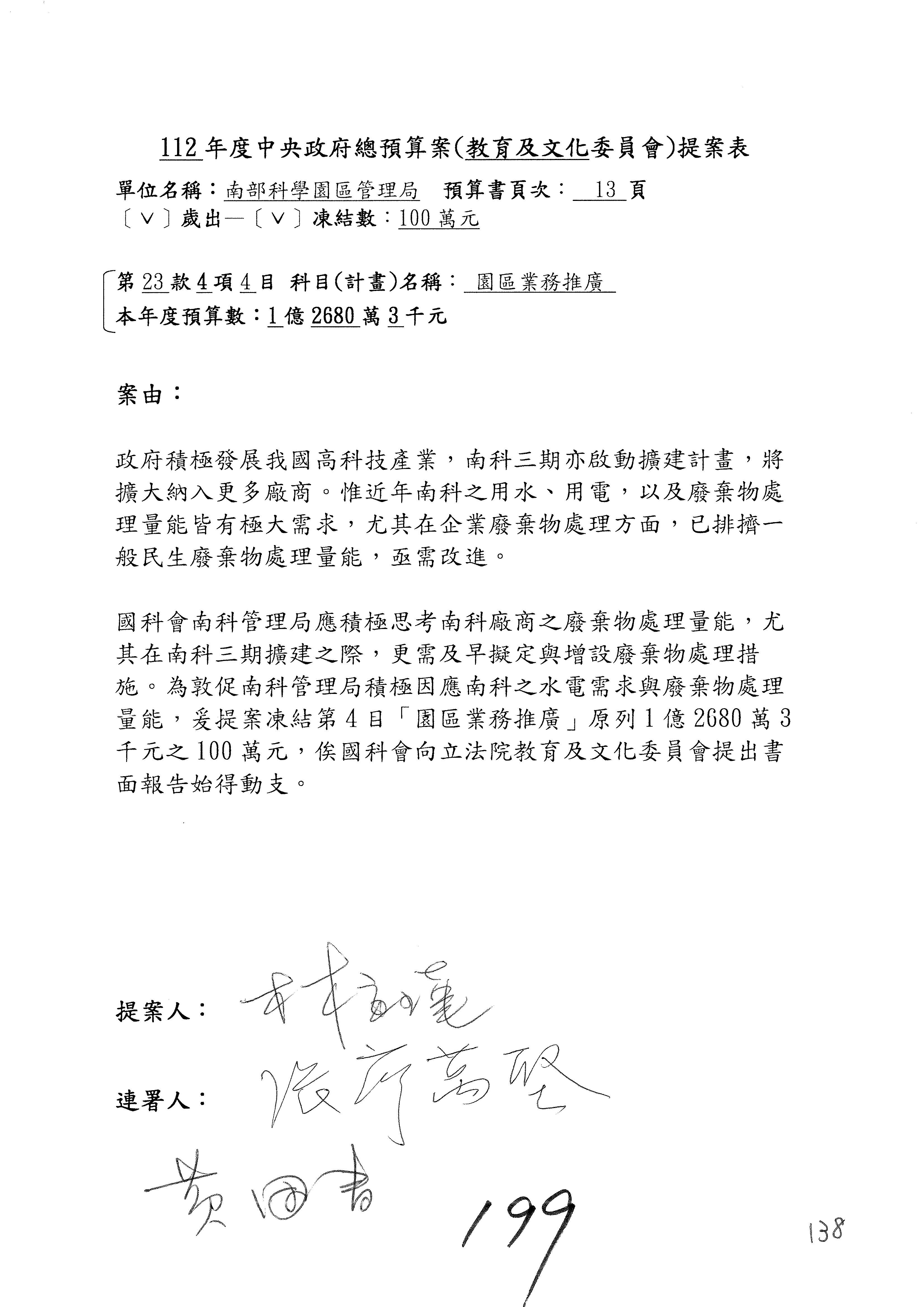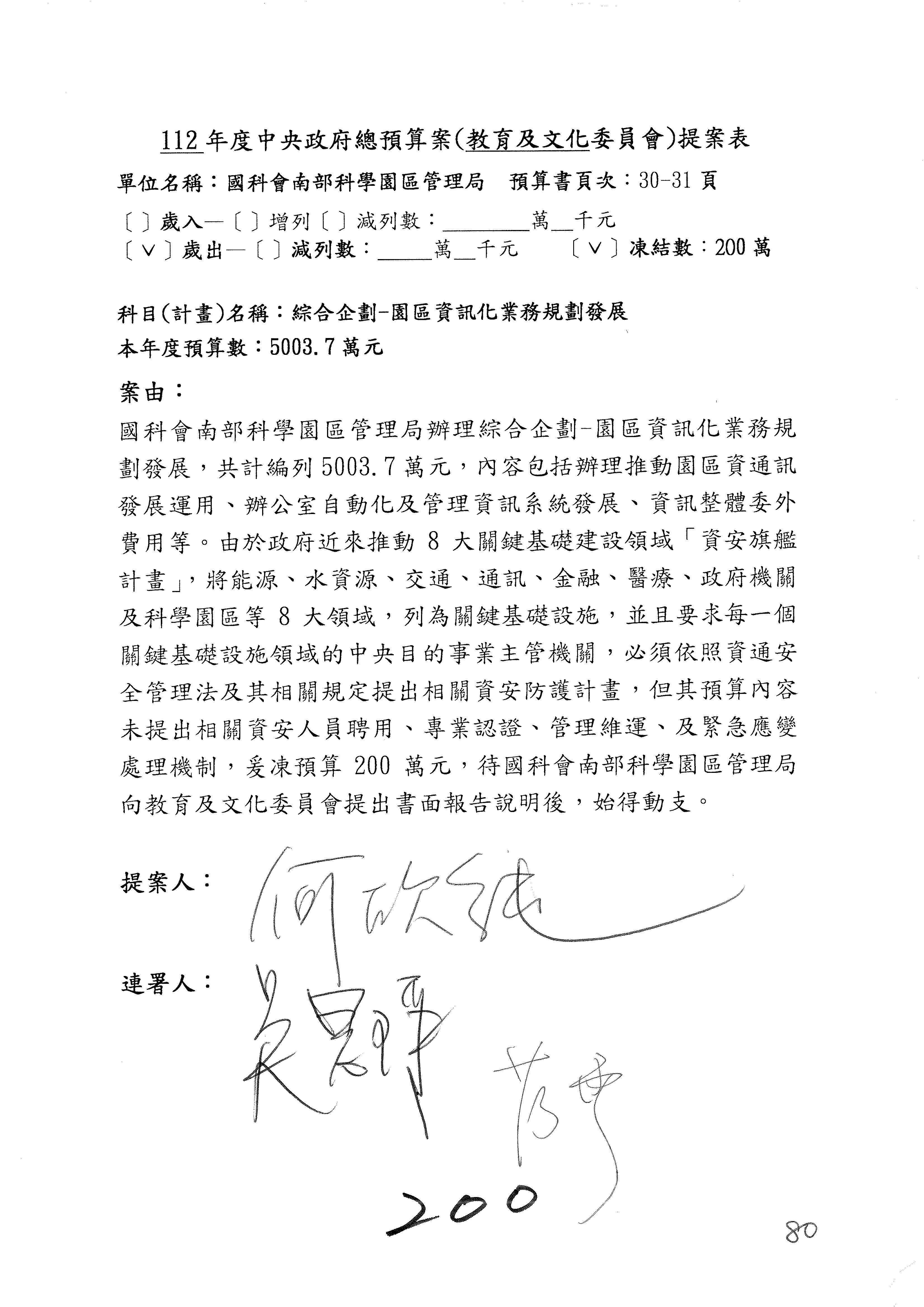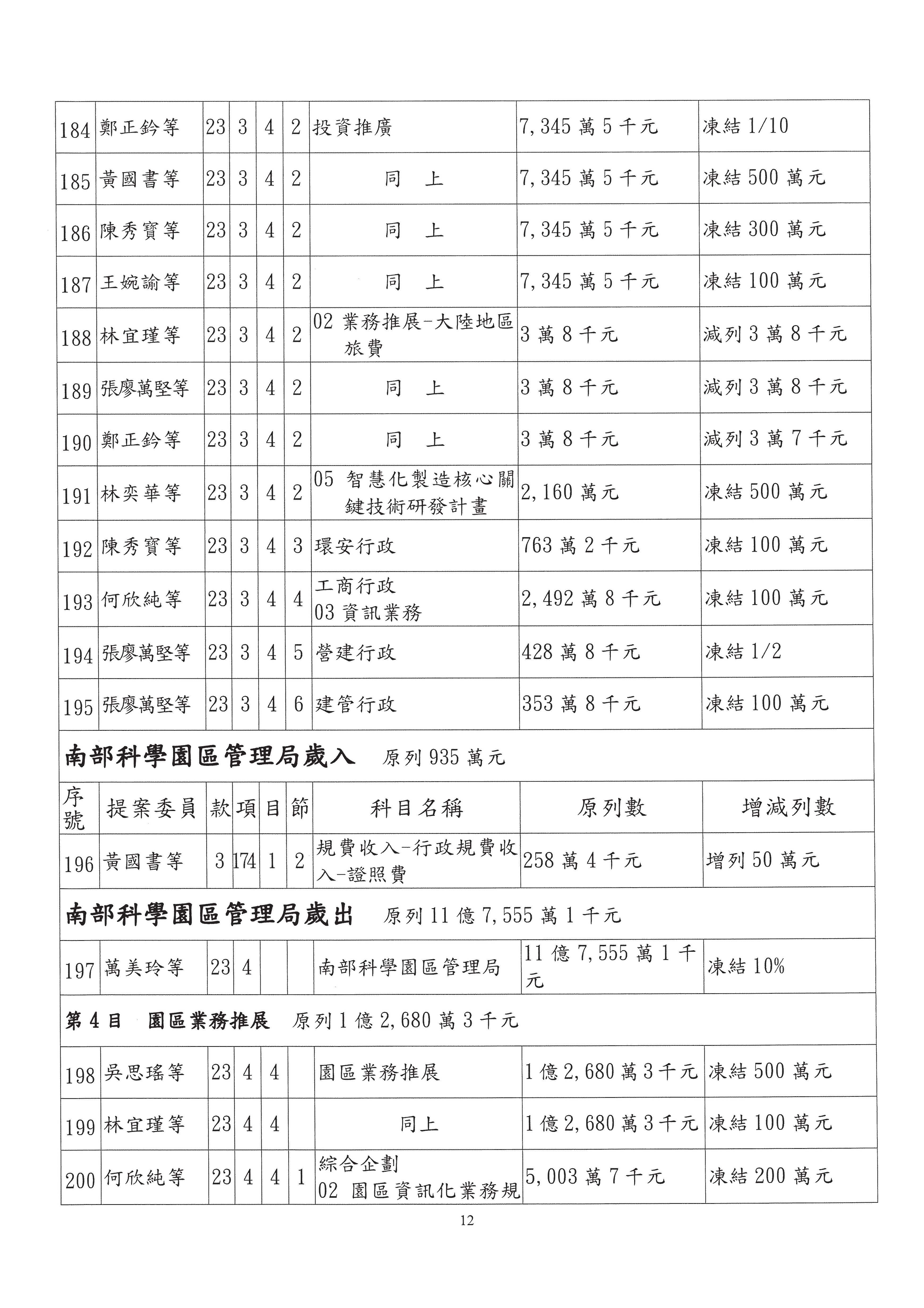 主席:好。有沒有要二輪發言的委員?如果沒有的話,我們針對南部科學園區管理局歲出第4目園區業務推廣的部分,原列1億2,680萬3,000元,去年的狀態是凍200萬元,今年各位有沒有什麼意見?