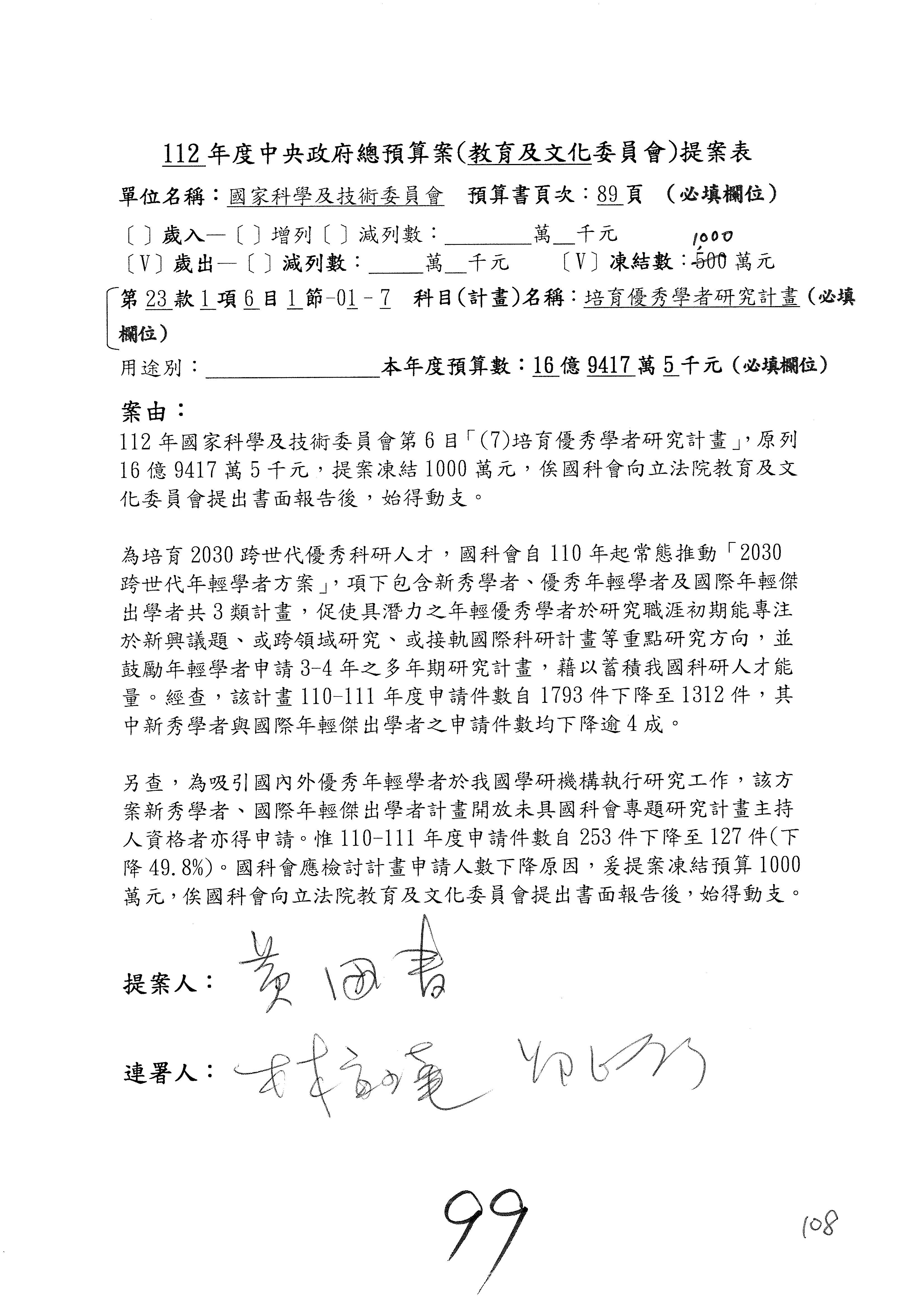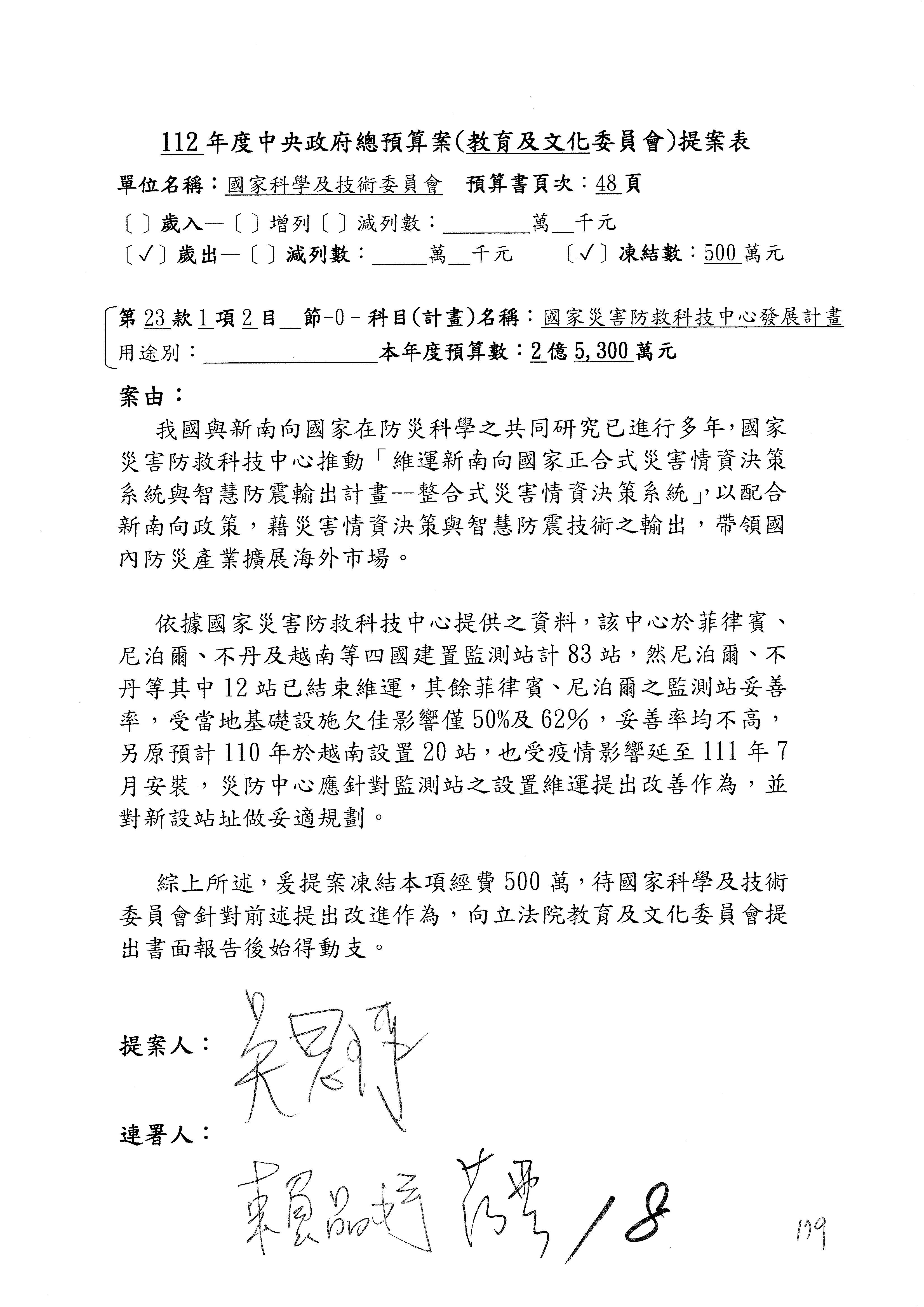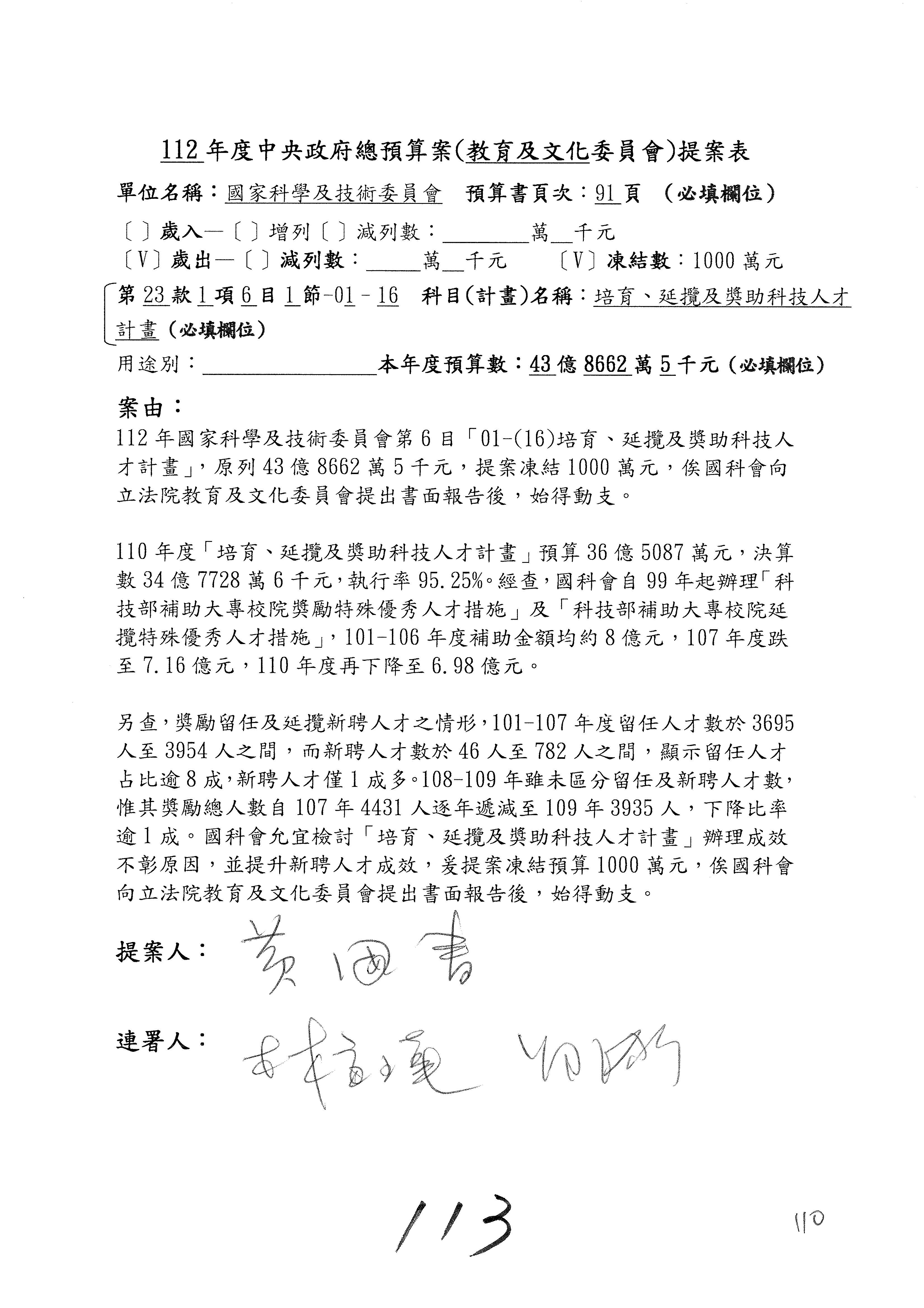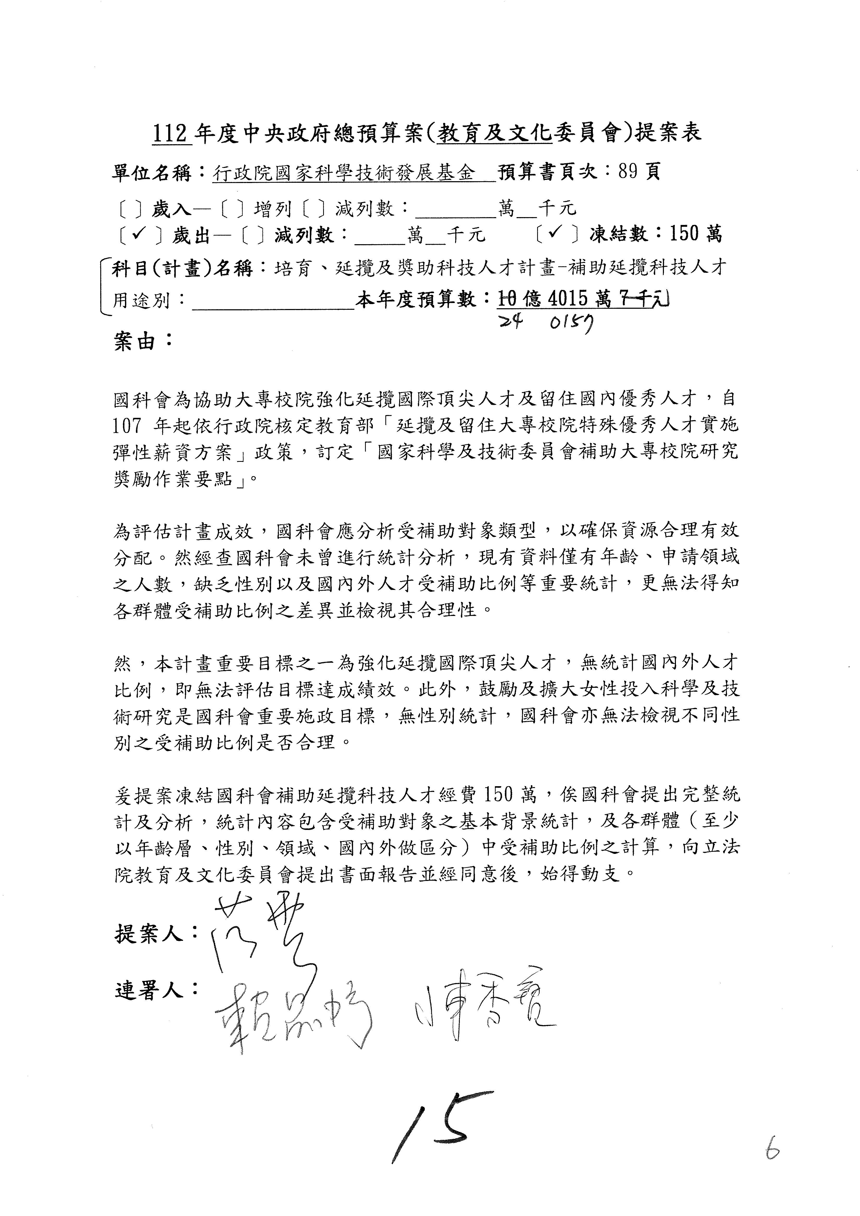 黃委員國書:我有兩案,第5案凍1,000萬元、第6案改主決議。