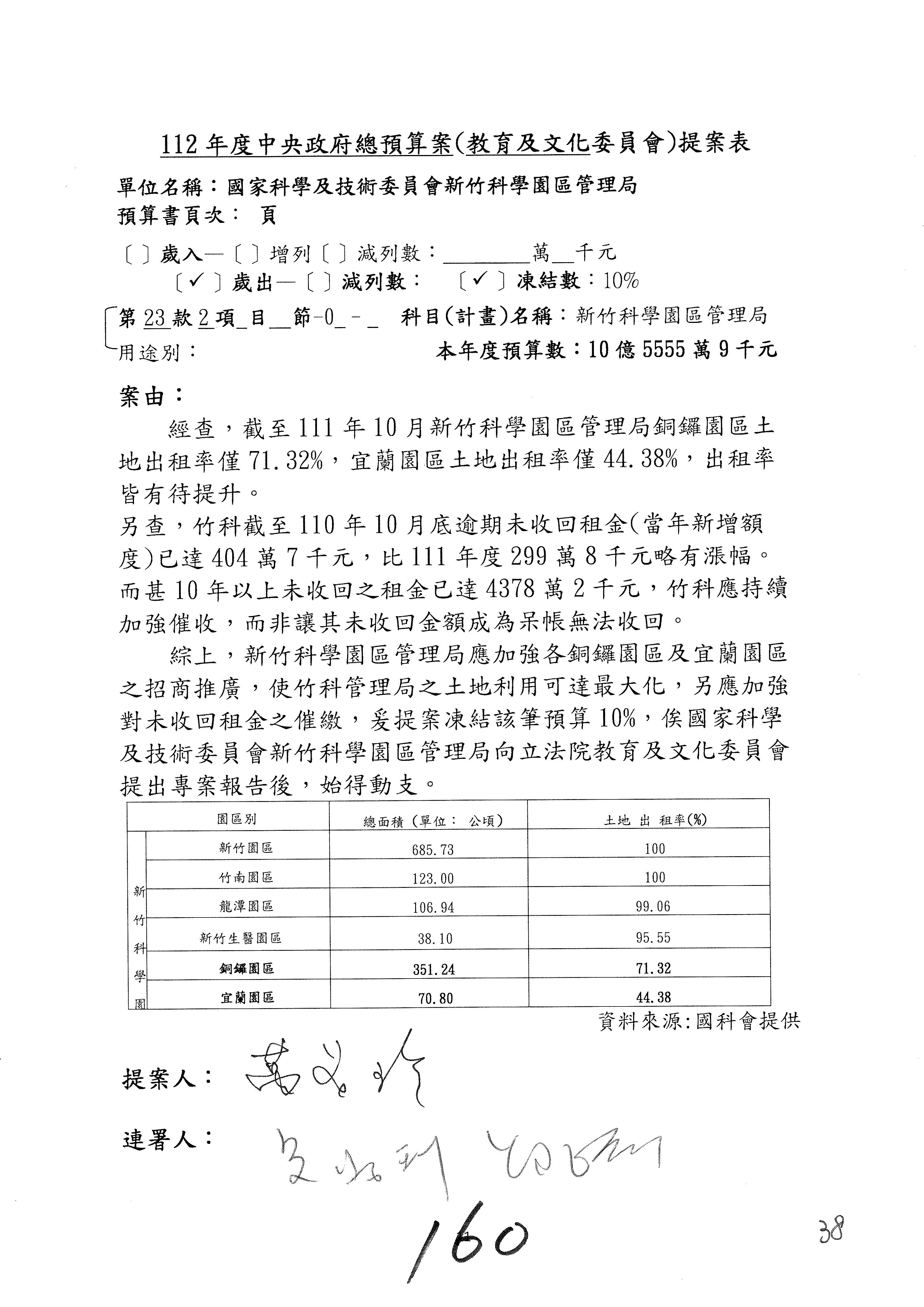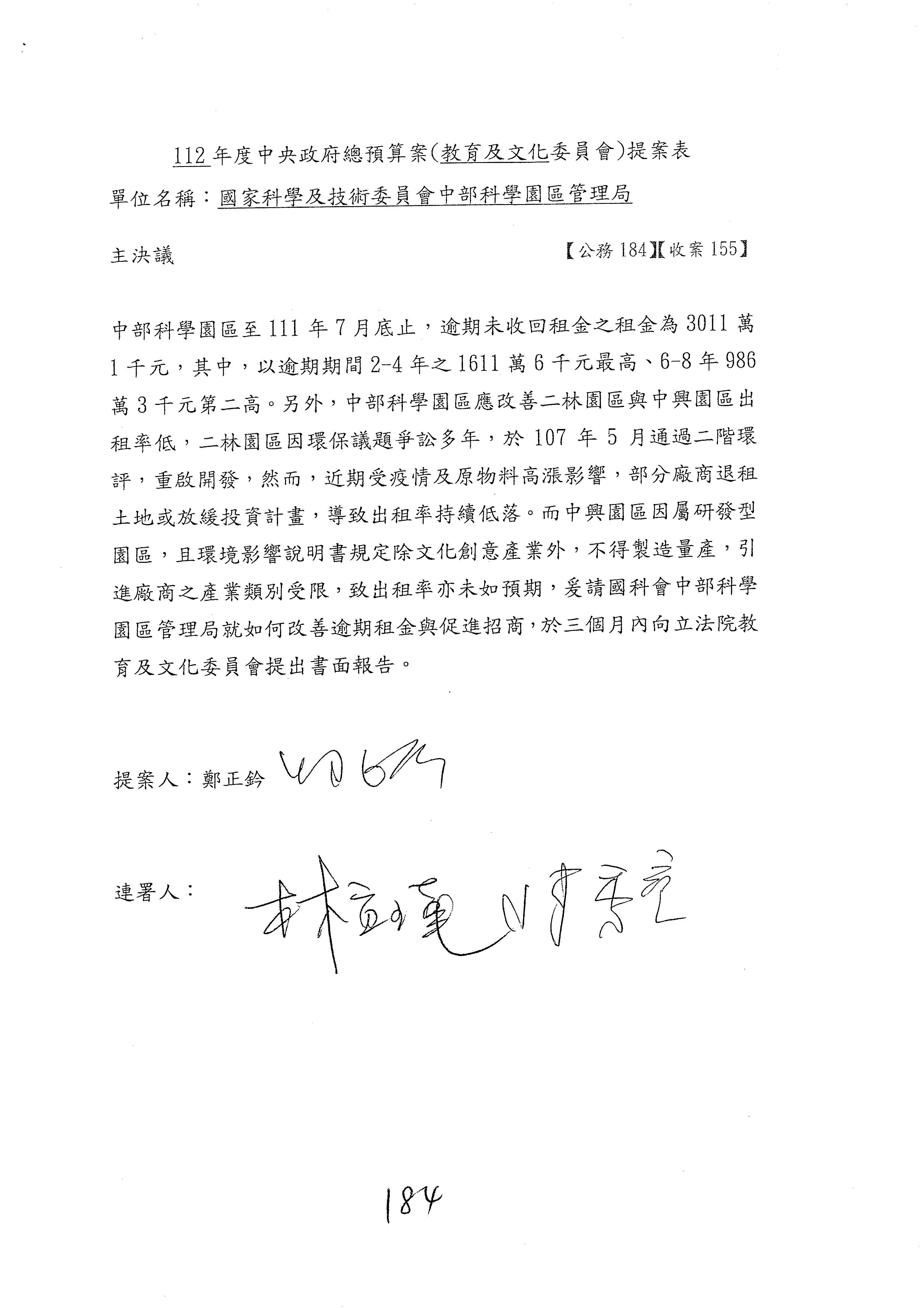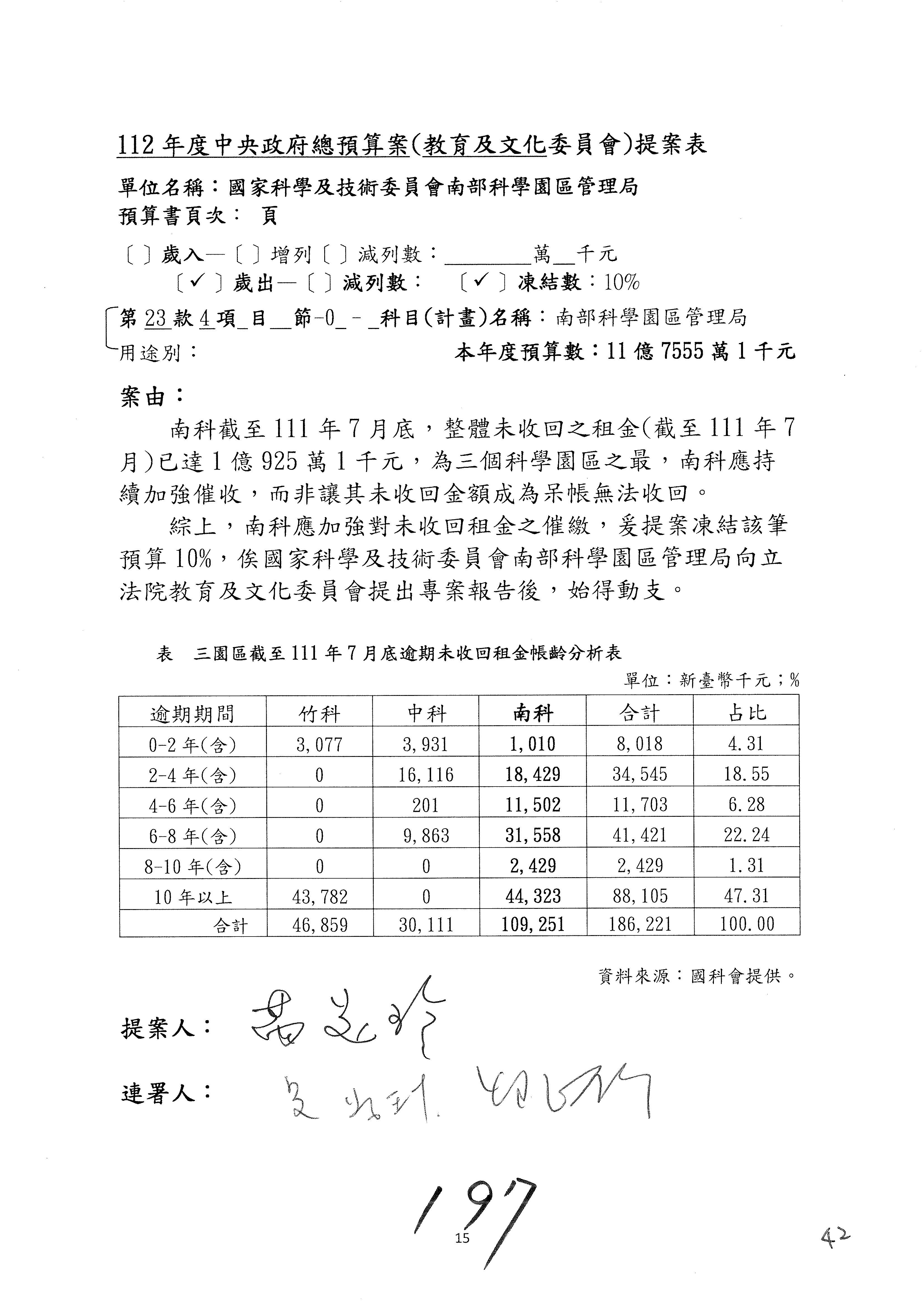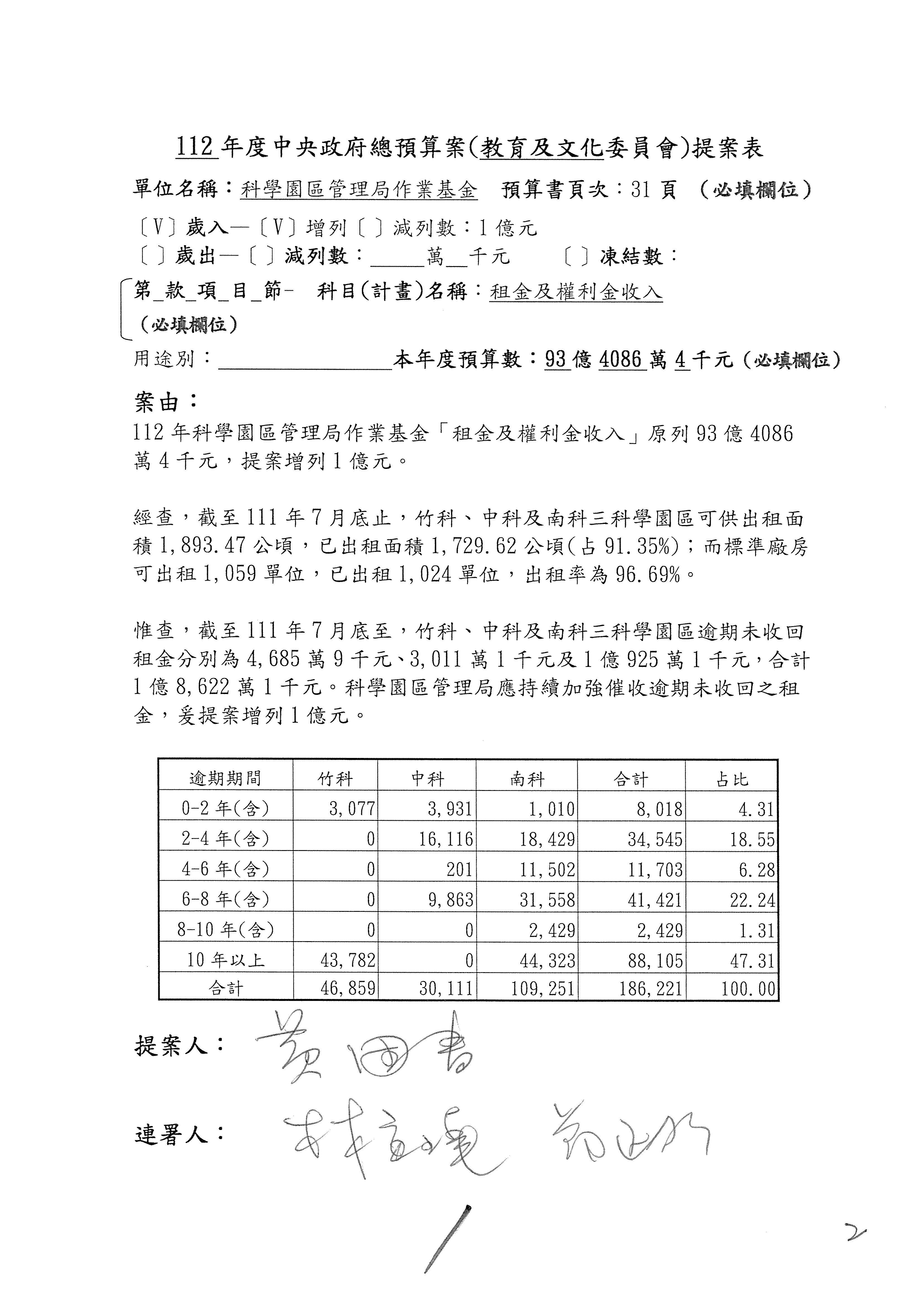 黃委員國書:歲入的租金及權利金收入,剛剛陳秀寳委員提到南科逾期未回收租金的問題,其實包括竹科、中科、南科,都有一樣的問題,只不過是南科的數字稍微多一點。對於逾期未回收金的部分,陳秀寳委員是用凍結預算的方式要求你們改善這個問題,而我的案子就是直接在作業基金增加預算,且我的案子是要增加1億元。為什麼呢?因為到目前為止,逾期未回收租金的部分,三個科學園區加起來總共是1億8,622萬元,所以我的提案是增列1億元。增列1億元之後,你們當然就會很努力地想辦法,但我覺得,若是1億元,事實上你們也很困難,因為有一些呆帳,還有一些程序作業,所以要你們真的做到增列1億元的要求也很困難。但是我覺得總是要增加一些,在跟國科會討論後,你們同意增列300萬元,300萬元我也可以接受,至少可以讓你們未來針對逾期未回收租金,給你們有機會再去做進一步處理。以上。
