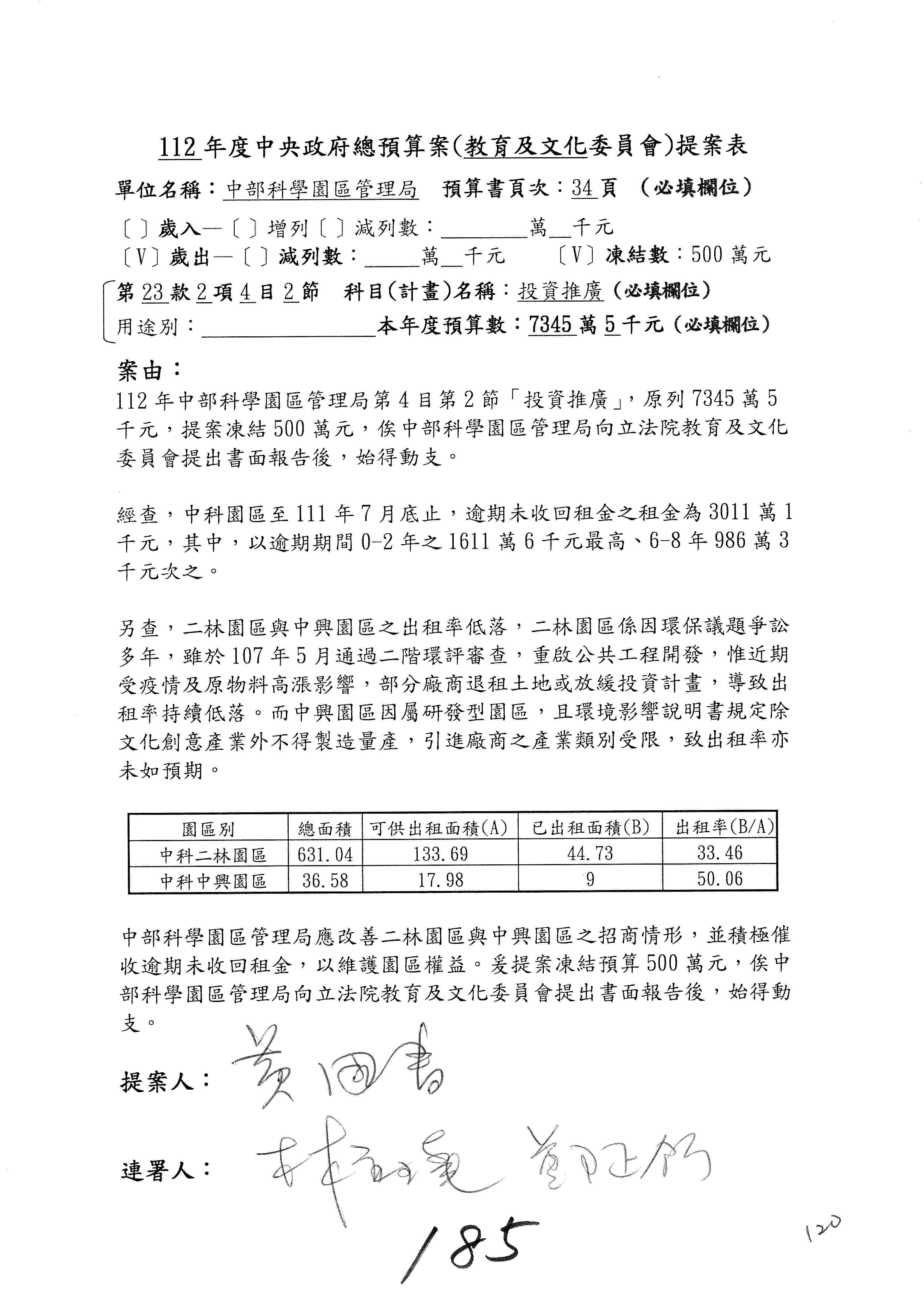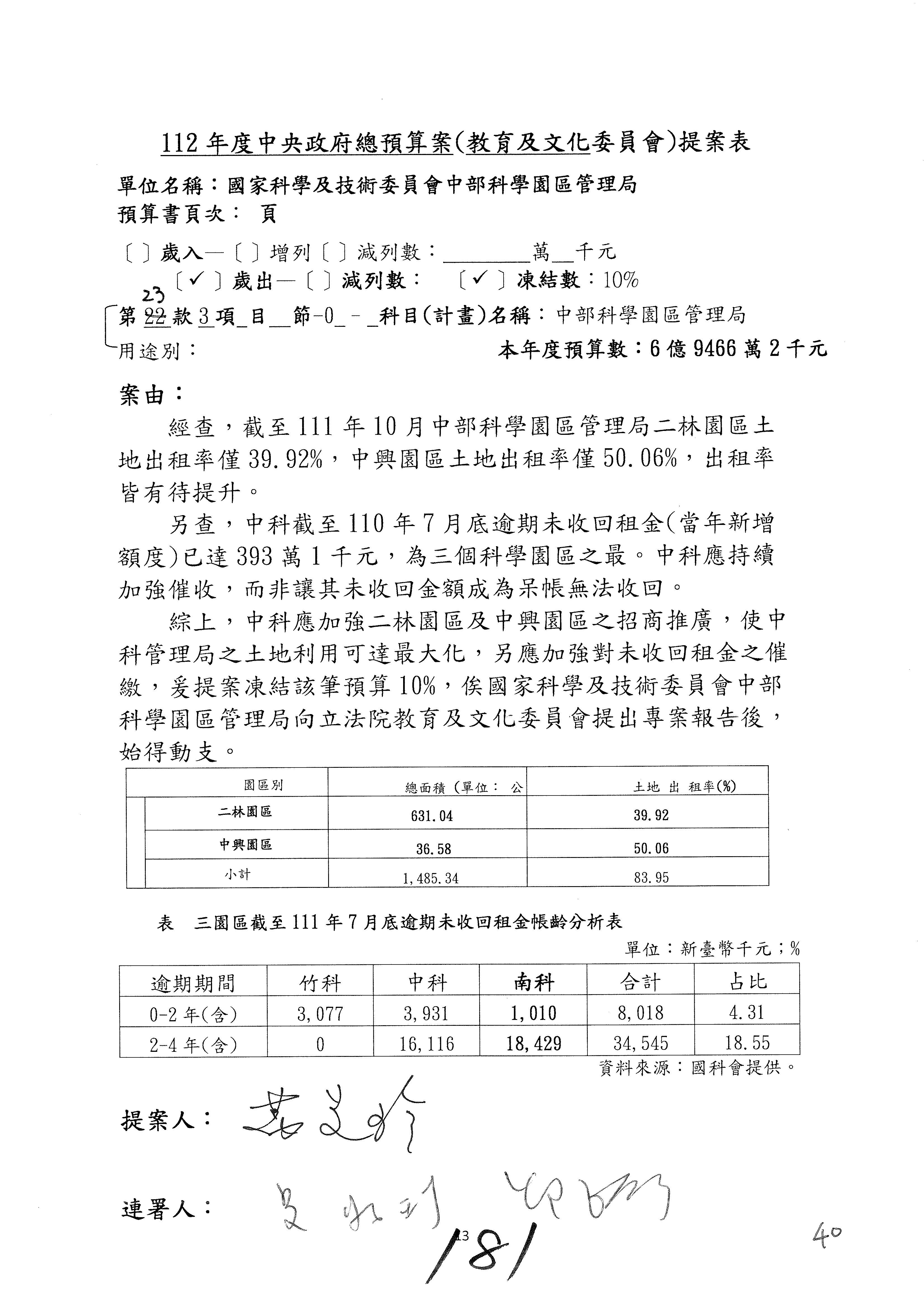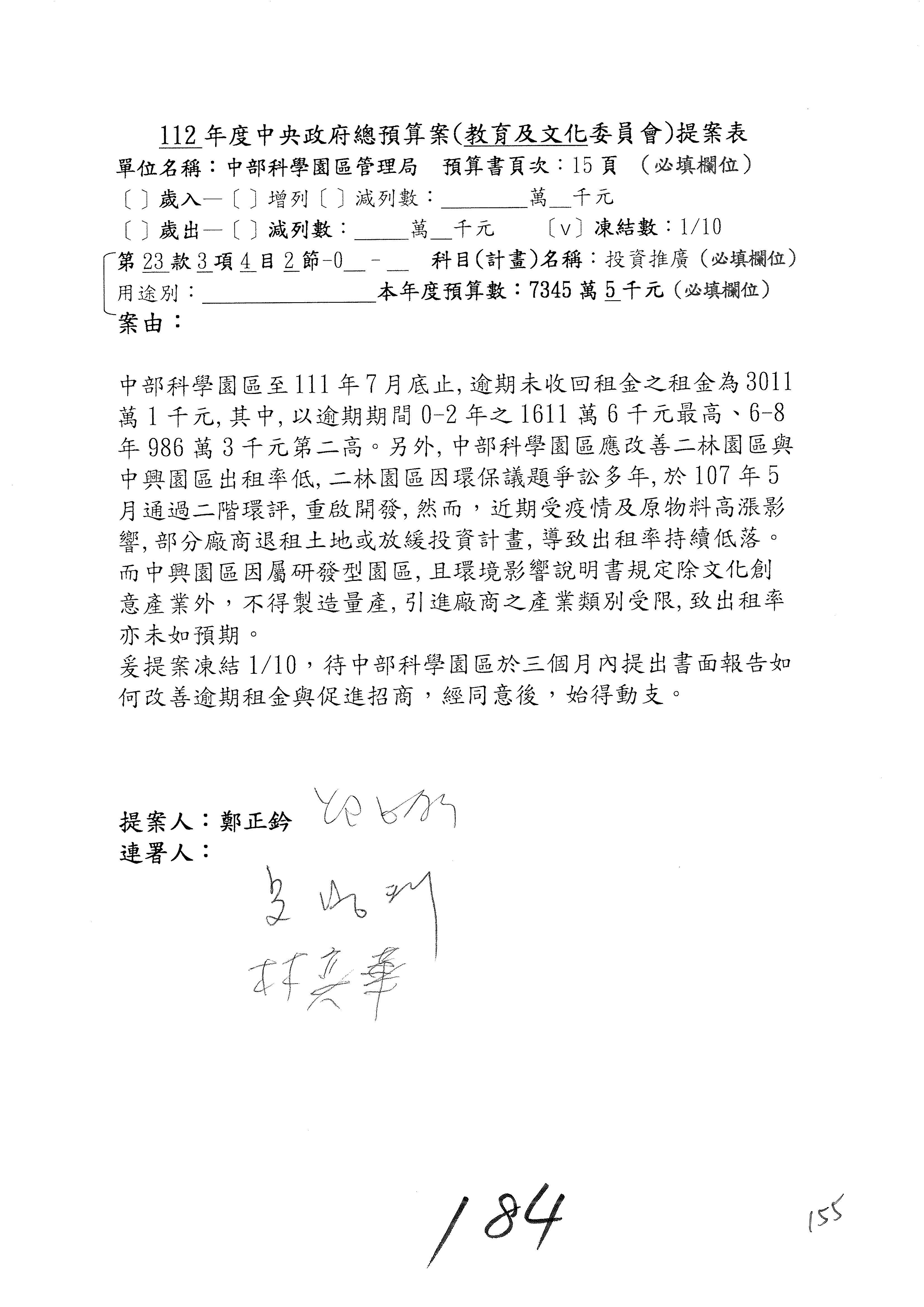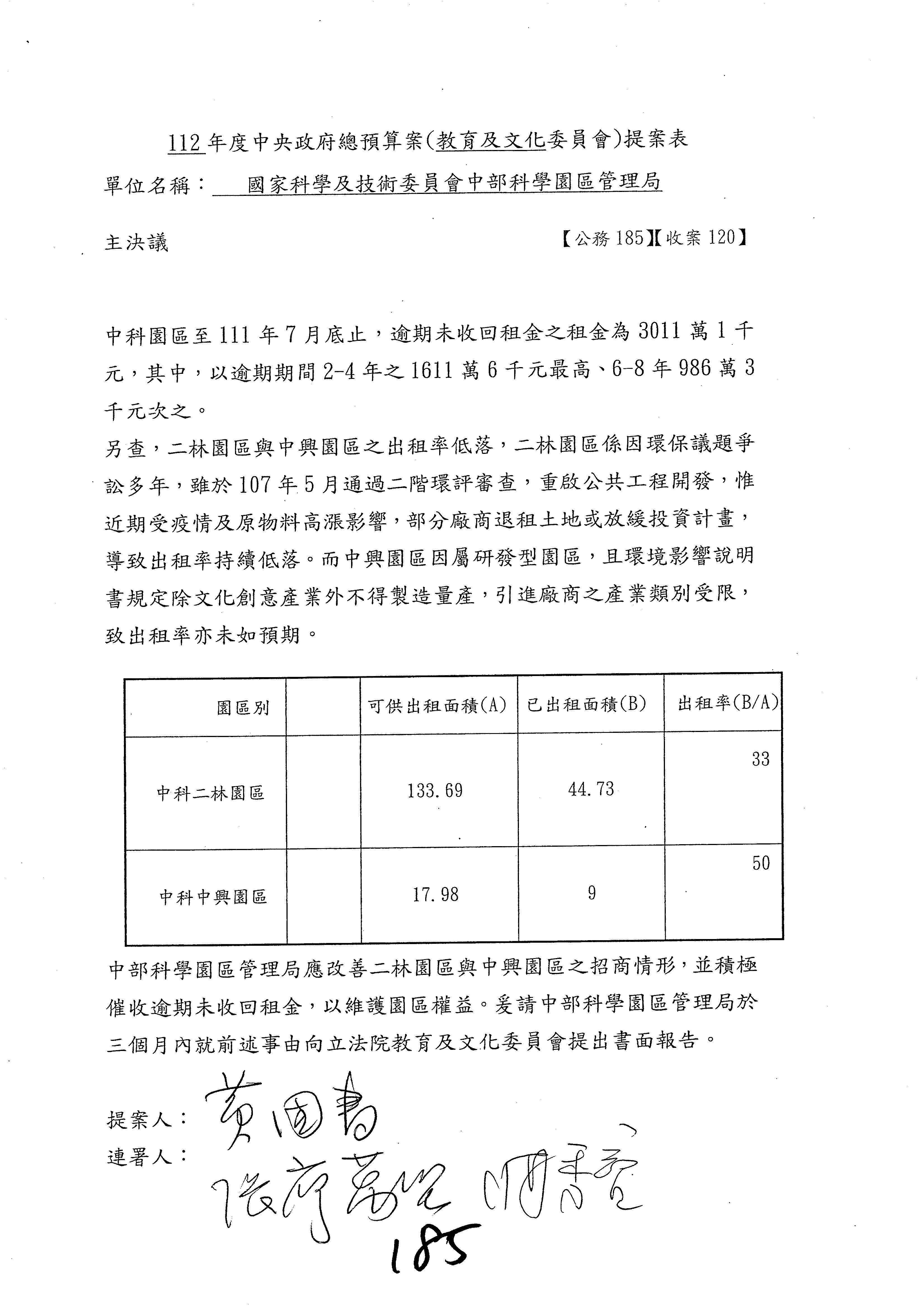 黃委員國書:歲入的租金及權利金收入,剛剛陳秀寳委員提到南科逾期未回收租金的問題,其實包括竹科、中科、南科,都有一樣的問題,只不過是南科的數字稍微多一點。對於逾期未回收金的部分,陳秀寳委員是用凍結預算的方式要求你們改善這個問題,而我的案子就是直接在作業基金增加預算,且我的案子是要增加1億元。為什麼呢?因為到目前為止,逾期未回收租金的部分,三個科學園區加起來總共是1億8,622萬元,所以我的提案是增列1億元。增列1億元之後,你們當然就會很努力地想辦法,但我覺得,若是1億元,事實上你們也很困難,因為有一些呆帳,還有一些程序作業,所以要你們真的做到增列1億元的要求也很困難。但是我覺得總是要增加一些,在跟國科會討論後,你們同意增列300萬元,300萬元我也可以接受,至少可以讓你們未來針對逾期未回收租金,給你們有機會再去做進一步處理。以上。
