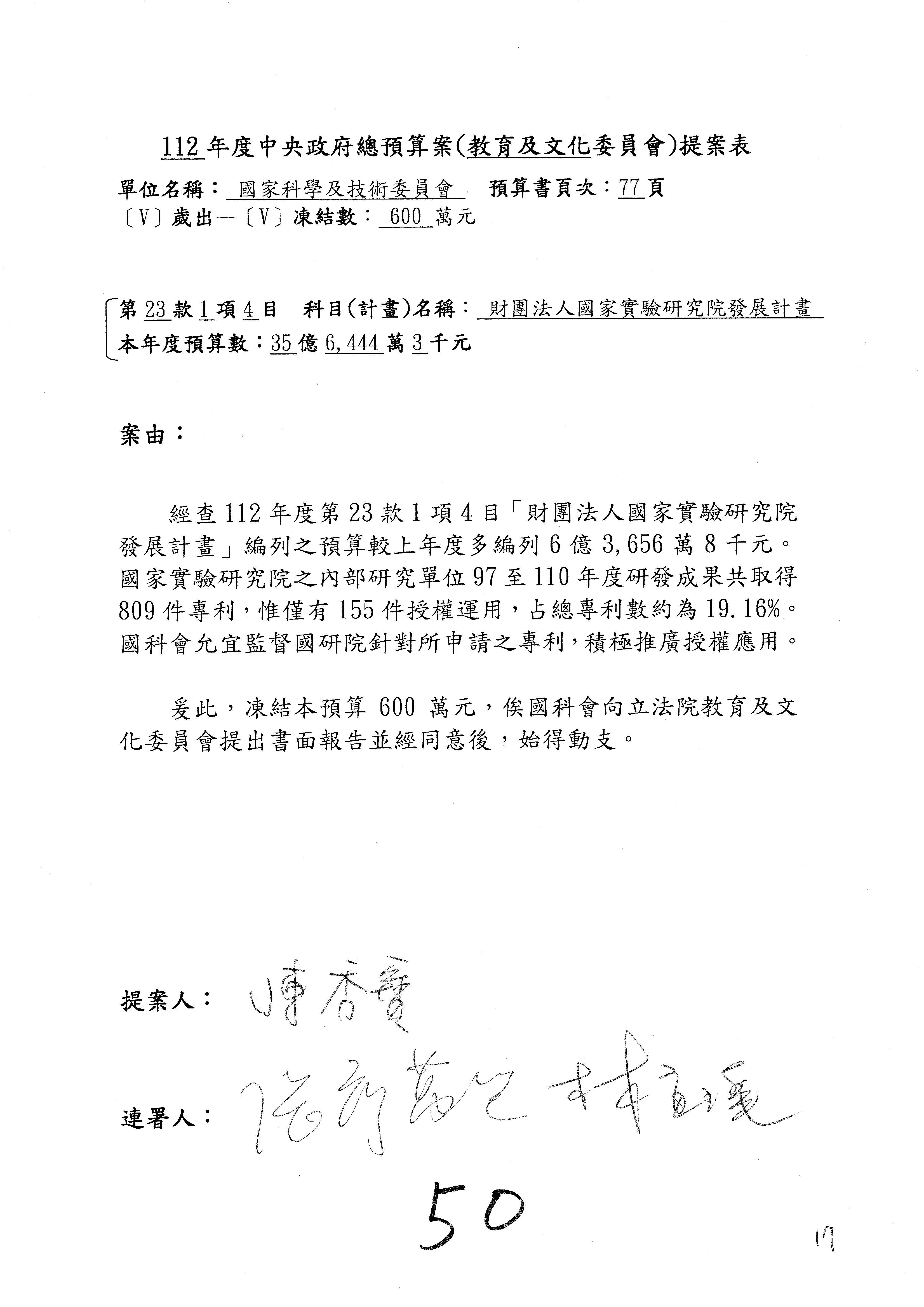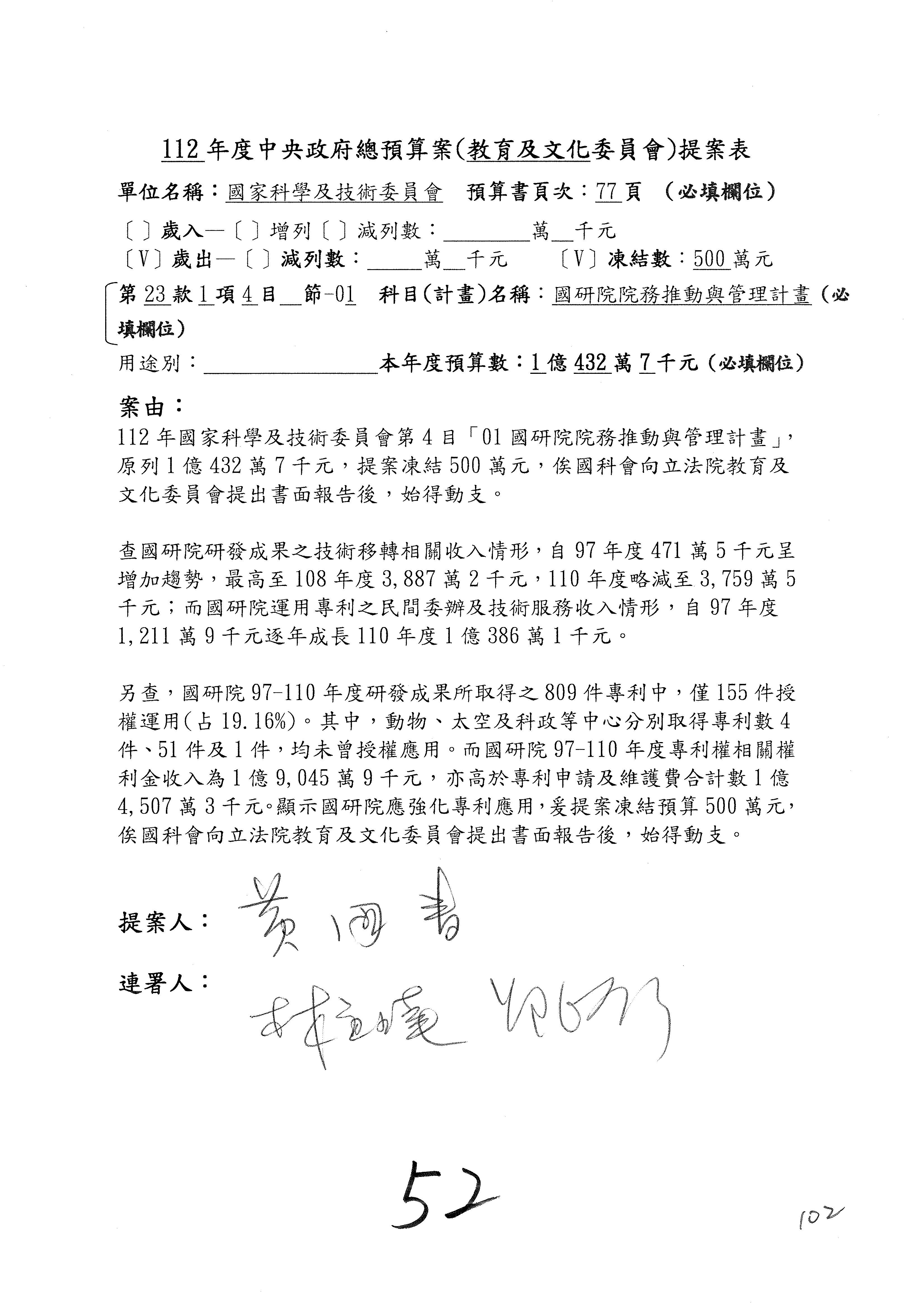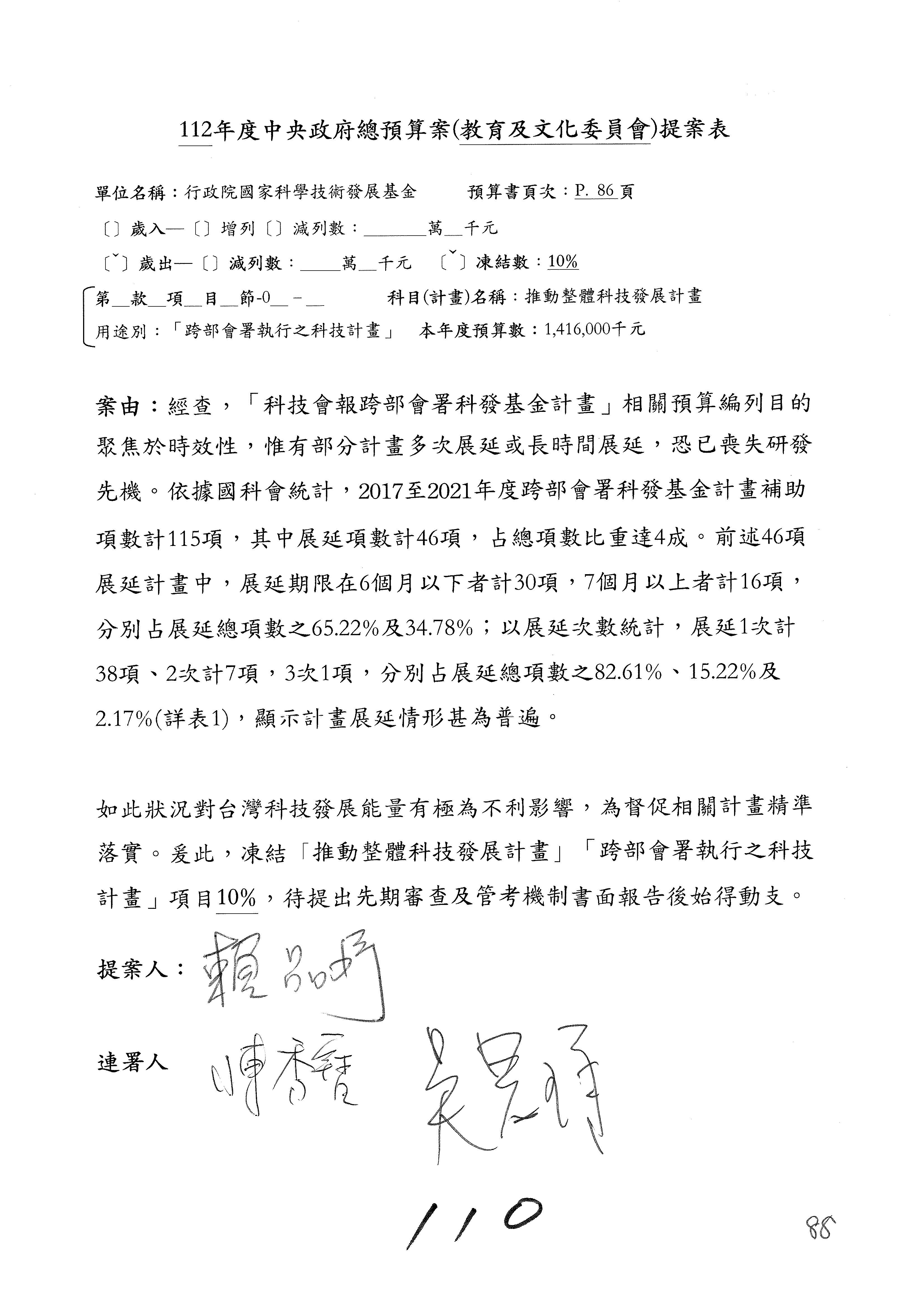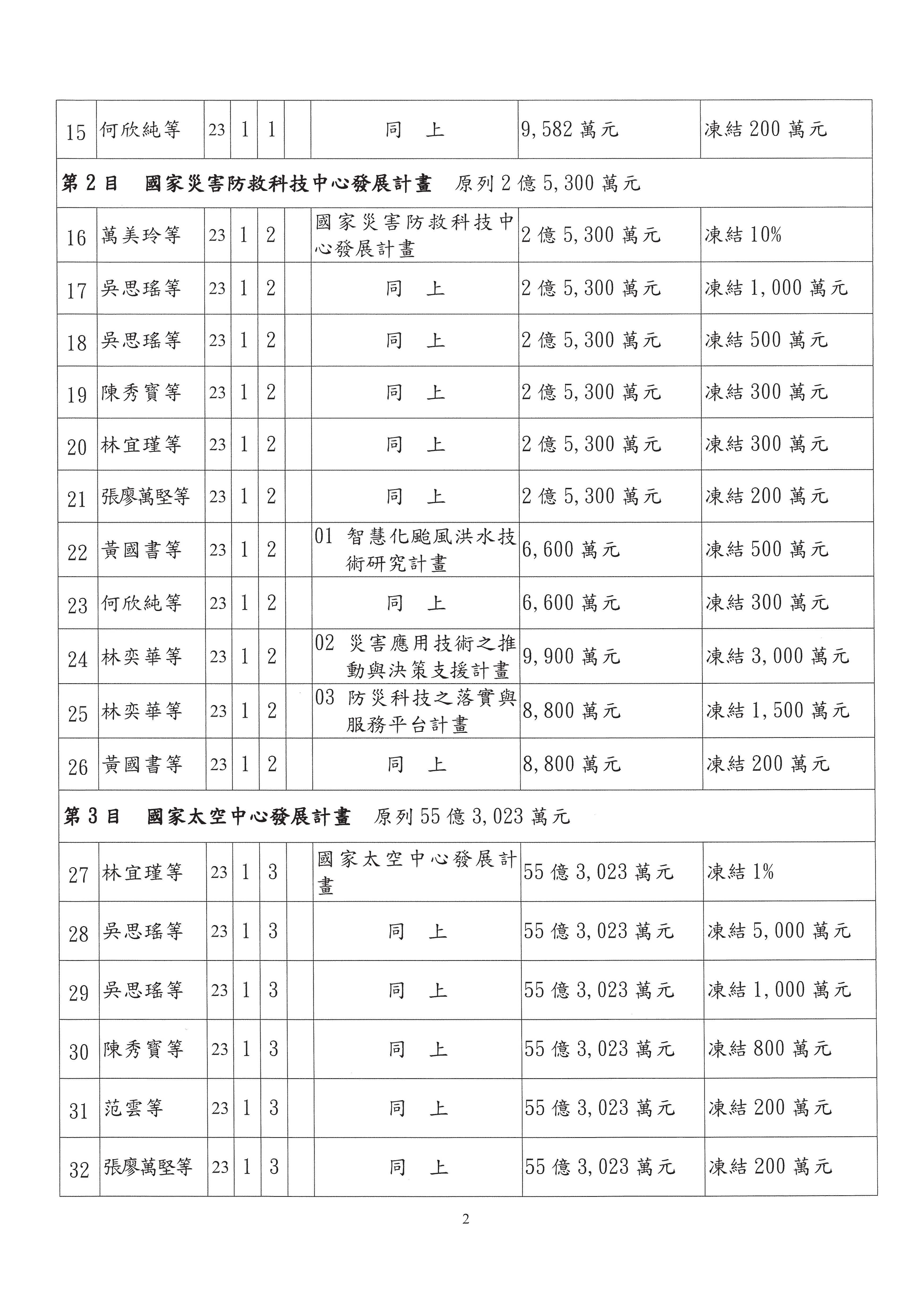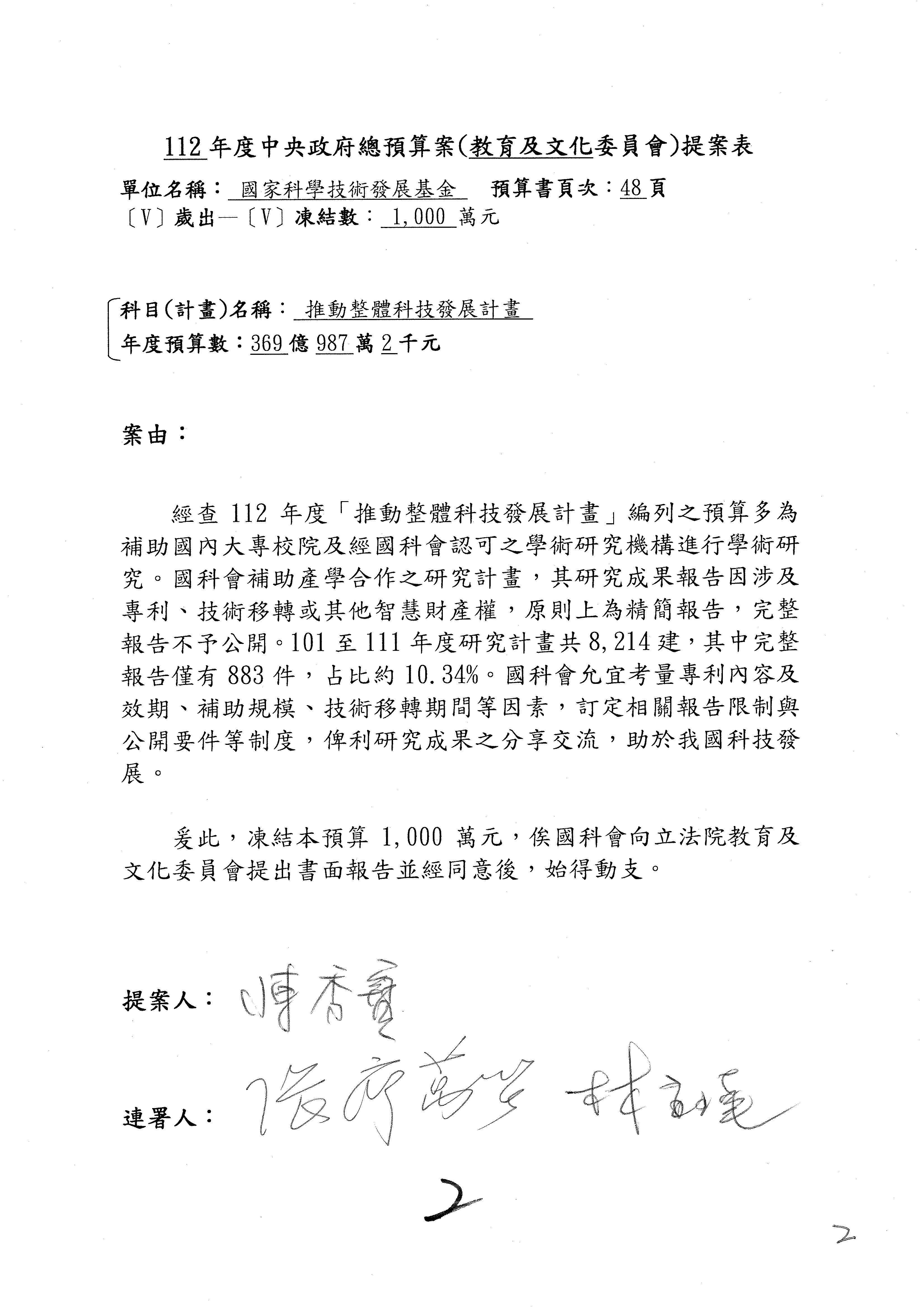 陳委員秀寳:本席提的是第2案,關於推動整體科技發展計畫,國科會補助產學合作之研究計畫,其研究成果可能涉及專利、技術移轉或其他智慧財產權,原則上就是比較精簡的報告。本席的意思是說,我們可以針對專利內容及效期、補助規模或其他因素,制定一個比較嚴謹的、公開的交流機制,讓這些研發出來的成果能夠分享或是讓產業界大家可以互相去交流。本席的意思並不是要把所有、一切的研究報告公開,你們一定可以訂出一個比較嚴謹的公開交流機制,所以這個部分本席滿堅持的,希望、要求國科會審慎制定公開的辦法,讓不會侵害到商業機密跟專利權的科研成果可以更有利於分享跟交流。本席提凍的金額是1,000萬元,但這個部分大家可以再討論一下。以上,謝謝。