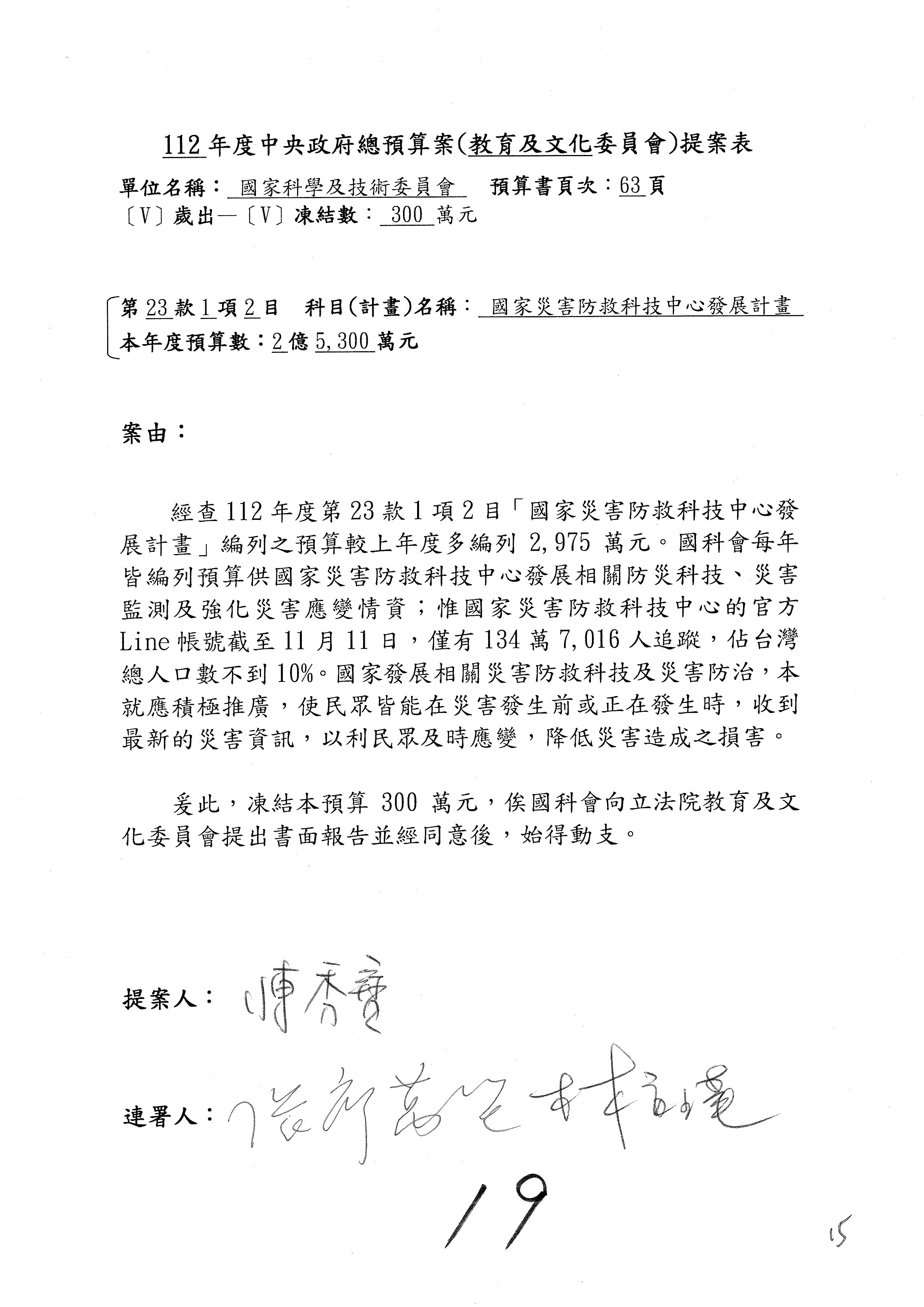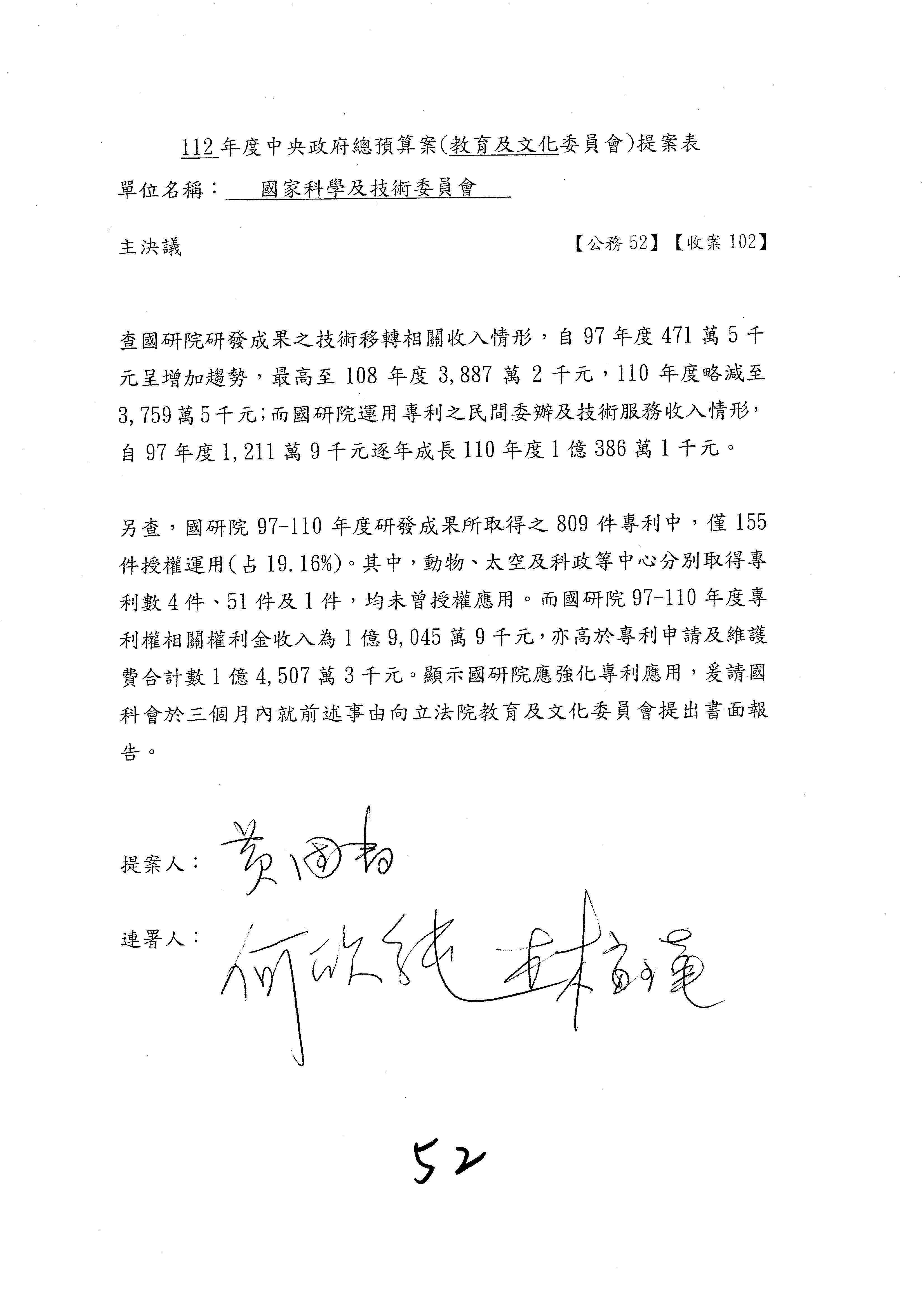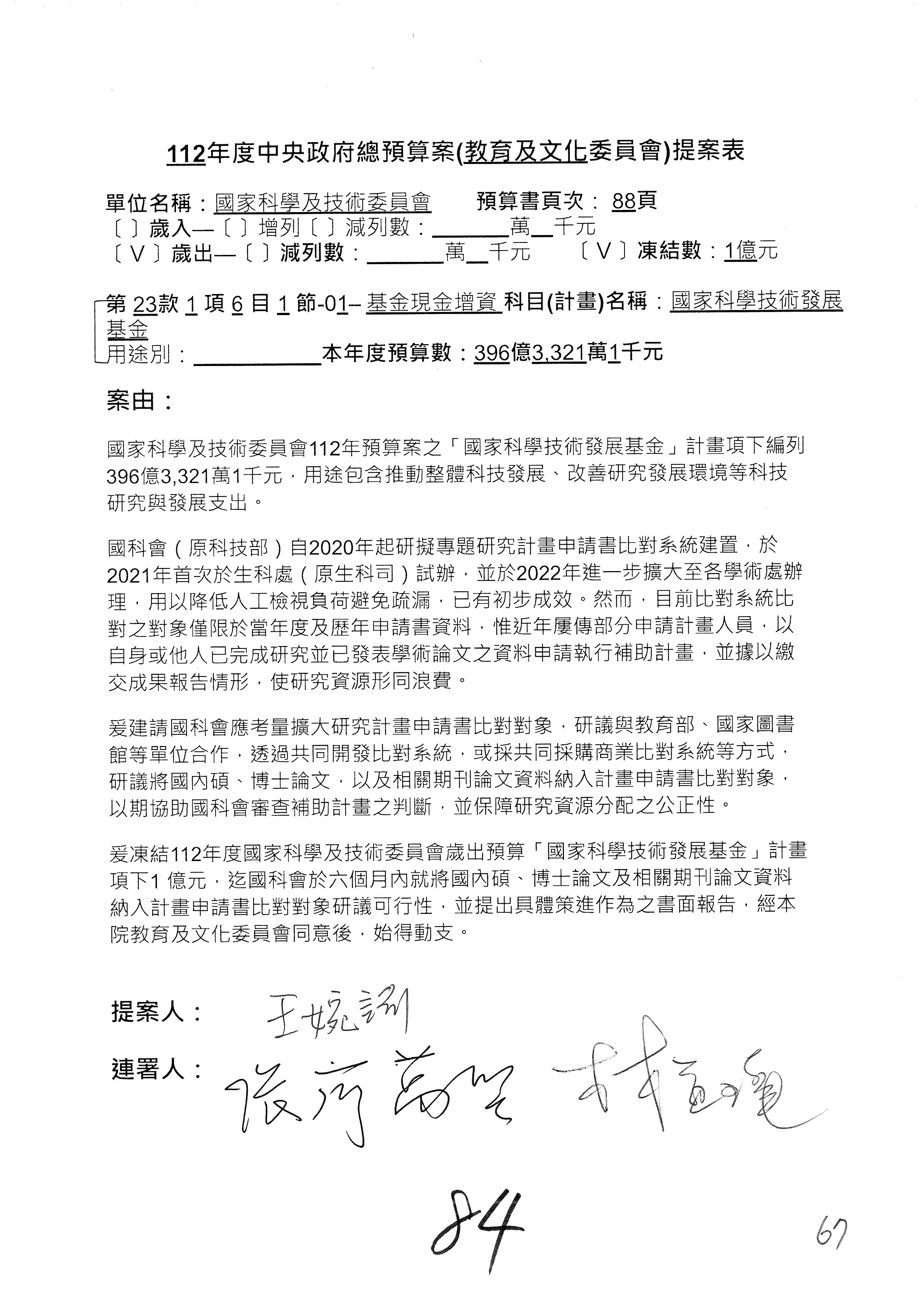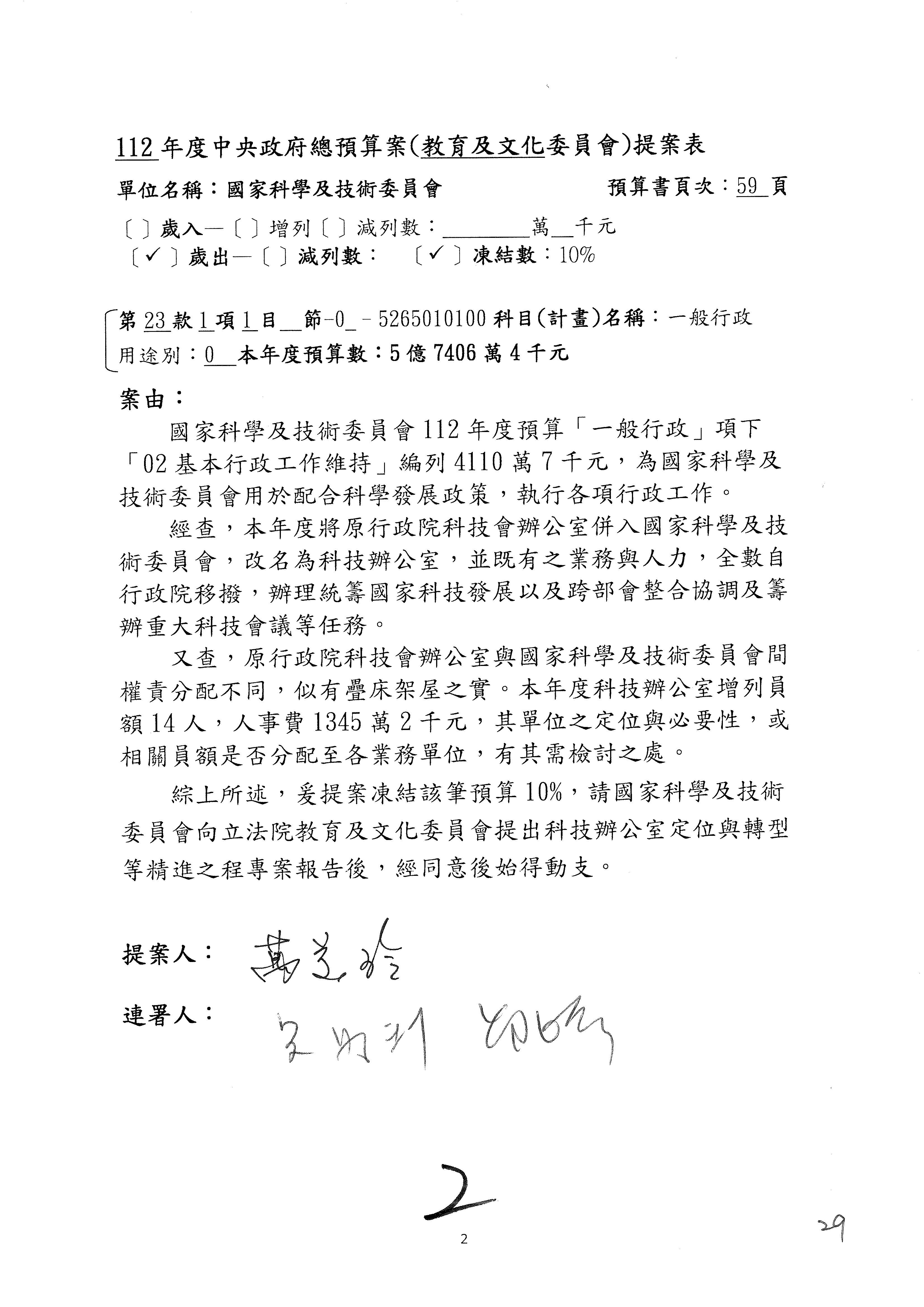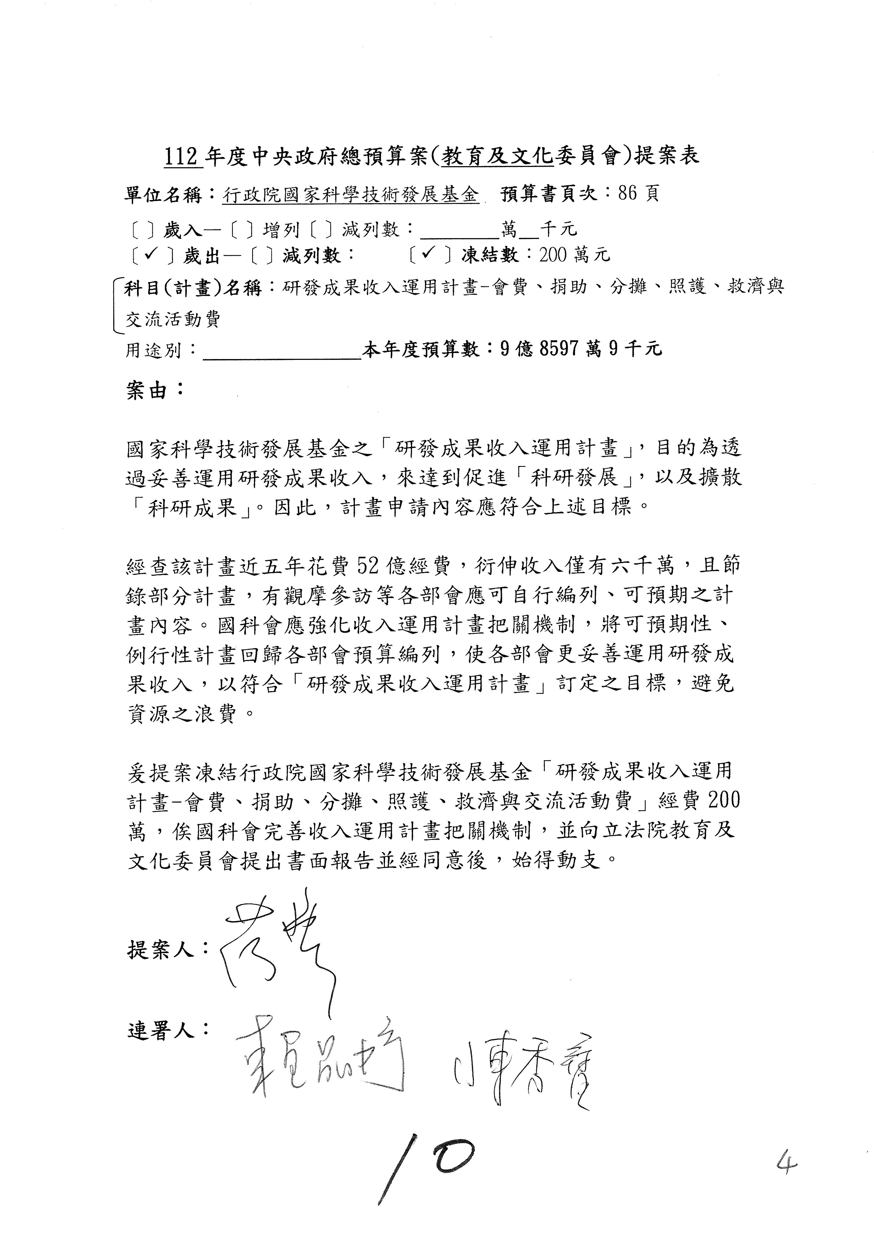 陳委員秀寳:本席提的是第2案,關於推動整體科技發展計畫,國科會補助產學合作之研究計畫,其研究成果可能涉及專利、技術移轉或其他智慧財產權,原則上就是比較精簡的報告。本席的意思是說,我們可以針對專利內容及效期、補助規模或其他因素,制定一個比較嚴謹的、公開的交流機制,讓這些研發出來的成果能夠分享或是讓產業界大家可以互相去交流。本席的意思並不是要把所有、一切的研究報告公開,你們一定可以訂出一個比較嚴謹的公開交流機制,所以這個部分本席滿堅持的,希望、要求國科會審慎制定公開的辦法,讓不會侵害到商業機密跟專利權的科研成果可以更有利於分享跟交流。本席提凍的金額是1,000萬元,但這個部分大家可以再討論一下。以上,謝謝。