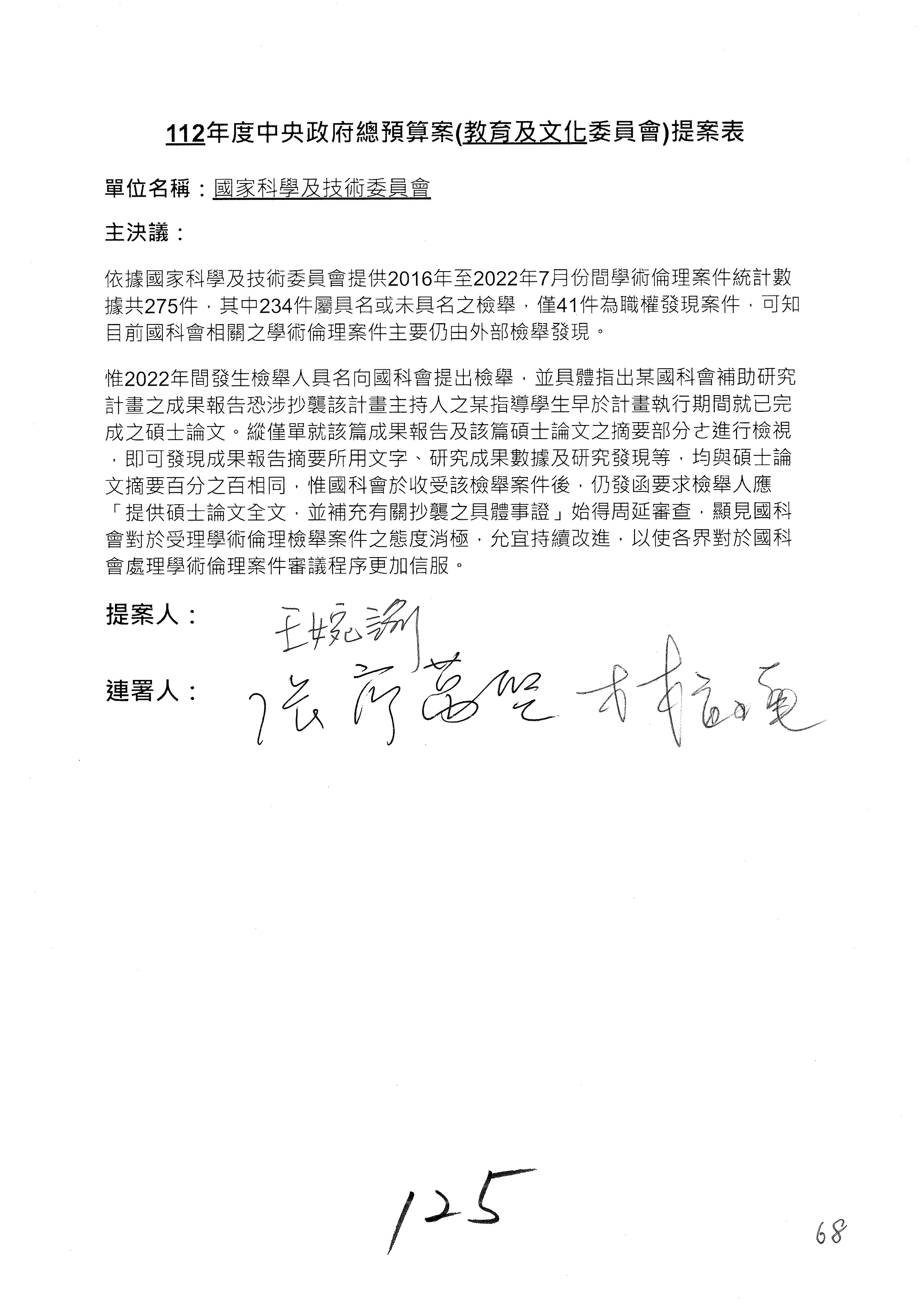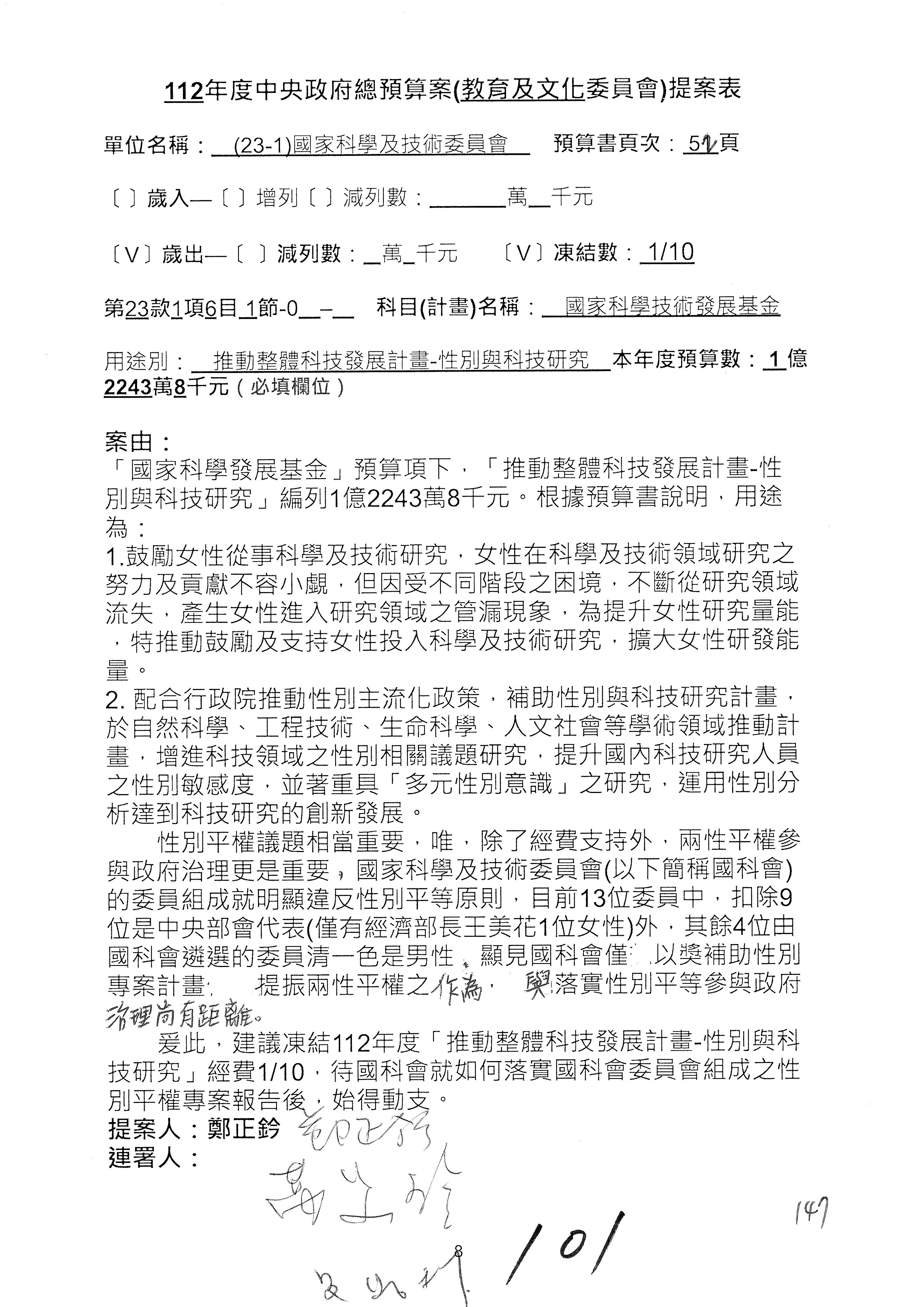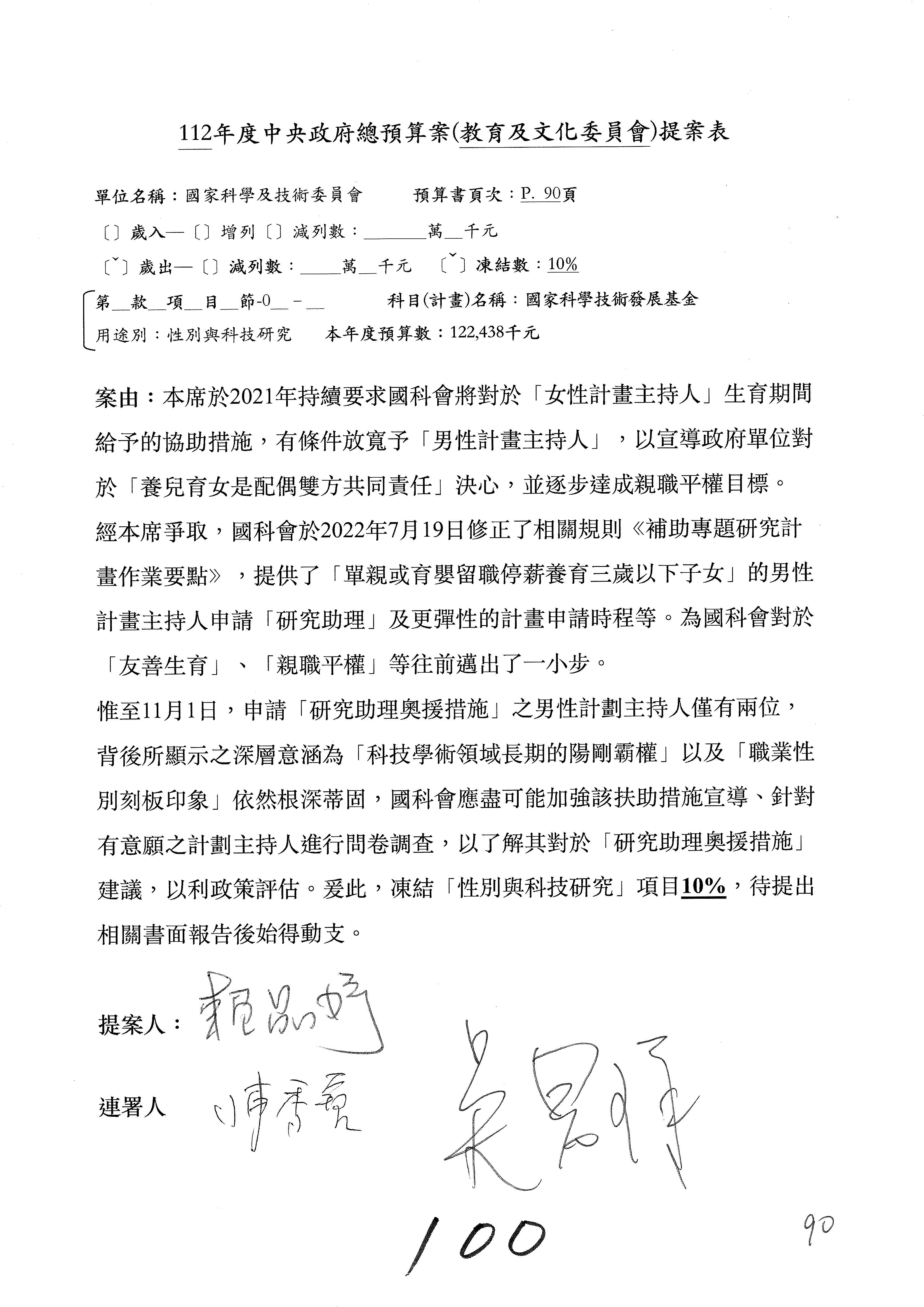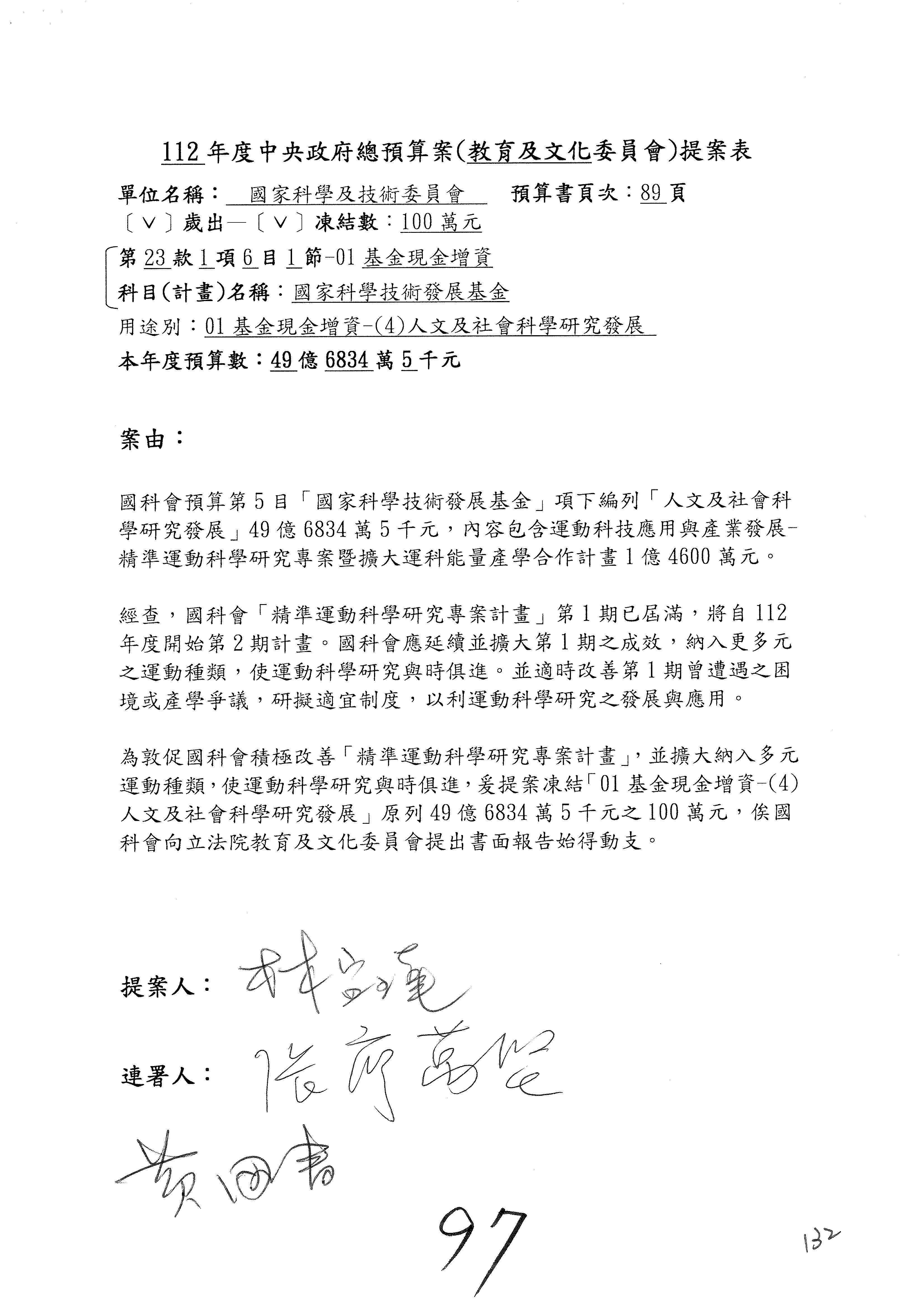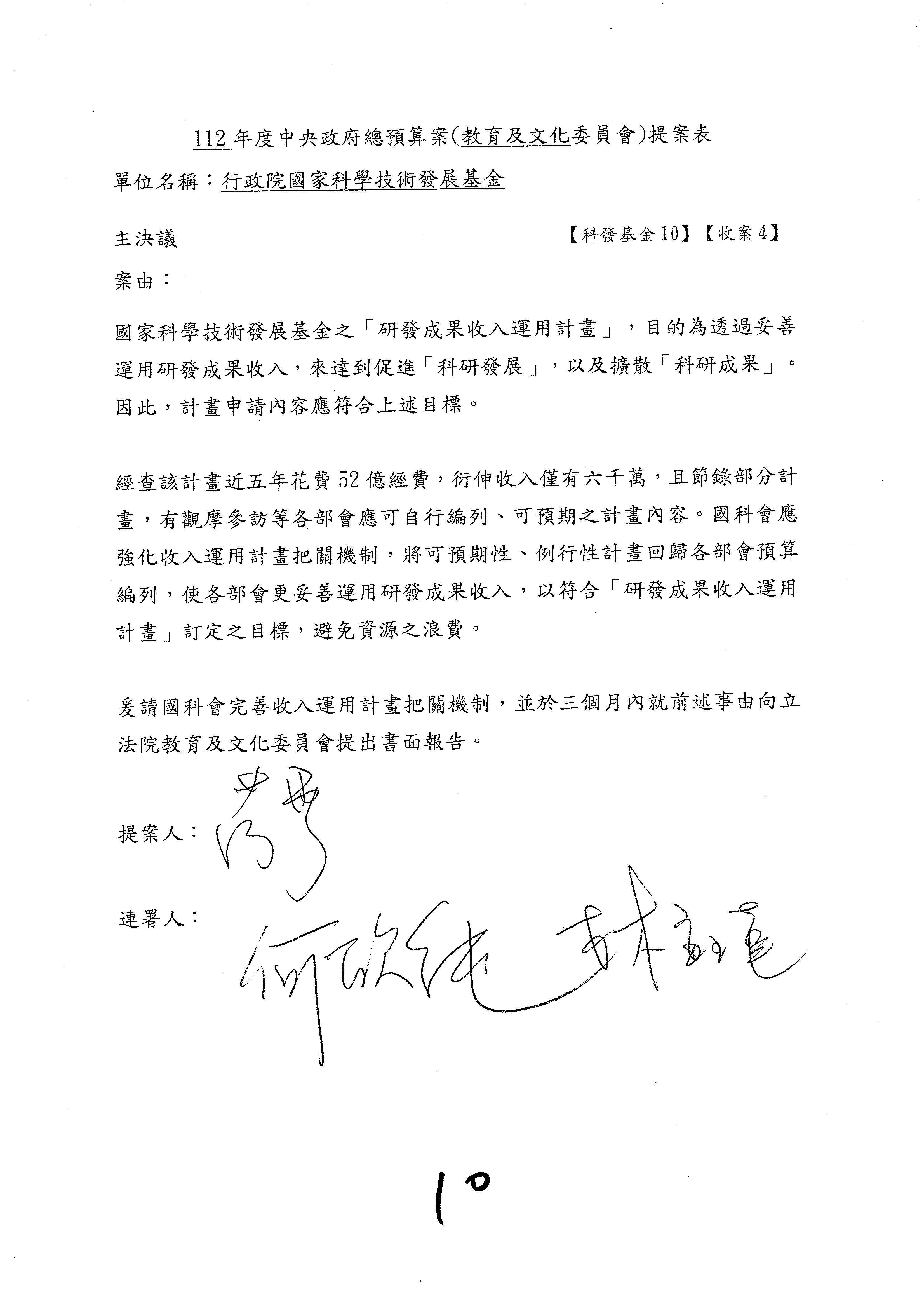 陳委員秀寳:本席提的是第2案,關於推動整體科技發展計畫,國科會補助產學合作之研究計畫,其研究成果可能涉及專利、技術移轉或其他智慧財產權,原則上就是比較精簡的報告。本席的意思是說,我們可以針對專利內容及效期、補助規模或其他因素,制定一個比較嚴謹的、公開的交流機制,讓這些研發出來的成果能夠分享或是讓產業界大家可以互相去交流。本席的意思並不是要把所有、一切的研究報告公開,你們一定可以訂出一個比較嚴謹的公開交流機制,所以這個部分本席滿堅持的,希望、要求國科會審慎制定公開的辦法,讓不會侵害到商業機密跟專利權的科研成果可以更有利於分享跟交流。本席提凍的金額是1,000萬元,但這個部分大家可以再討論一下。以上,謝謝。