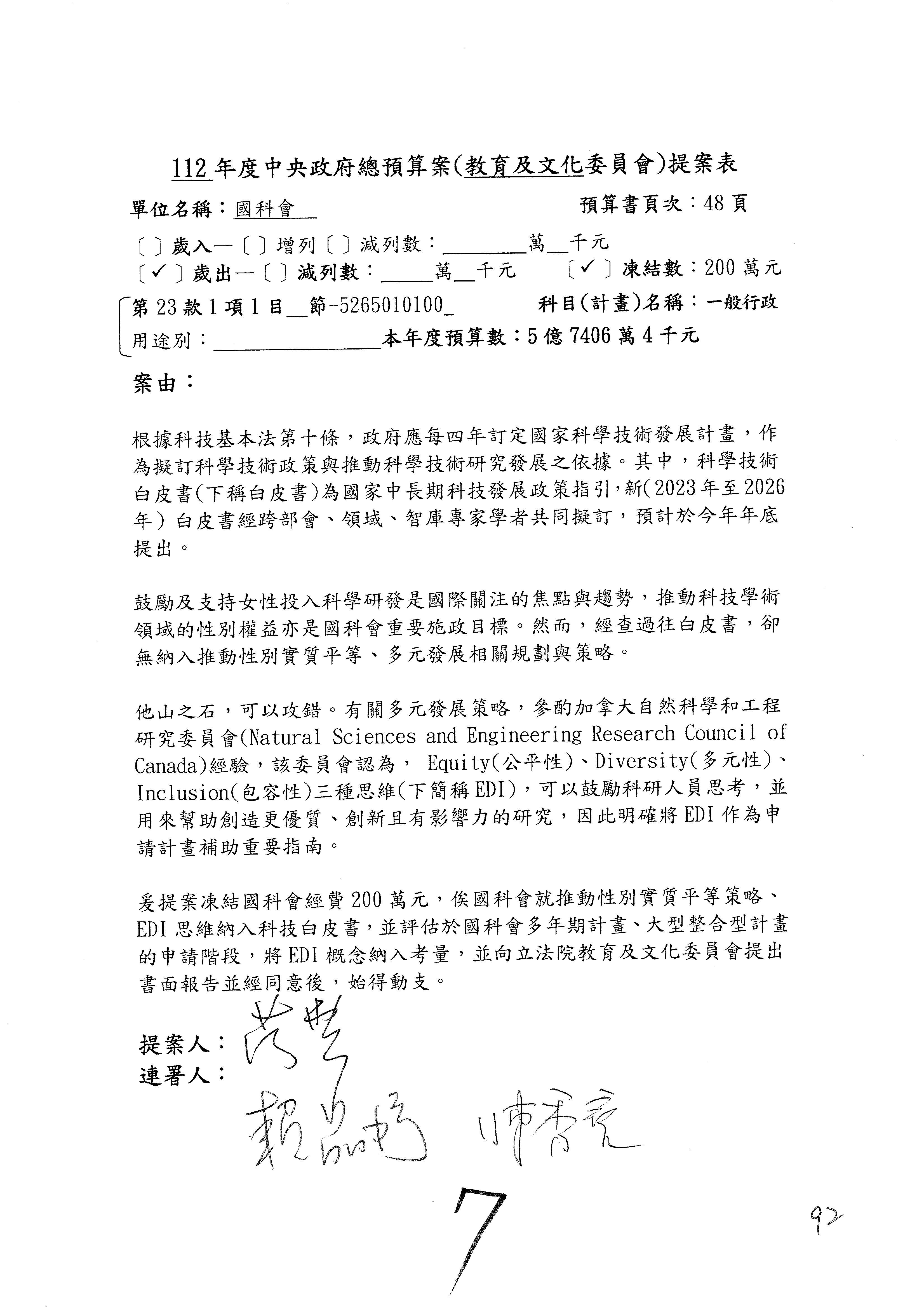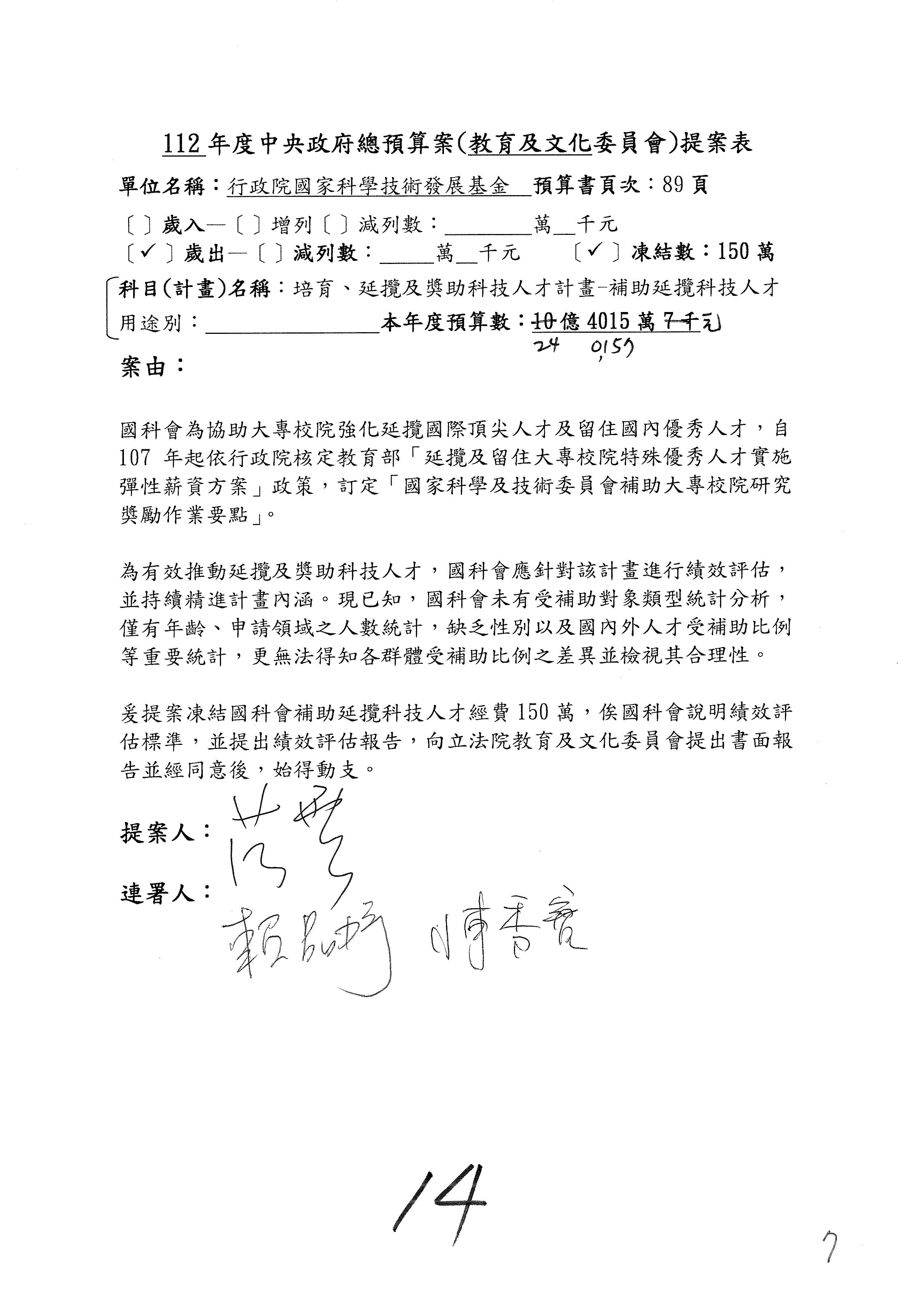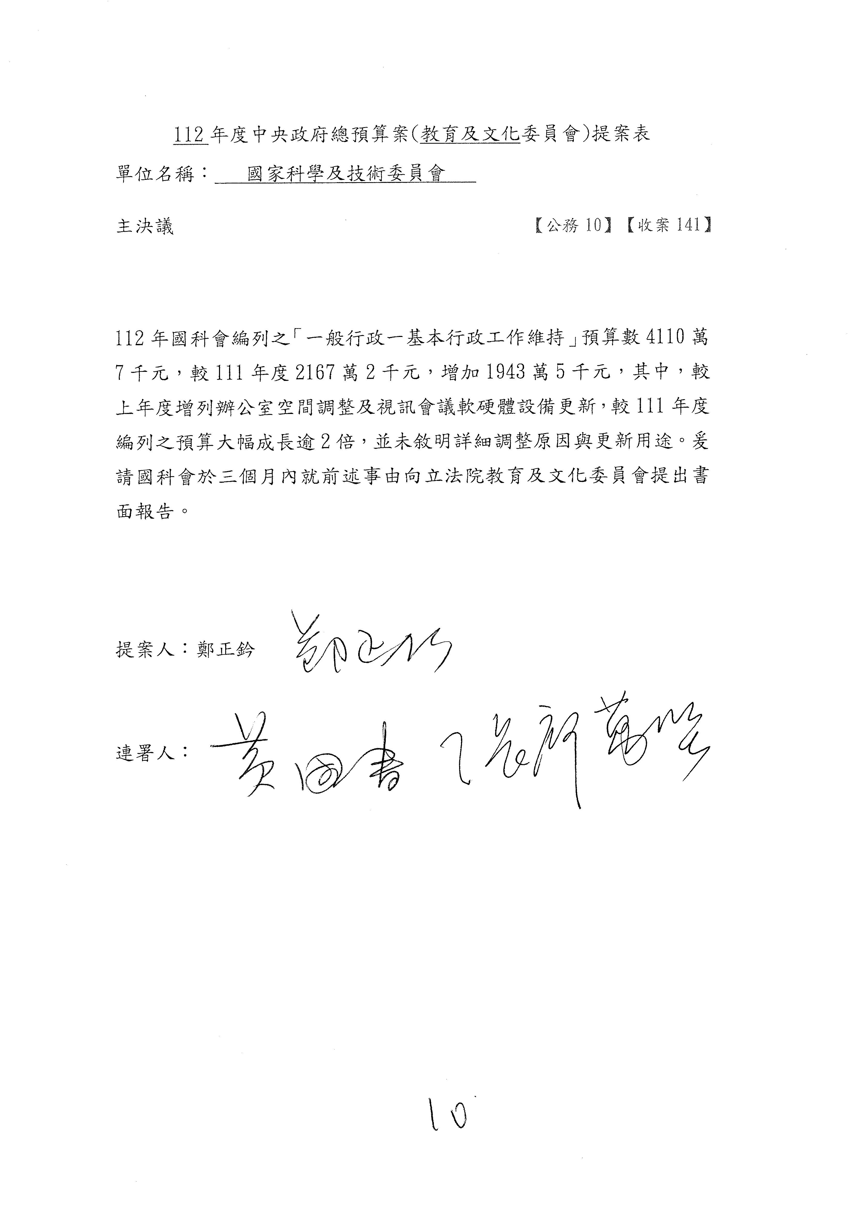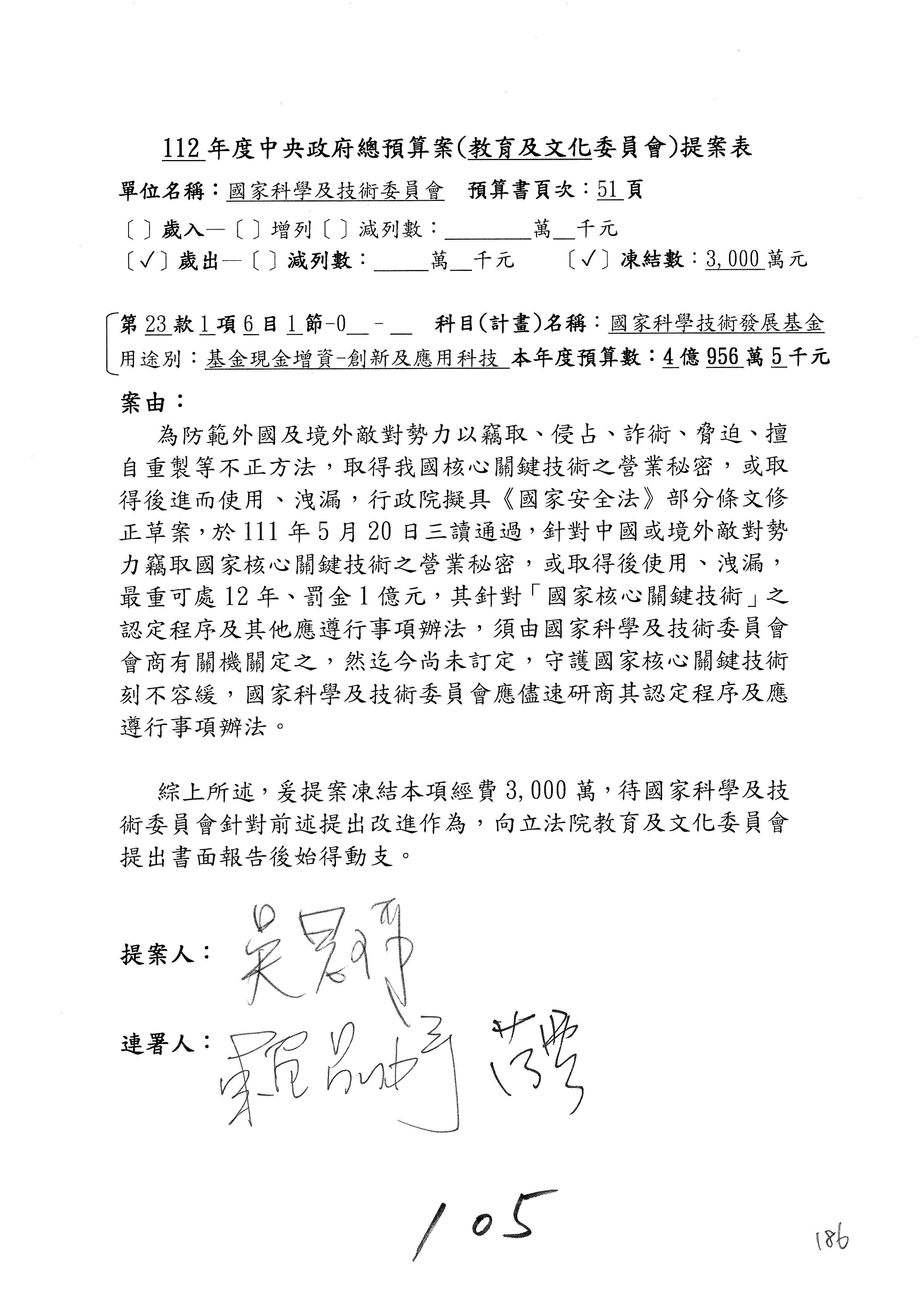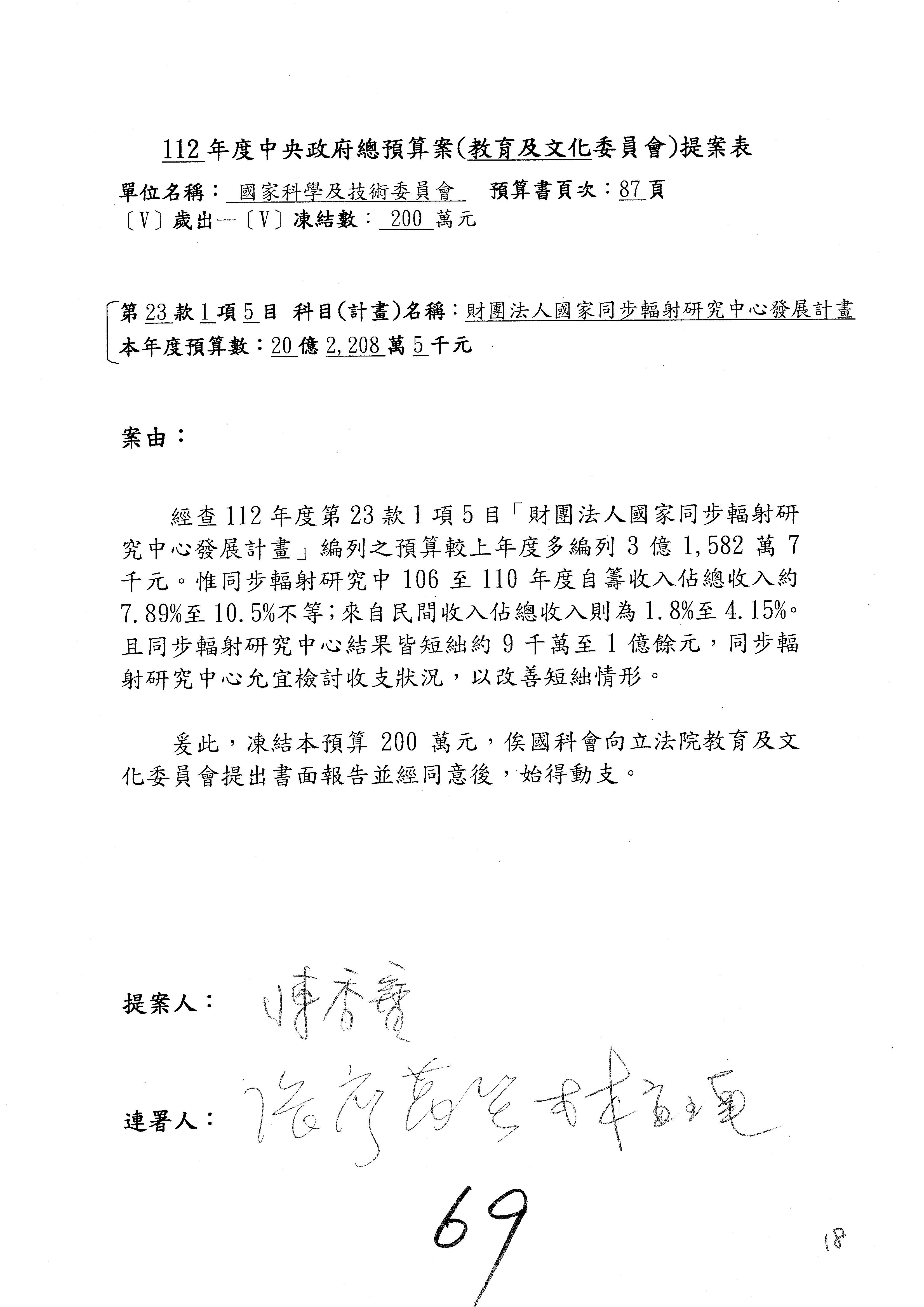 陳委員秀寳:本席提的是第2案,關於推動整體科技發展計畫,國科會補助產學合作之研究計畫,其研究成果可能涉及專利、技術移轉或其他智慧財產權,原則上就是比較精簡的報告。本席的意思是說,我們可以針對專利內容及效期、補助規模或其他因素,制定一個比較嚴謹的、公開的交流機制,讓這些研發出來的成果能夠分享或是讓產業界大家可以互相去交流。本席的意思並不是要把所有、一切的研究報告公開,你們一定可以訂出一個比較嚴謹的公開交流機制,所以這個部分本席滿堅持的,希望、要求國科會審慎制定公開的辦法,讓不會侵害到商業機密跟專利權的科研成果可以更有利於分享跟交流。本席提凍的金額是1,000萬元,但這個部分大家可以再討論一下。以上,謝謝。