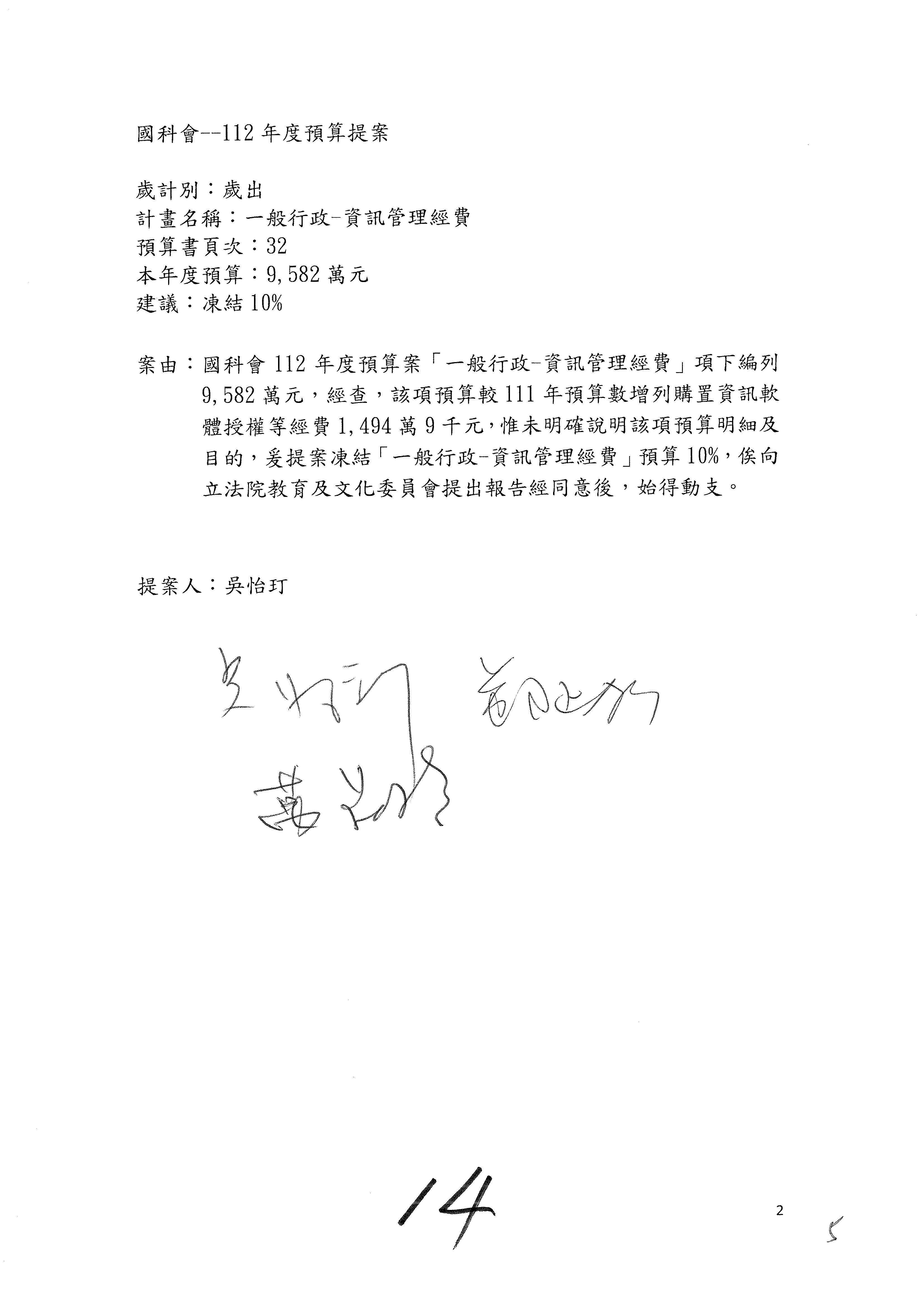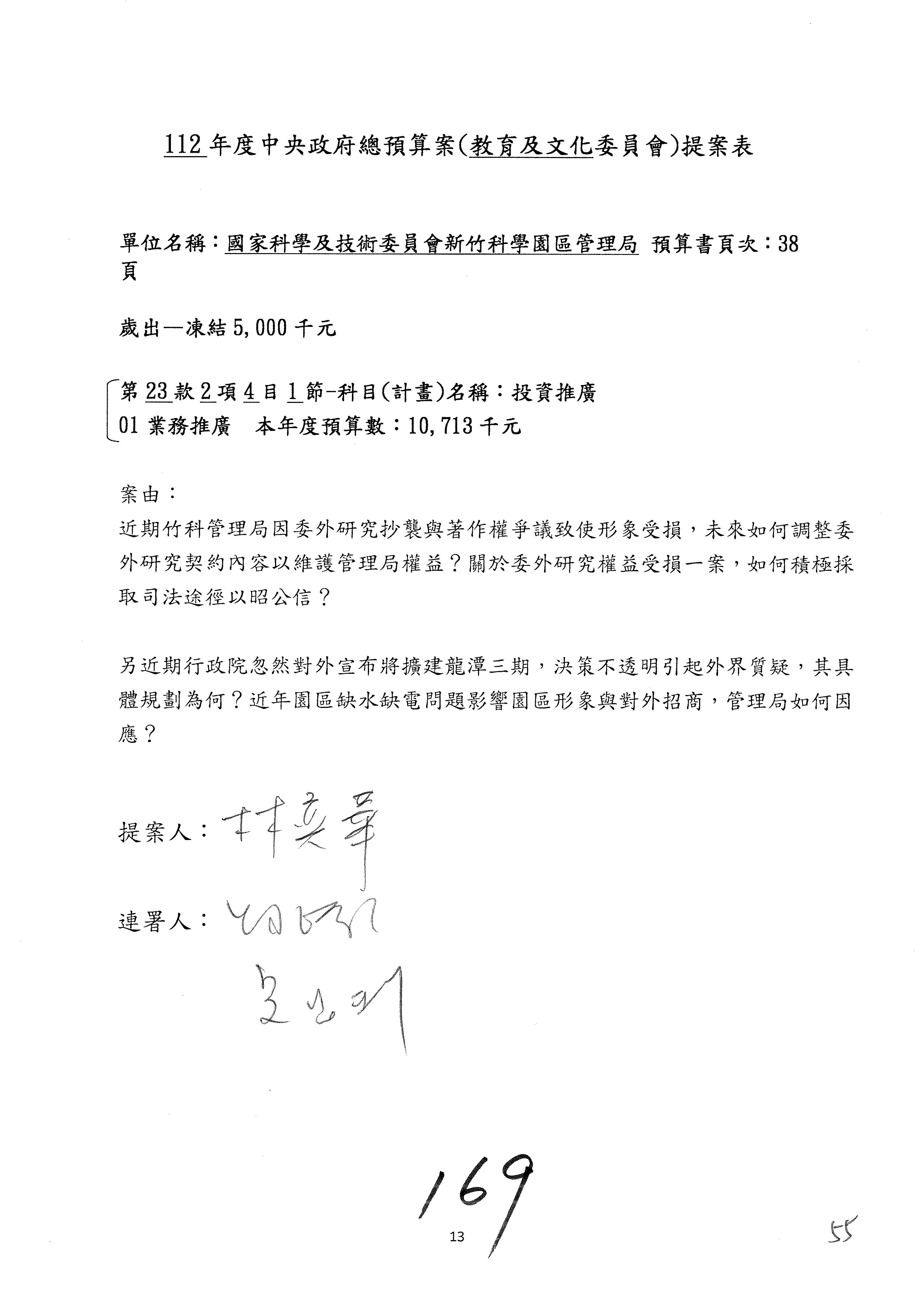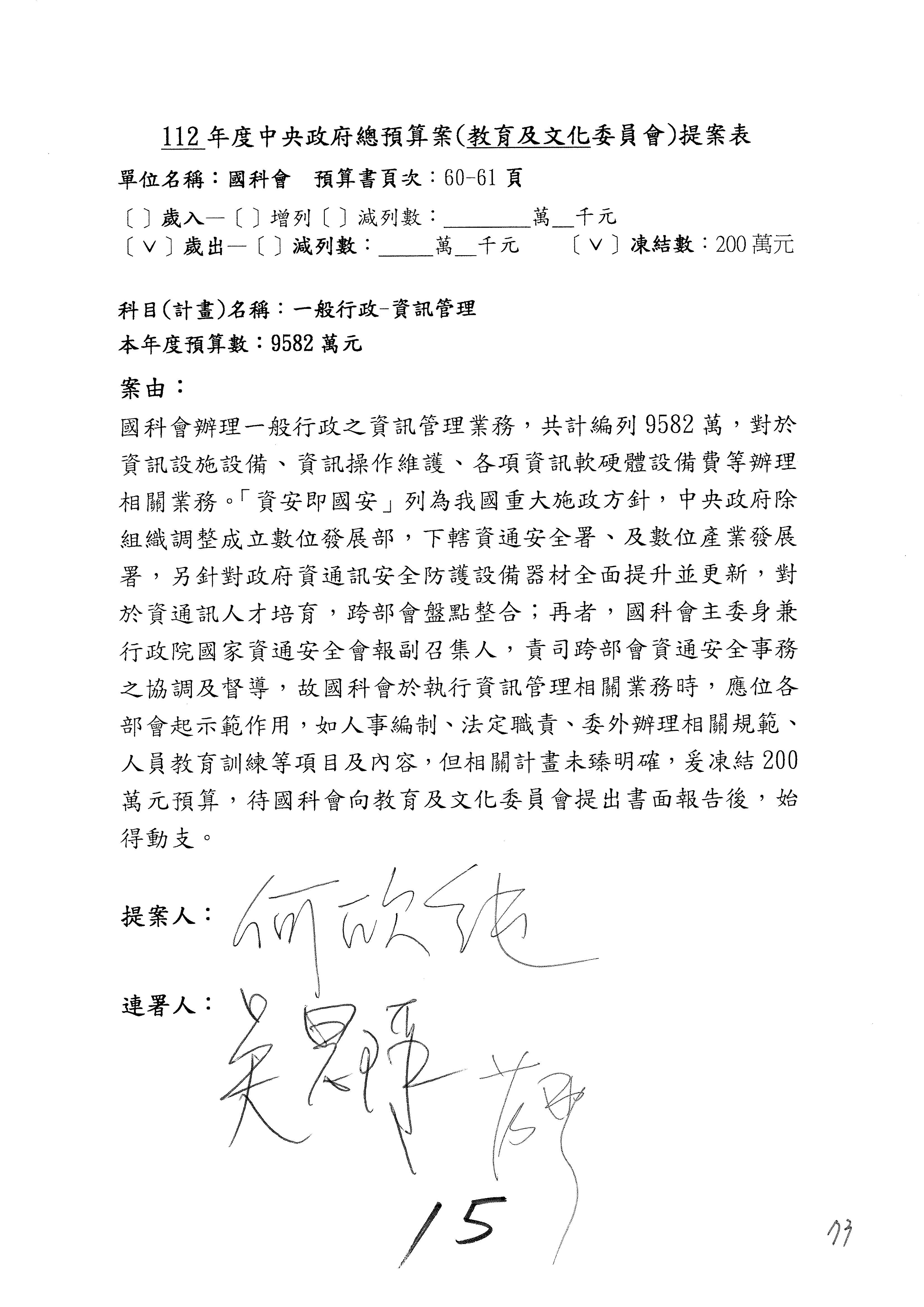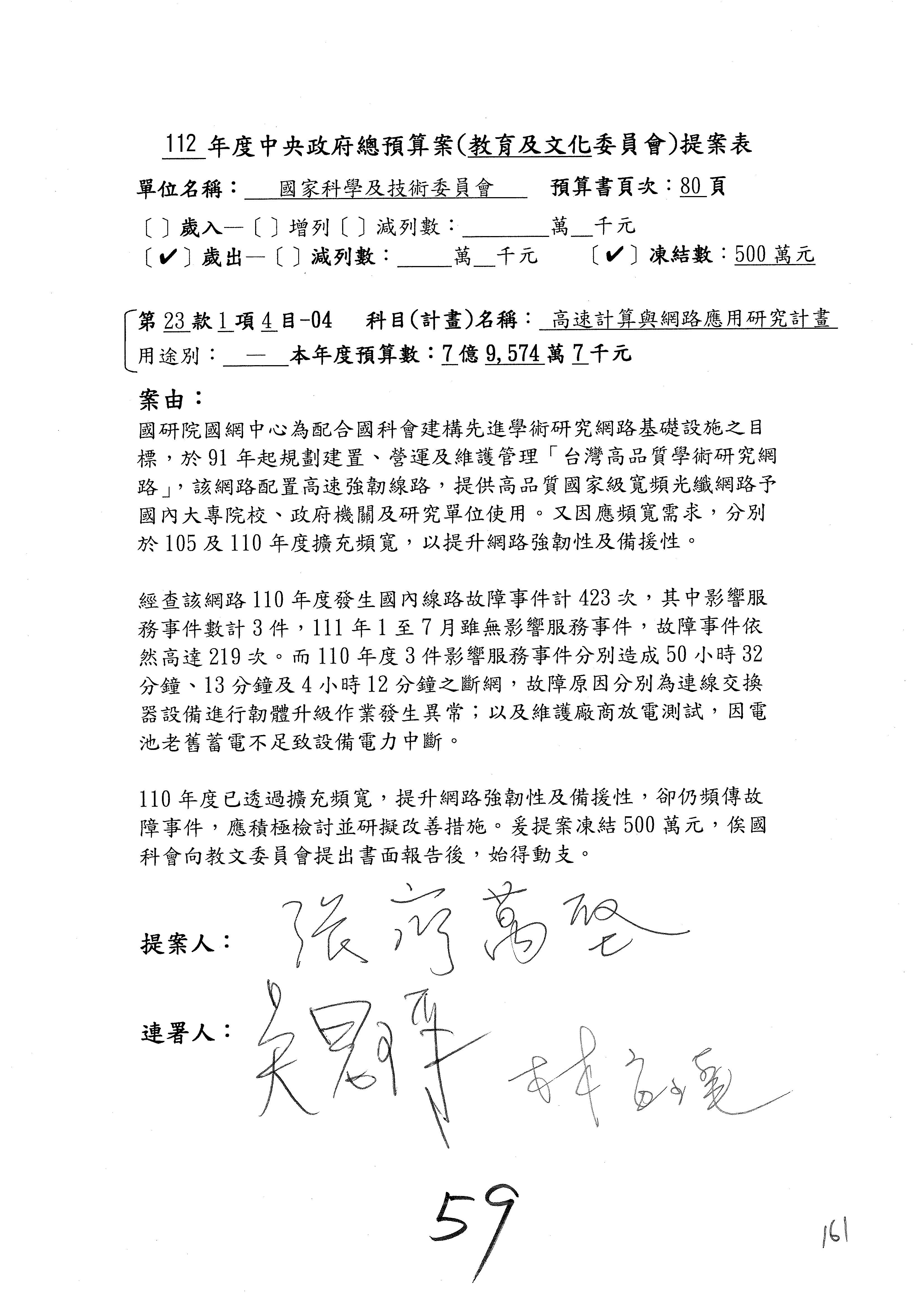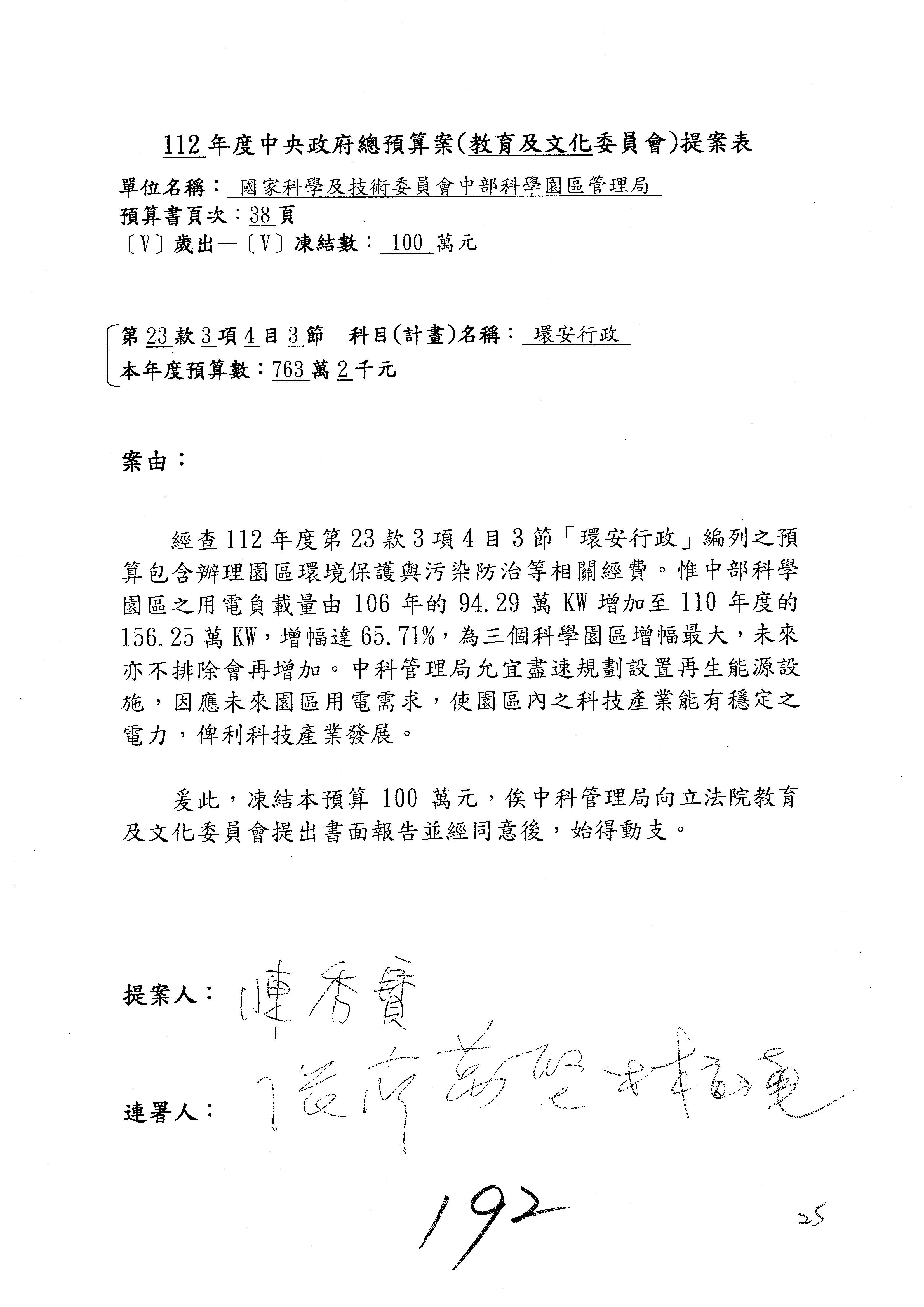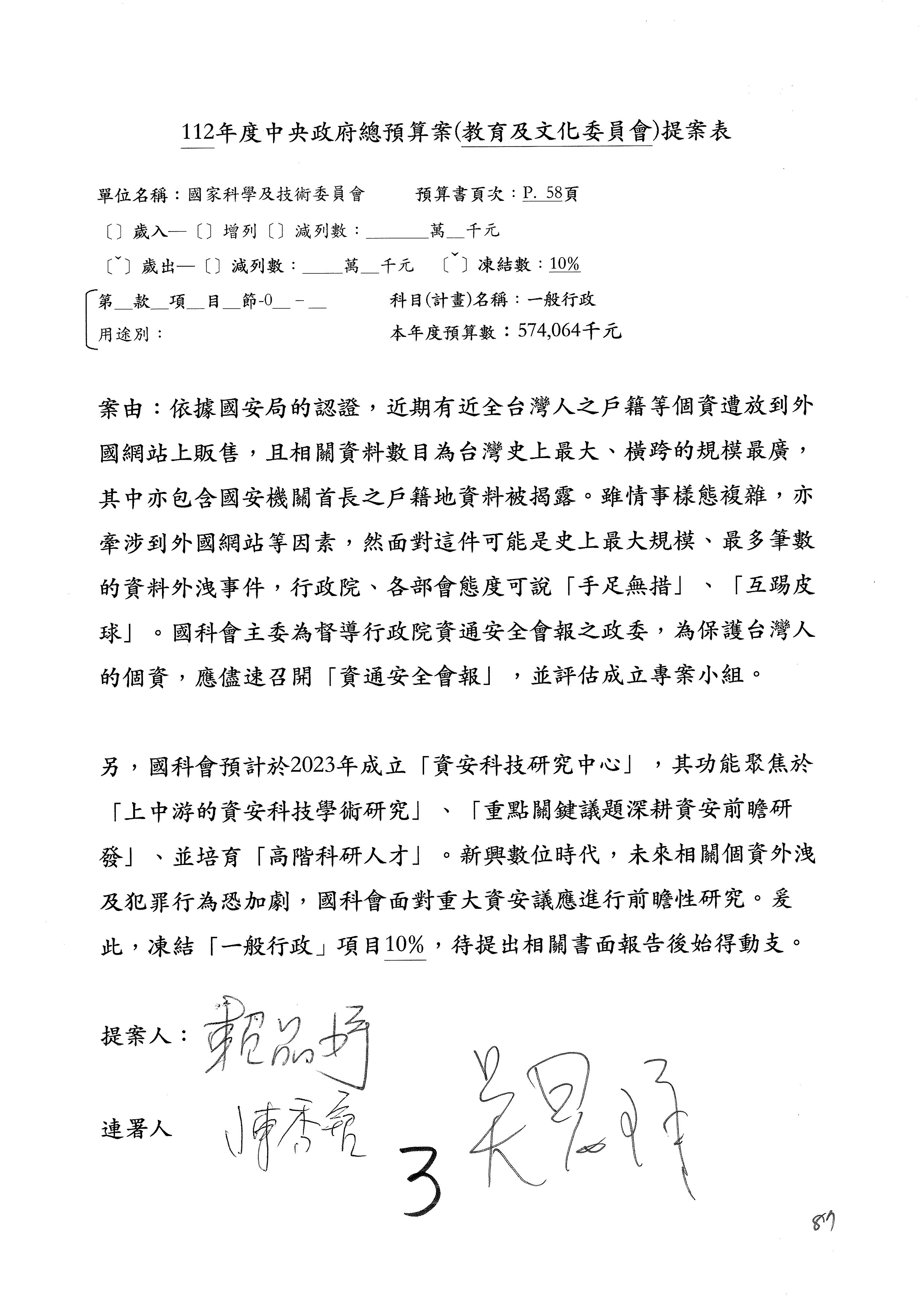 陳委員秀寳:本席提的是第2案,關於推動整體科技發展計畫,國科會補助產學合作之研究計畫,其研究成果可能涉及專利、技術移轉或其他智慧財產權,原則上就是比較精簡的報告。本席的意思是說,我們可以針對專利內容及效期、補助規模或其他因素,制定一個比較嚴謹的、公開的交流機制,讓這些研發出來的成果能夠分享或是讓產業界大家可以互相去交流。本席的意思並不是要把所有、一切的研究報告公開,你們一定可以訂出一個比較嚴謹的公開交流機制,所以這個部分本席滿堅持的,希望、要求國科會審慎制定公開的辦法,讓不會侵害到商業機密跟專利權的科研成果可以更有利於分享跟交流。本席提凍的金額是1,000萬元,但這個部分大家可以再討論一下。以上,謝謝。