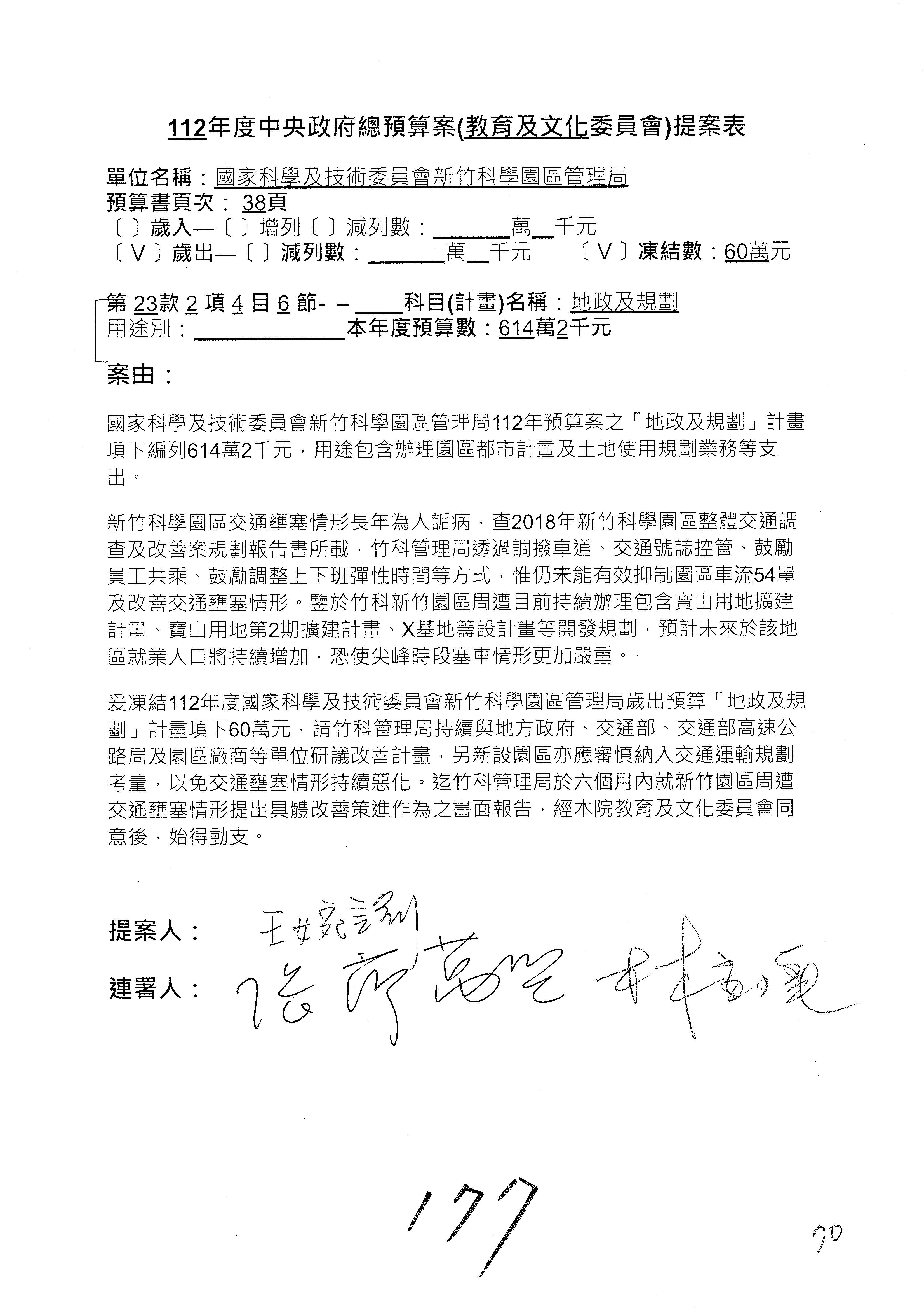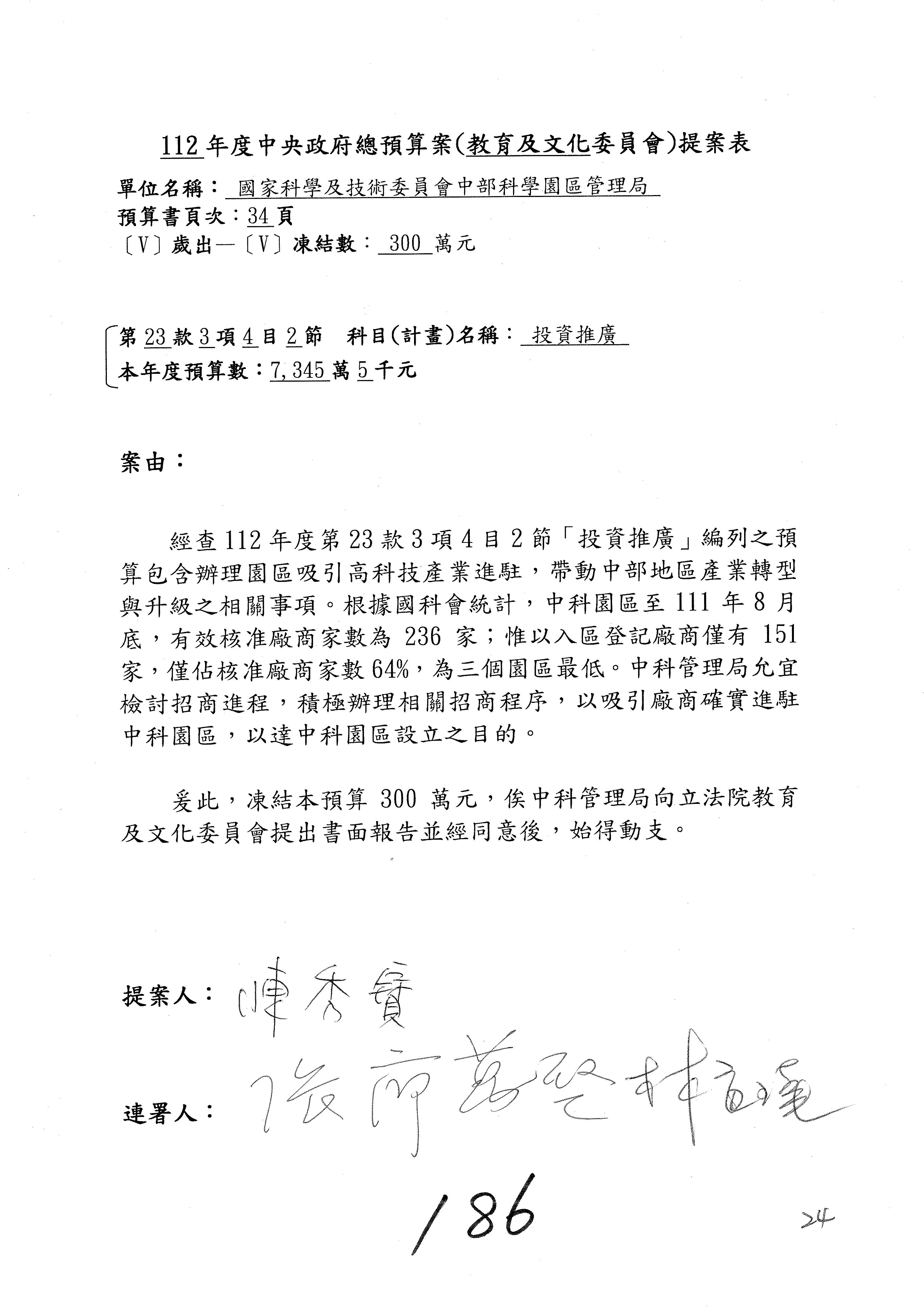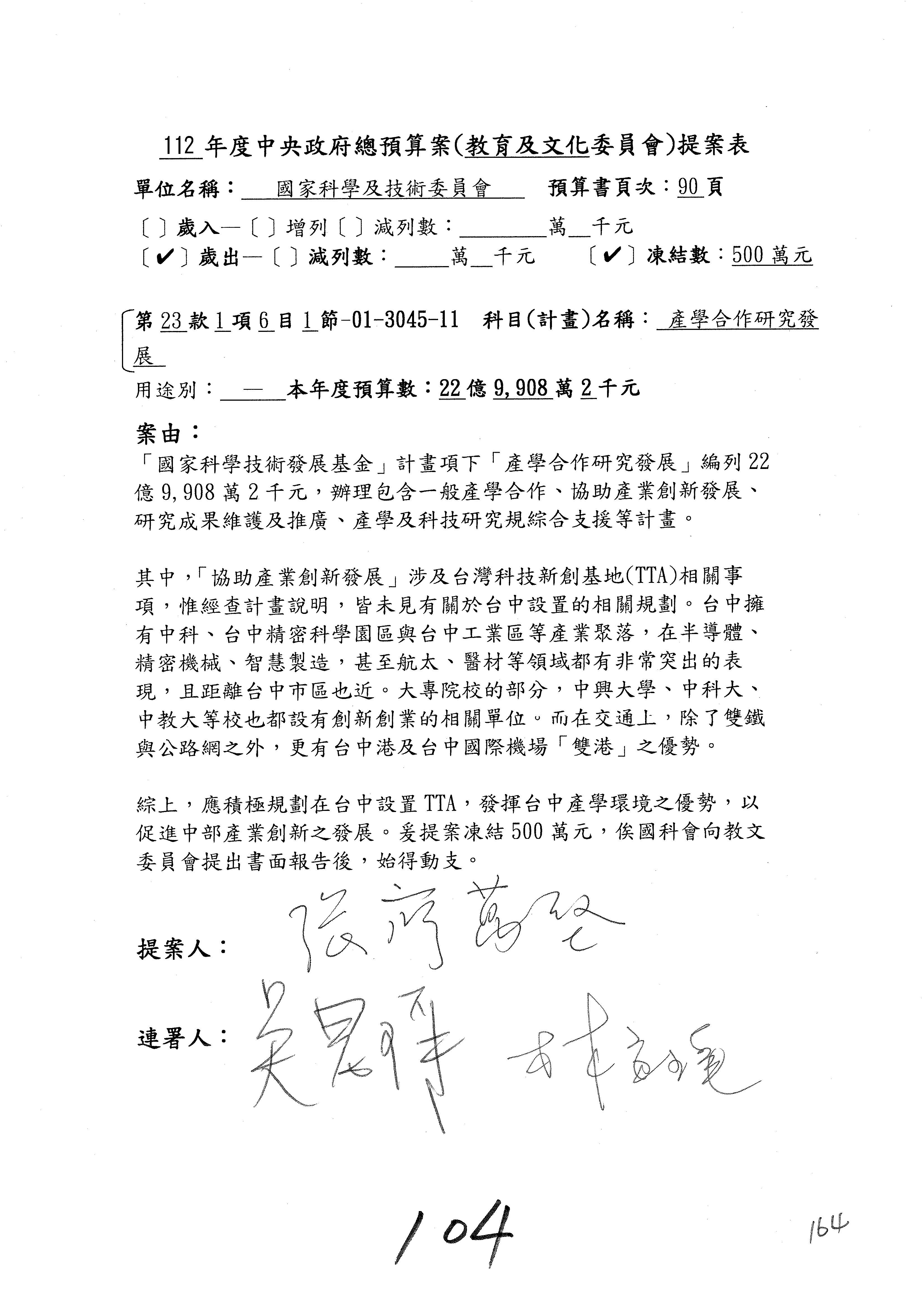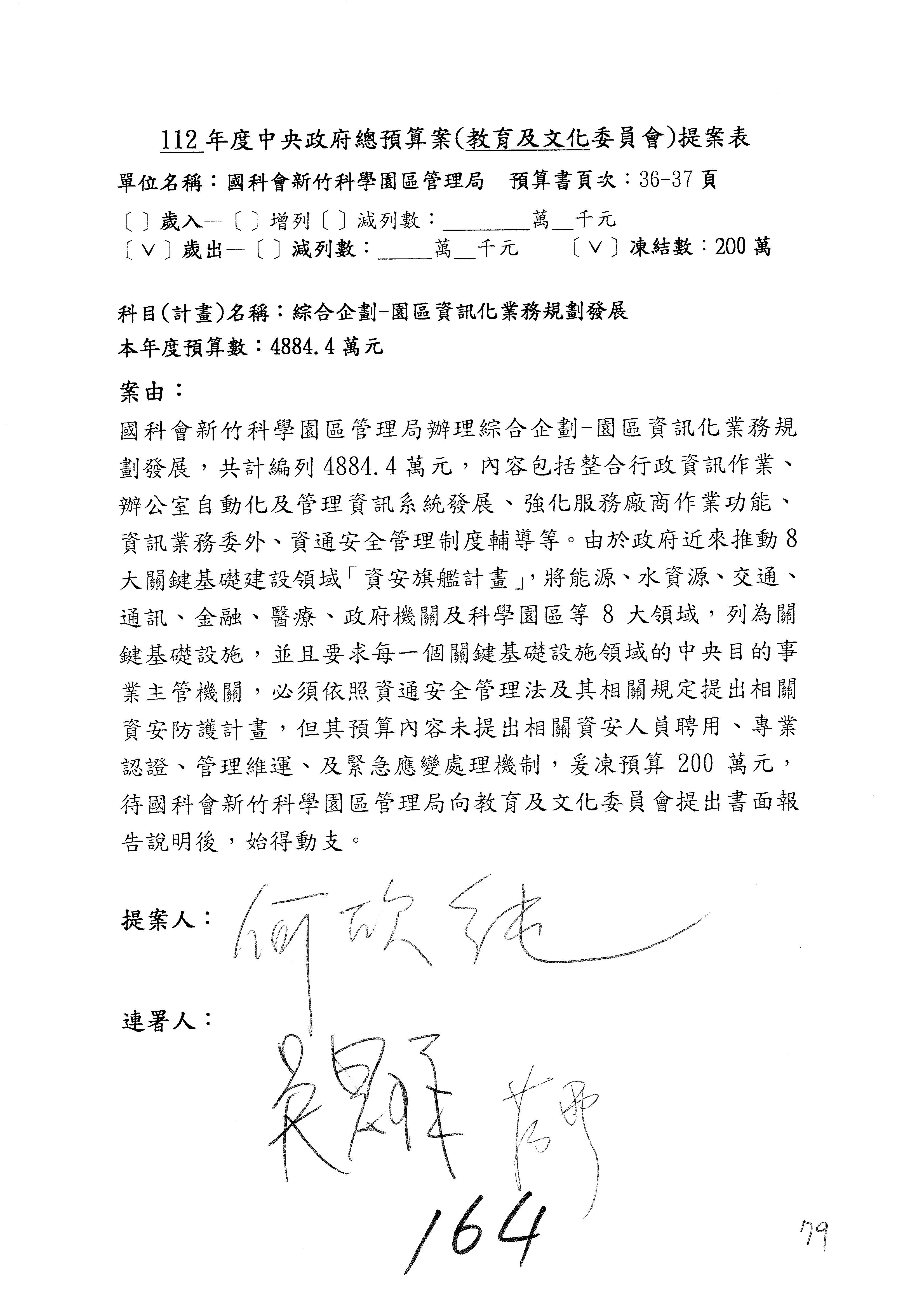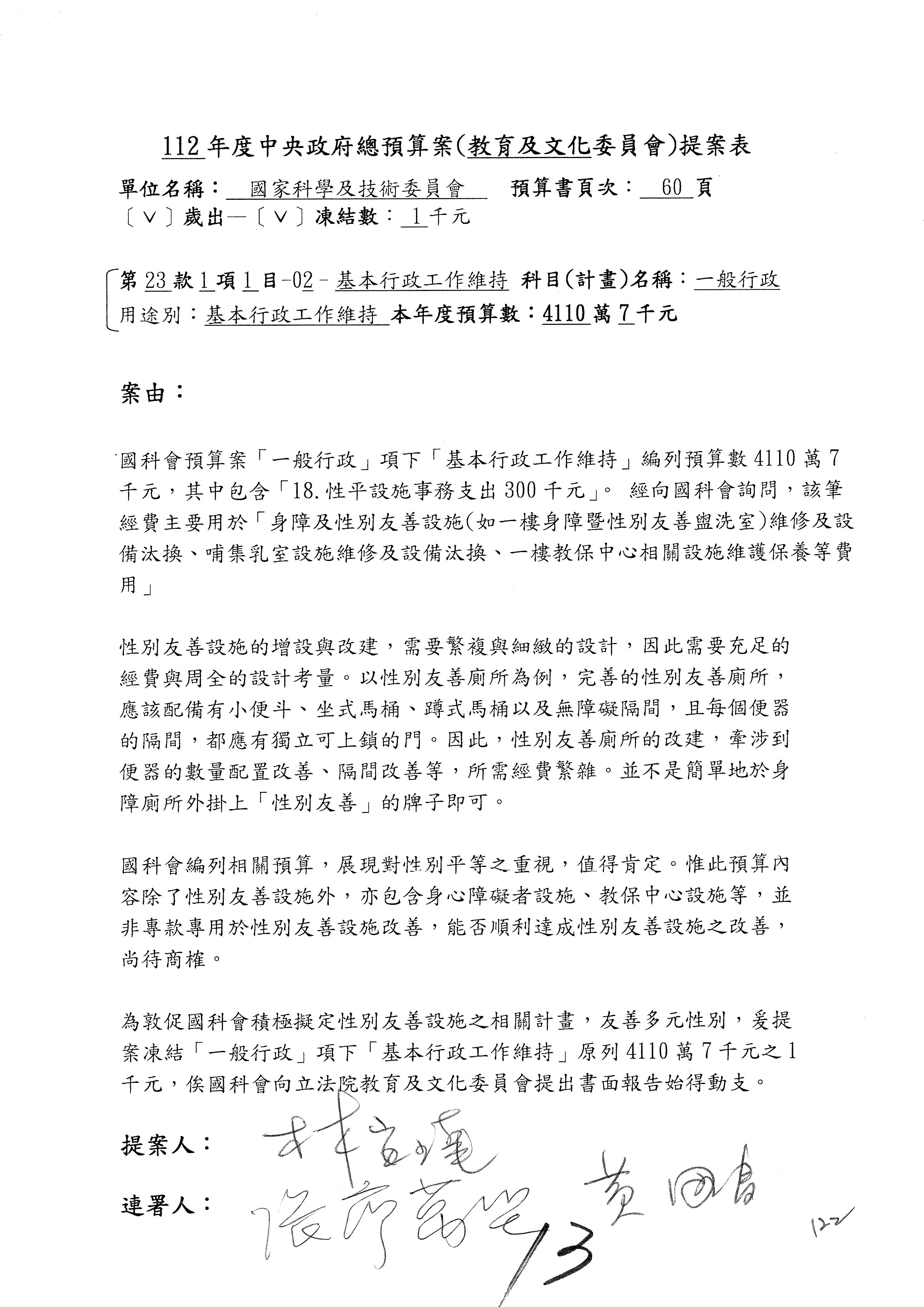 陳委員秀寳:本席提的是第2案,關於推動整體科技發展計畫,國科會補助產學合作之研究計畫,其研究成果可能涉及專利、技術移轉或其他智慧財產權,原則上就是比較精簡的報告。本席的意思是說,我們可以針對專利內容及效期、補助規模或其他因素,制定一個比較嚴謹的、公開的交流機制,讓這些研發出來的成果能夠分享或是讓產業界大家可以互相去交流。本席的意思並不是要把所有、一切的研究報告公開,你們一定可以訂出一個比較嚴謹的公開交流機制,所以這個部分本席滿堅持的,希望、要求國科會審慎制定公開的辦法,讓不會侵害到商業機密跟專利權的科研成果可以更有利於分享跟交流。本席提凍的金額是1,000萬元,但這個部分大家可以再討論一下。以上,謝謝。