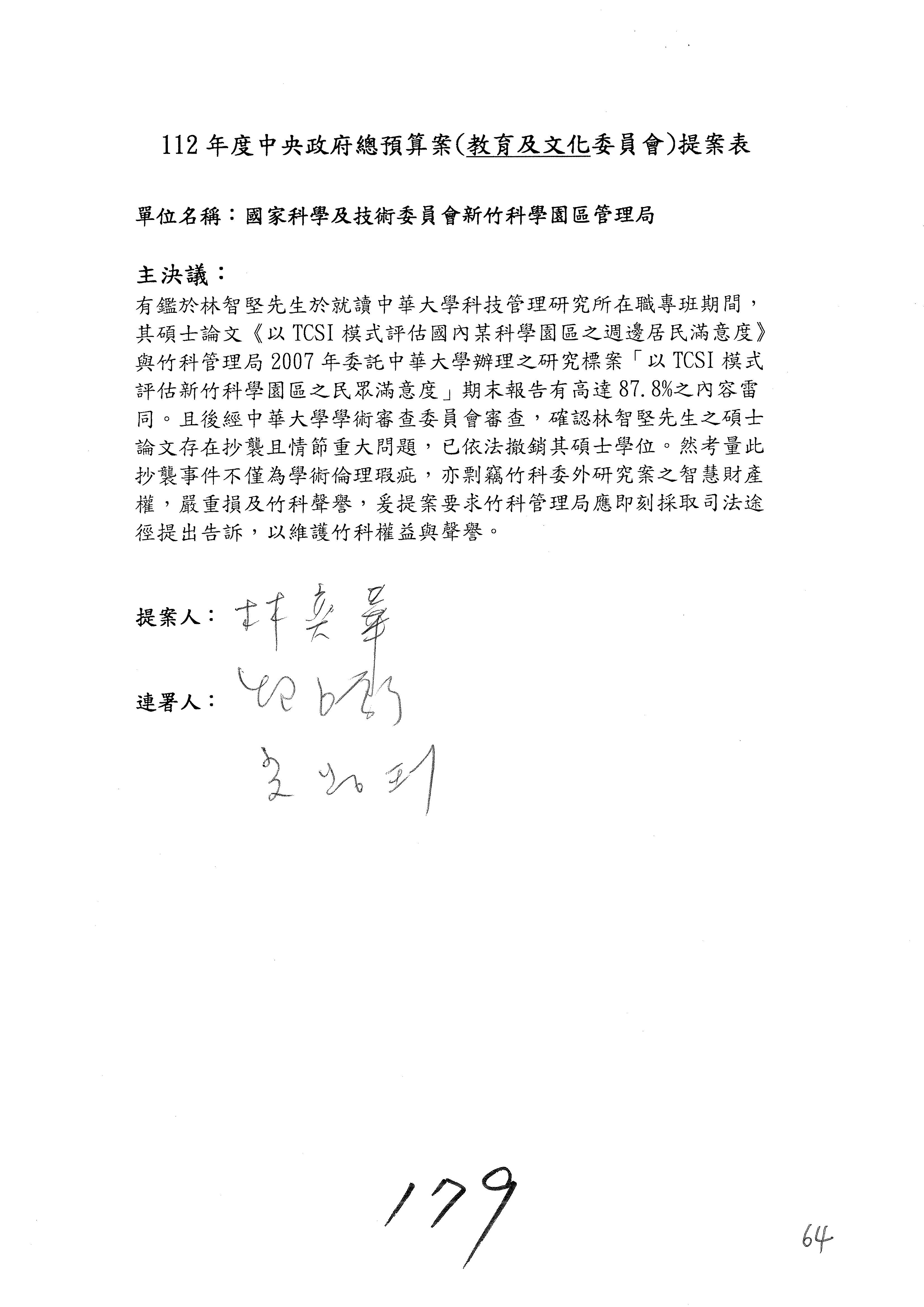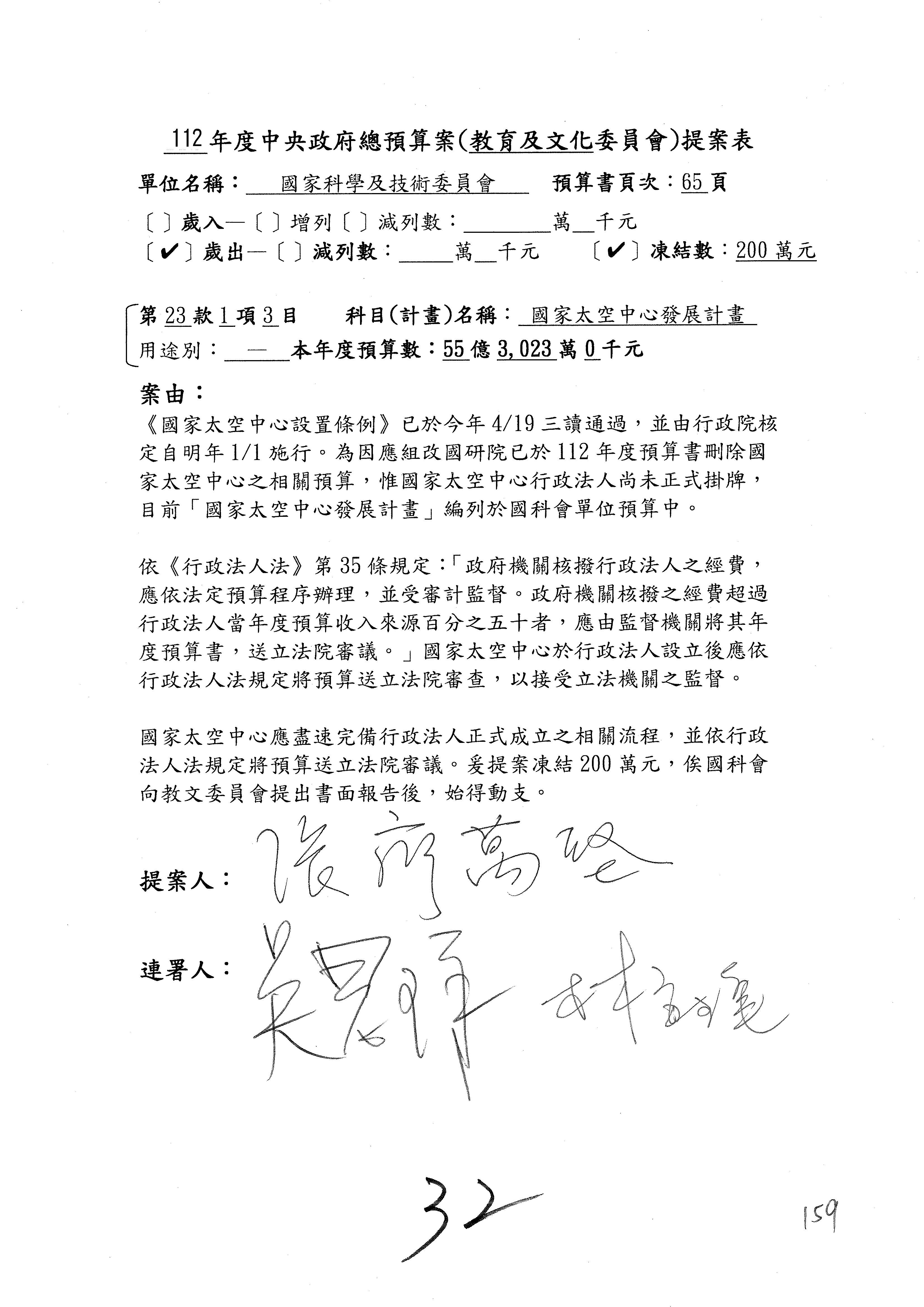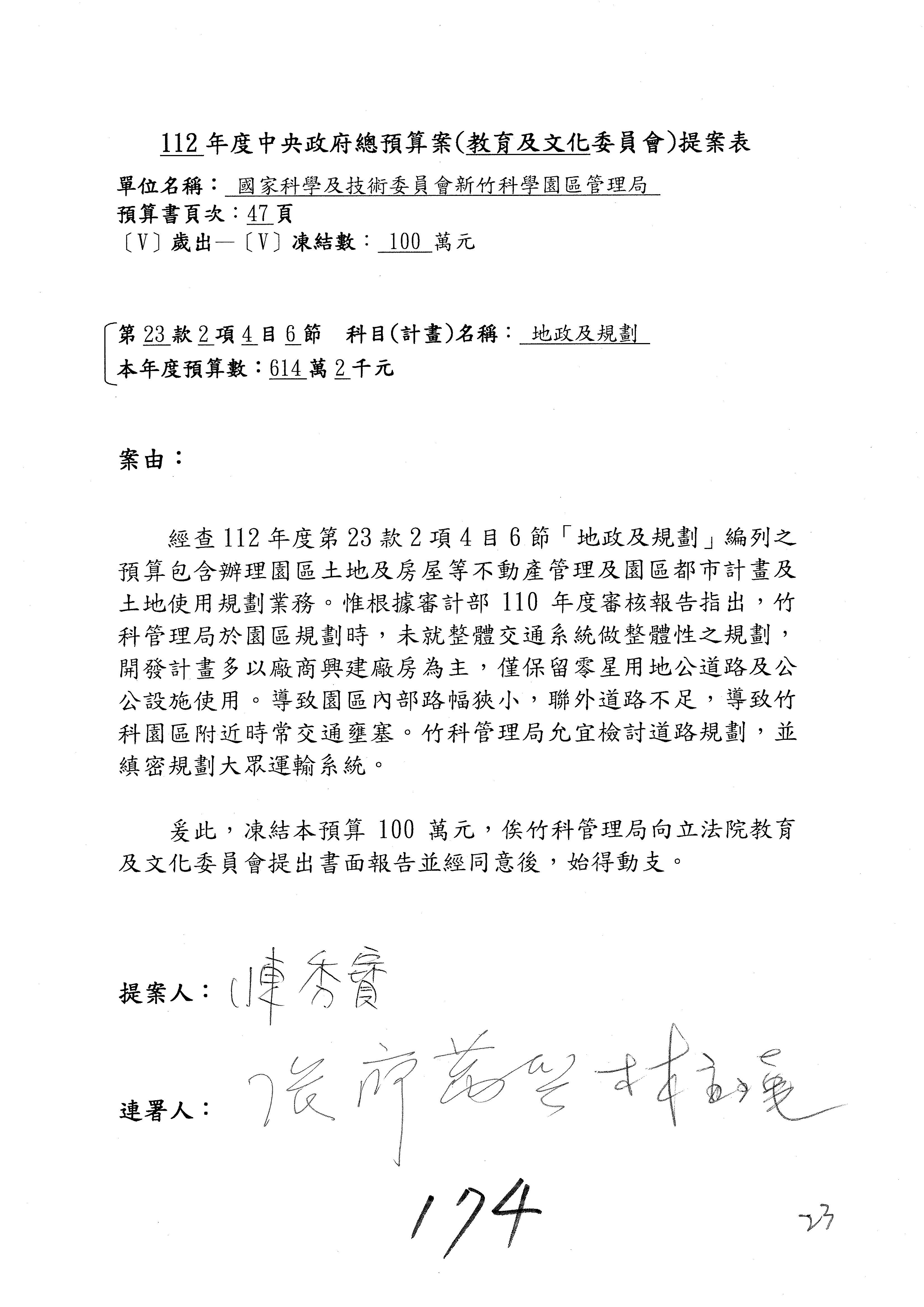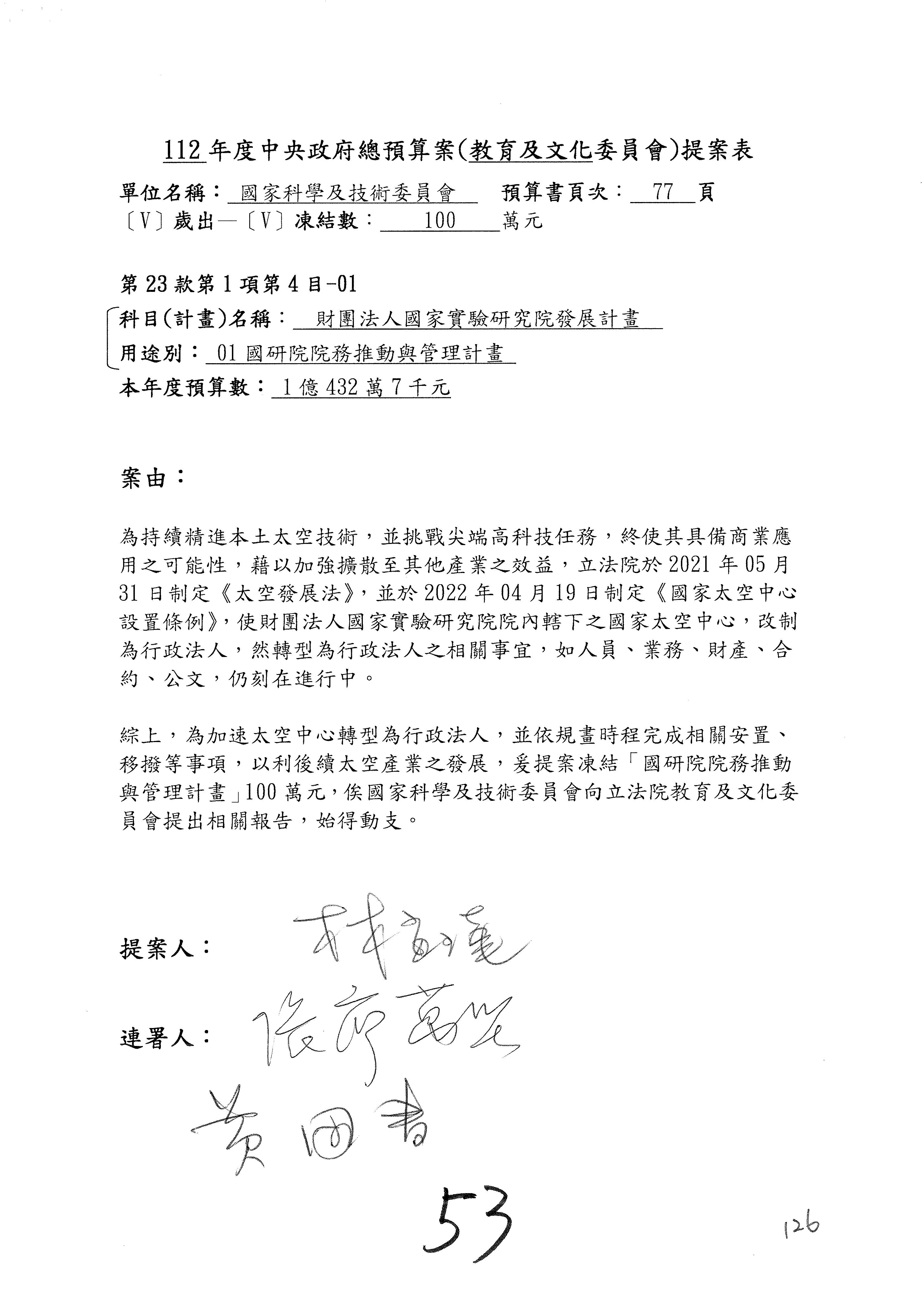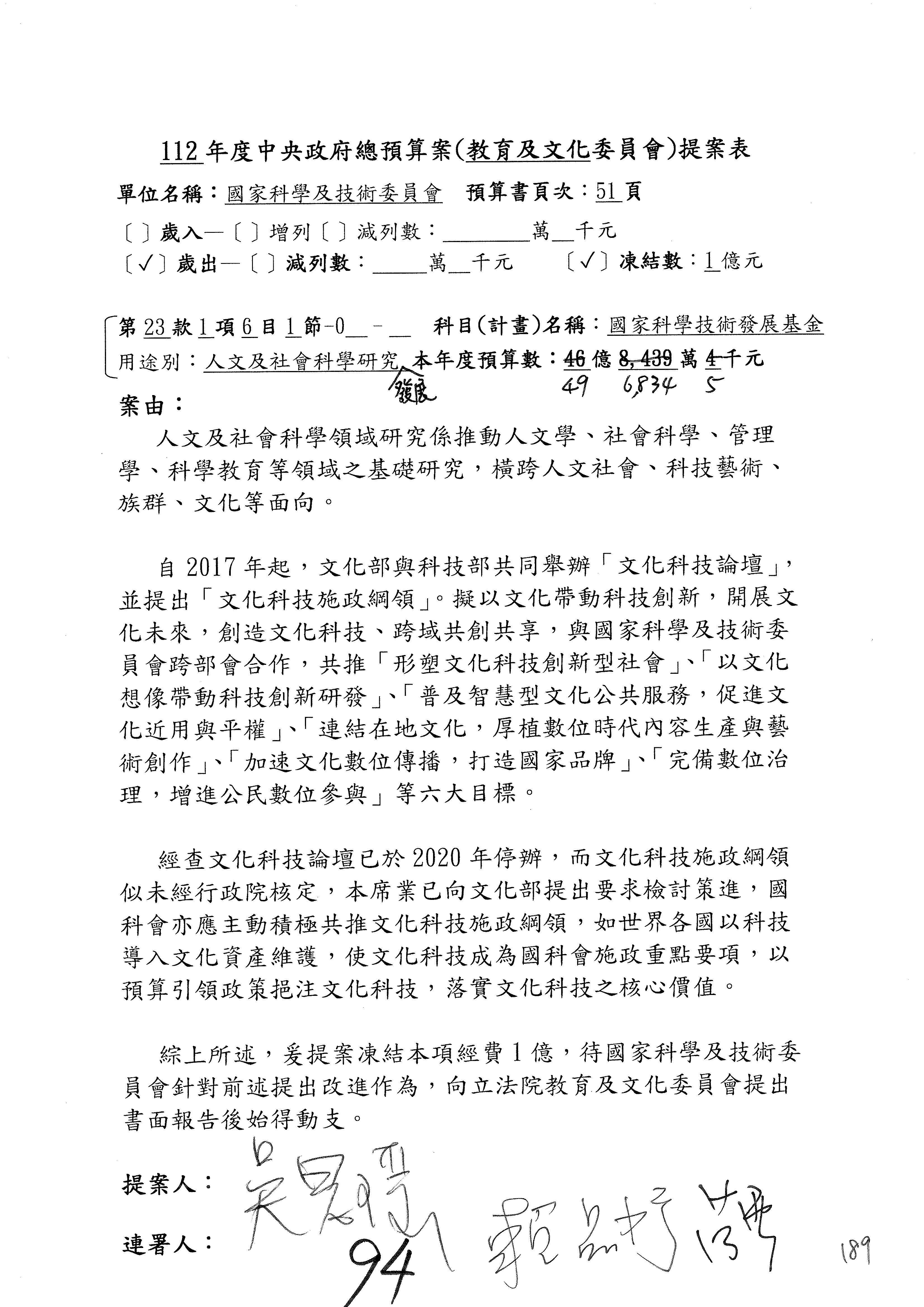陳委員秀寳:本席提的是第2案,關於推動整體科技發展計畫,國科會補助產學合作之研究計畫,其研究成果可能涉及專利、技術移轉或其他智慧財產權,原則上就是比較精簡的報告。本席的意思是說,我們可以針對專利內容及效期、補助規模或其他因素,制定一個比較嚴謹的、公開的交流機制,讓這些研發出來的成果能夠分享或是讓產業界大家可以互相去交流。本席的意思並不是要把所有、一切的研究報告公開,你們一定可以訂出一個比較嚴謹的公開交流機制,所以這個部分本席滿堅持的,希望、要求國科會審慎制定公開的辦法,讓不會侵害到商業機密跟專利權的科研成果可以更有利於分享跟交流。本席提凍的金額是1,000萬元,但這個部分大家可以再討論一下。以上,謝謝。