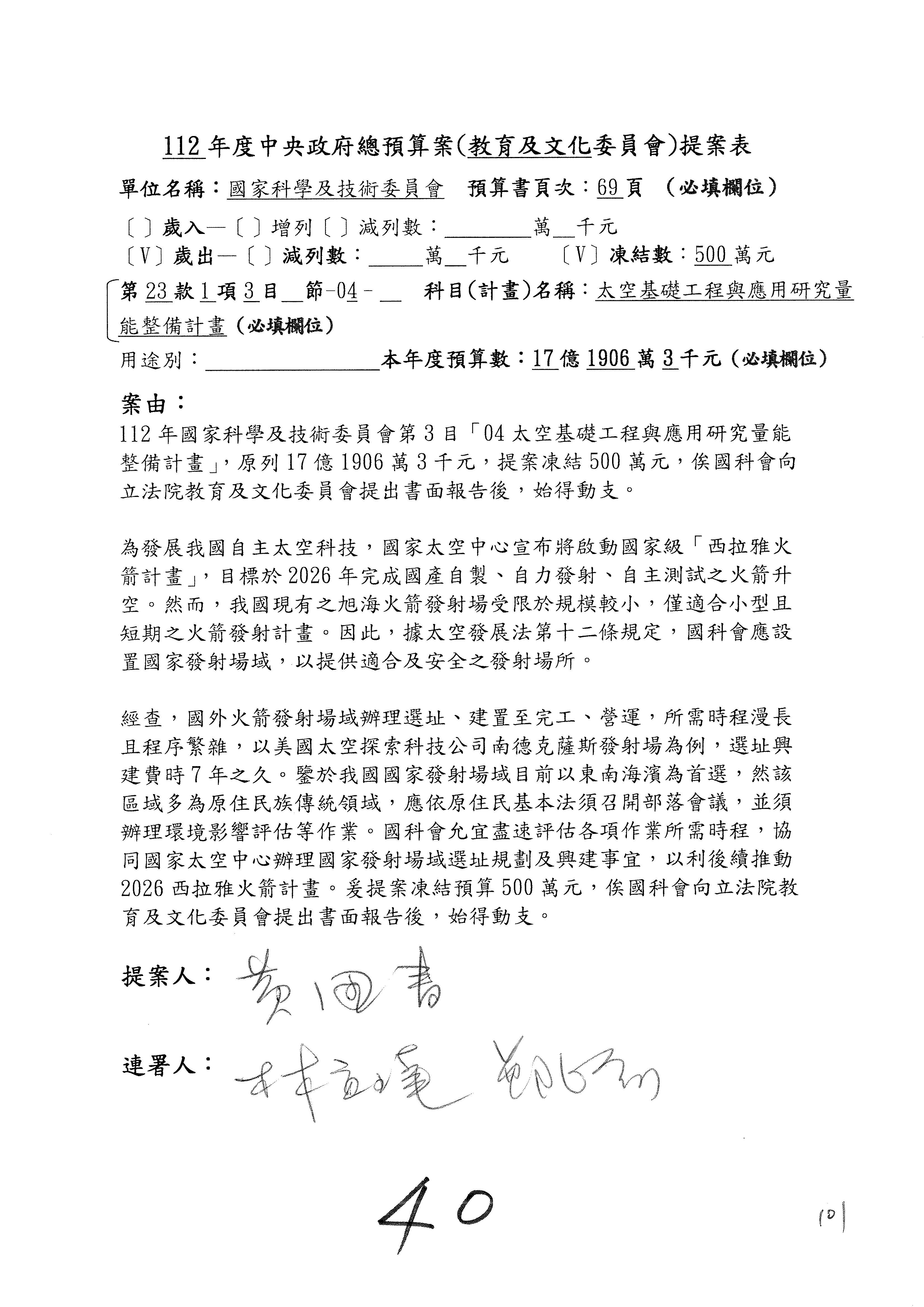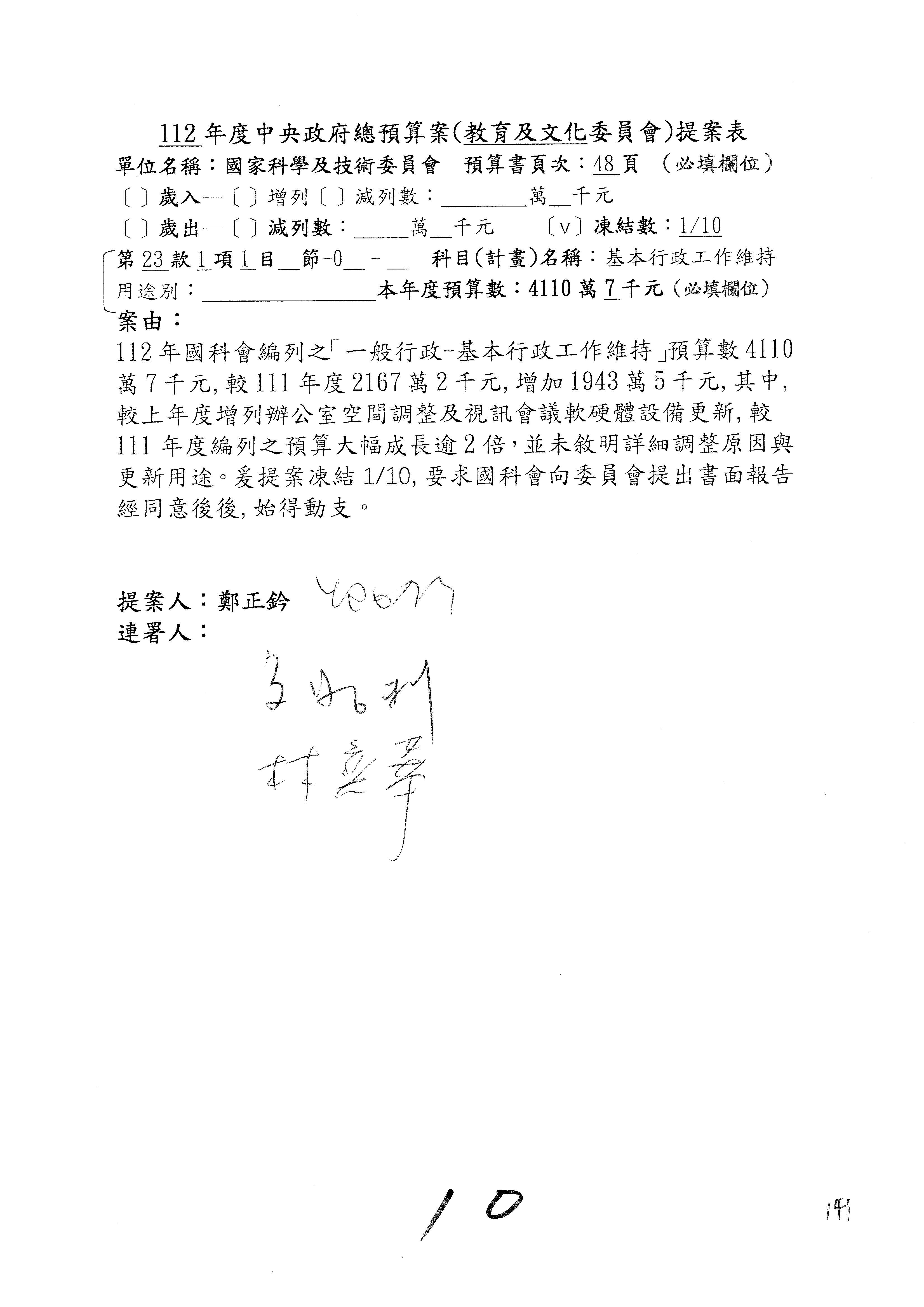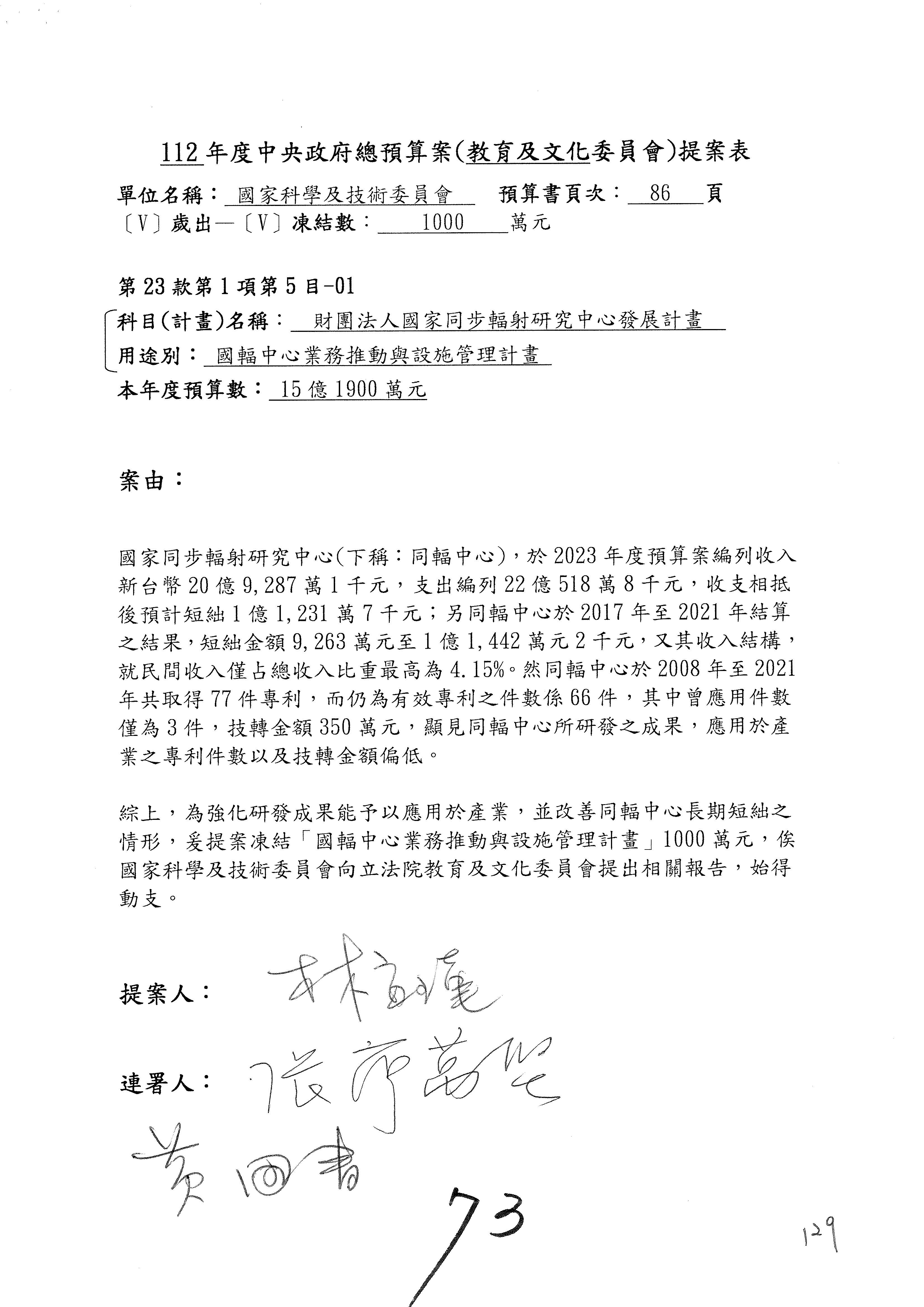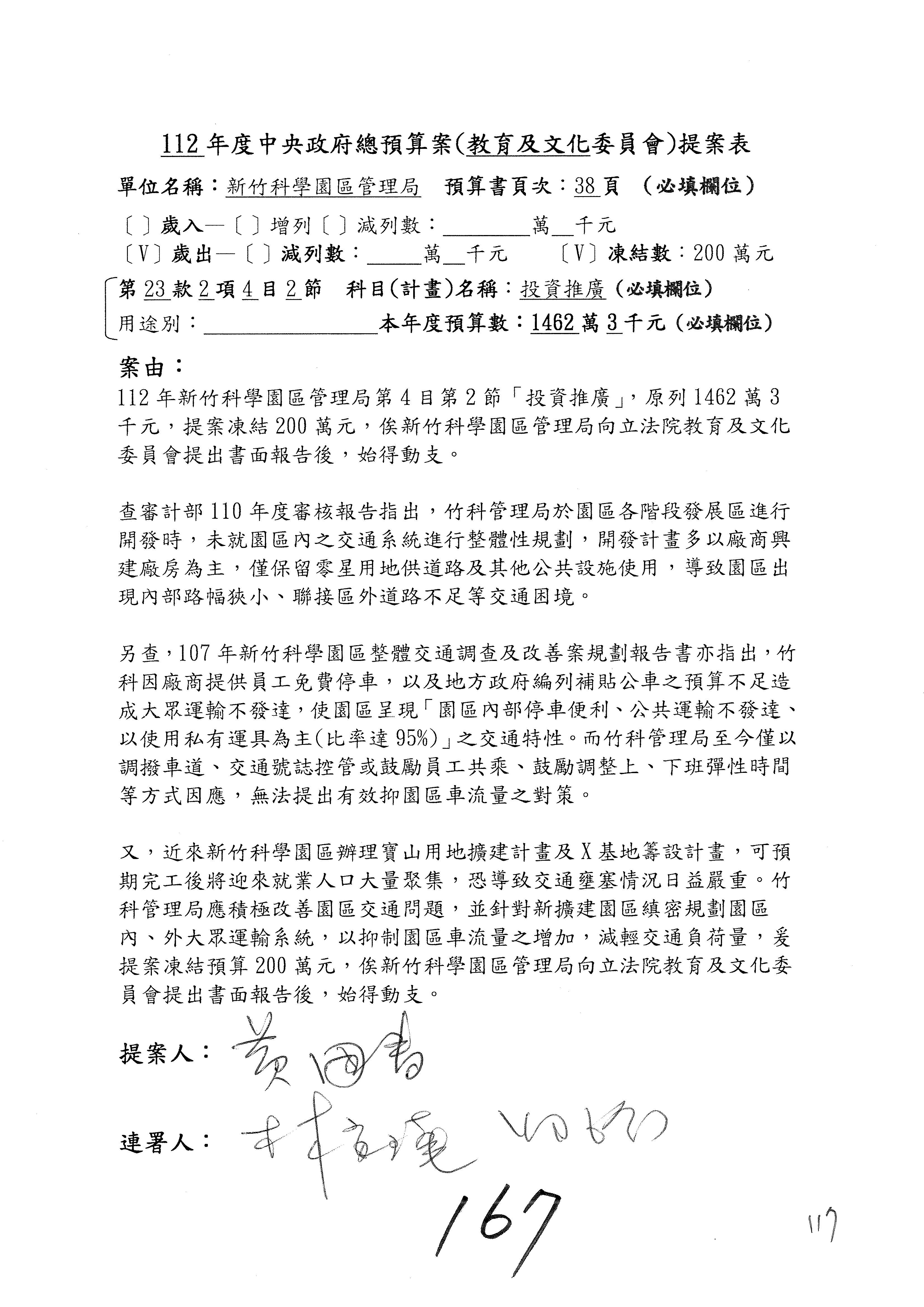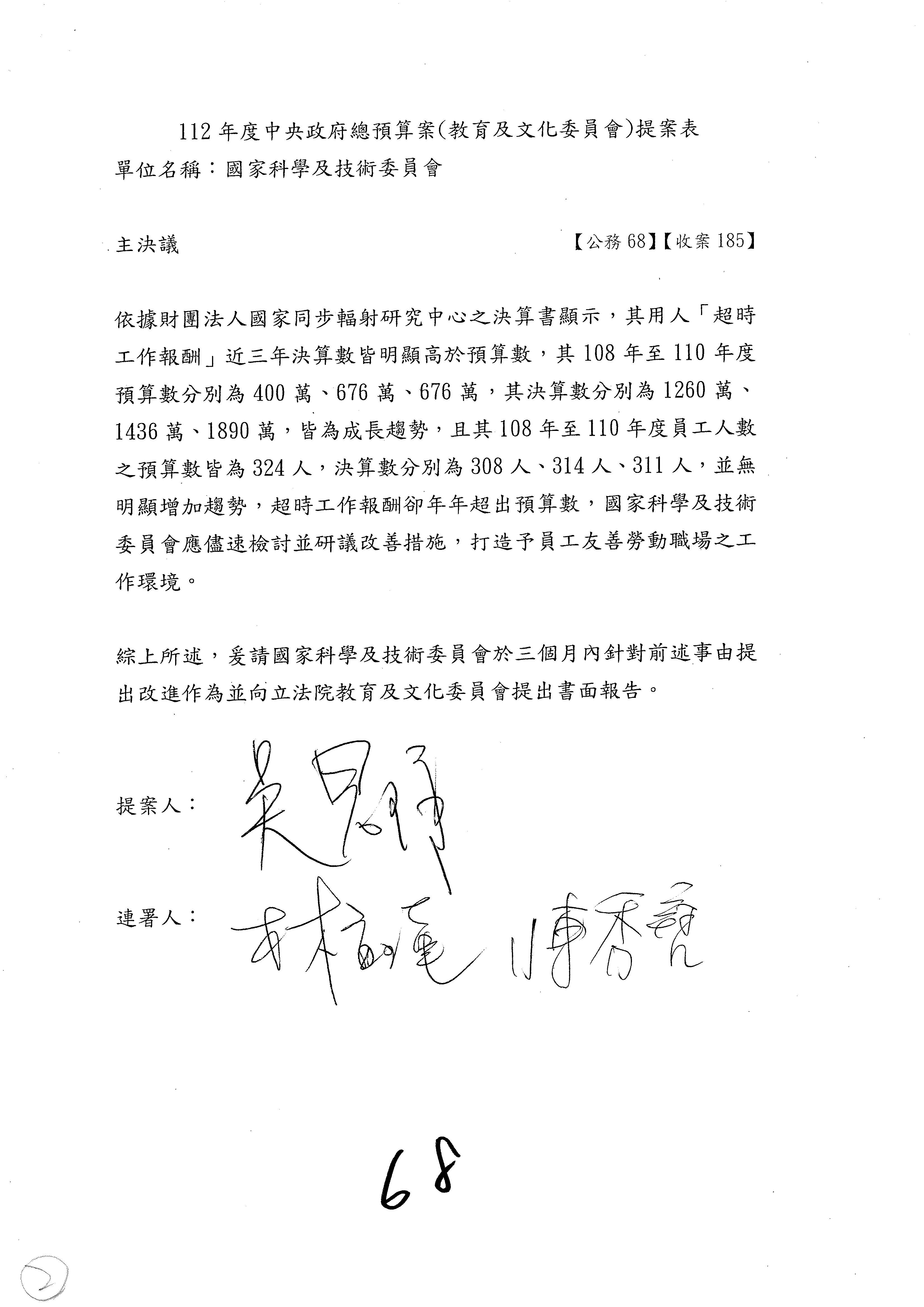 陳委員秀寳:本席提的是第2案,關於推動整體科技發展計畫,國科會補助產學合作之研究計畫,其研究成果可能涉及專利、技術移轉或其他智慧財產權,原則上就是比較精簡的報告。本席的意思是說,我們可以針對專利內容及效期、補助規模或其他因素,制定一個比較嚴謹的、公開的交流機制,讓這些研發出來的成果能夠分享或是讓產業界大家可以互相去交流。本席的意思並不是要把所有、一切的研究報告公開,你們一定可以訂出一個比較嚴謹的公開交流機制,所以這個部分本席滿堅持的,希望、要求國科會審慎制定公開的辦法,讓不會侵害到商業機密跟專利權的科研成果可以更有利於分享跟交流。本席提凍的金額是1,000萬元,但這個部分大家可以再討論一下。以上,謝謝。