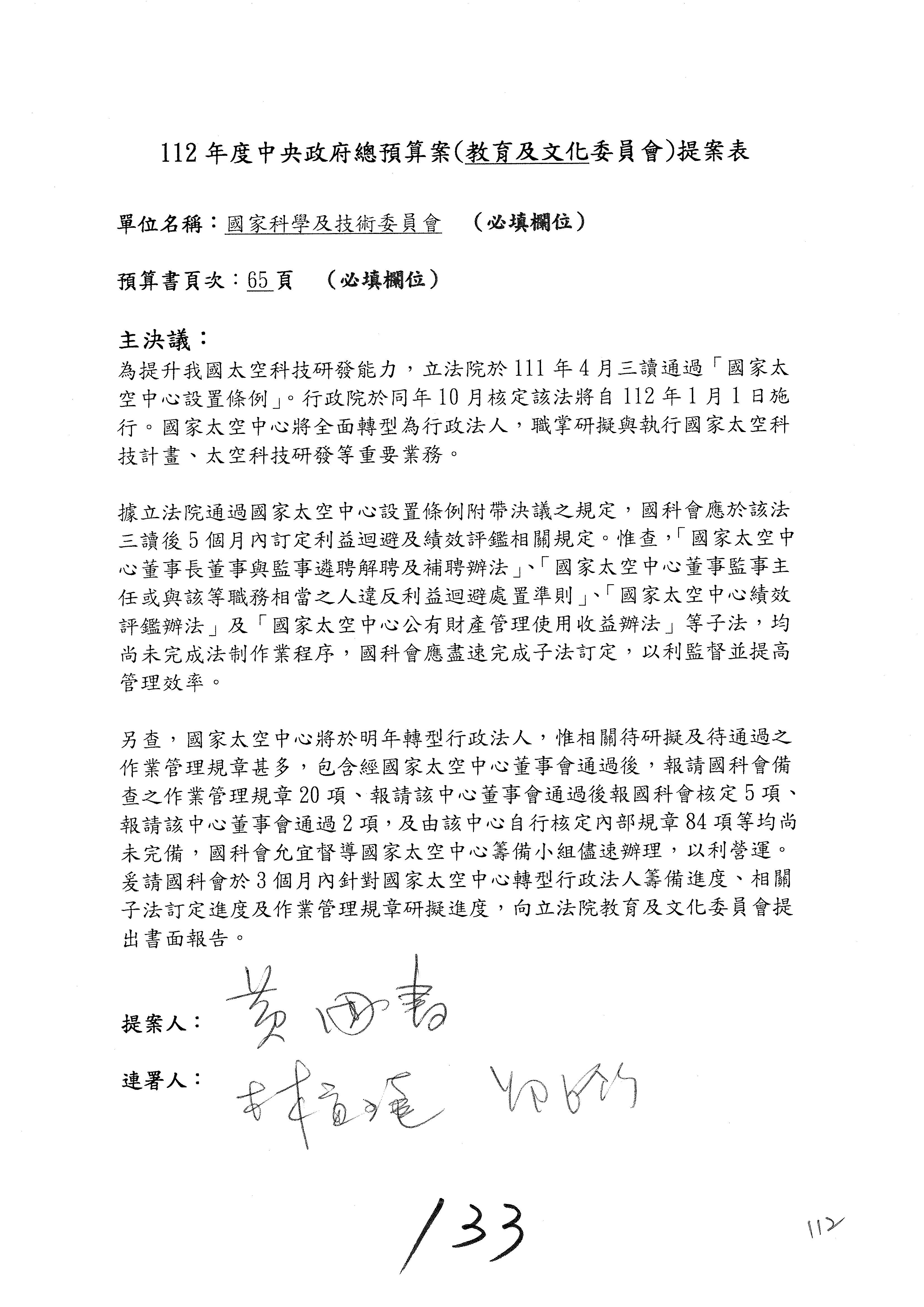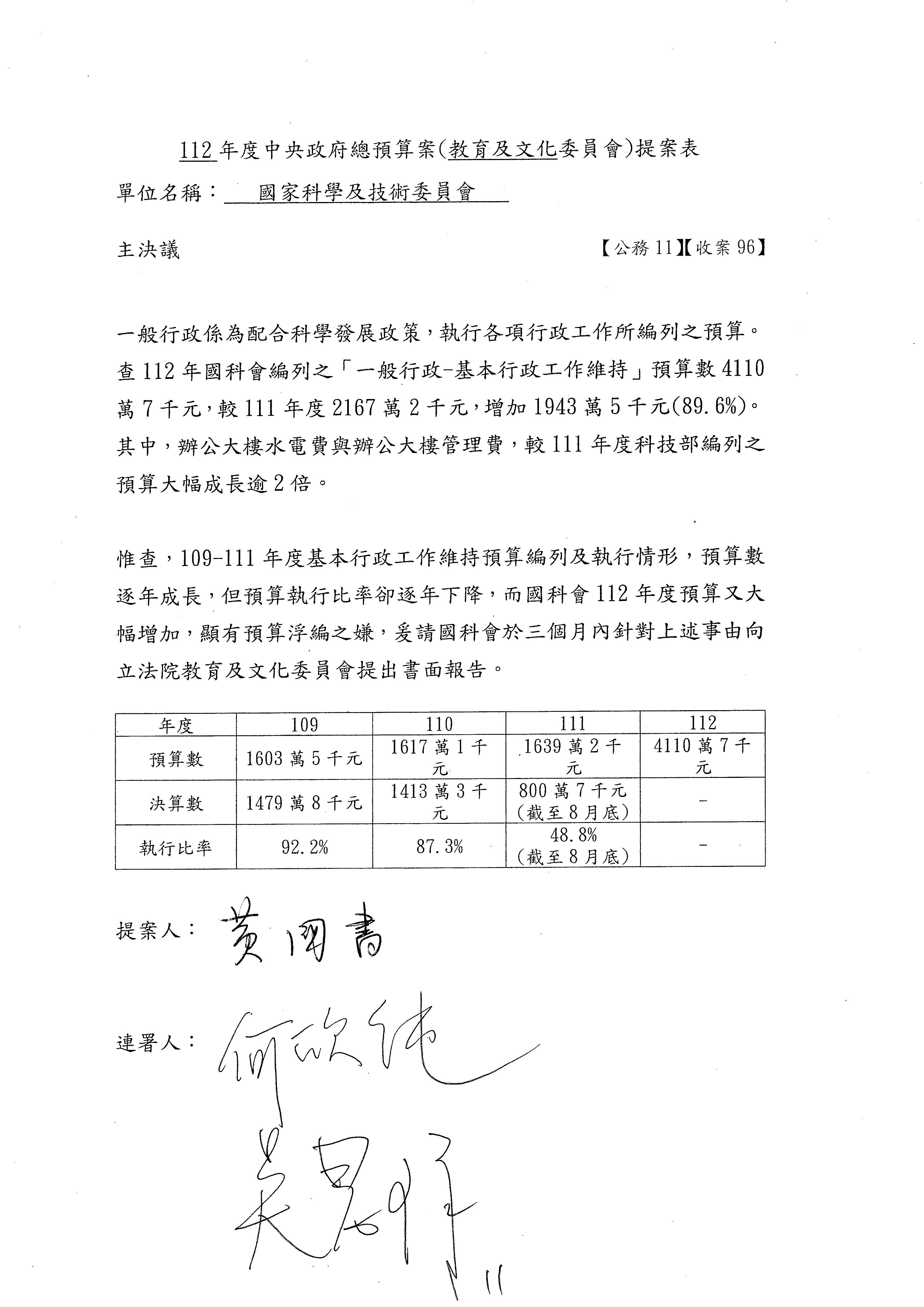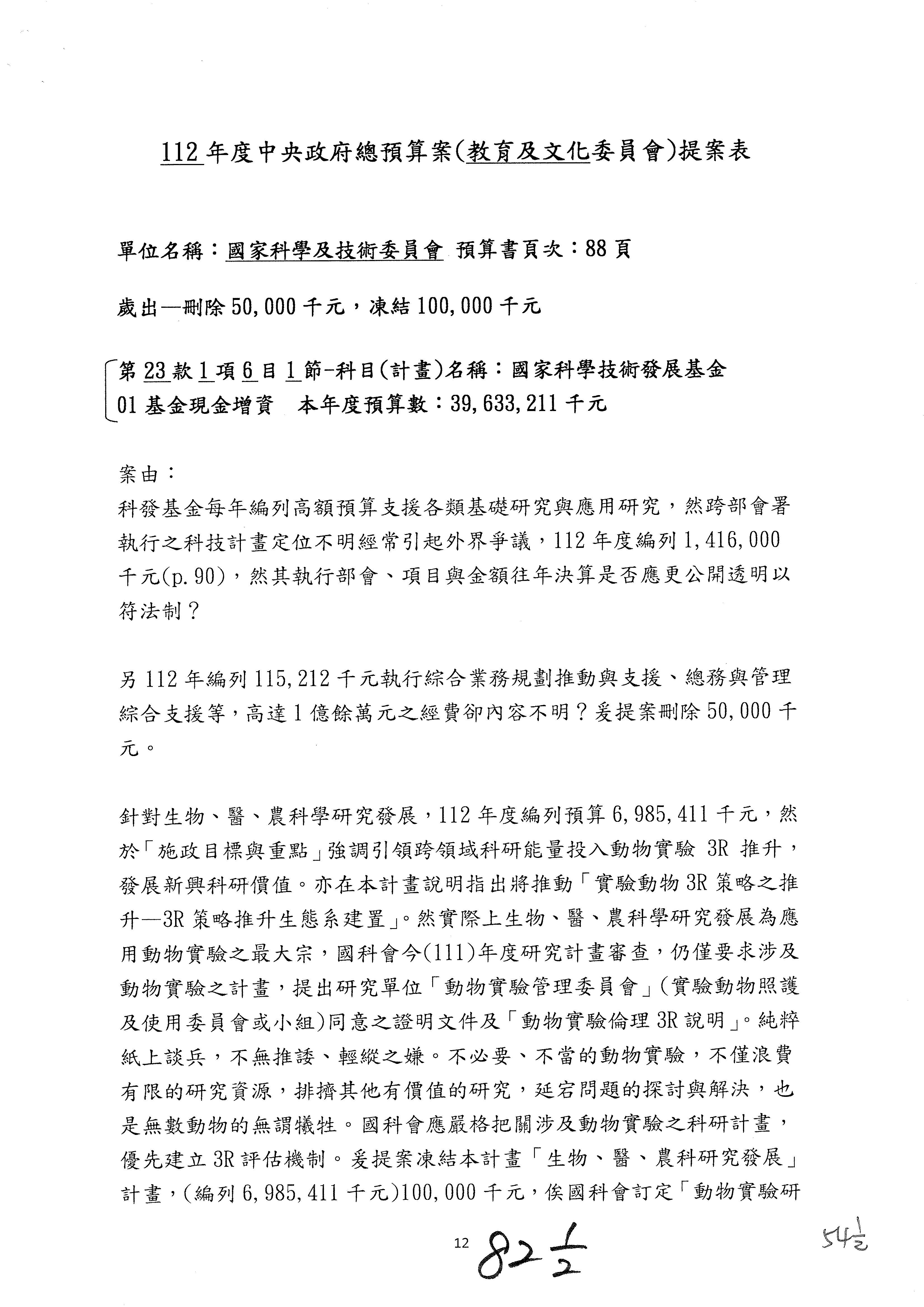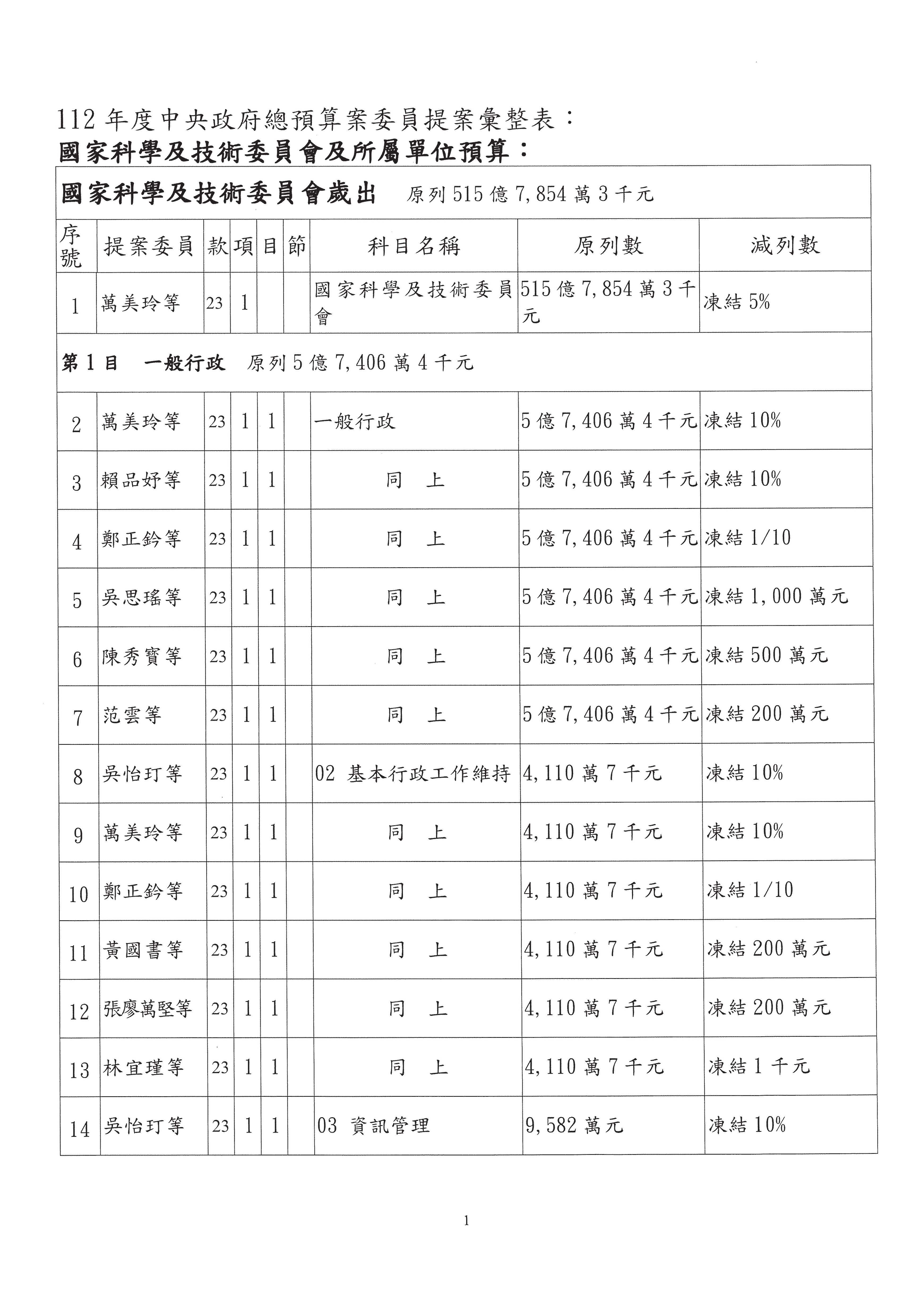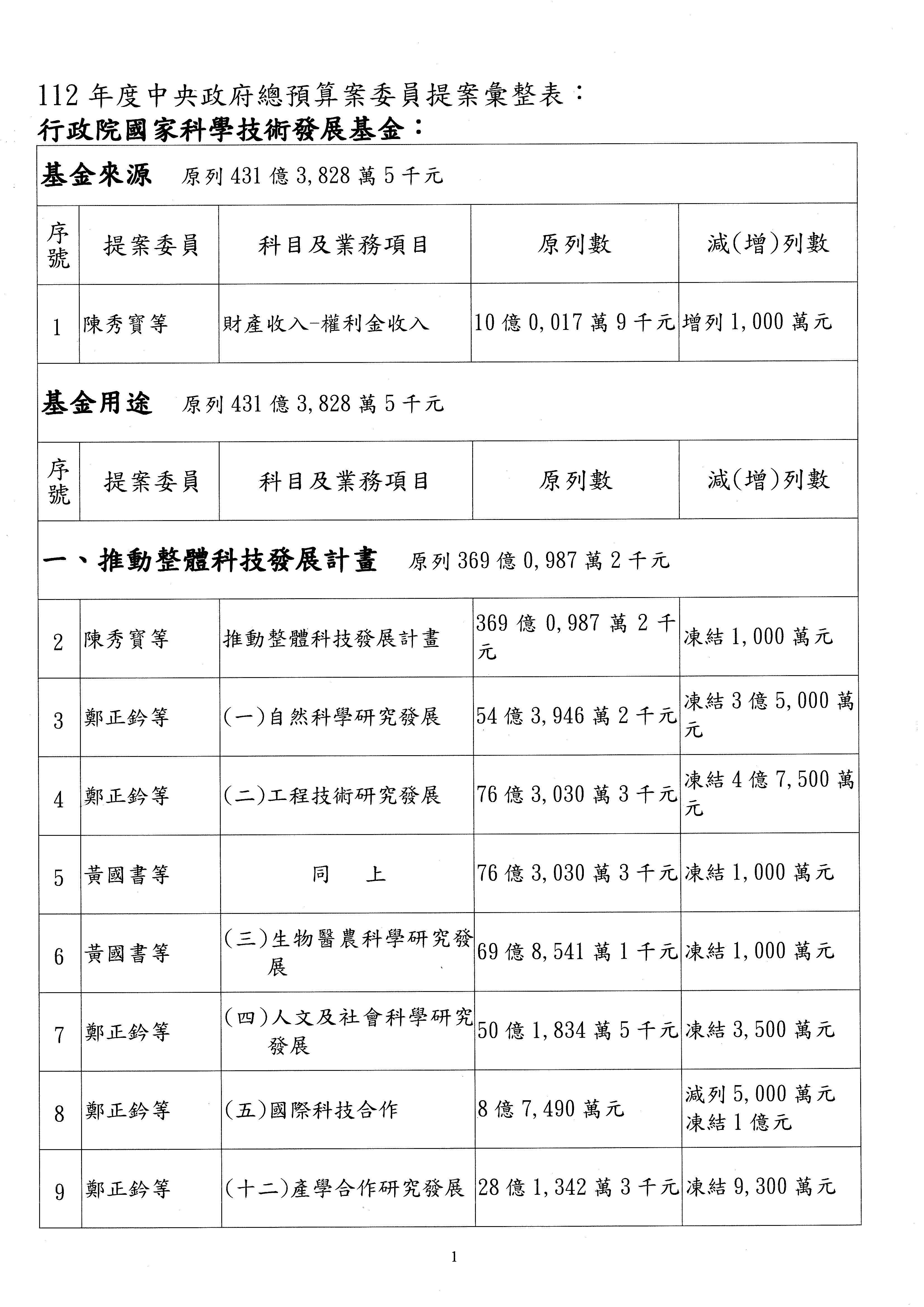 一、中華民國112年度中央政府總預算案審查國家科學及技術委員會收支部分