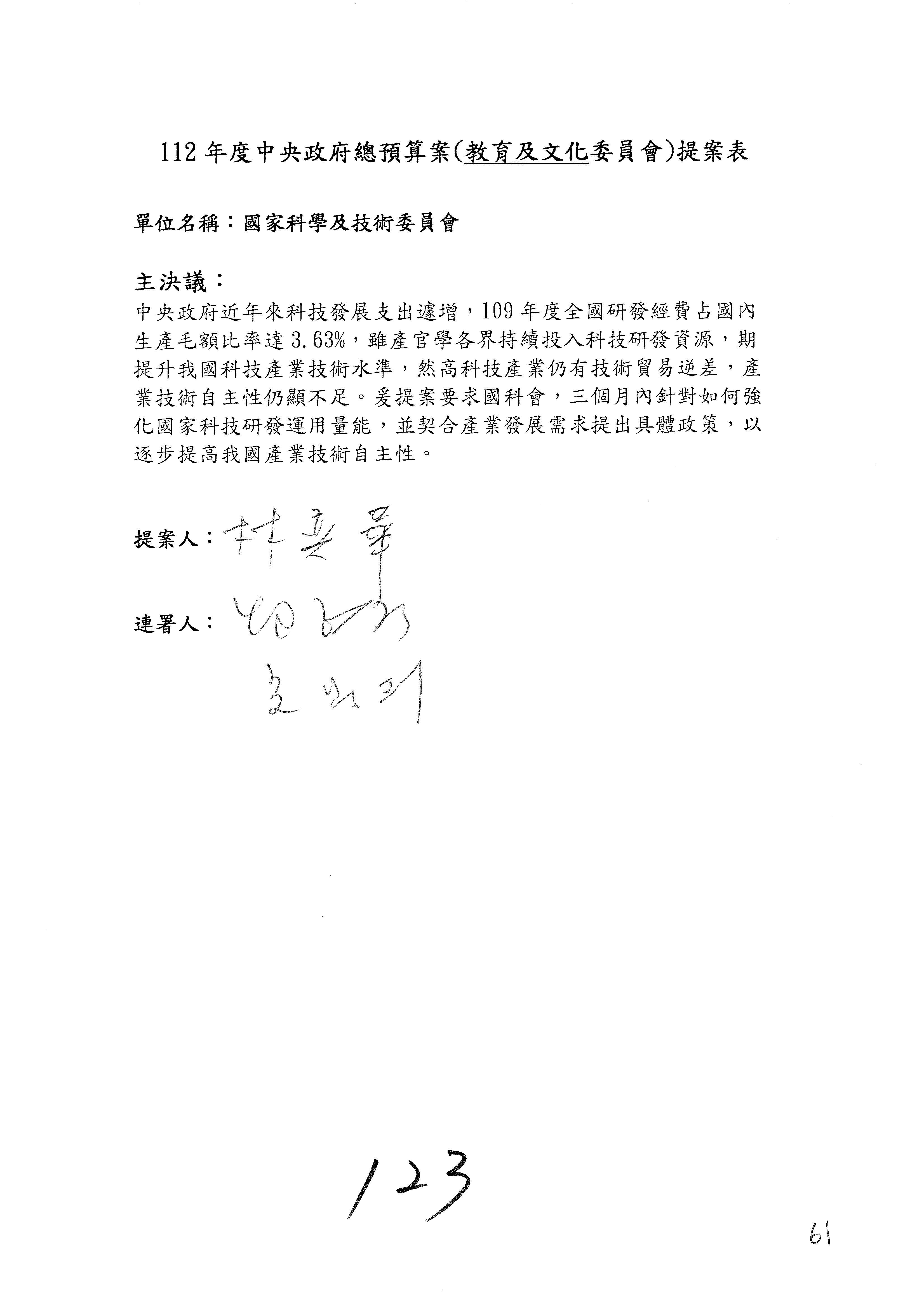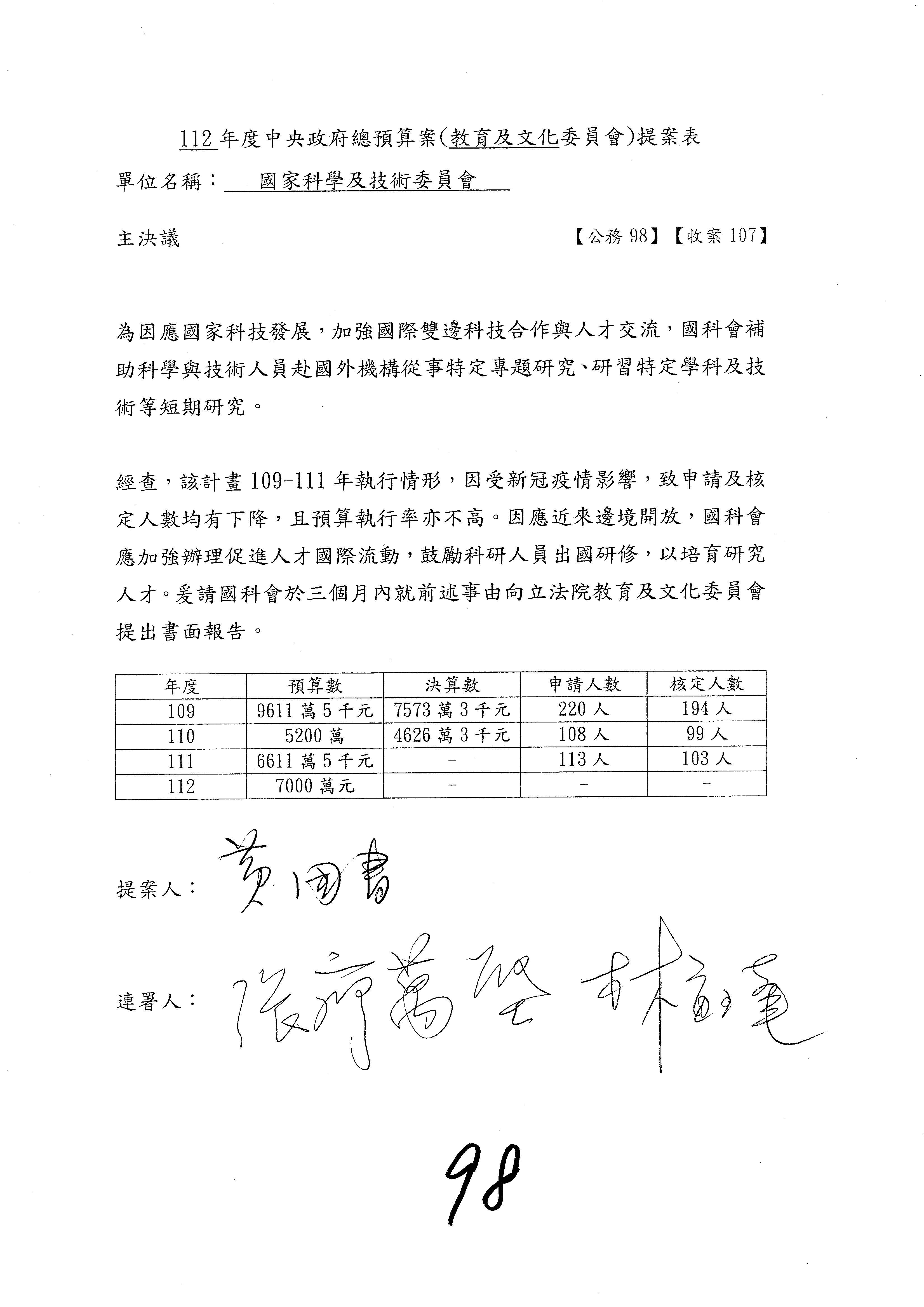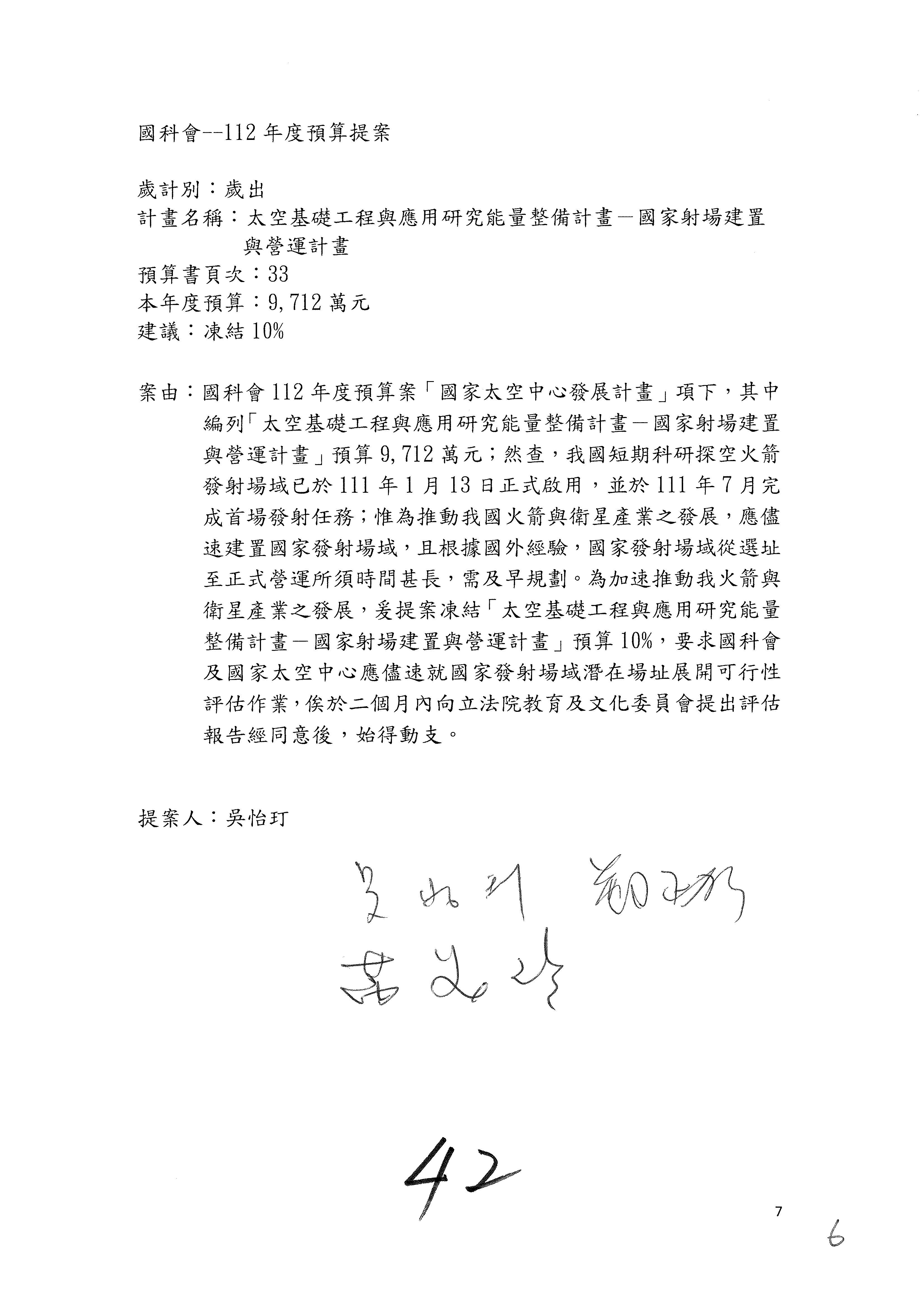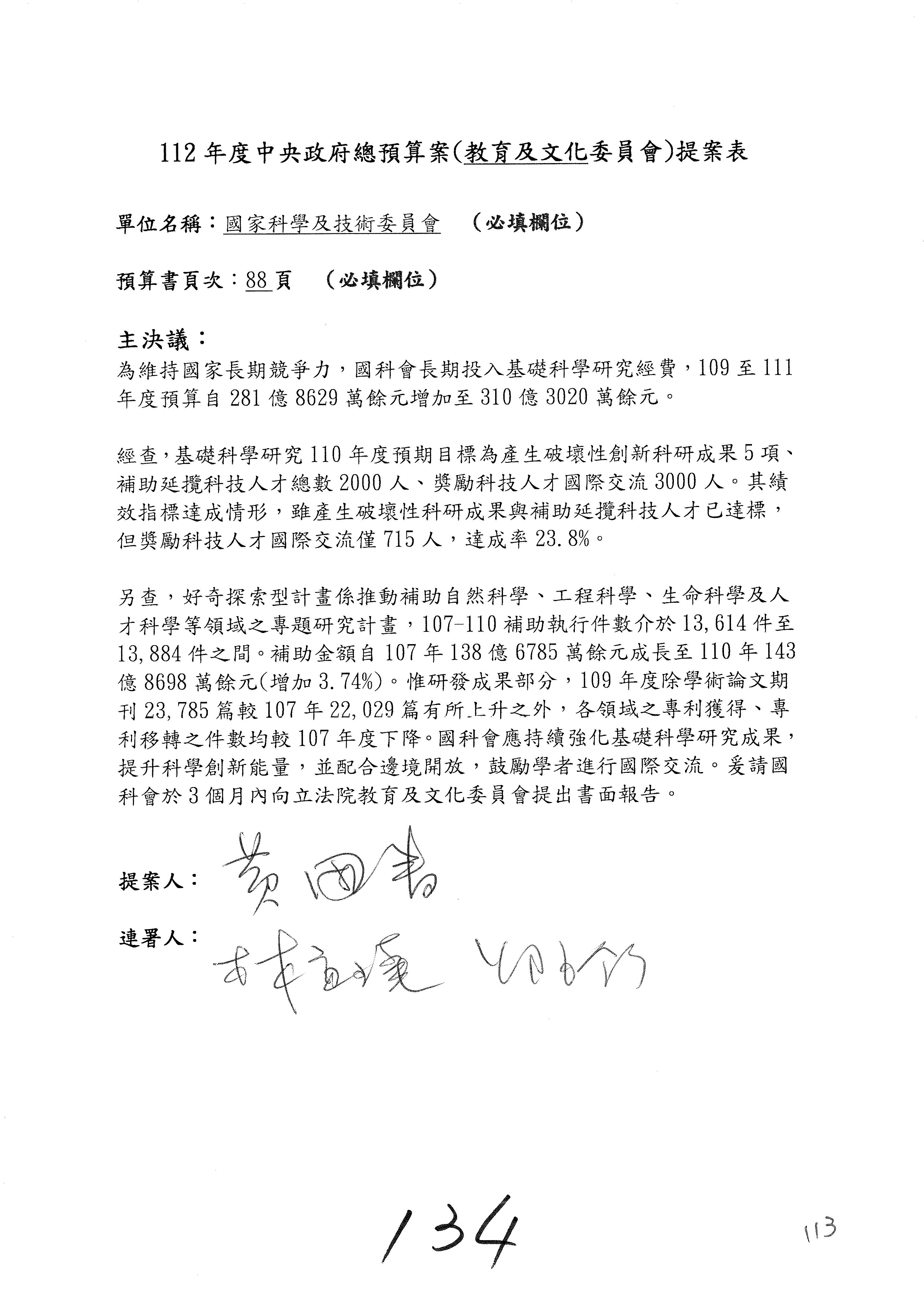 一、中華民國112年度中央政府總預算案審查國家科學及技術委員會收支部分