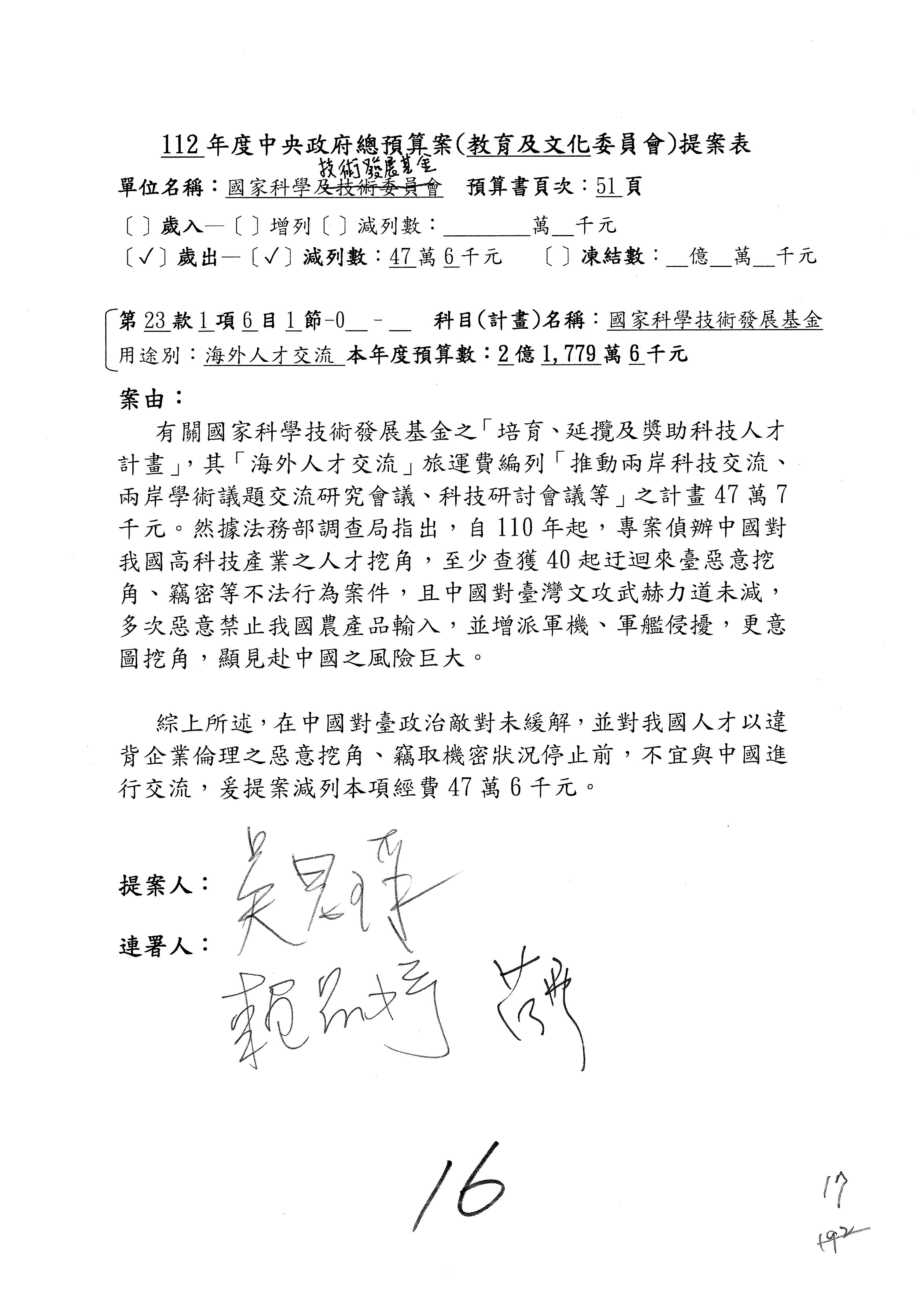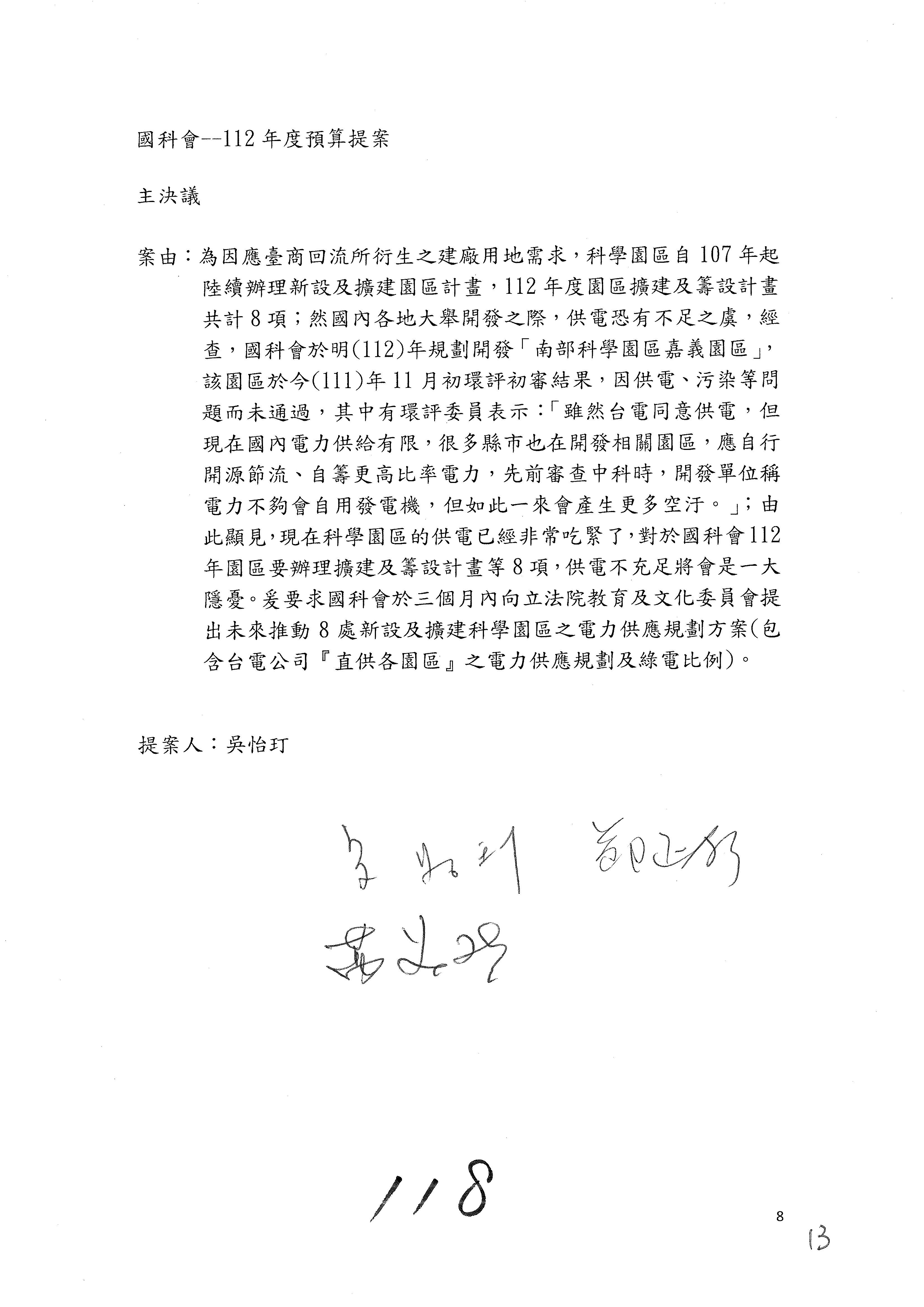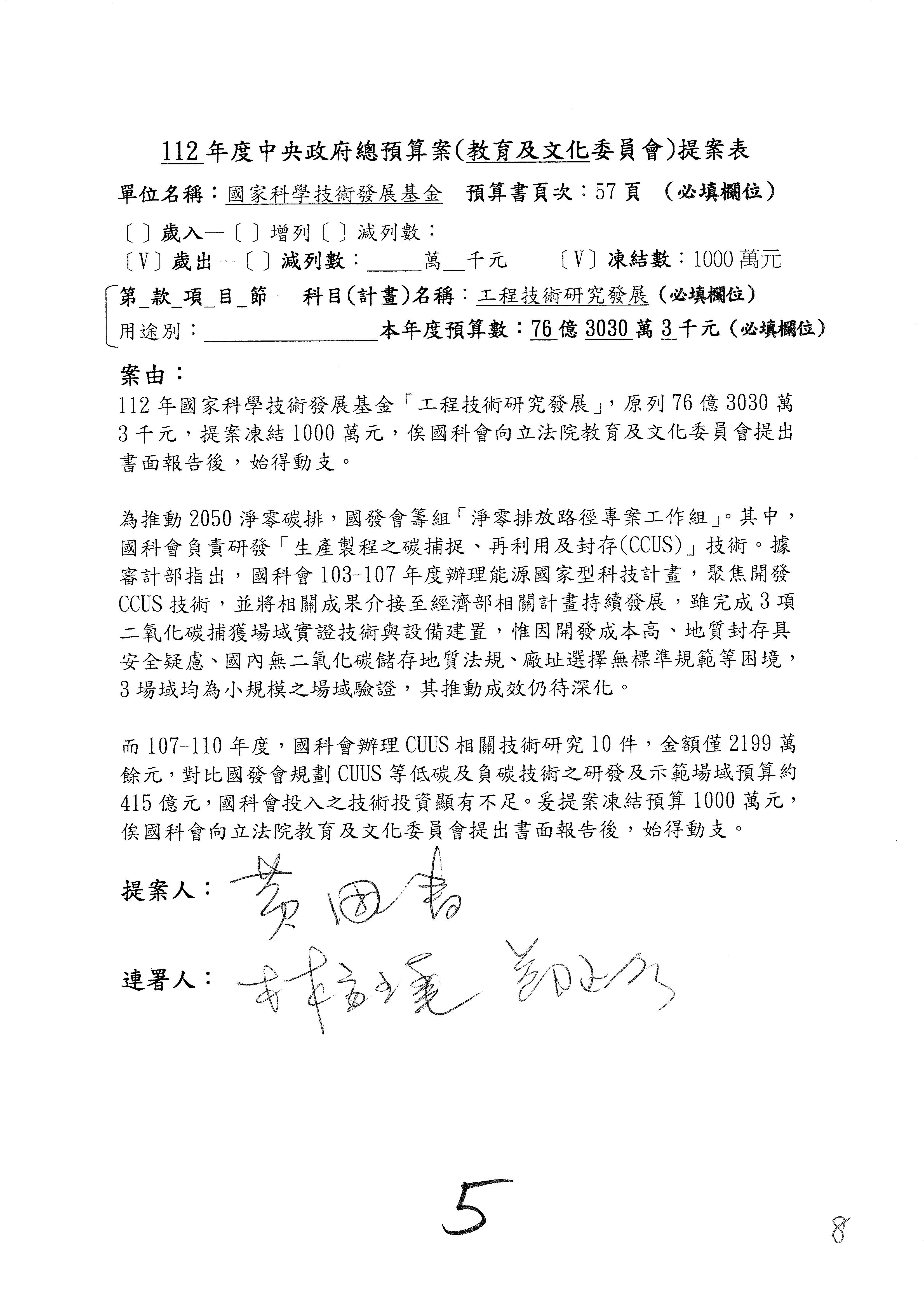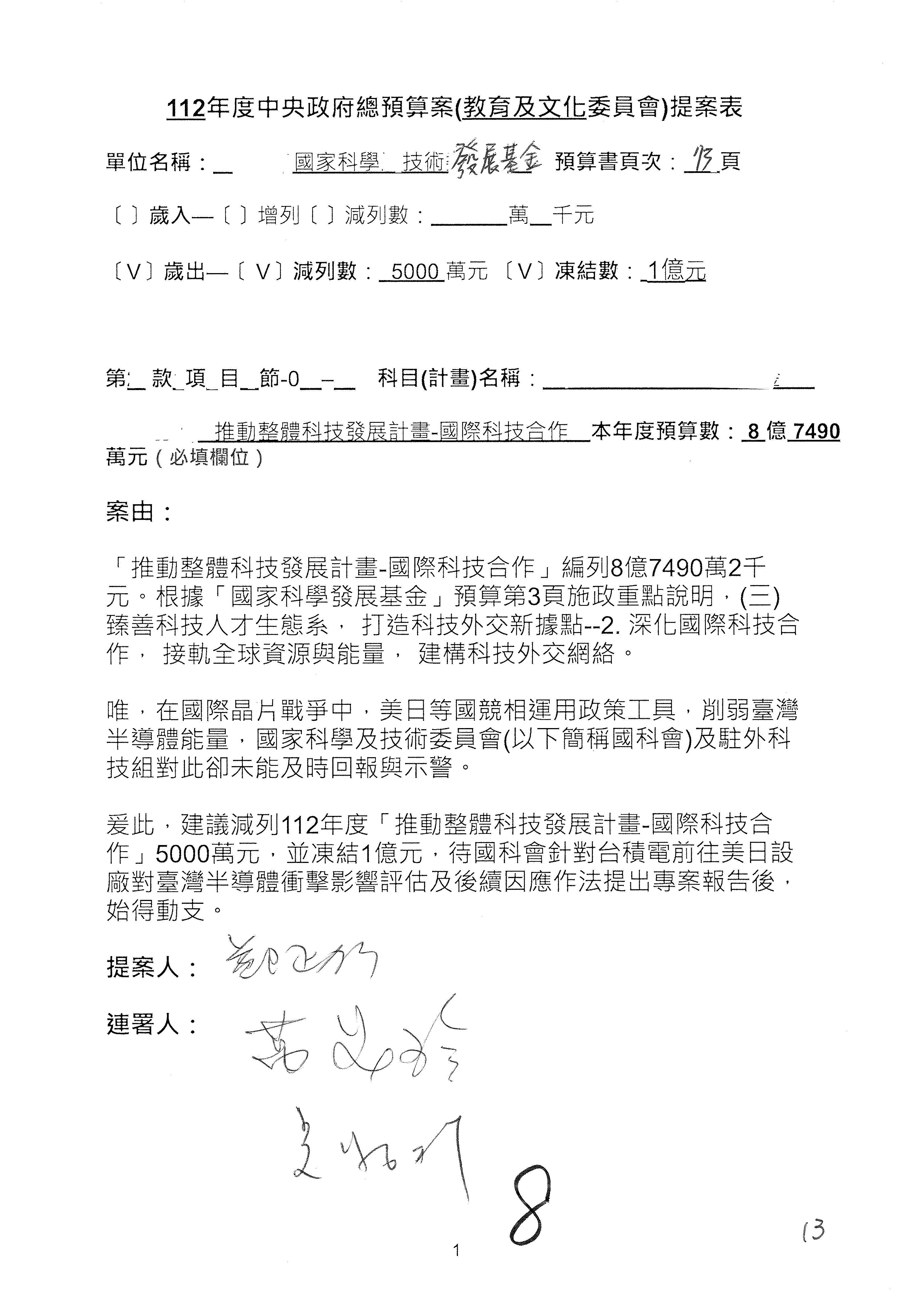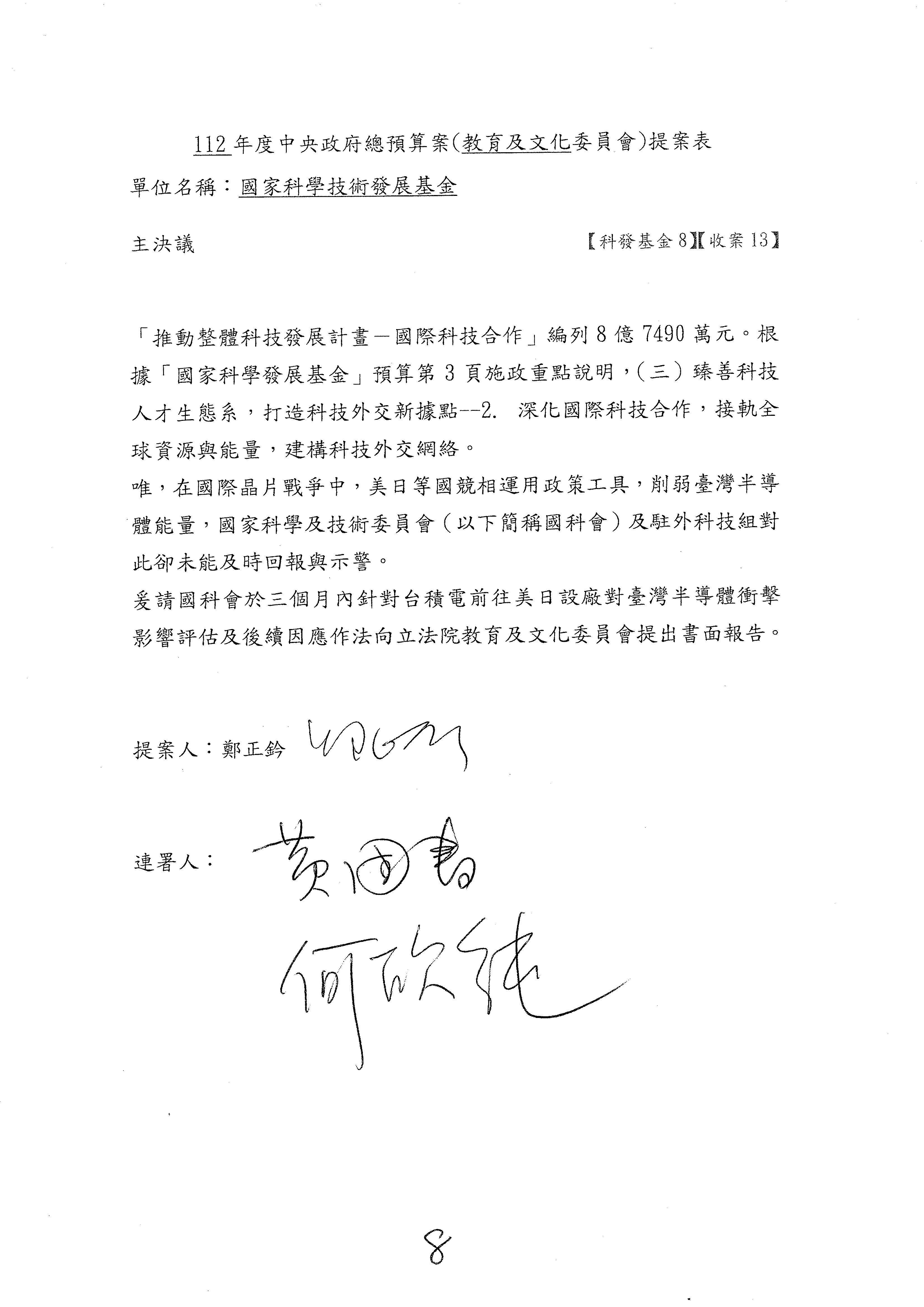 第8案是關於國際科技合作,這是跟晶片有關,臺灣晶片現在是國際上被討論的一個部分,原本這裡是編列8億7,490萬2,000元。在國際晶片戰爭當中,美日等國都運用不同的政策工具,希望削弱臺灣半導體的能量,所以希望國科會跟相關駐外科技組,對於這個部分能夠更敏銳,然後能有一些更有效的因應,所以針對112年度「推動整體科技發展計畫─國際科技合作」,希望能夠減列5,000萬元並凍結1億元,希望國科會就台積電前往美日設廠對臺灣半導體的影響做一個具體的說明跟評估,然後再予以動用。以上。謝謝。