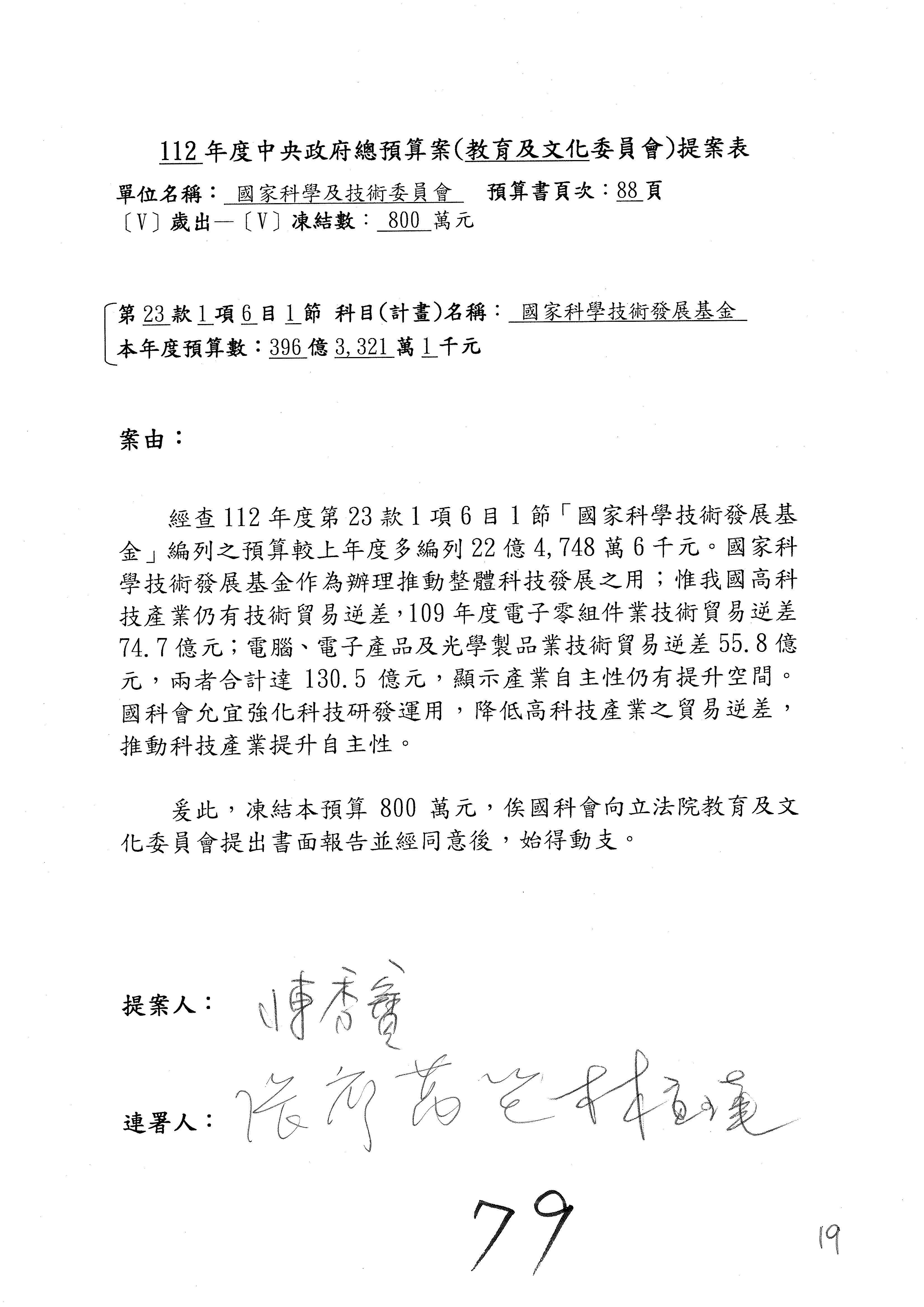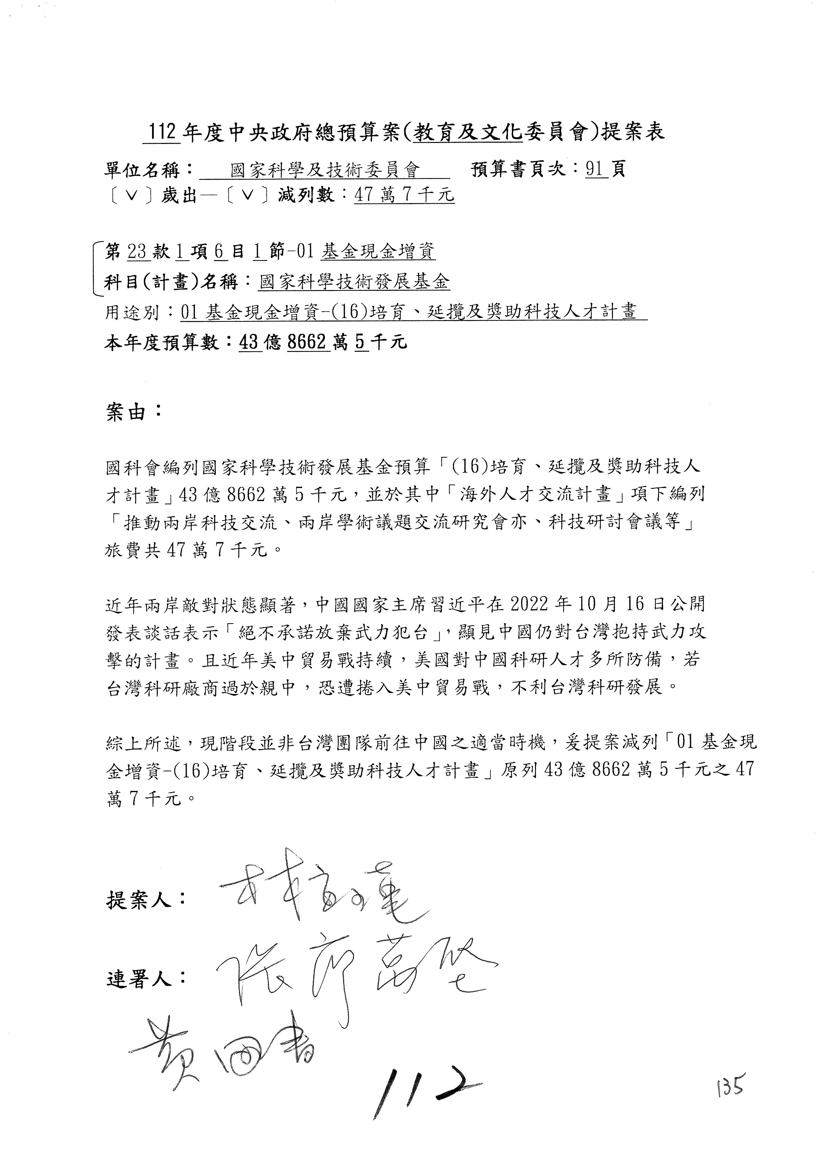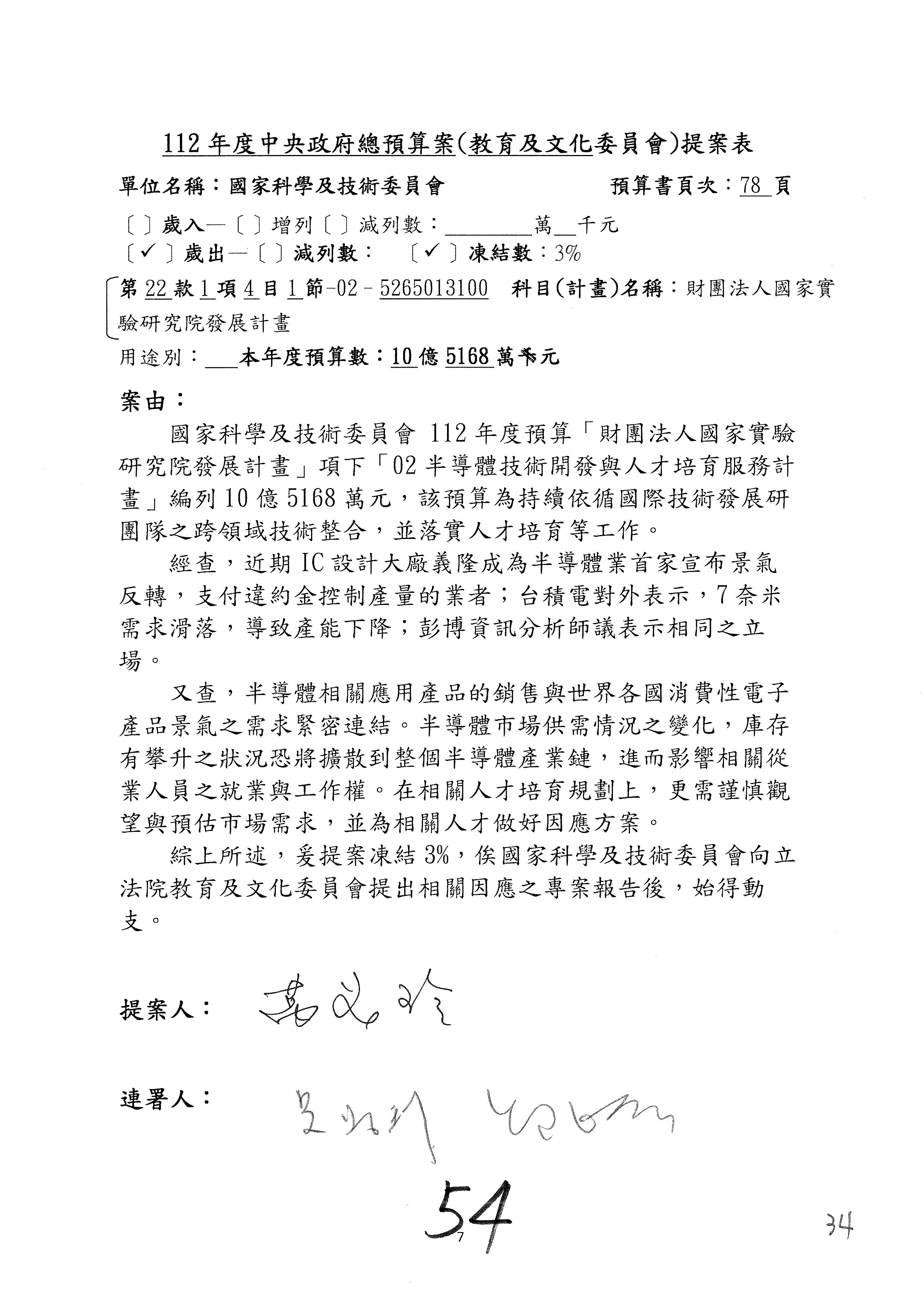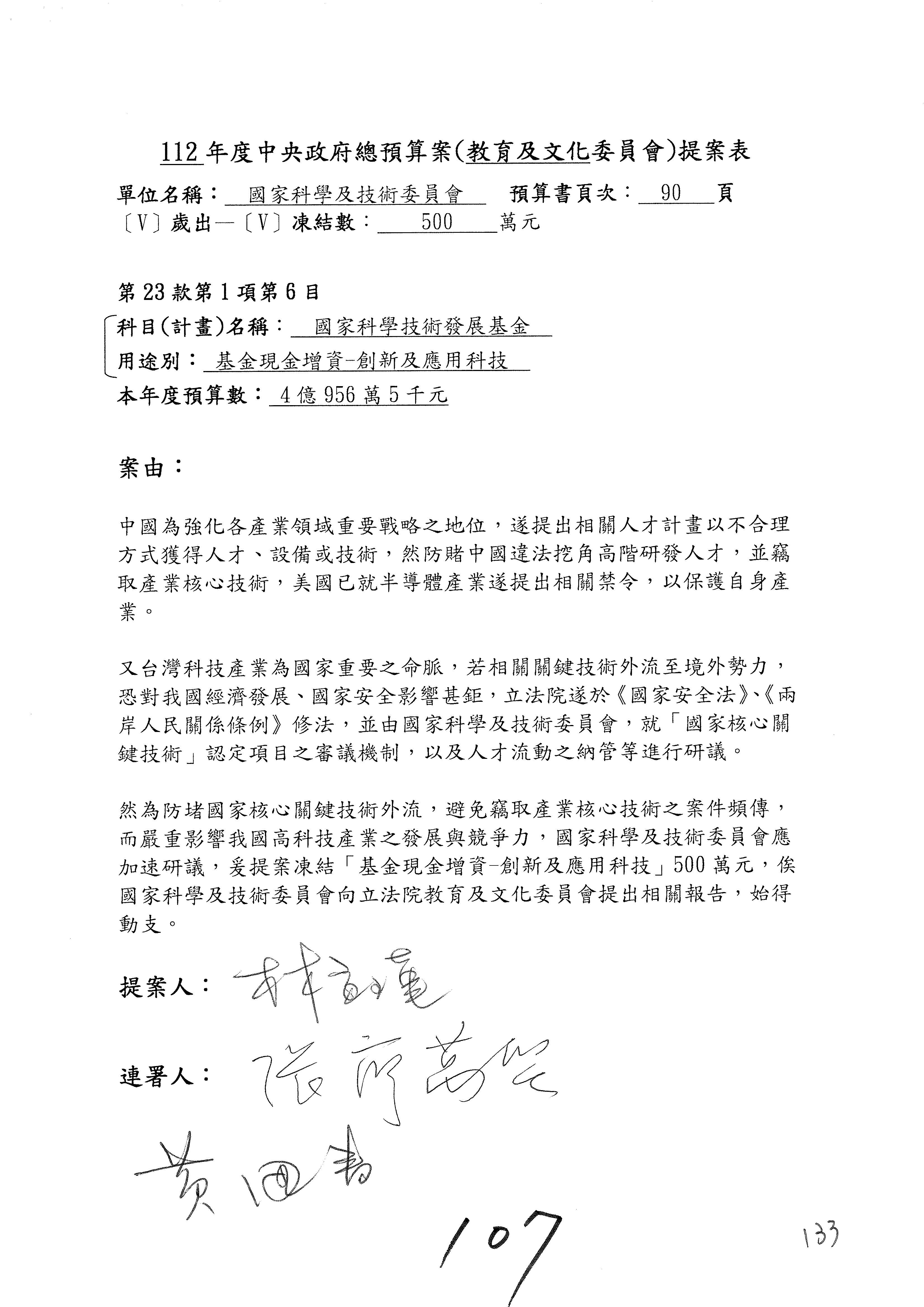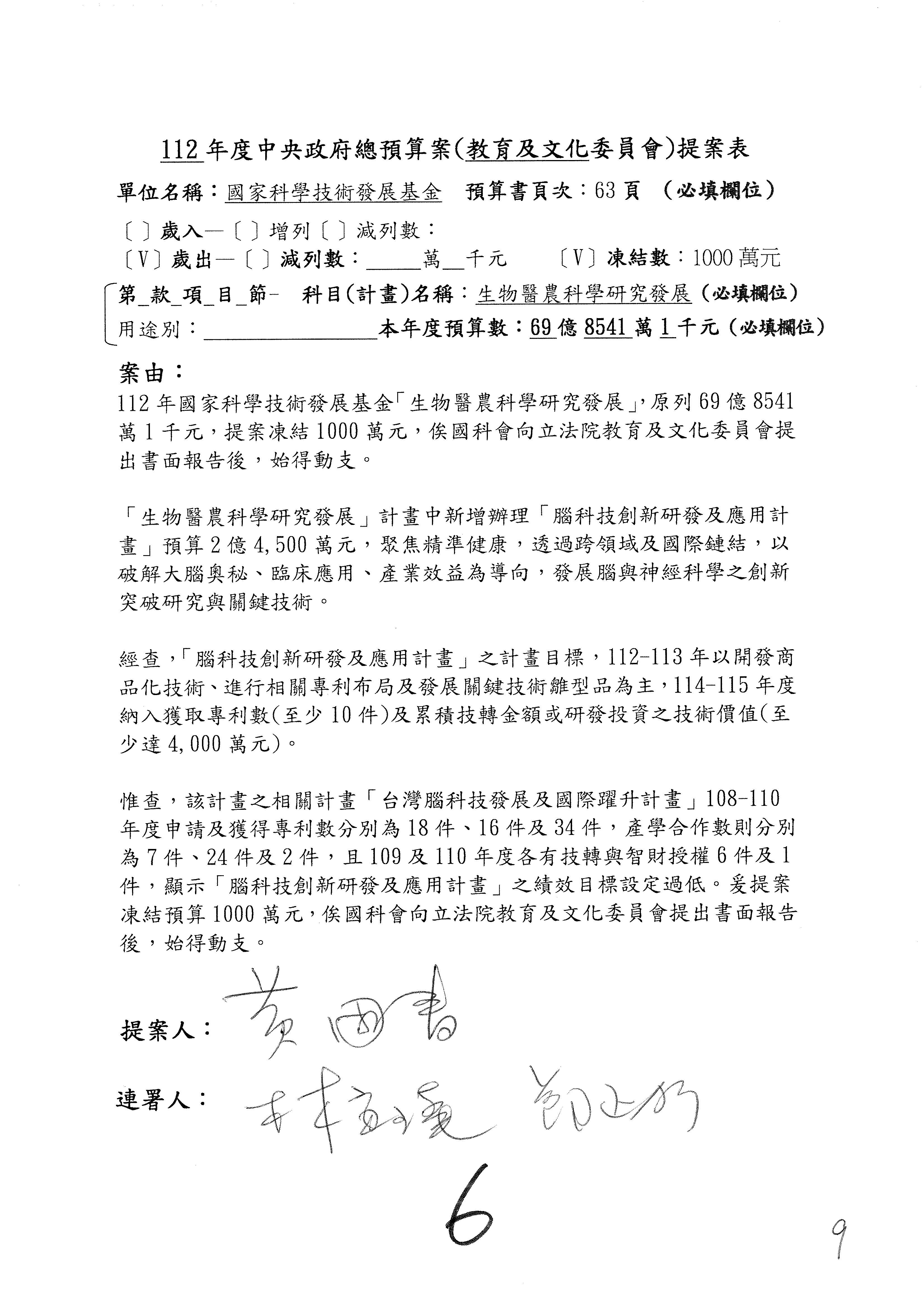 第8案是關於國際科技合作,這是跟晶片有關,臺灣晶片現在是國際上被討論的一個部分,原本這裡是編列8億7,490萬2,000元。在國際晶片戰爭當中,美日等國都運用不同的政策工具,希望削弱臺灣半導體的能量,所以希望國科會跟相關駐外科技組,對於這個部分能夠更敏銳,然後能有一些更有效的因應,所以針對112年度「推動整體科技發展計畫─國際科技合作」,希望能夠減列5,000萬元並凍結1億元,希望國科會就台積電前往美日設廠對臺灣半導體的影響做一個具體的說明跟評估,然後再予以動用。以上。謝謝。