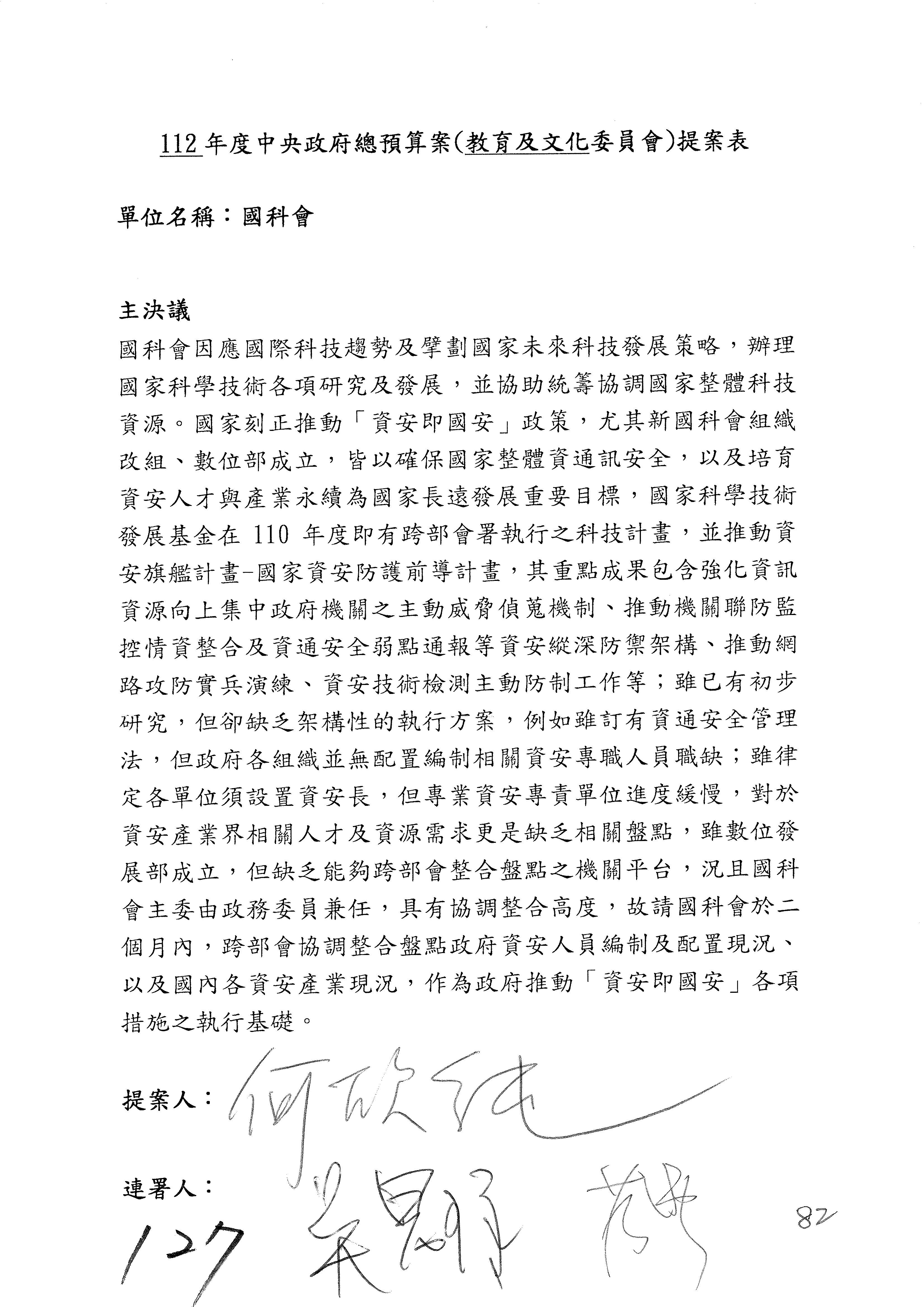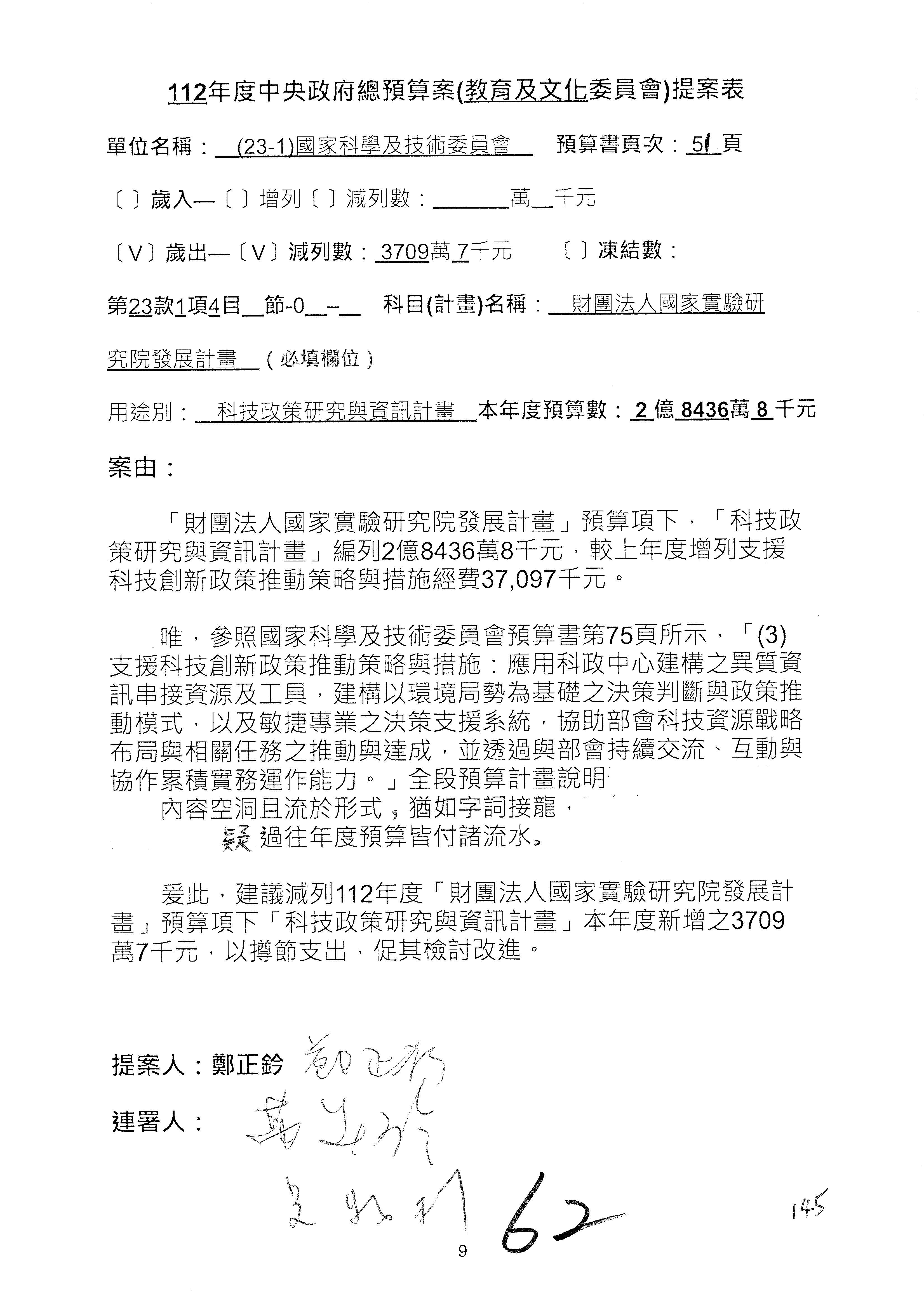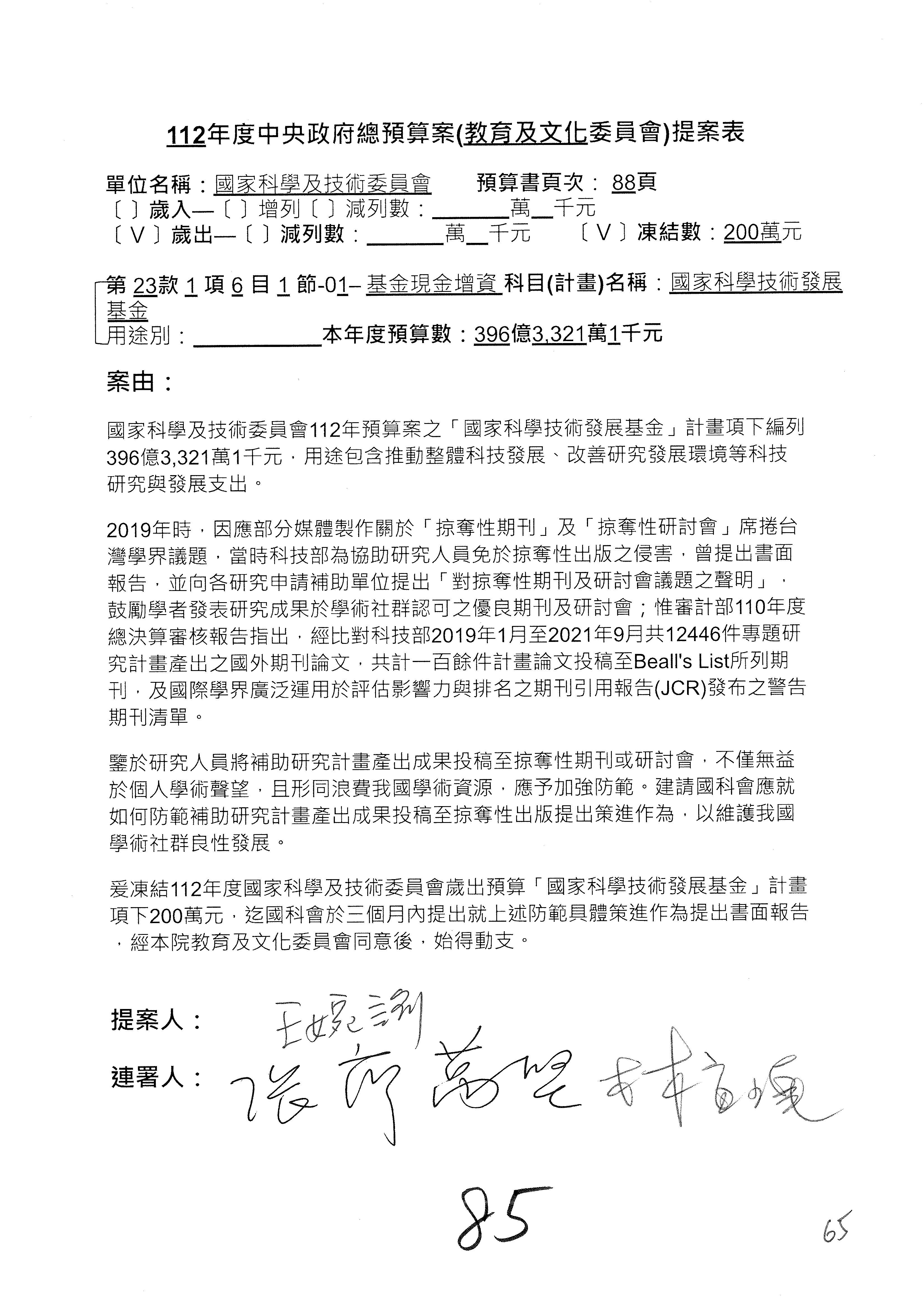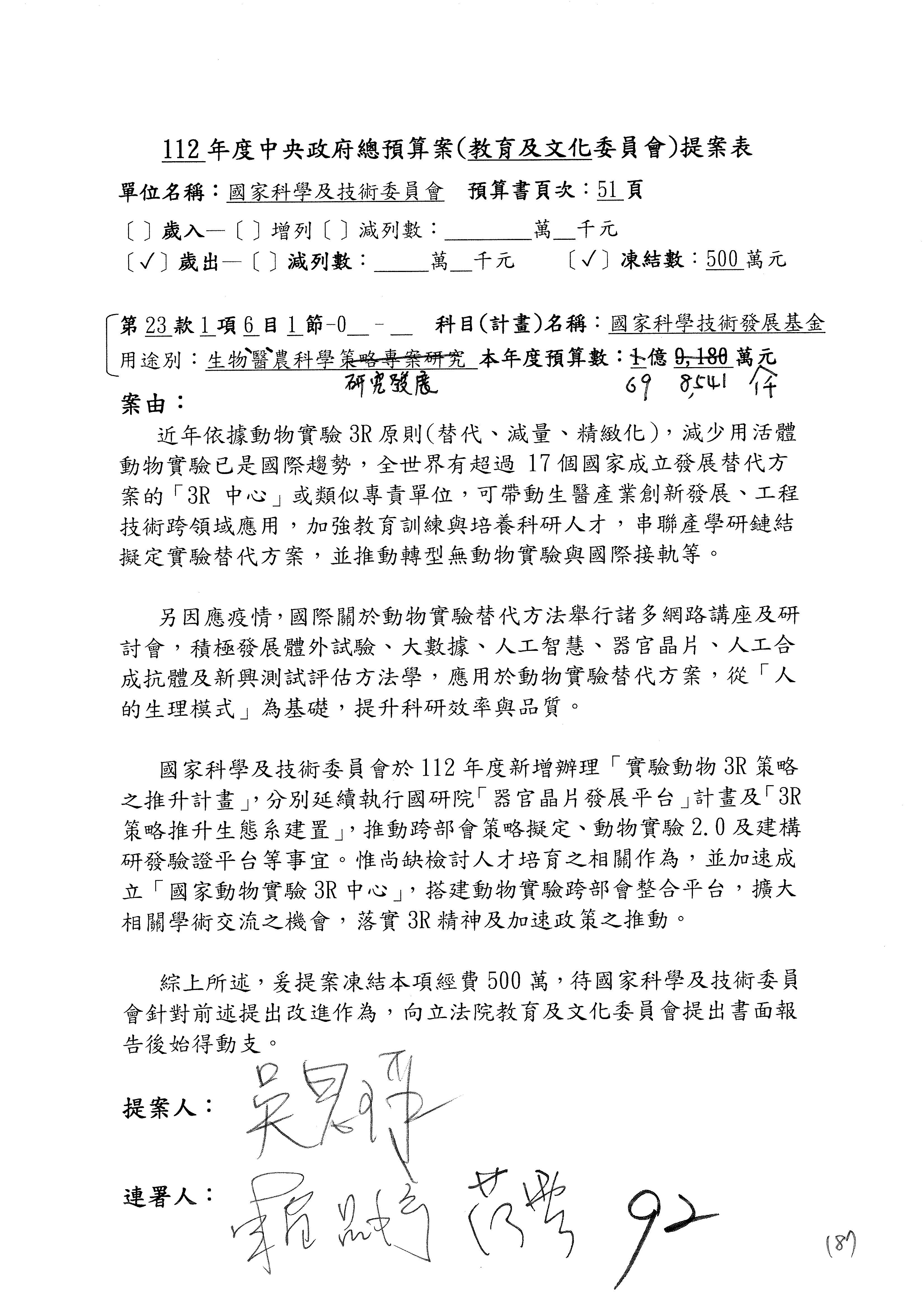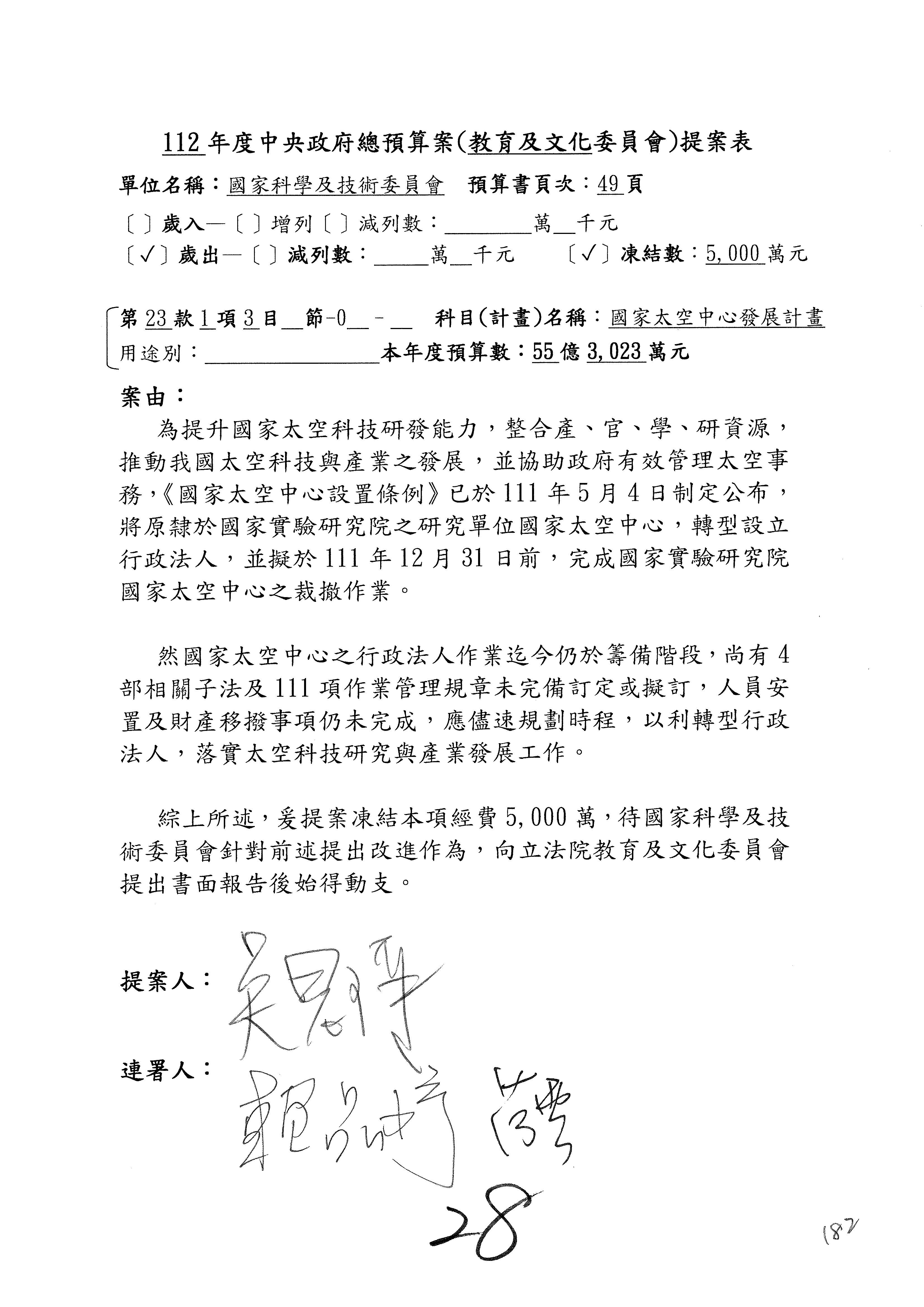 第8案是關於國際科技合作,這是跟晶片有關,臺灣晶片現在是國際上被討論的一個部分,原本這裡是編列8億7,490萬2,000元。在國際晶片戰爭當中,美日等國都運用不同的政策工具,希望削弱臺灣半導體的能量,所以希望國科會跟相關駐外科技組,對於這個部分能夠更敏銳,然後能有一些更有效的因應,所以針對112年度「推動整體科技發展計畫─國際科技合作」,希望能夠減列5,000萬元並凍結1億元,希望國科會就台積電前往美日設廠對臺灣半導體的影響做一個具體的說明跟評估,然後再予以動用。以上。謝謝。