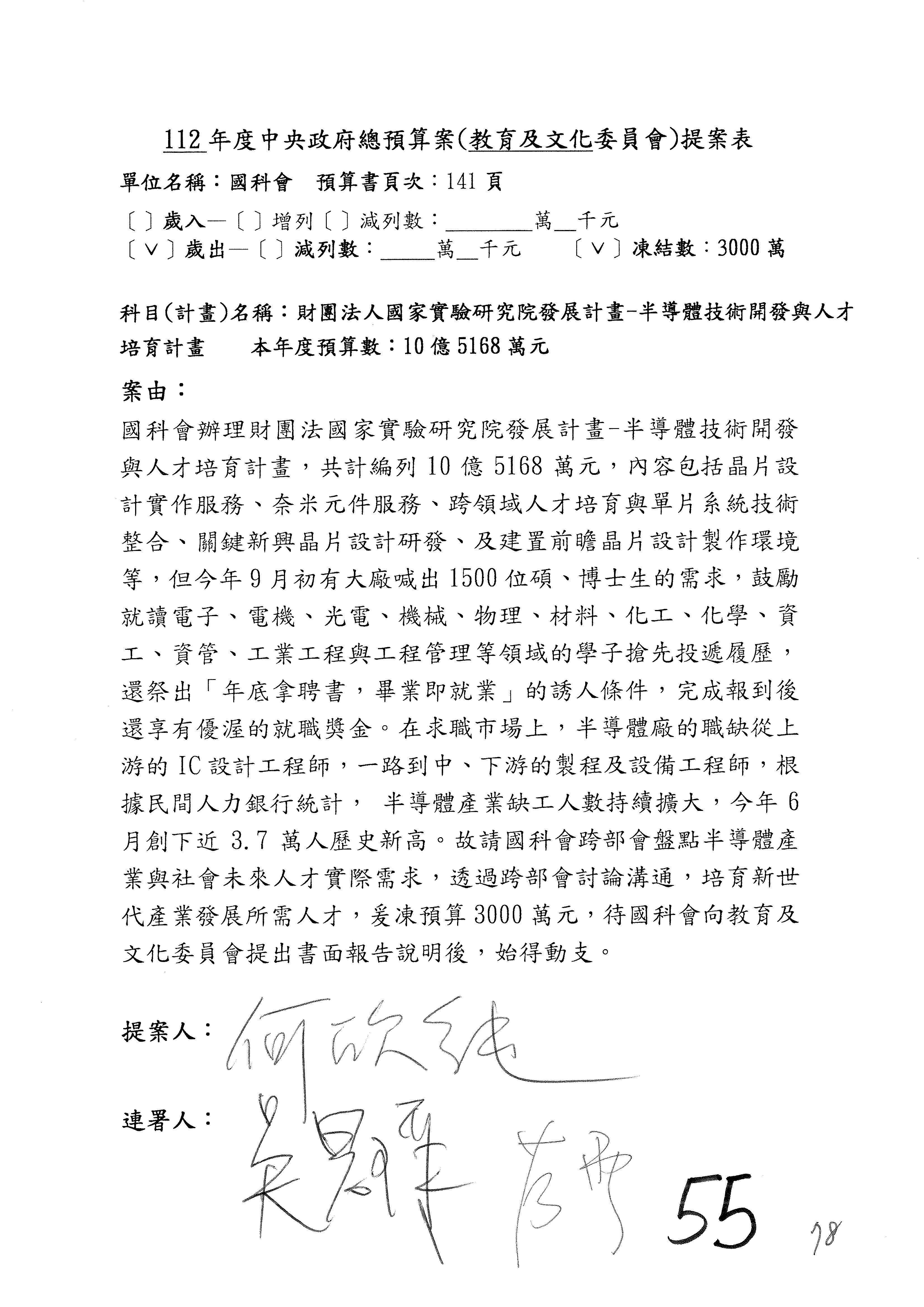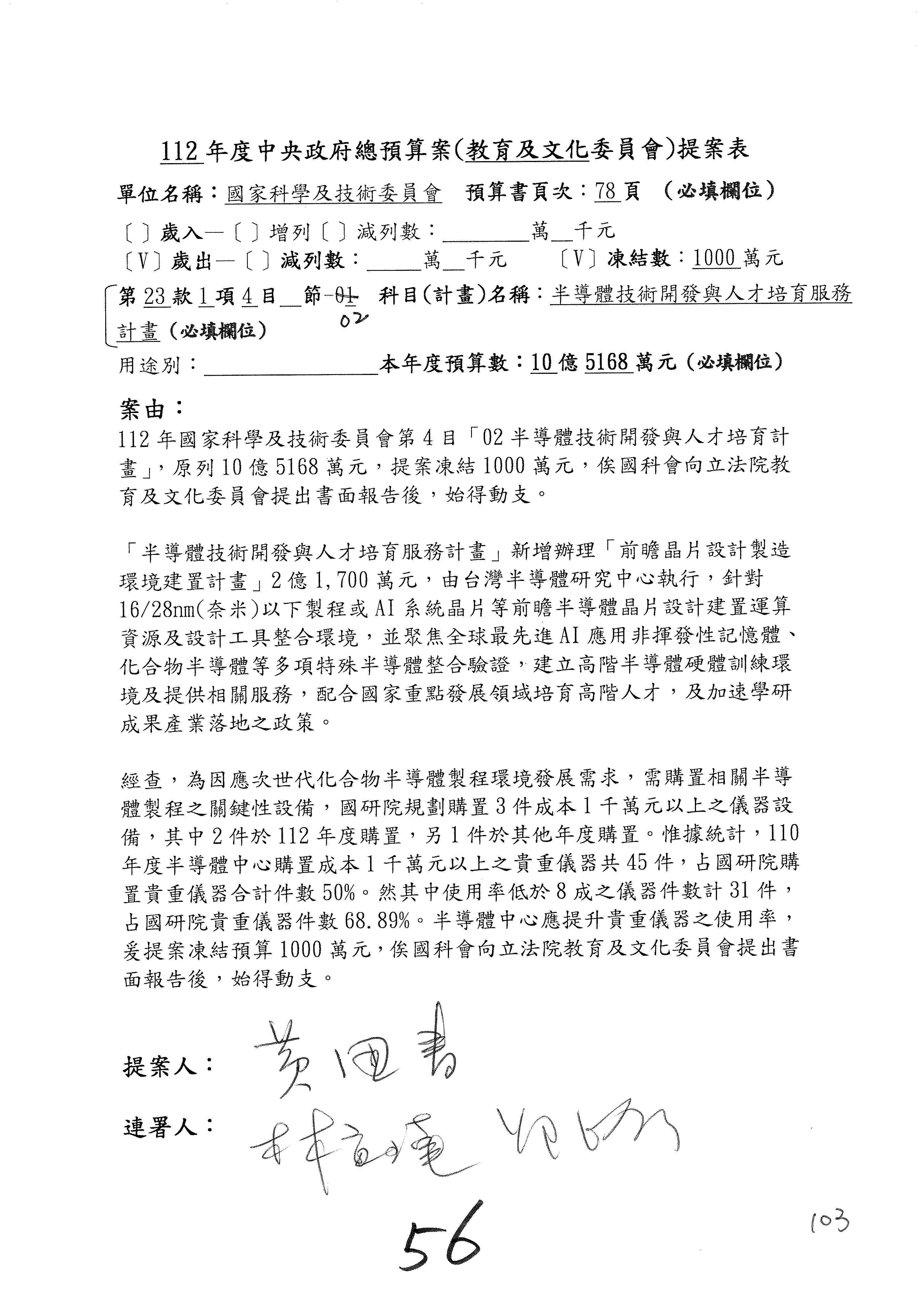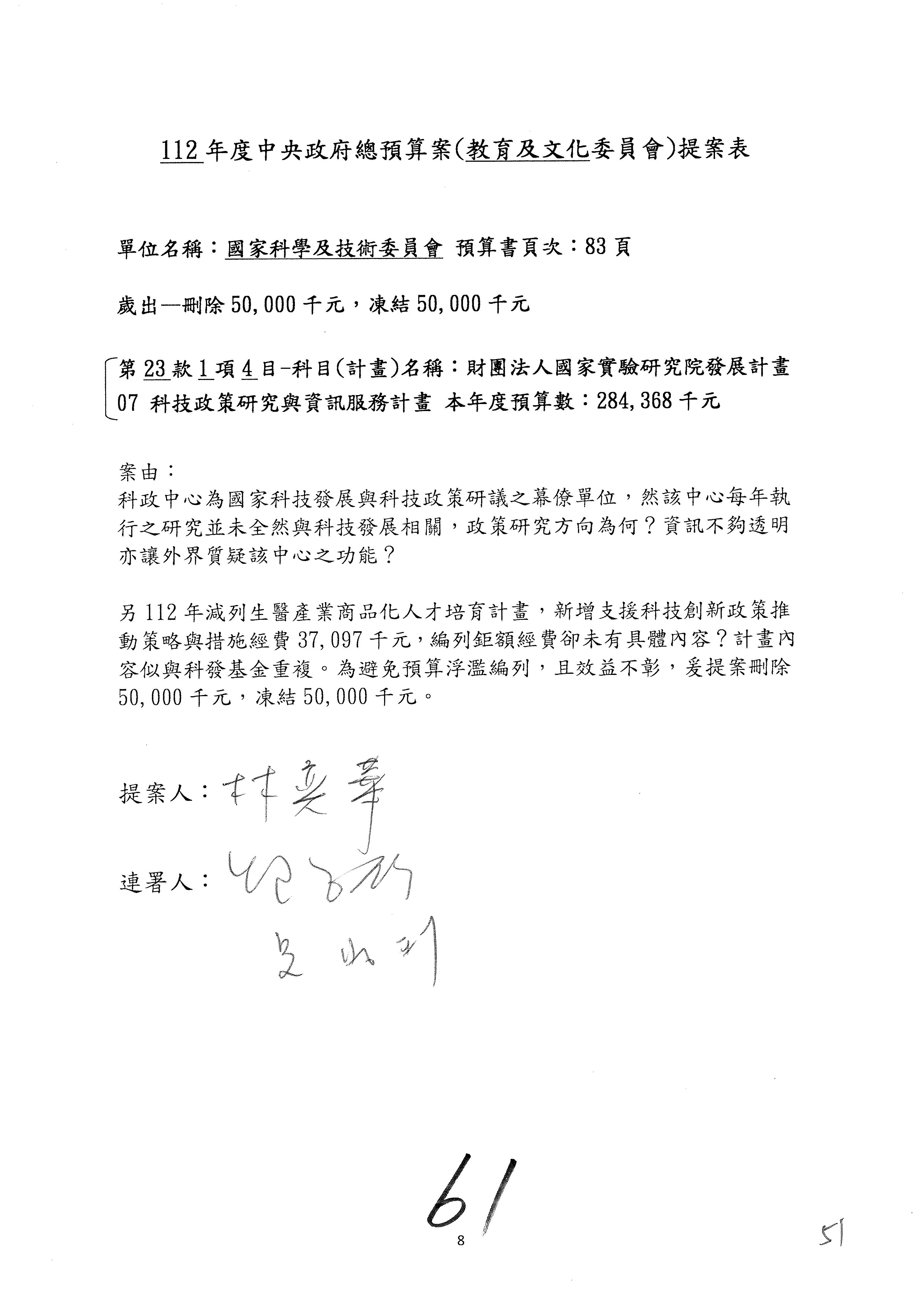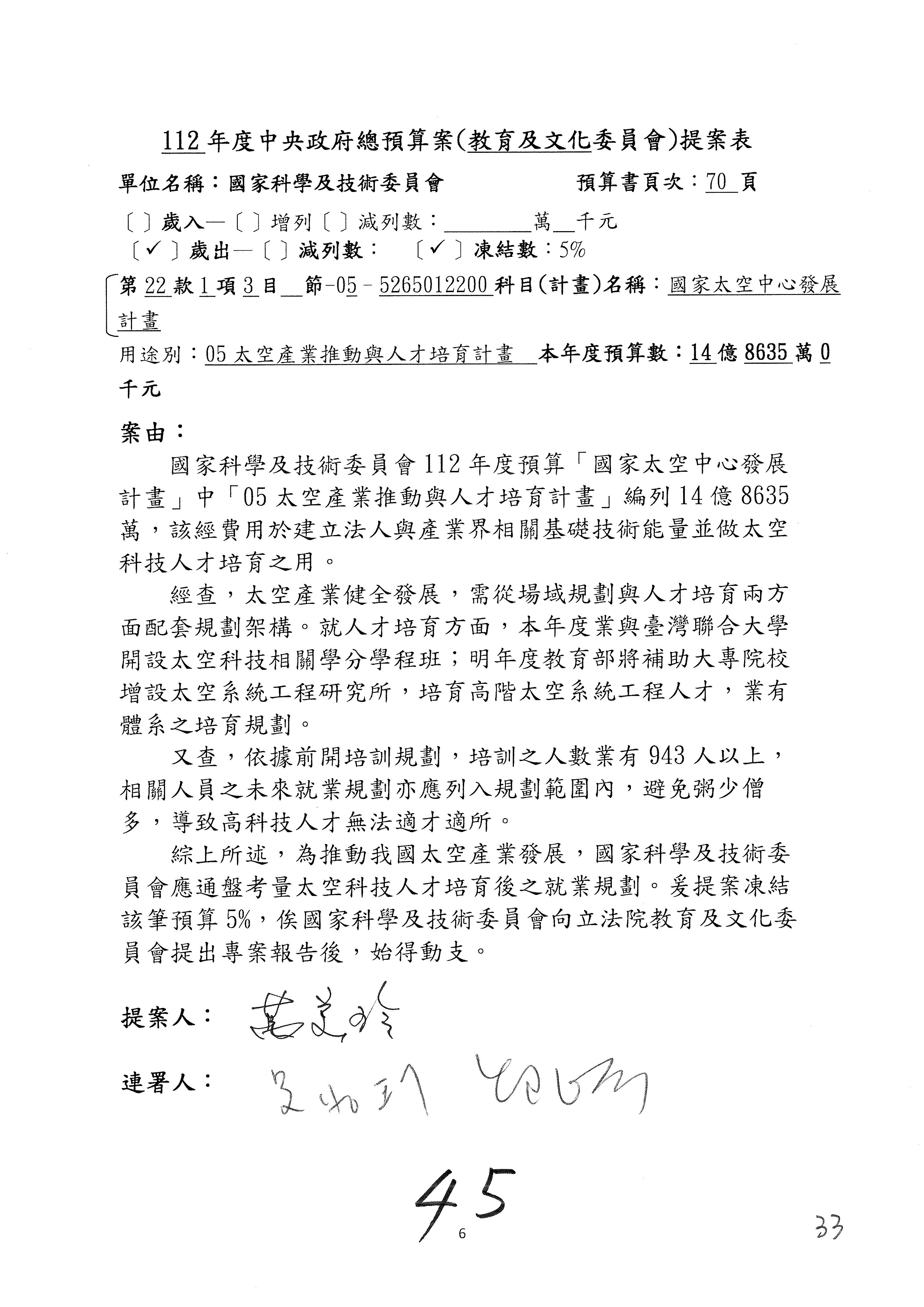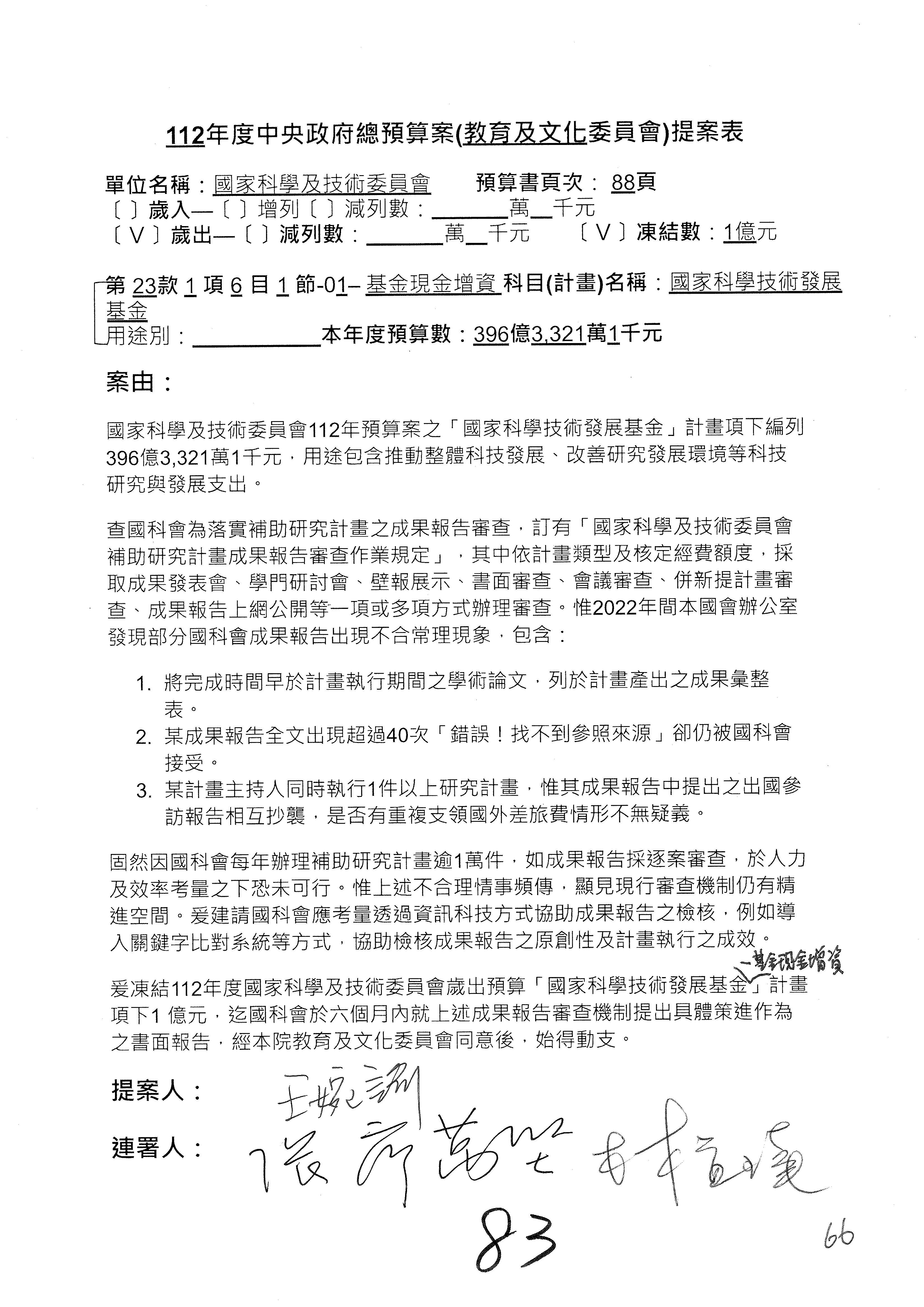 第8案是關於國際科技合作,這是跟晶片有關,臺灣晶片現在是國際上被討論的一個部分,原本這裡是編列8億7,490萬2,000元。在國際晶片戰爭當中,美日等國都運用不同的政策工具,希望削弱臺灣半導體的能量,所以希望國科會跟相關駐外科技組,對於這個部分能夠更敏銳,然後能有一些更有效的因應,所以針對112年度「推動整體科技發展計畫─國際科技合作」,希望能夠減列5,000萬元並凍結1億元,希望國科會就台積電前往美日設廠對臺灣半導體的影響做一個具體的說明跟評估,然後再予以動用。以上。謝謝。