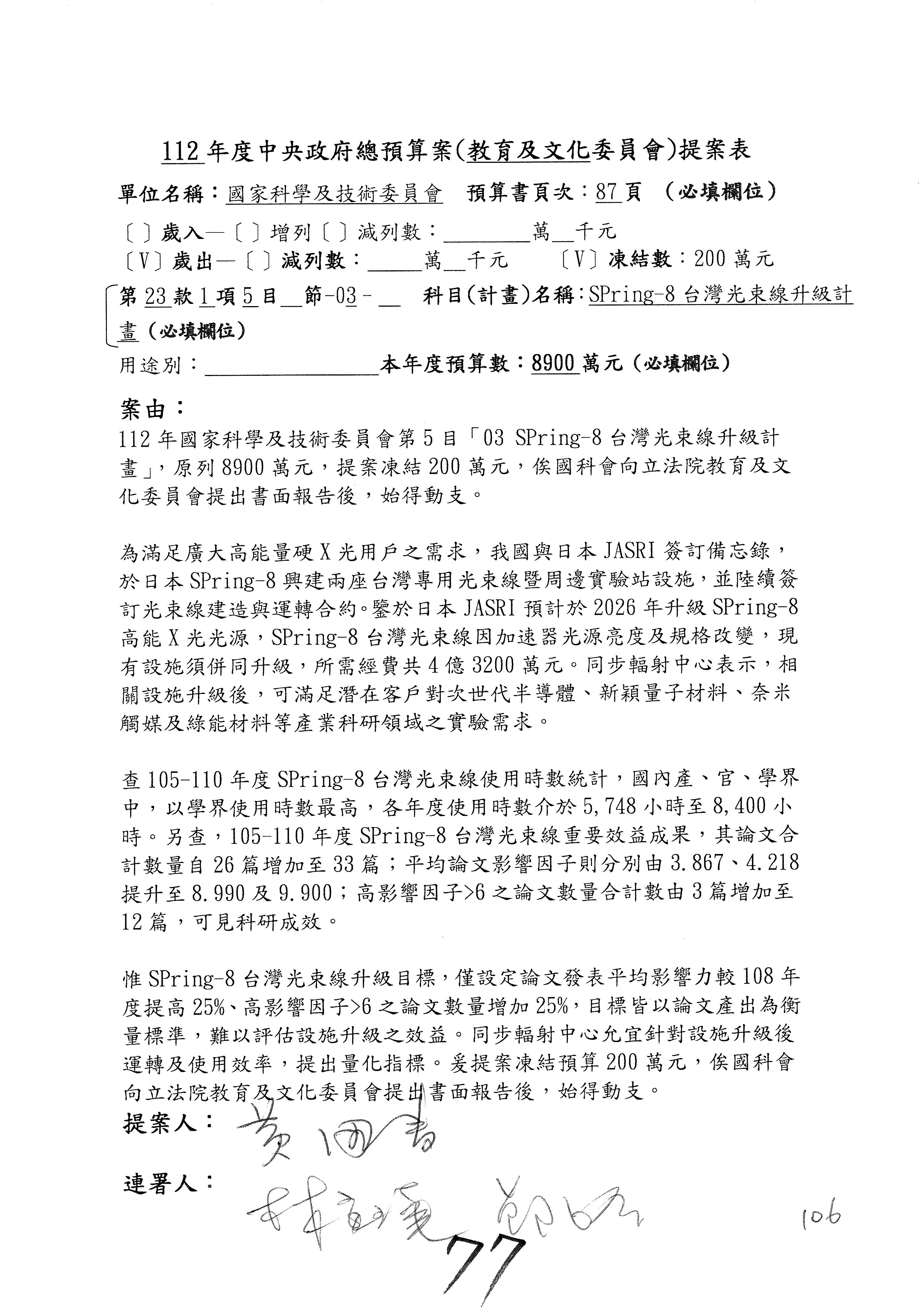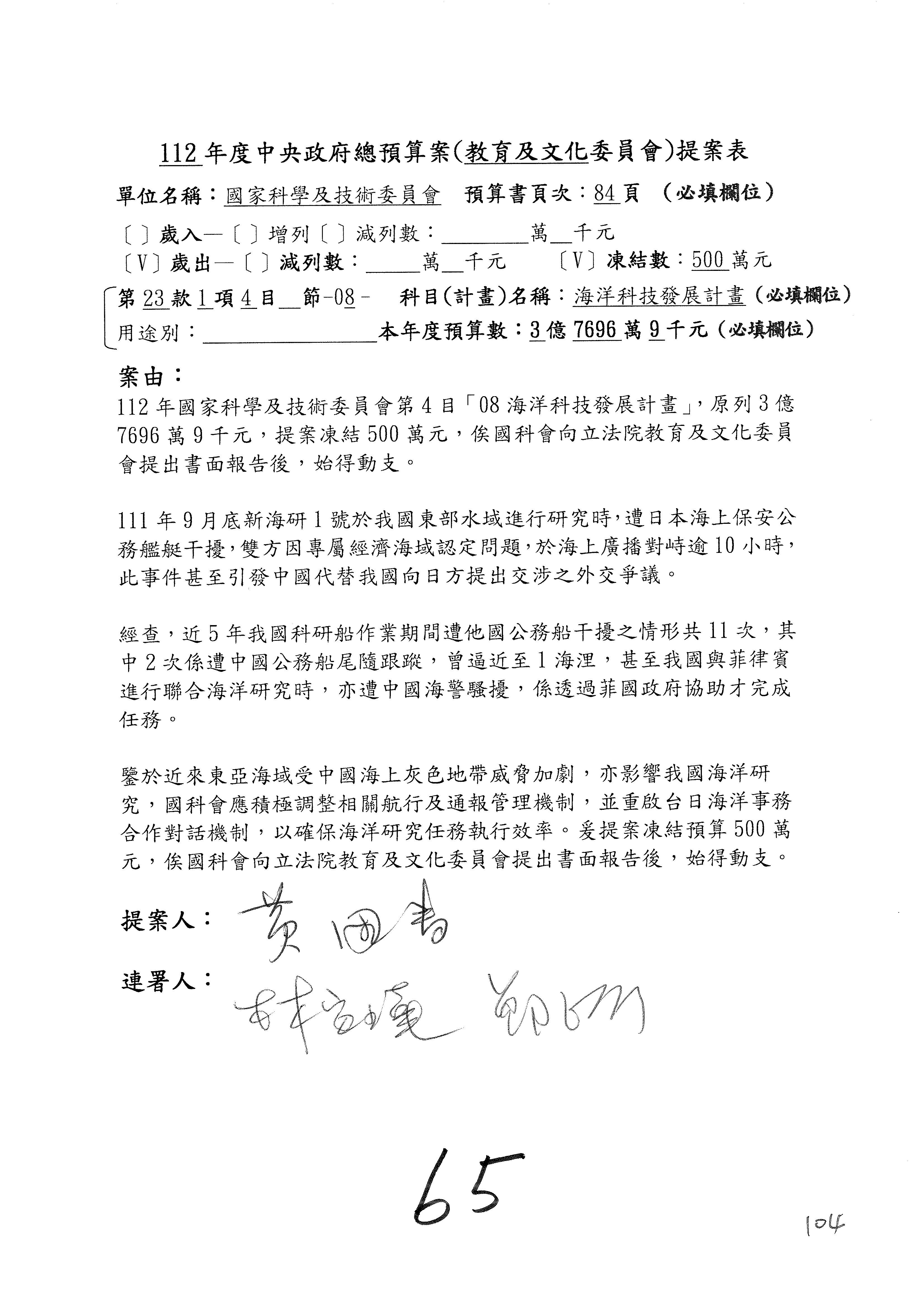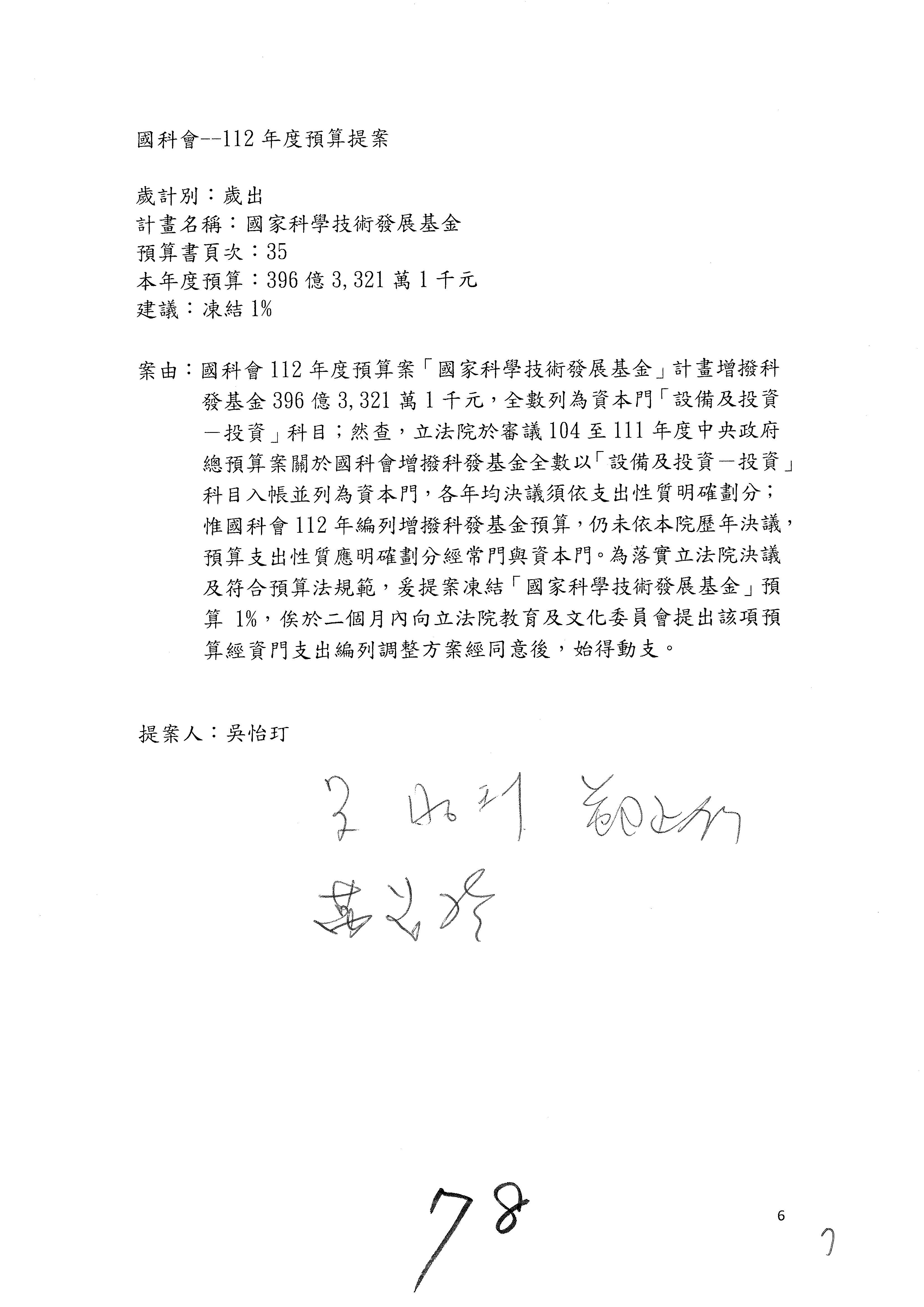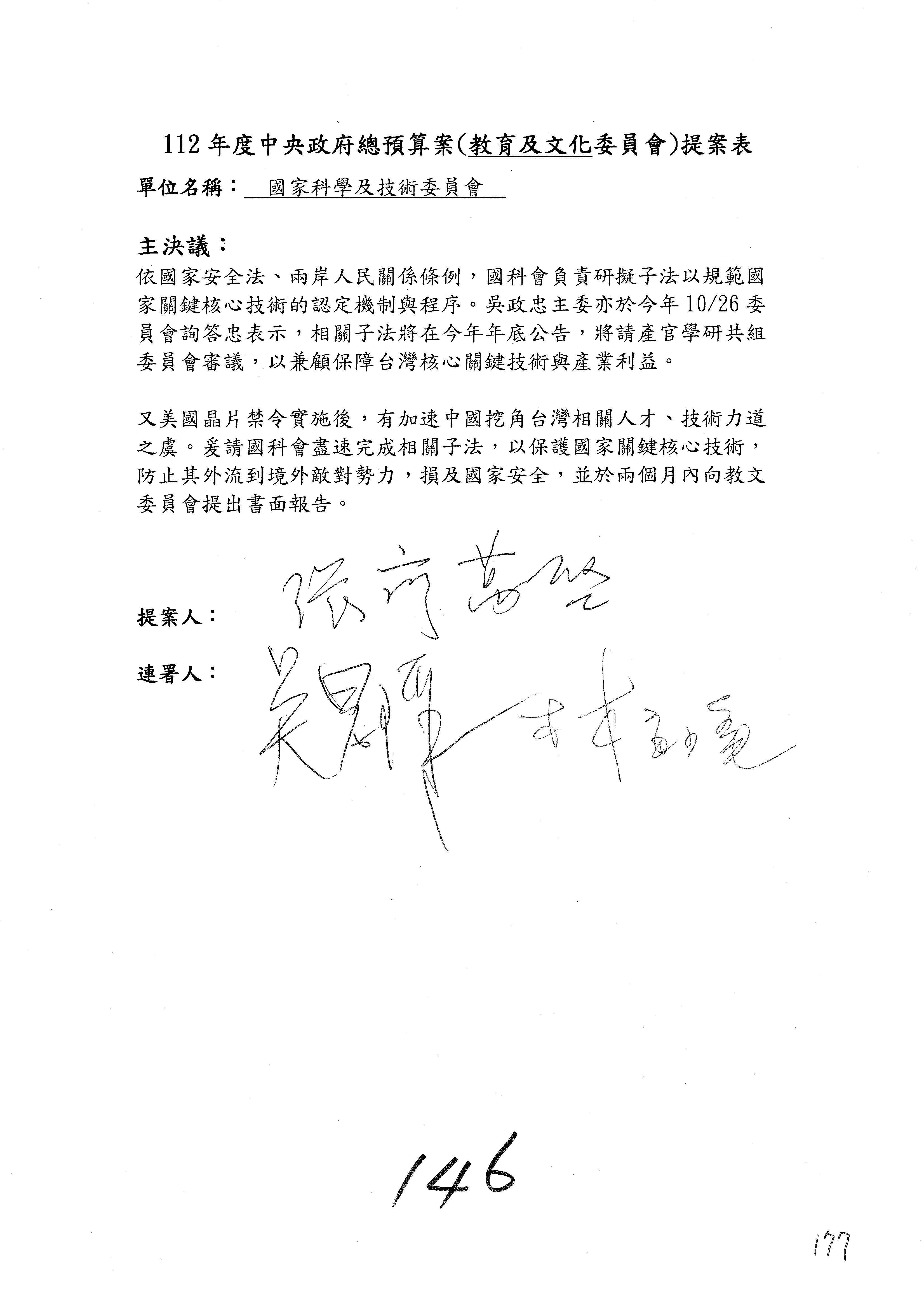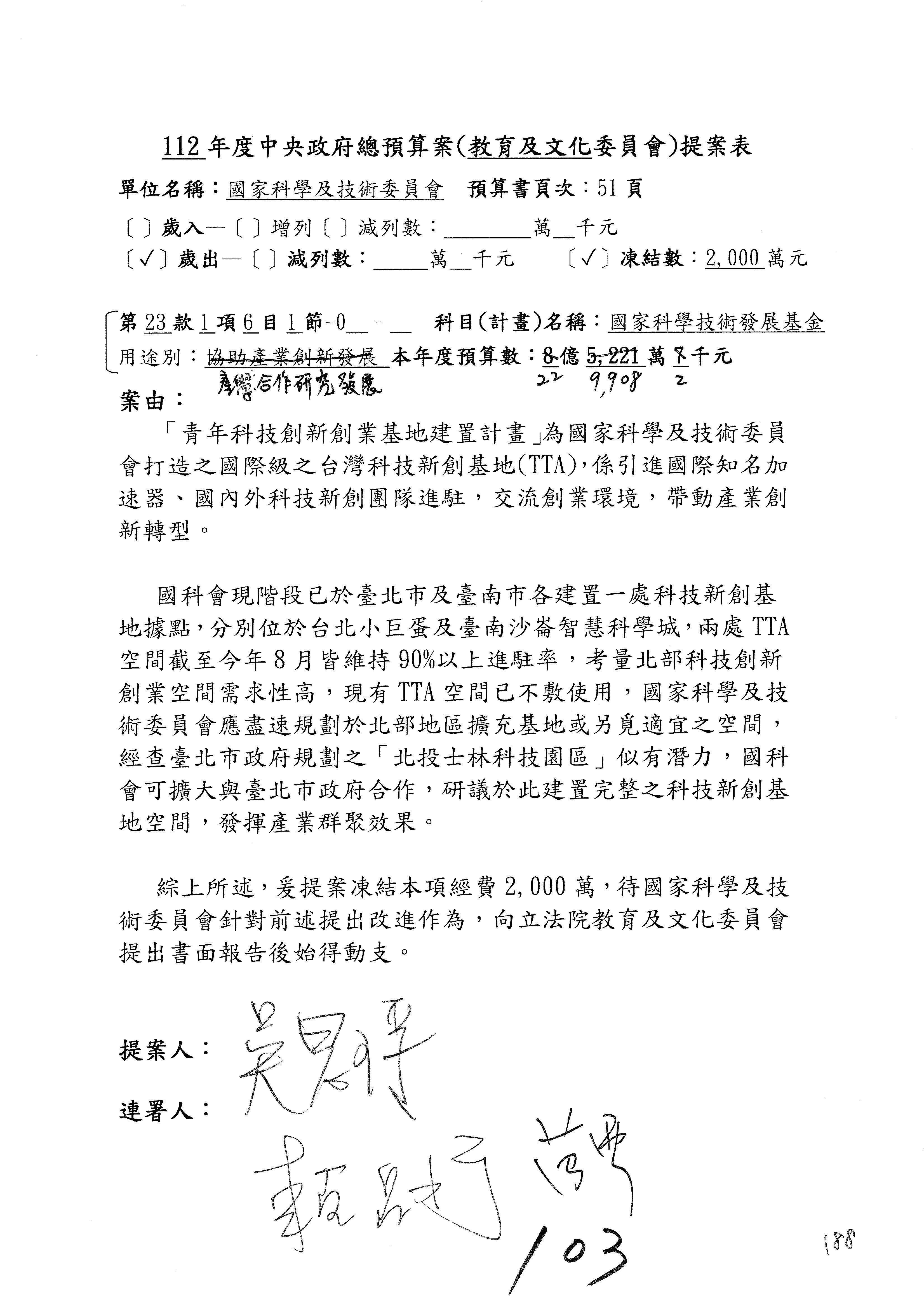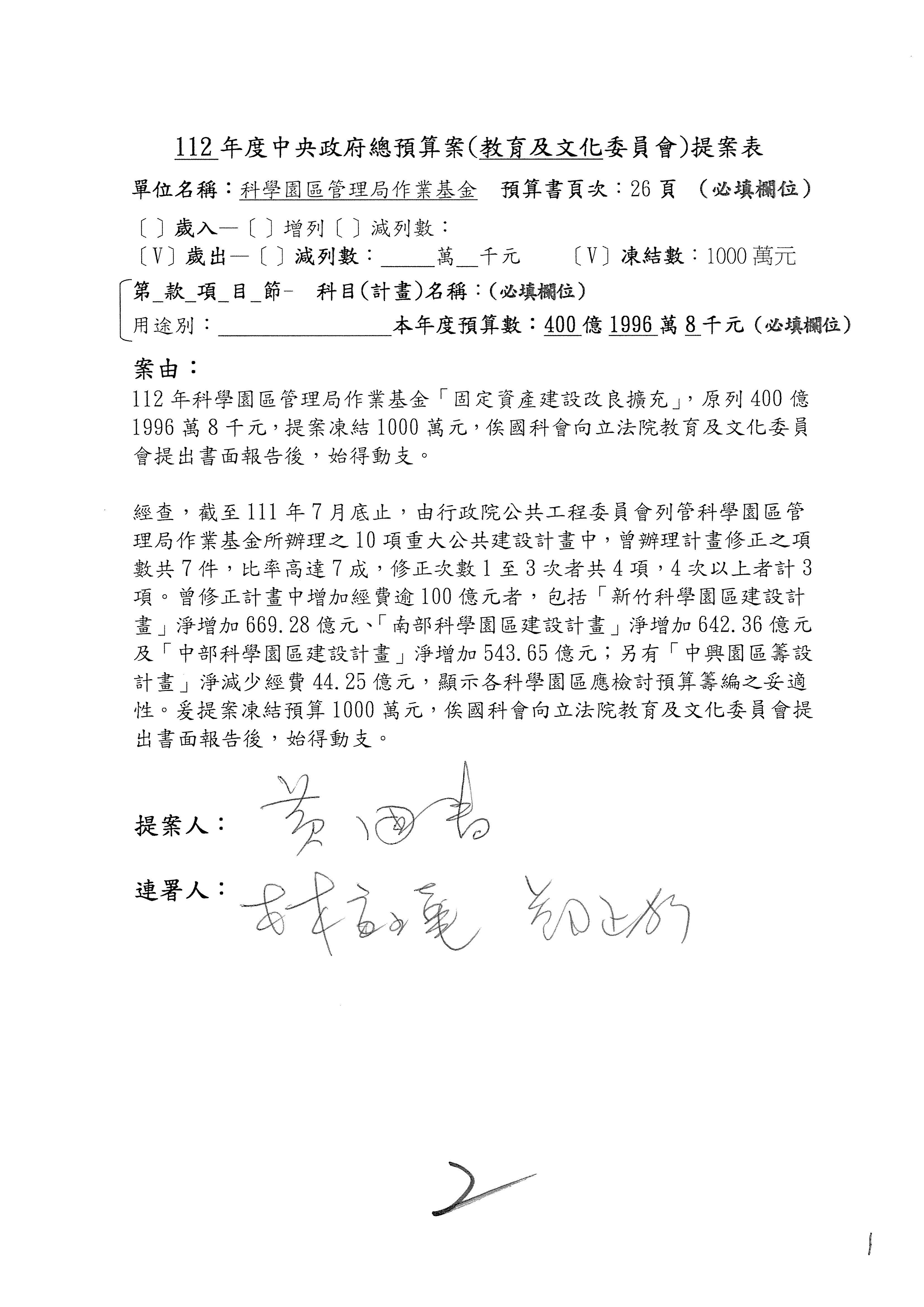 第8案是關於國際科技合作,這是跟晶片有關,臺灣晶片現在是國際上被討論的一個部分,原本這裡是編列8億7,490萬2,000元。在國際晶片戰爭當中,美日等國都運用不同的政策工具,希望削弱臺灣半導體的能量,所以希望國科會跟相關駐外科技組,對於這個部分能夠更敏銳,然後能有一些更有效的因應,所以針對112年度「推動整體科技發展計畫─國際科技合作」,希望能夠減列5,000萬元並凍結1億元,希望國科會就台積電前往美日設廠對臺灣半導體的影響做一個具體的說明跟評估,然後再予以動用。以上。謝謝。