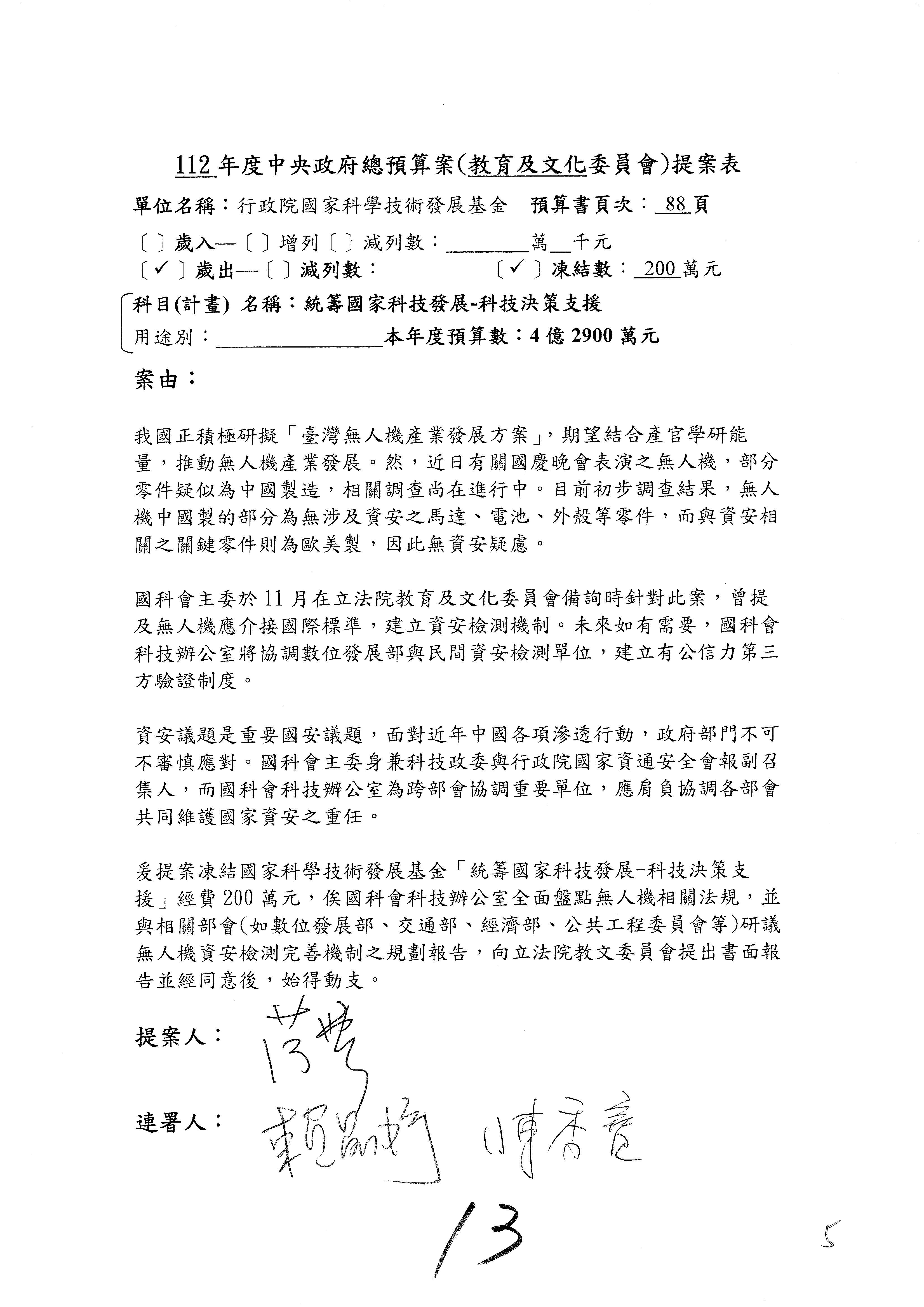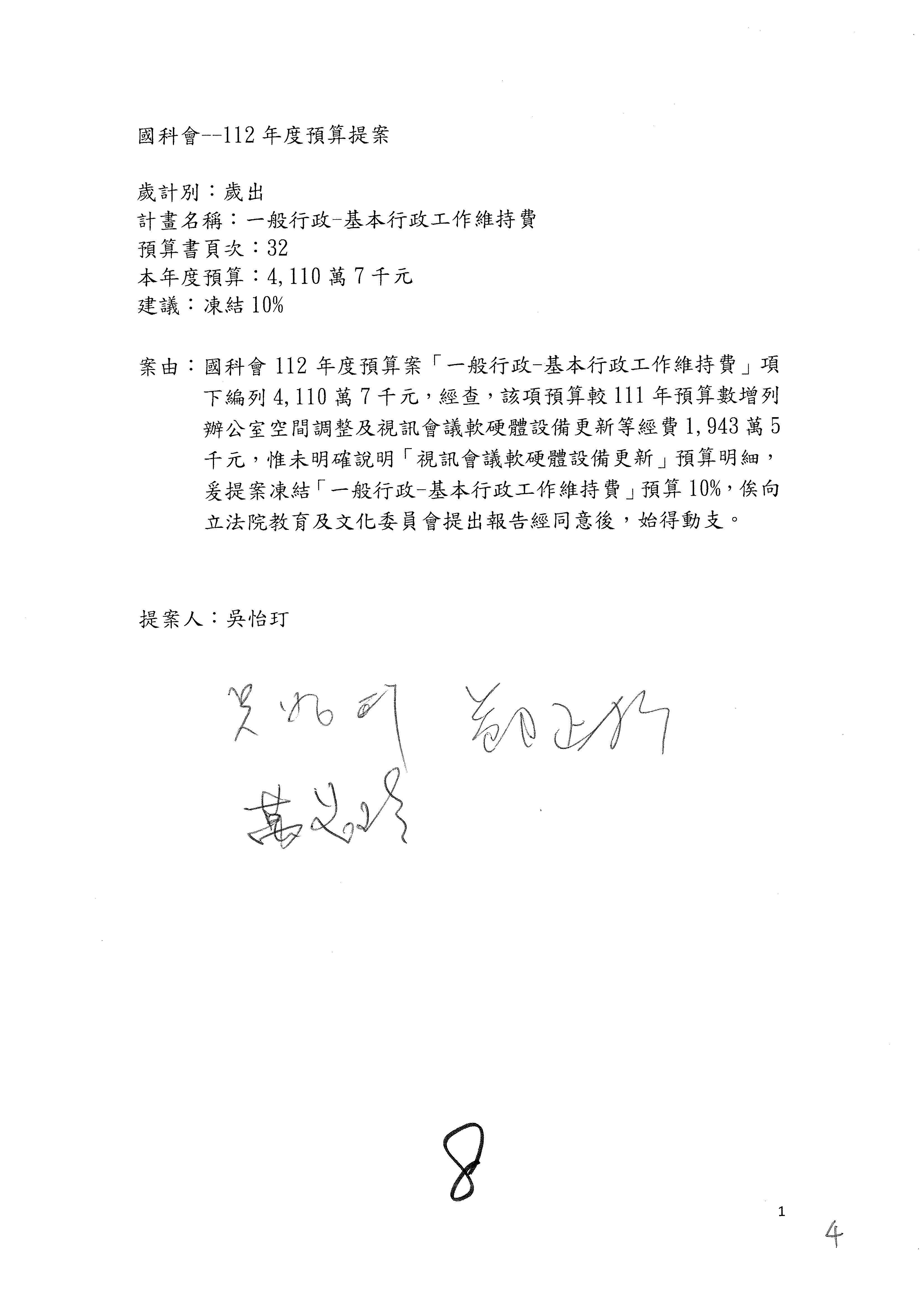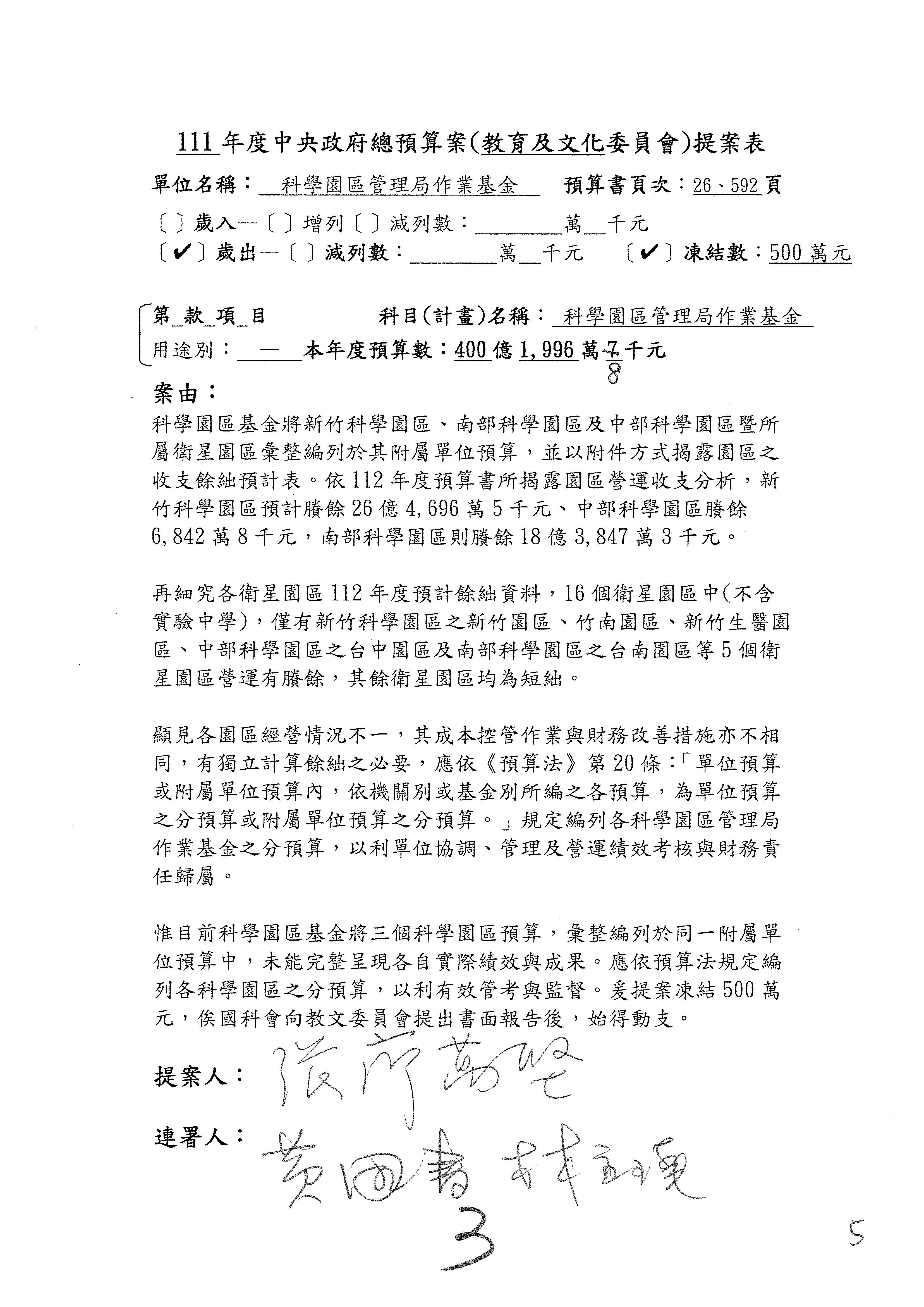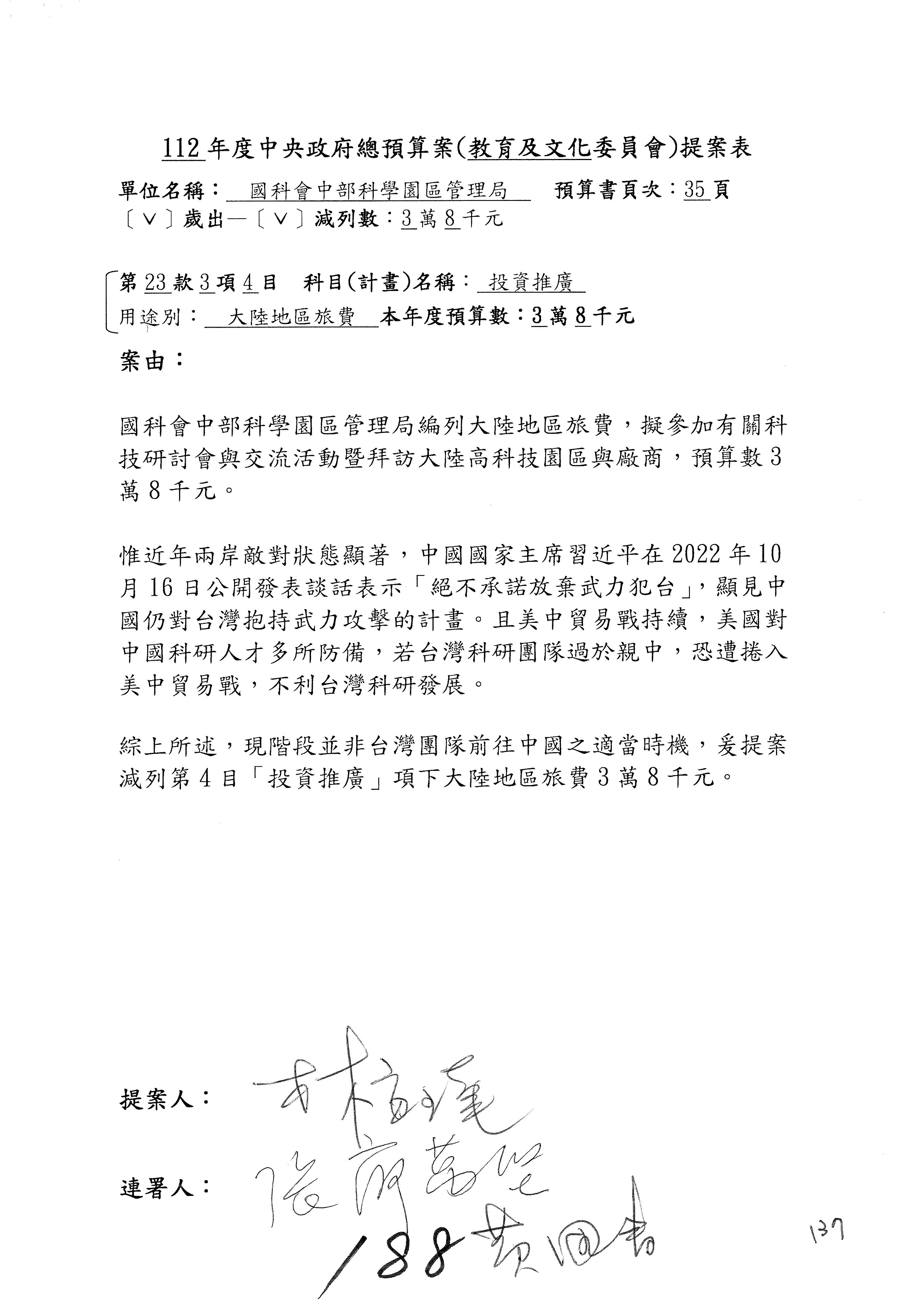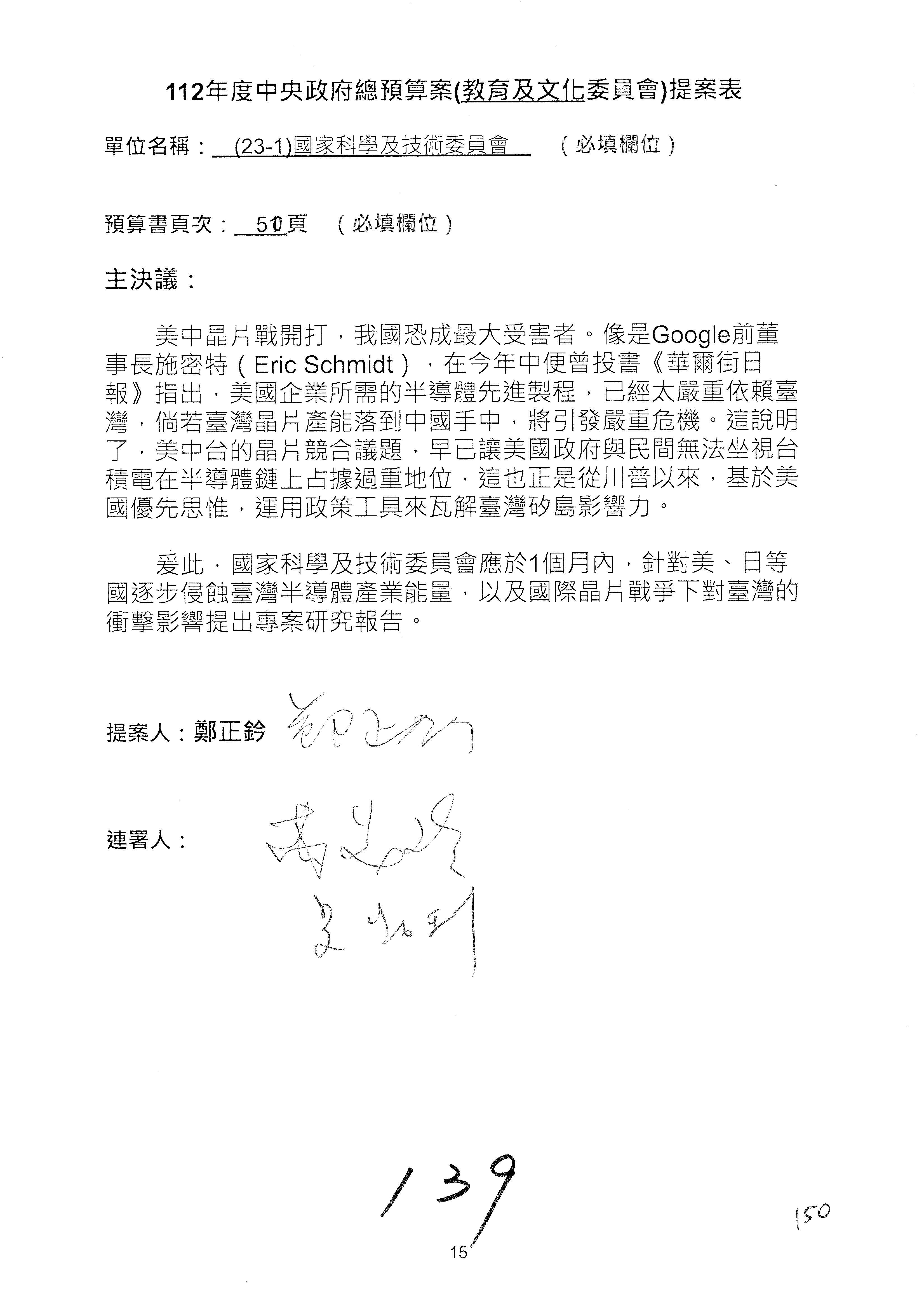 第8案是關於國際科技合作,這是跟晶片有關,臺灣晶片現在是國際上被討論的一個部分,原本這裡是編列8億7,490萬2,000元。在國際晶片戰爭當中,美日等國都運用不同的政策工具,希望削弱臺灣半導體的能量,所以希望國科會跟相關駐外科技組,對於這個部分能夠更敏銳,然後能有一些更有效的因應,所以針對112年度「推動整體科技發展計畫─國際科技合作」,希望能夠減列5,000萬元並凍結1億元,希望國科會就台積電前往美日設廠對臺灣半導體的影響做一個具體的說明跟評估,然後再予以動用。以上。謝謝。