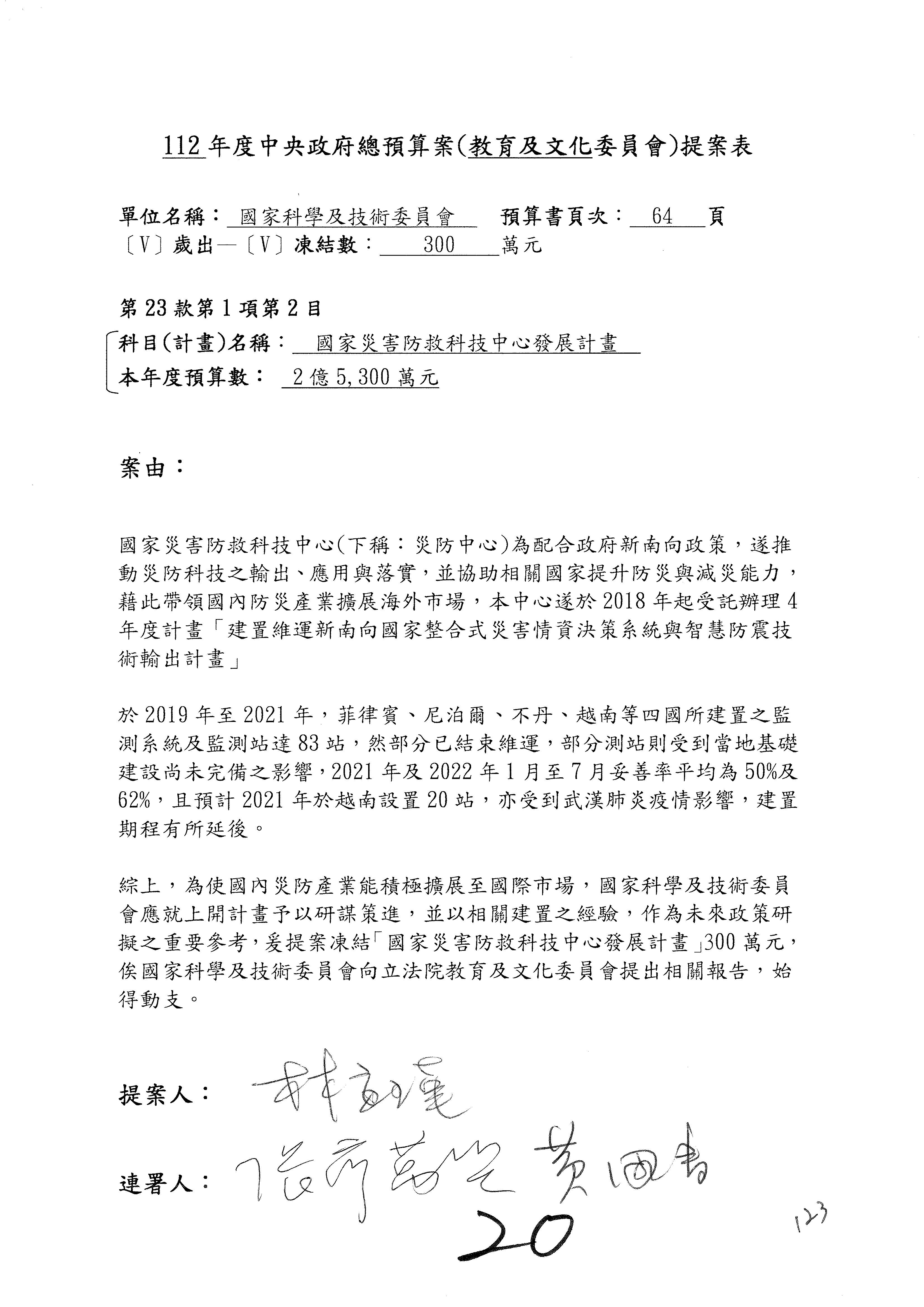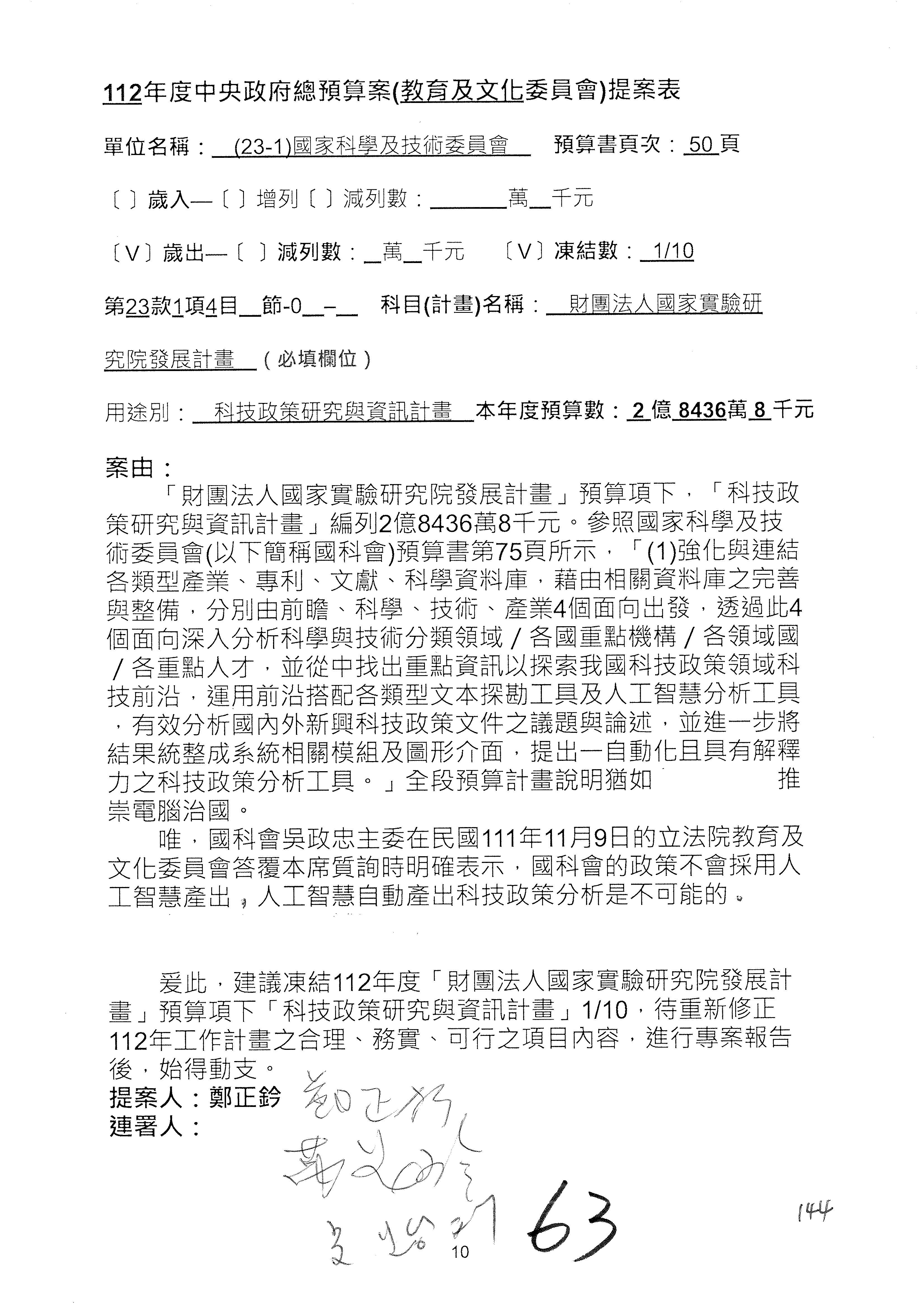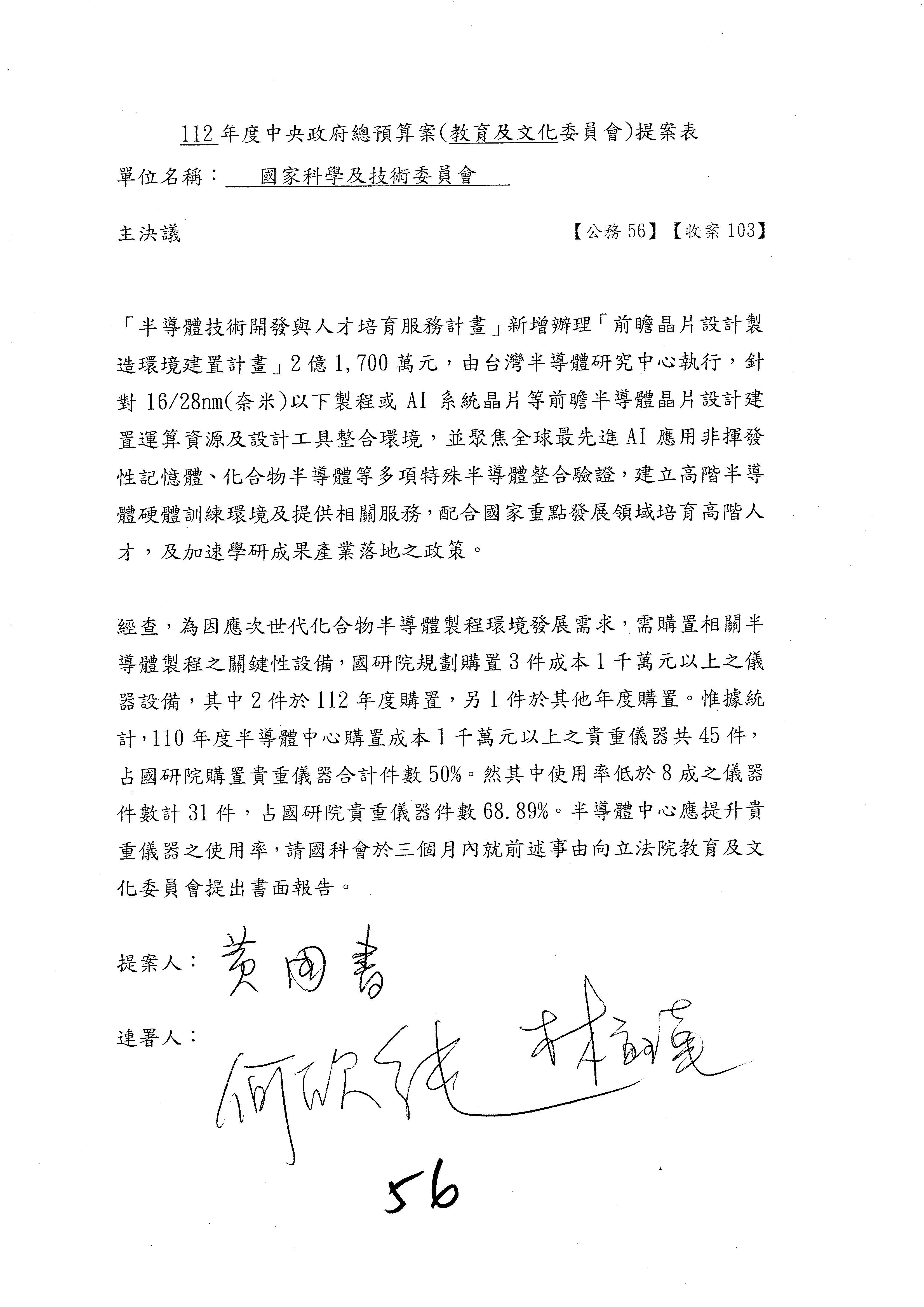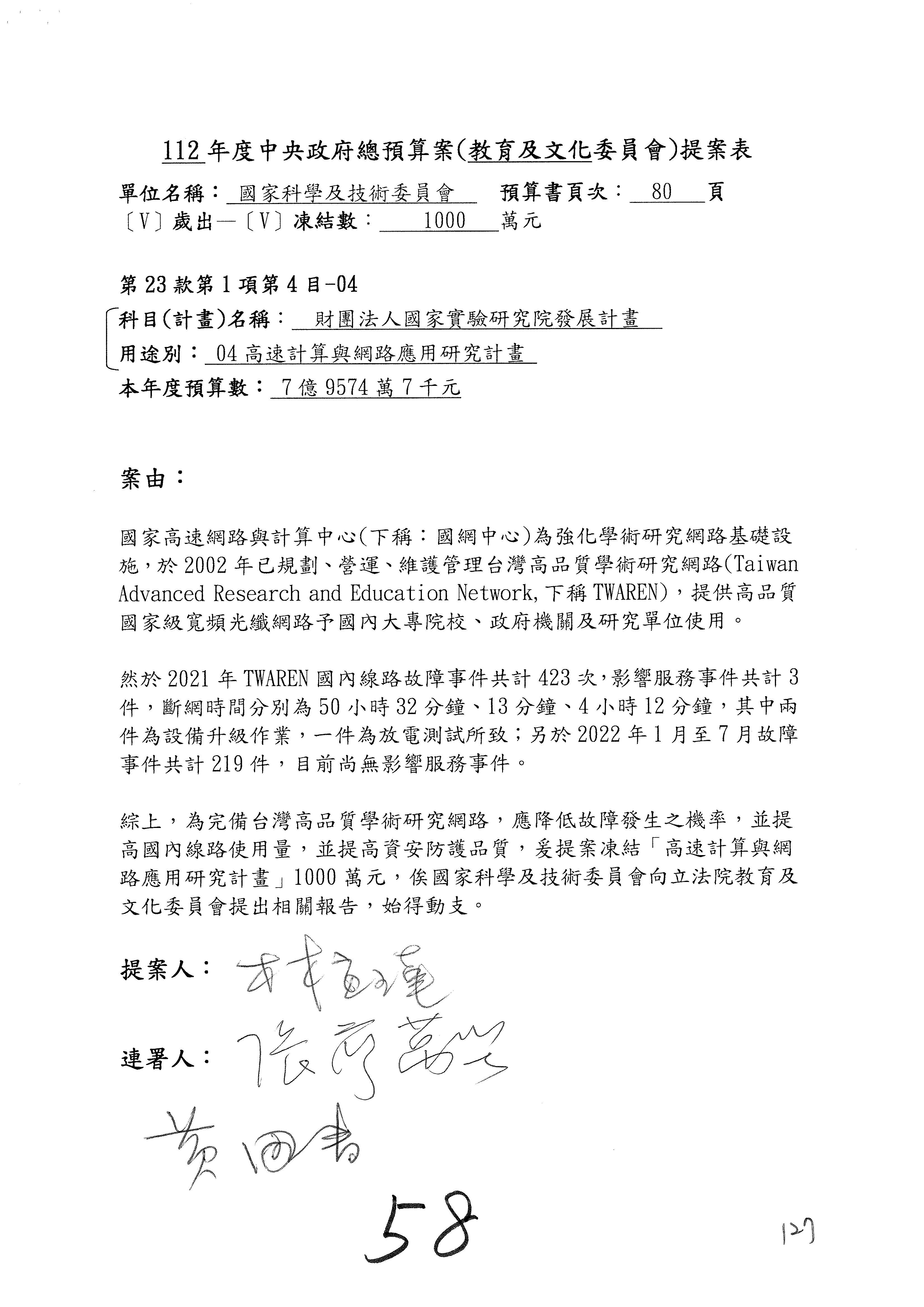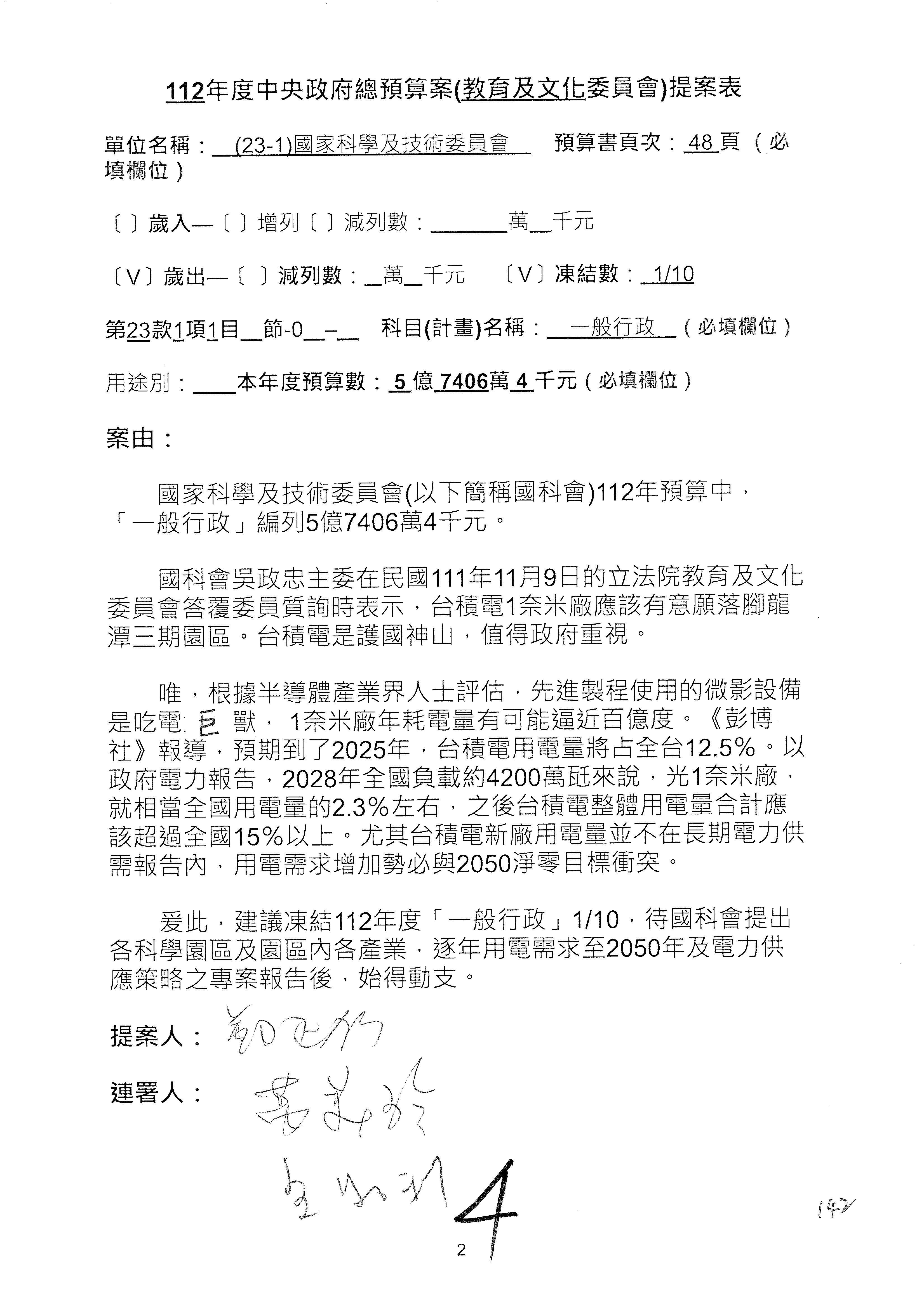 第8案是關於國際科技合作,這是跟晶片有關,臺灣晶片現在是國際上被討論的一個部分,原本這裡是編列8億7,490萬2,000元。在國際晶片戰爭當中,美日等國都運用不同的政策工具,希望削弱臺灣半導體的能量,所以希望國科會跟相關駐外科技組,對於這個部分能夠更敏銳,然後能有一些更有效的因應,所以針對112年度「推動整體科技發展計畫─國際科技合作」,希望能夠減列5,000萬元並凍結1億元,希望國科會就台積電前往美日設廠對臺灣半導體的影響做一個具體的說明跟評估,然後再予以動用。以上。謝謝。
