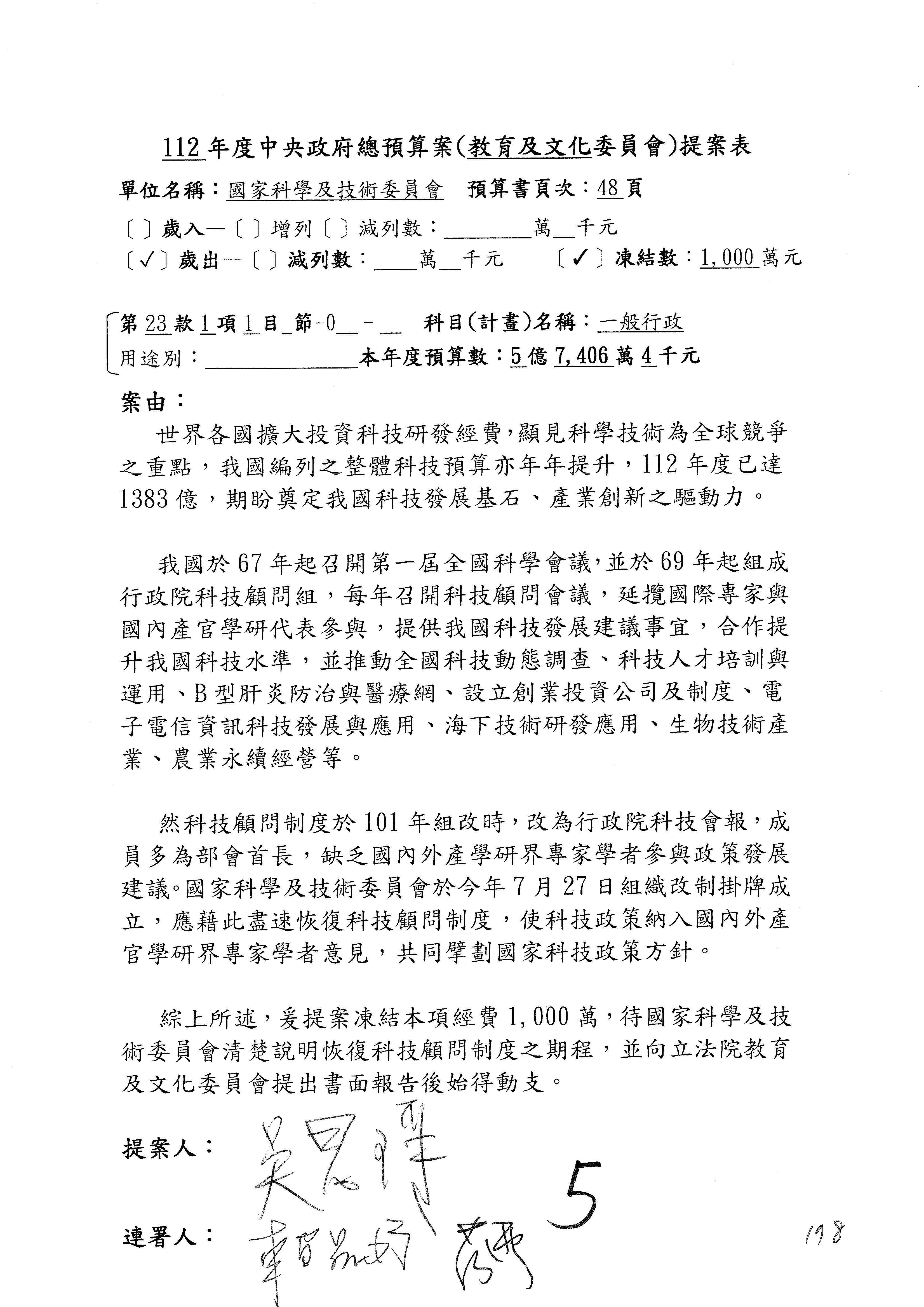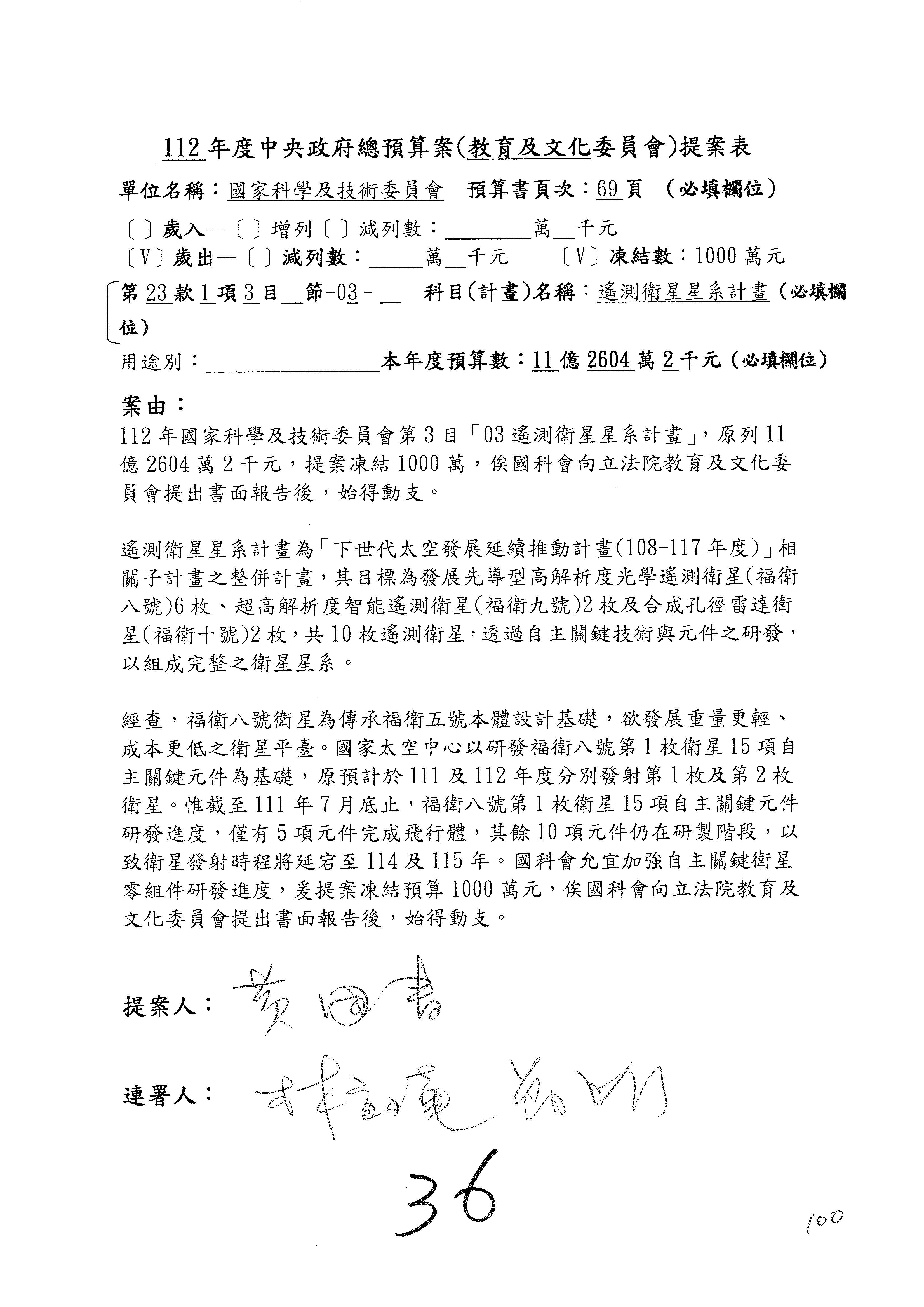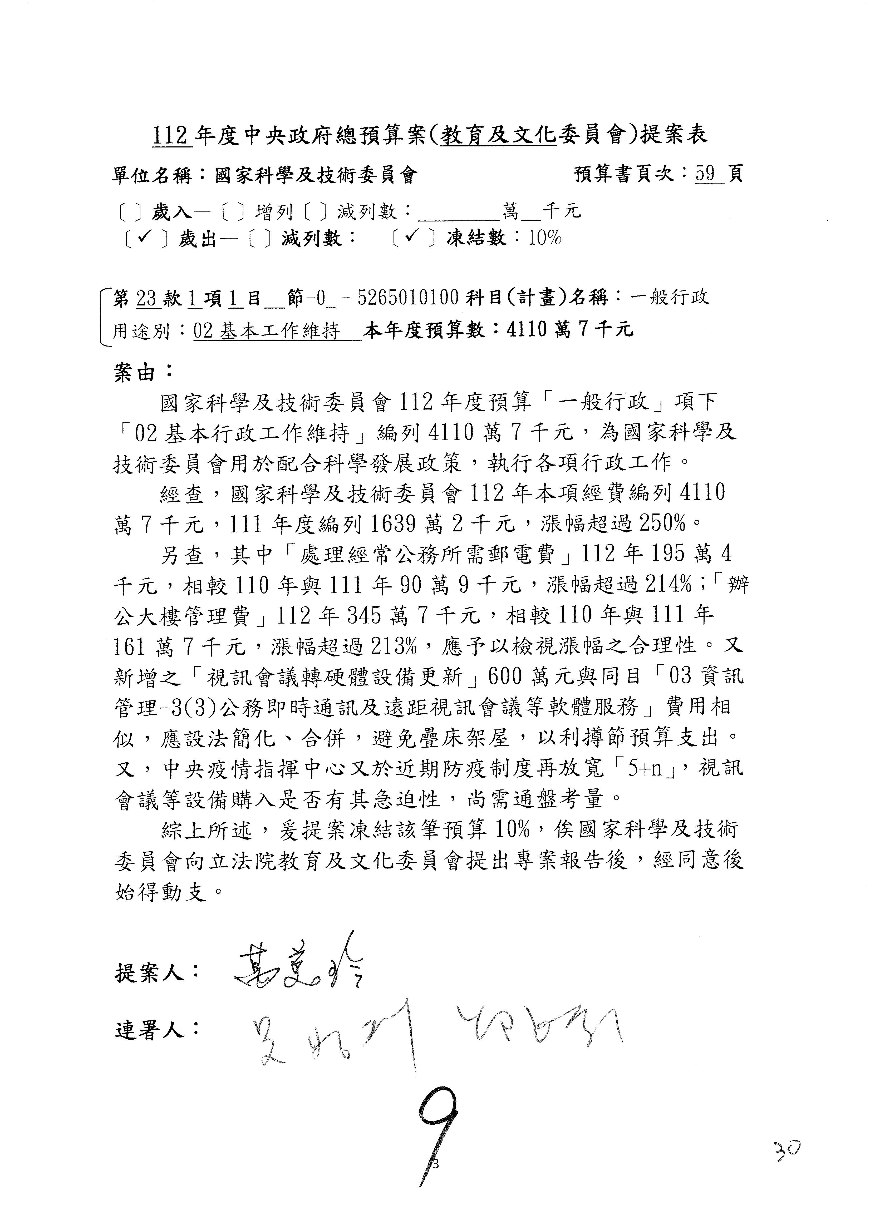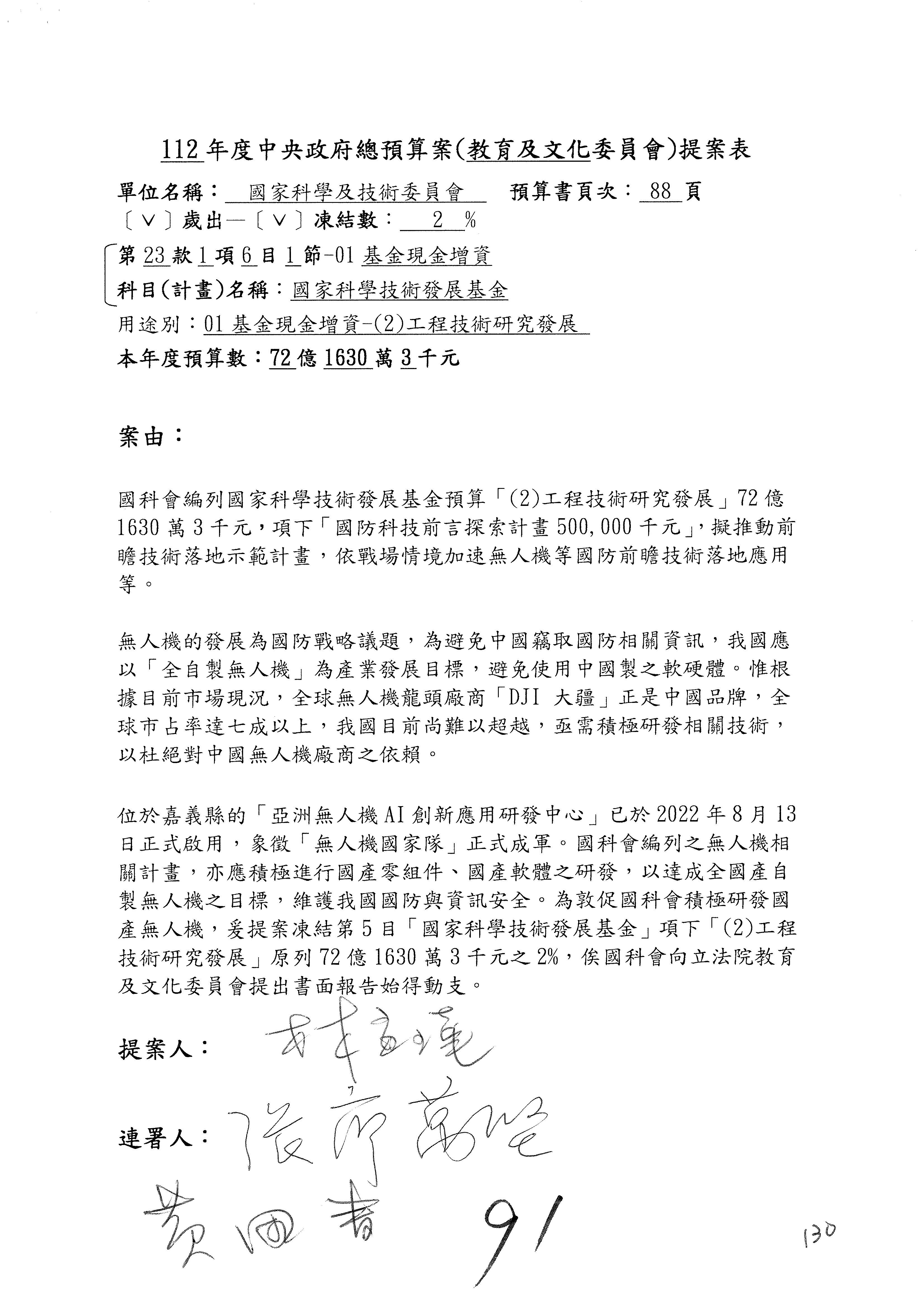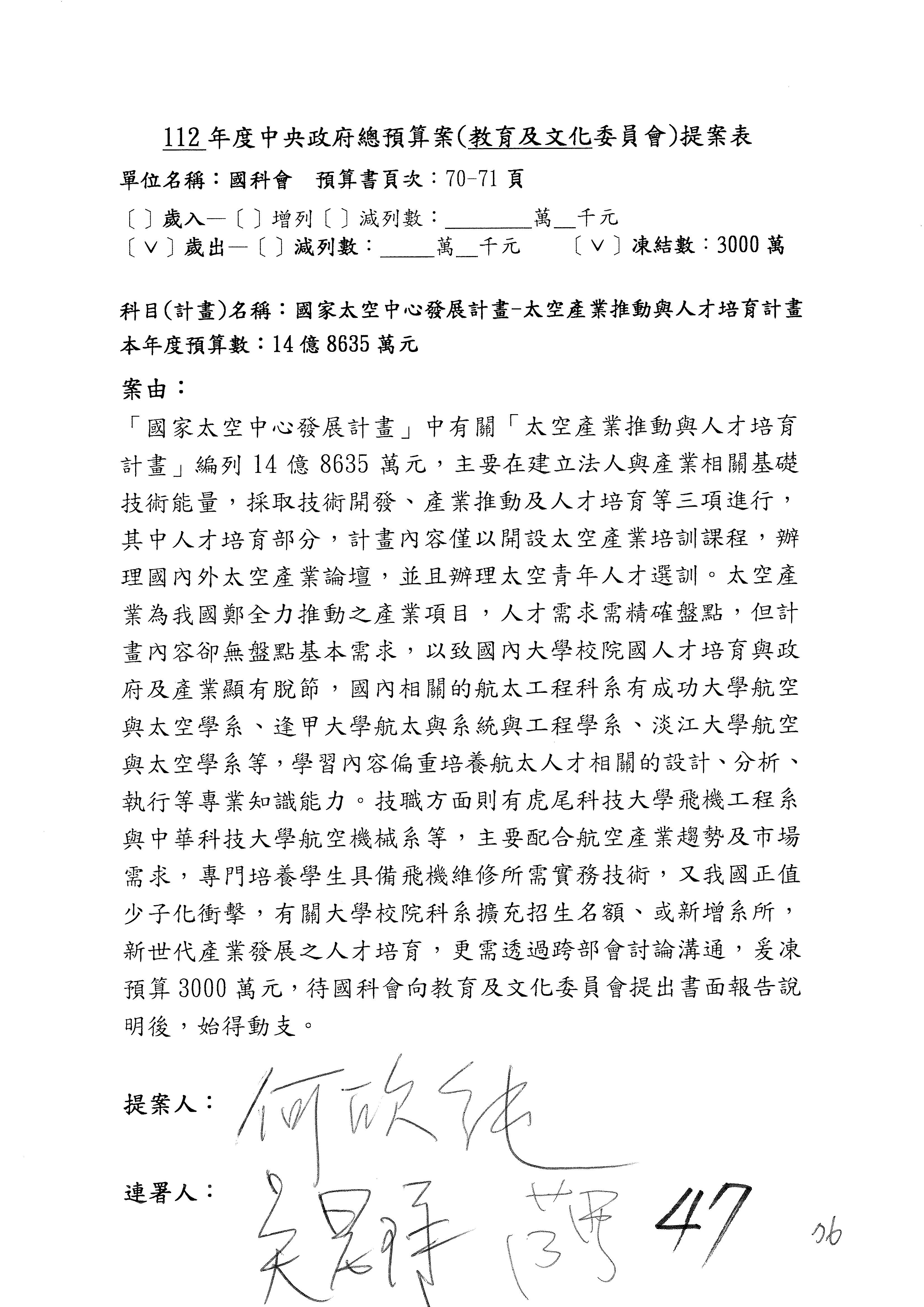 第8案是關於國際科技合作,這是跟晶片有關,臺灣晶片現在是國際上被討論的一個部分,原本這裡是編列8億7,490萬2,000元。在國際晶片戰爭當中,美日等國都運用不同的政策工具,希望削弱臺灣半導體的能量,所以希望國科會跟相關駐外科技組,對於這個部分能夠更敏銳,然後能有一些更有效的因應,所以針對112年度「推動整體科技發展計畫─國際科技合作」,希望能夠減列5,000萬元並凍結1億元,希望國科會就台積電前往美日設廠對臺灣半導體的影響做一個具體的說明跟評估,然後再予以動用。以上。謝謝。