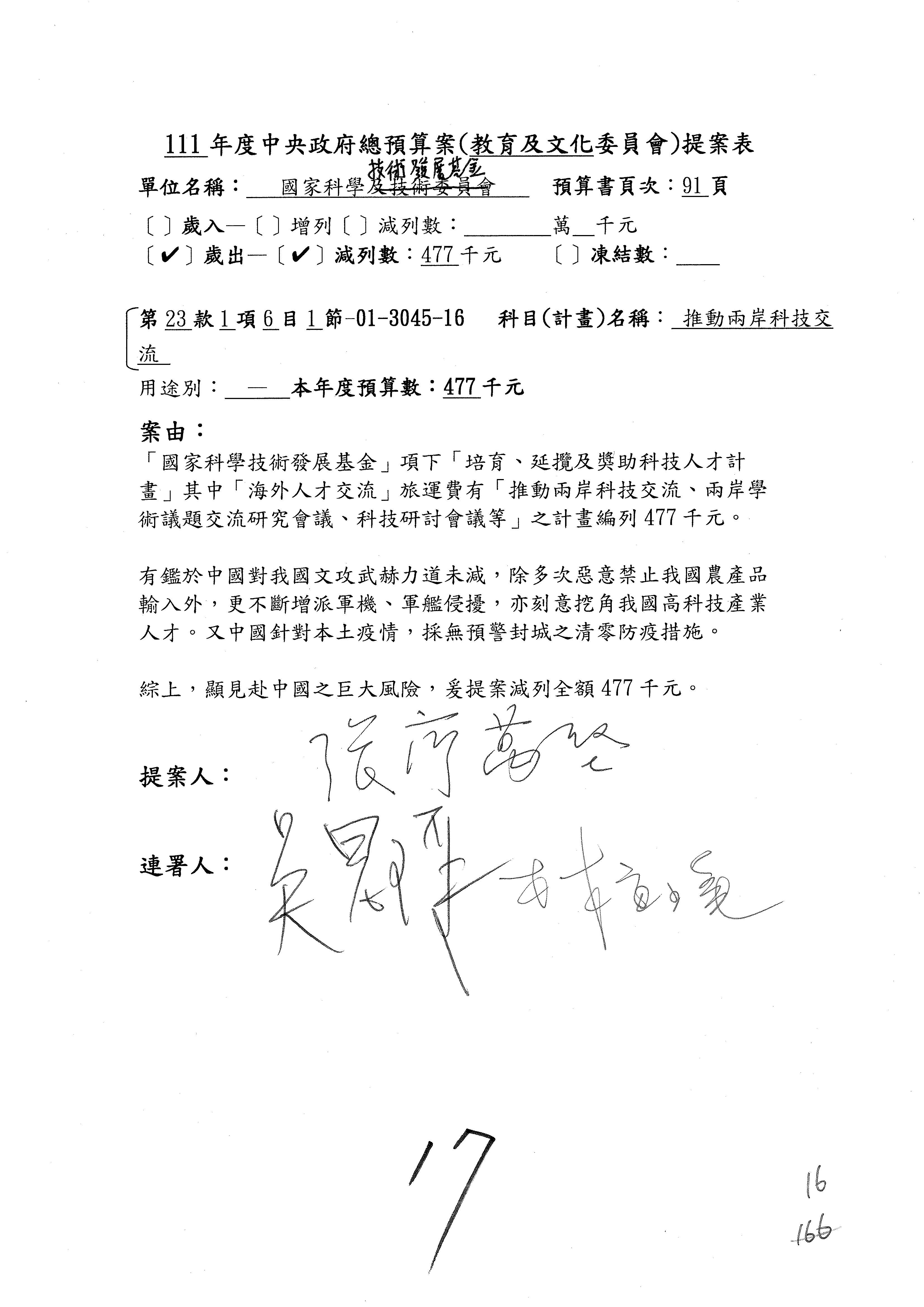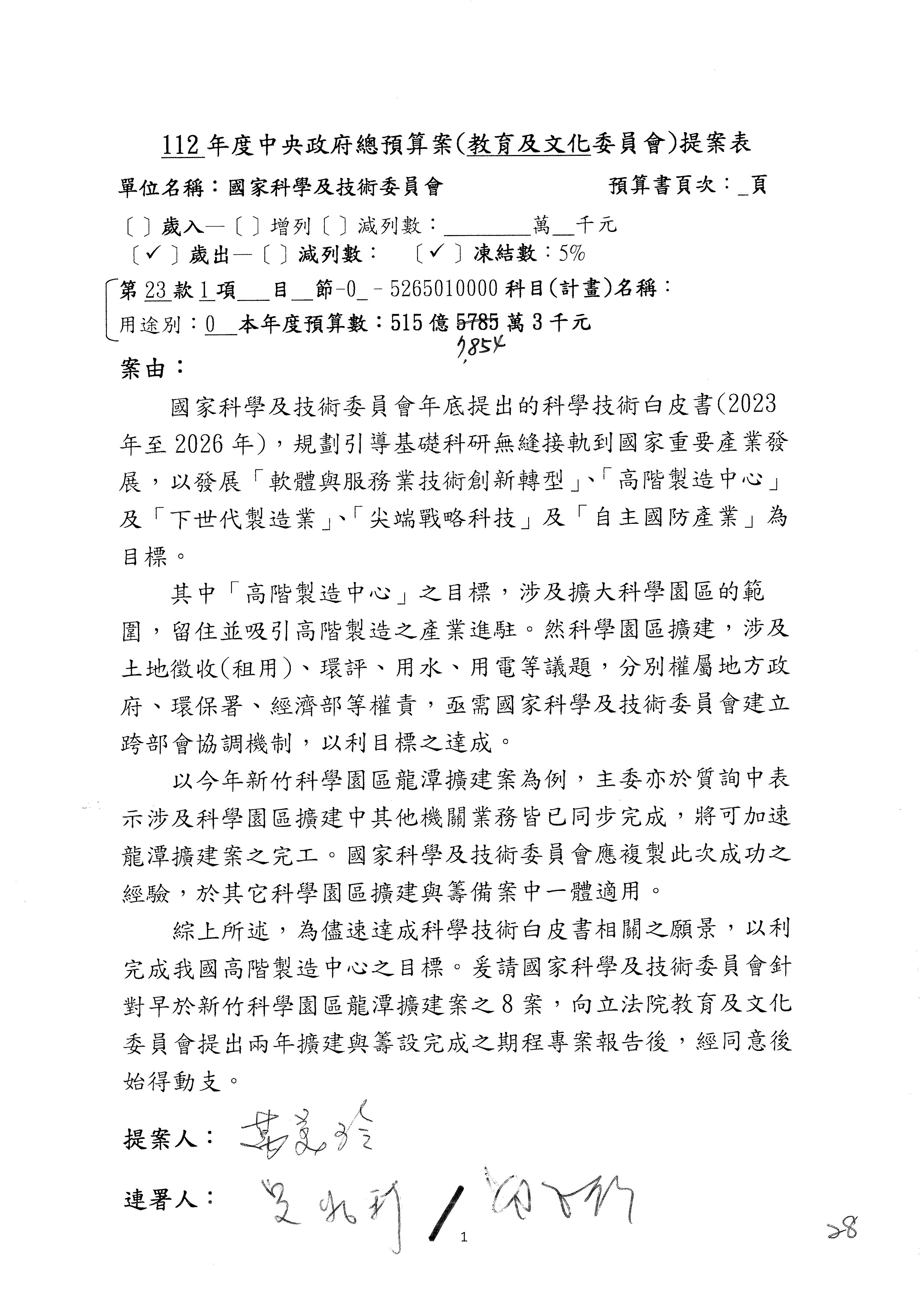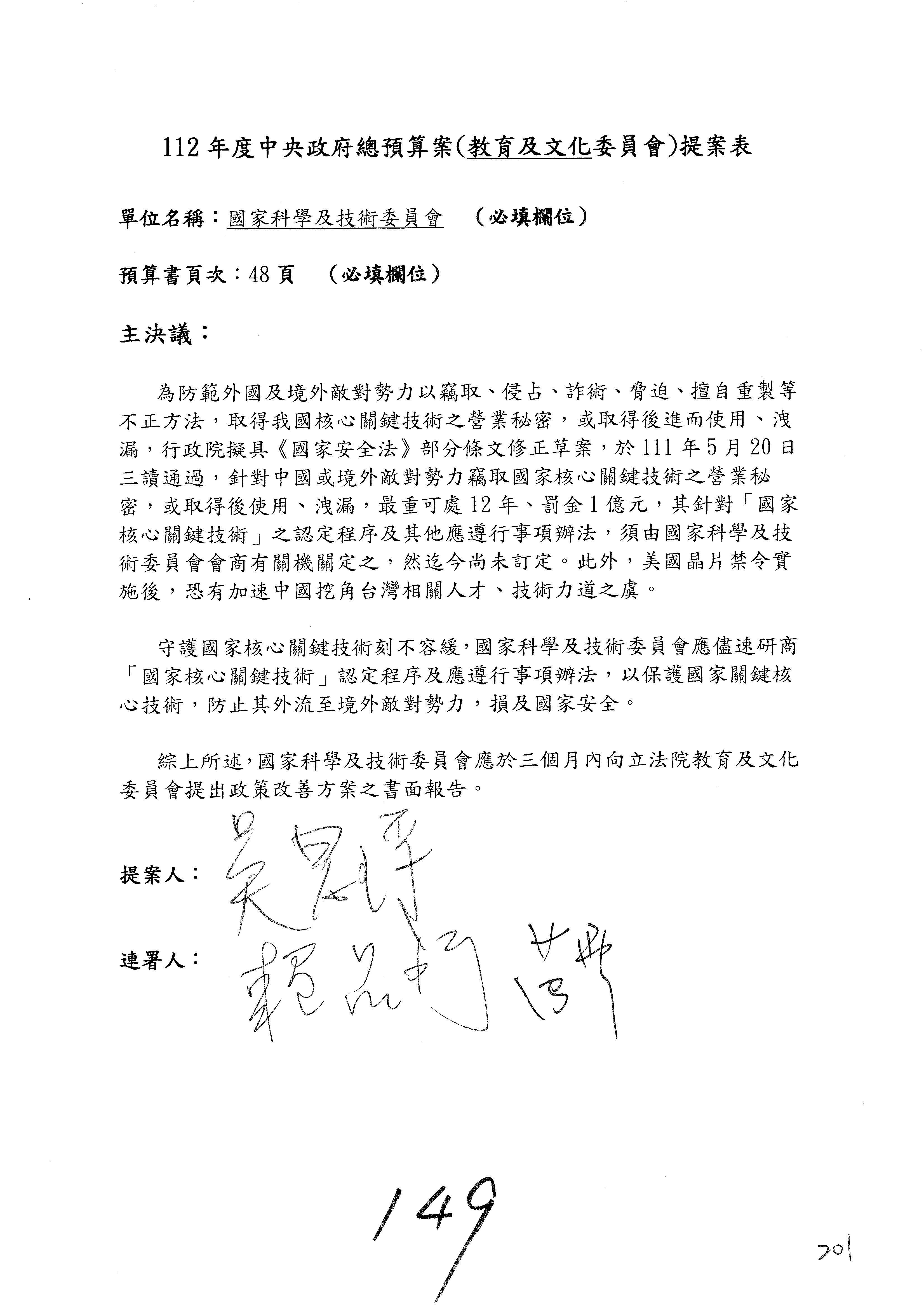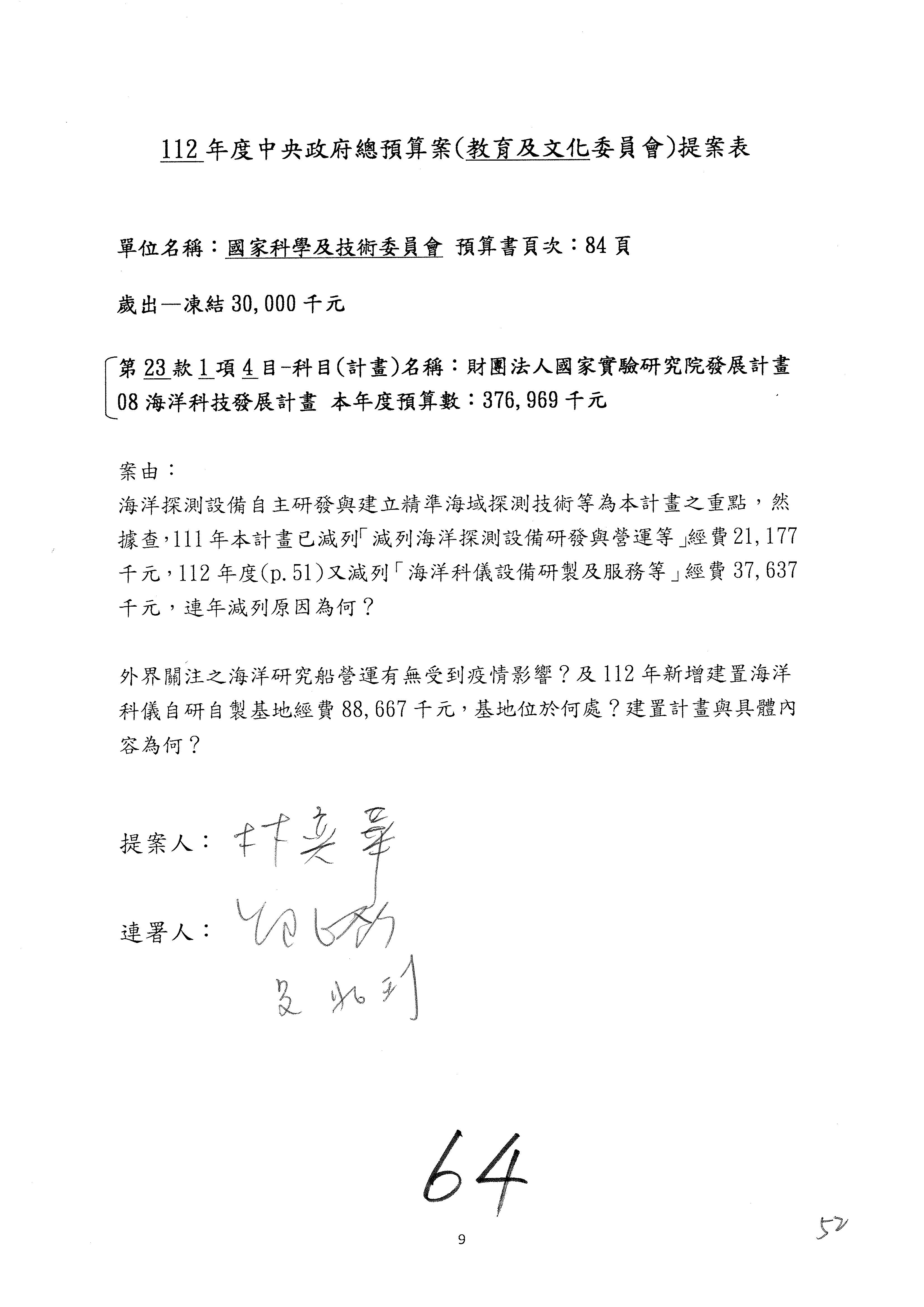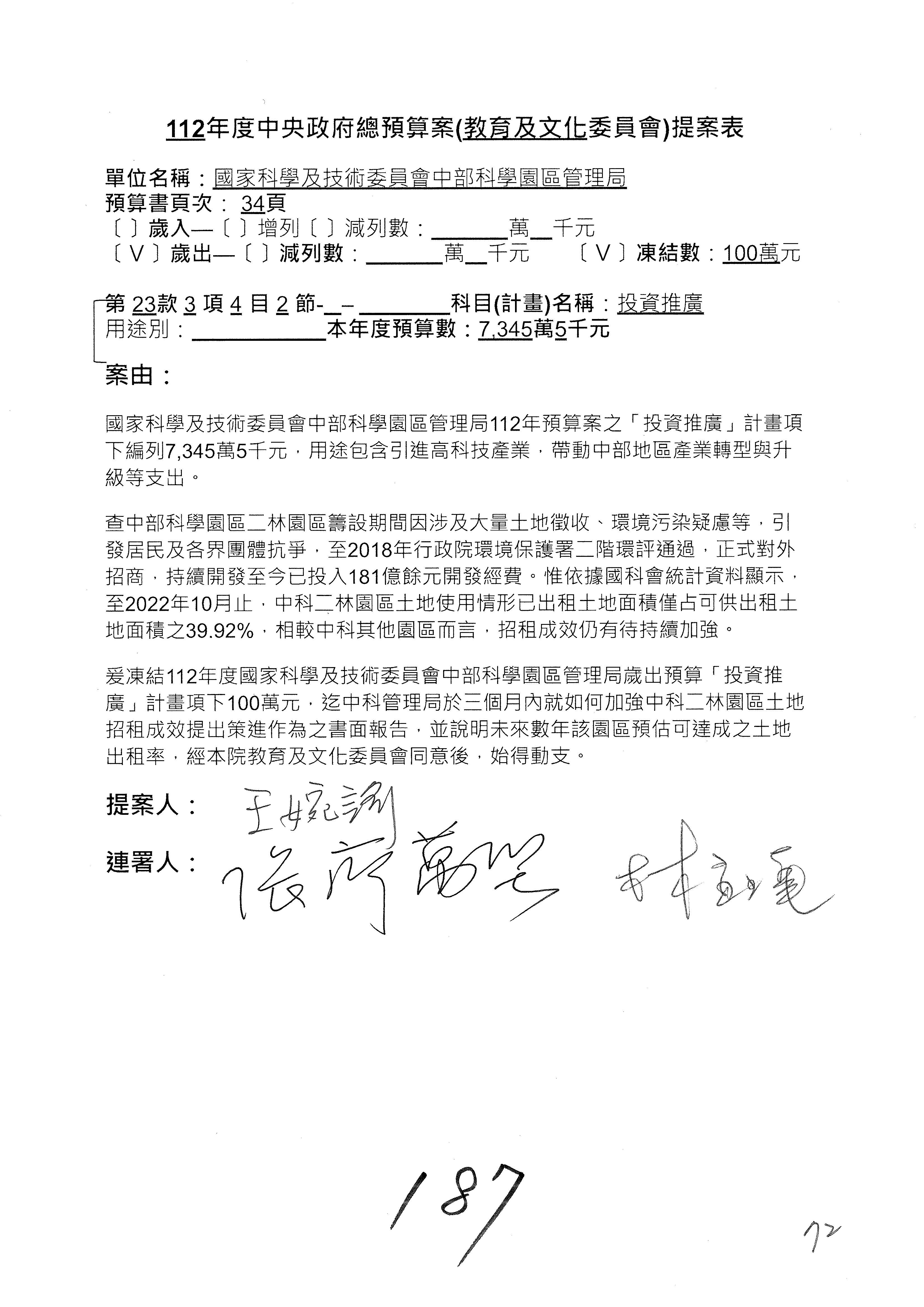 第8案是關於國際科技合作,這是跟晶片有關,臺灣晶片現在是國際上被討論的一個部分,原本這裡是編列8億7,490萬2,000元。在國際晶片戰爭當中,美日等國都運用不同的政策工具,希望削弱臺灣半導體的能量,所以希望國科會跟相關駐外科技組,對於這個部分能夠更敏銳,然後能有一些更有效的因應,所以針對112年度「推動整體科技發展計畫─國際科技合作」,希望能夠減列5,000萬元並凍結1億元,希望國科會就台積電前往美日設廠對臺灣半導體的影響做一個具體的說明跟評估,然後再予以動用。以上。謝謝。
