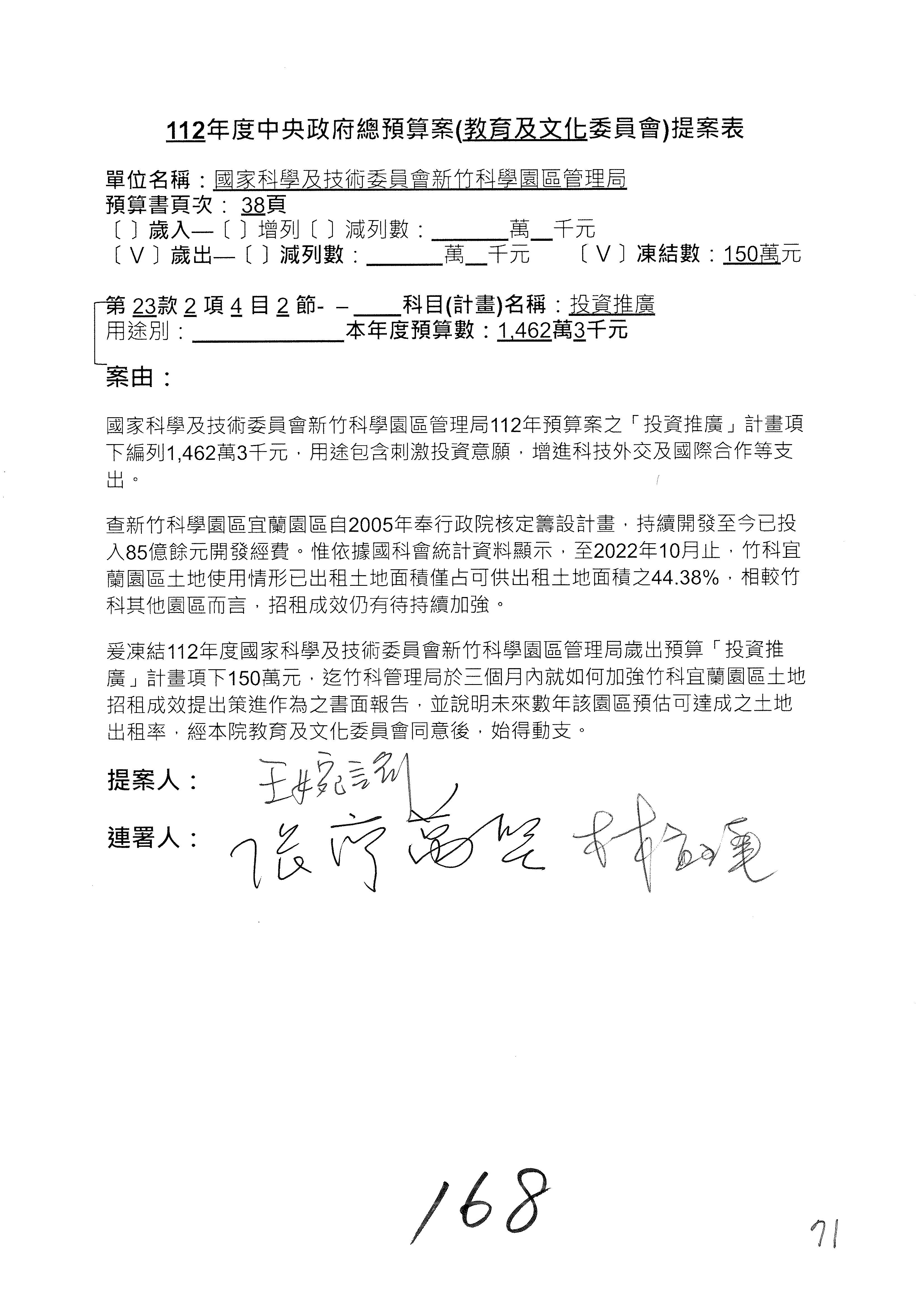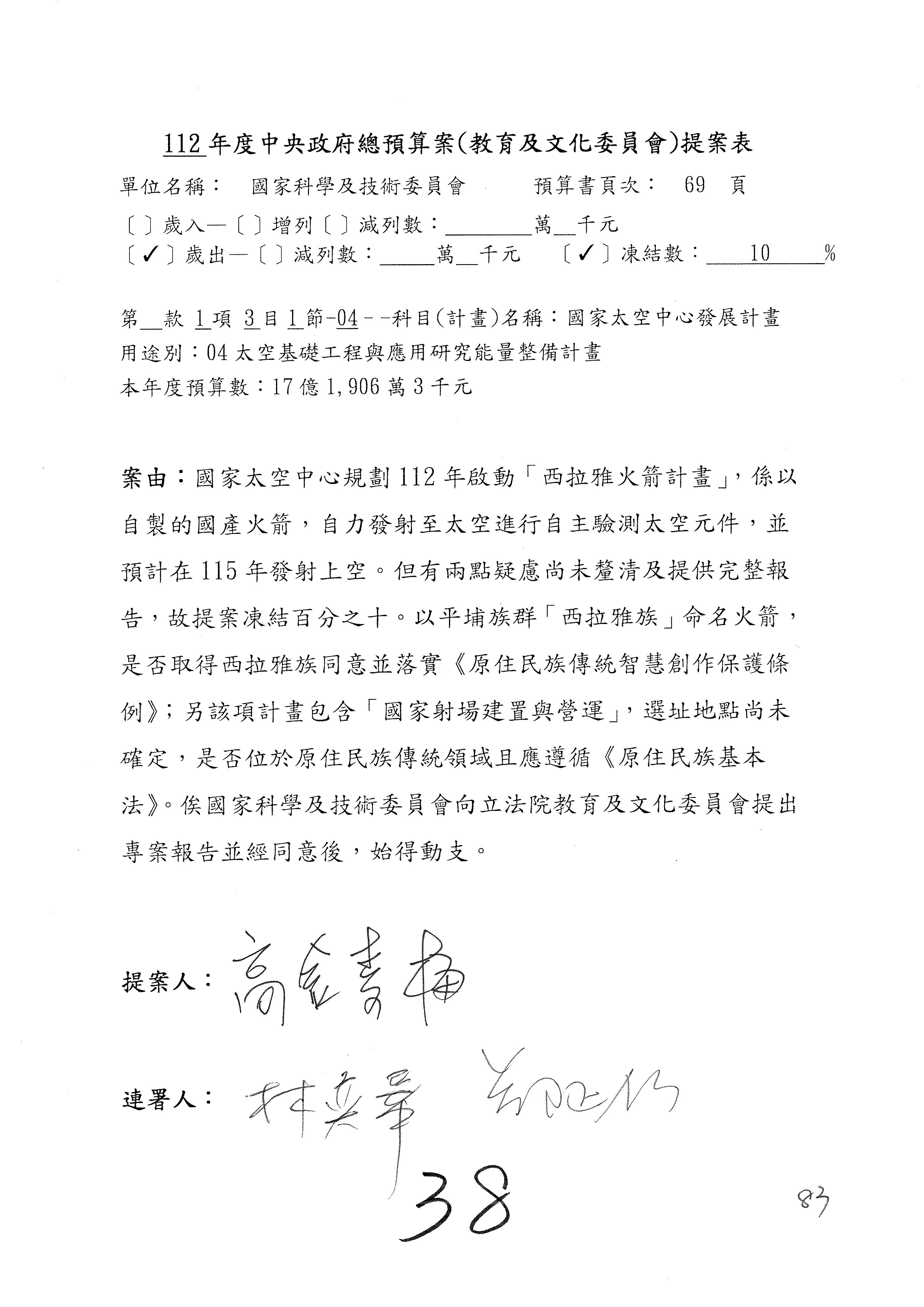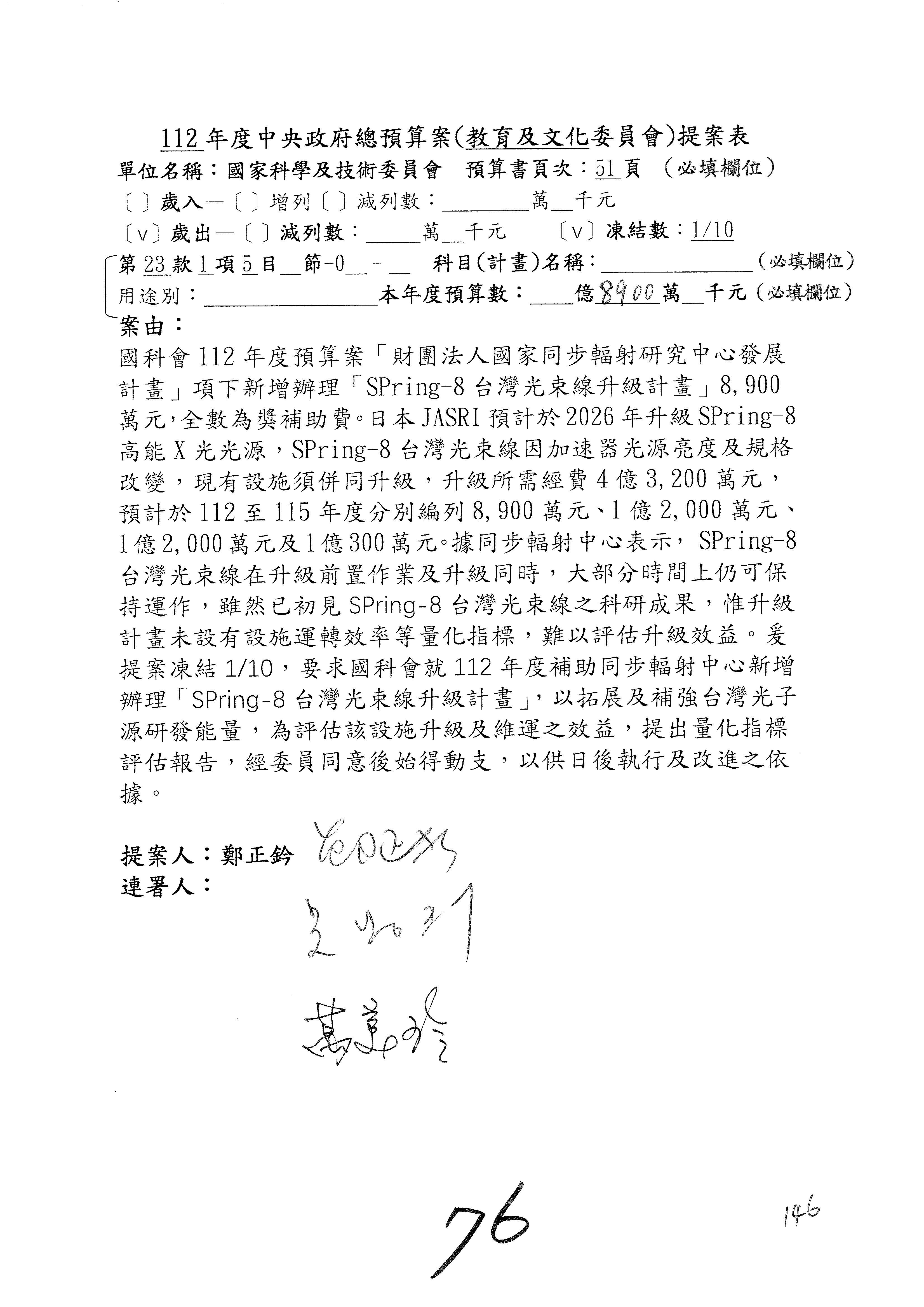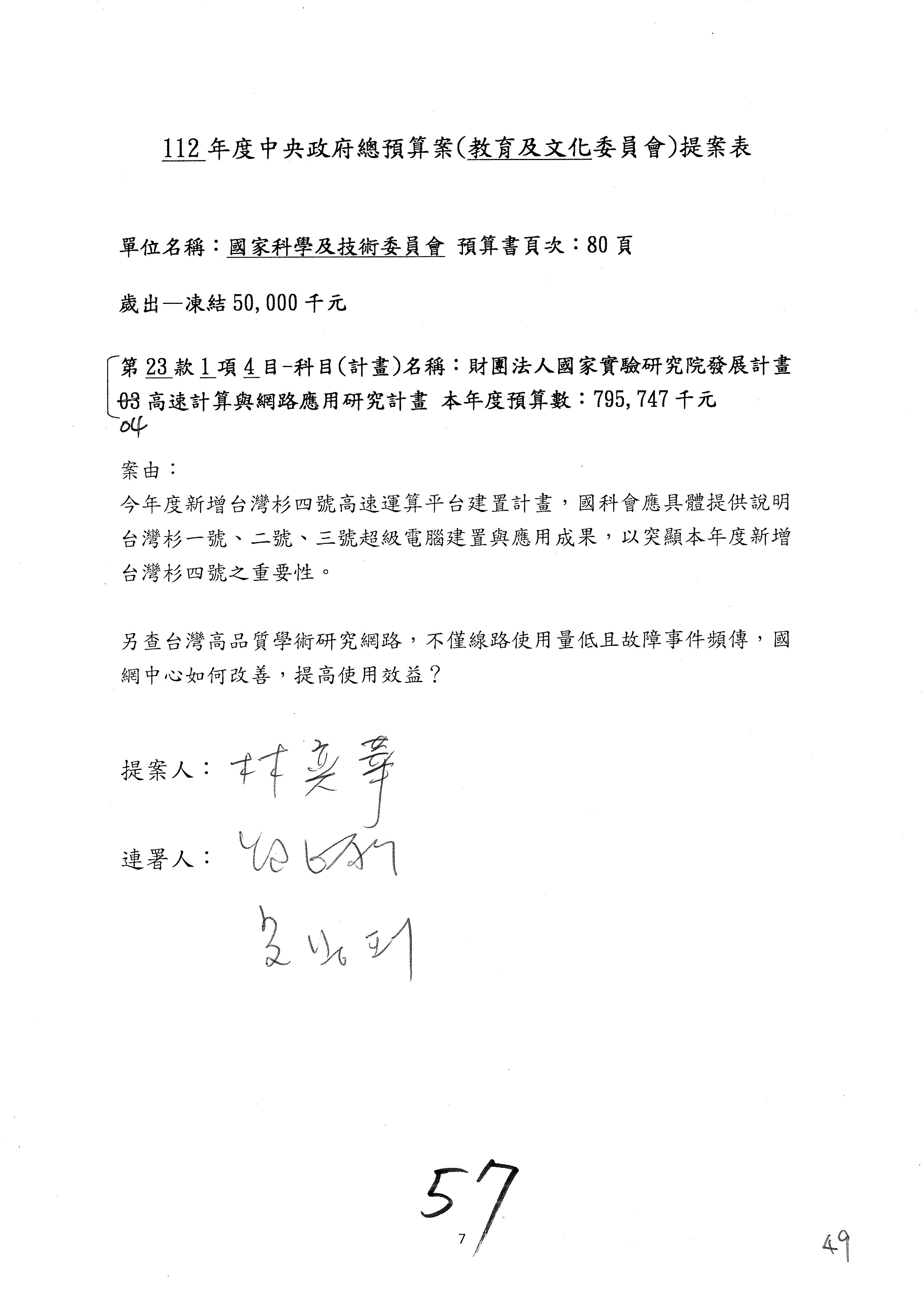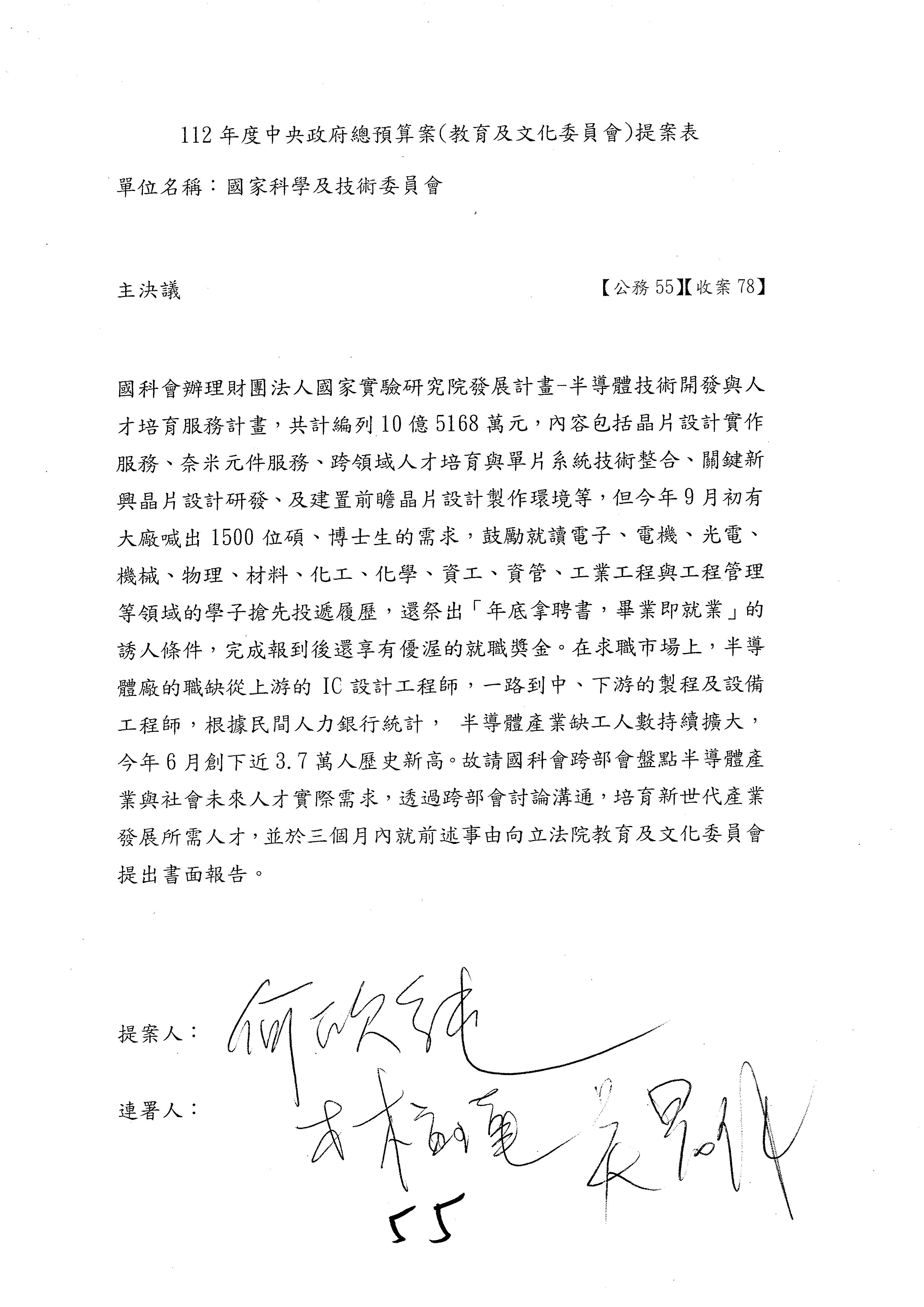 第8案是關於國際科技合作,這是跟晶片有關,臺灣晶片現在是國際上被討論的一個部分,原本這裡是編列8億7,490萬2,000元。在國際晶片戰爭當中,美日等國都運用不同的政策工具,希望削弱臺灣半導體的能量,所以希望國科會跟相關駐外科技組,對於這個部分能夠更敏銳,然後能有一些更有效的因應,所以針對112年度「推動整體科技發展計畫─國際科技合作」,希望能夠減列5,000萬元並凍結1億元,希望國科會就台積電前往美日設廠對臺灣半導體的影響做一個具體的說明跟評估,然後再予以動用。以上。謝謝。