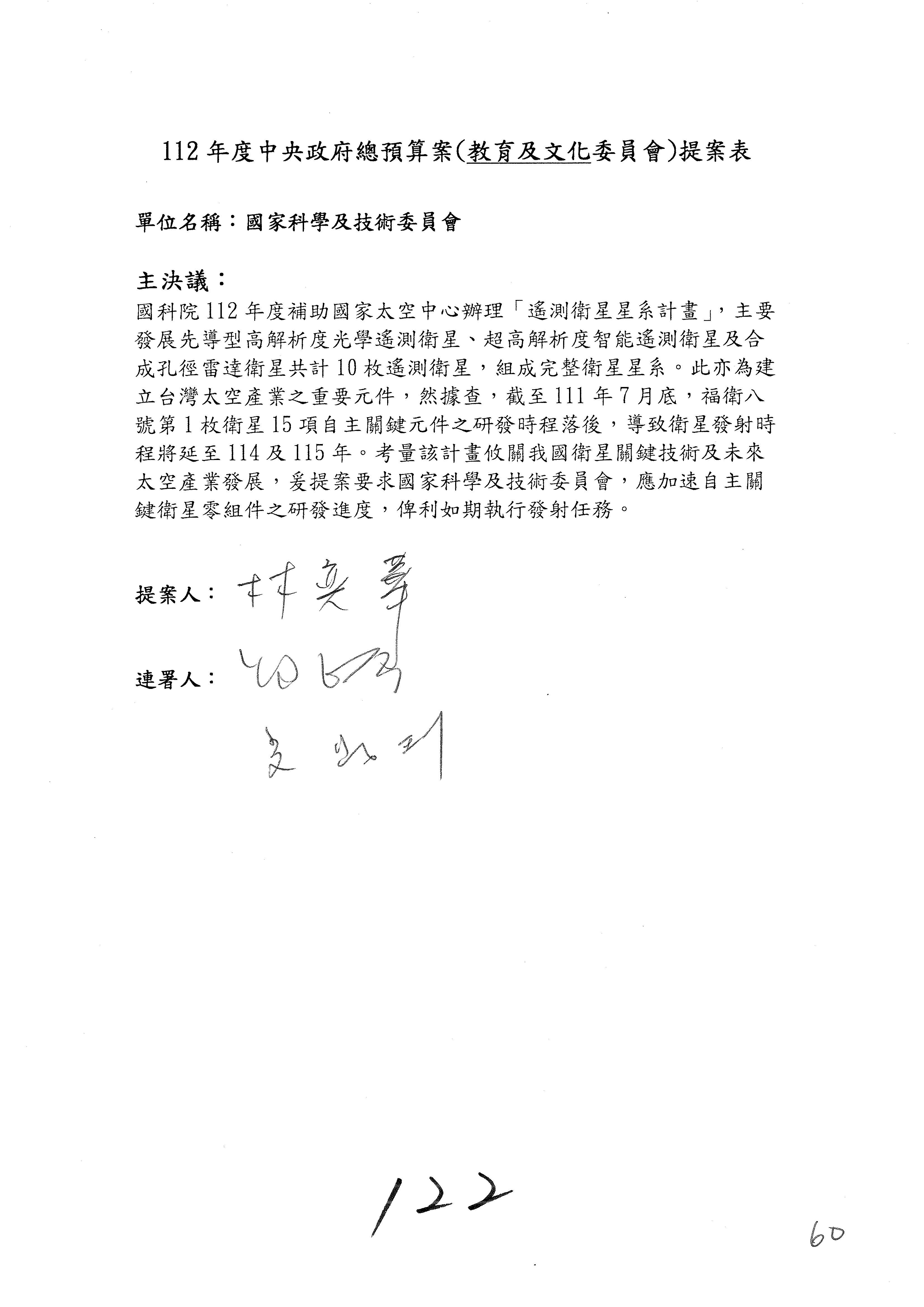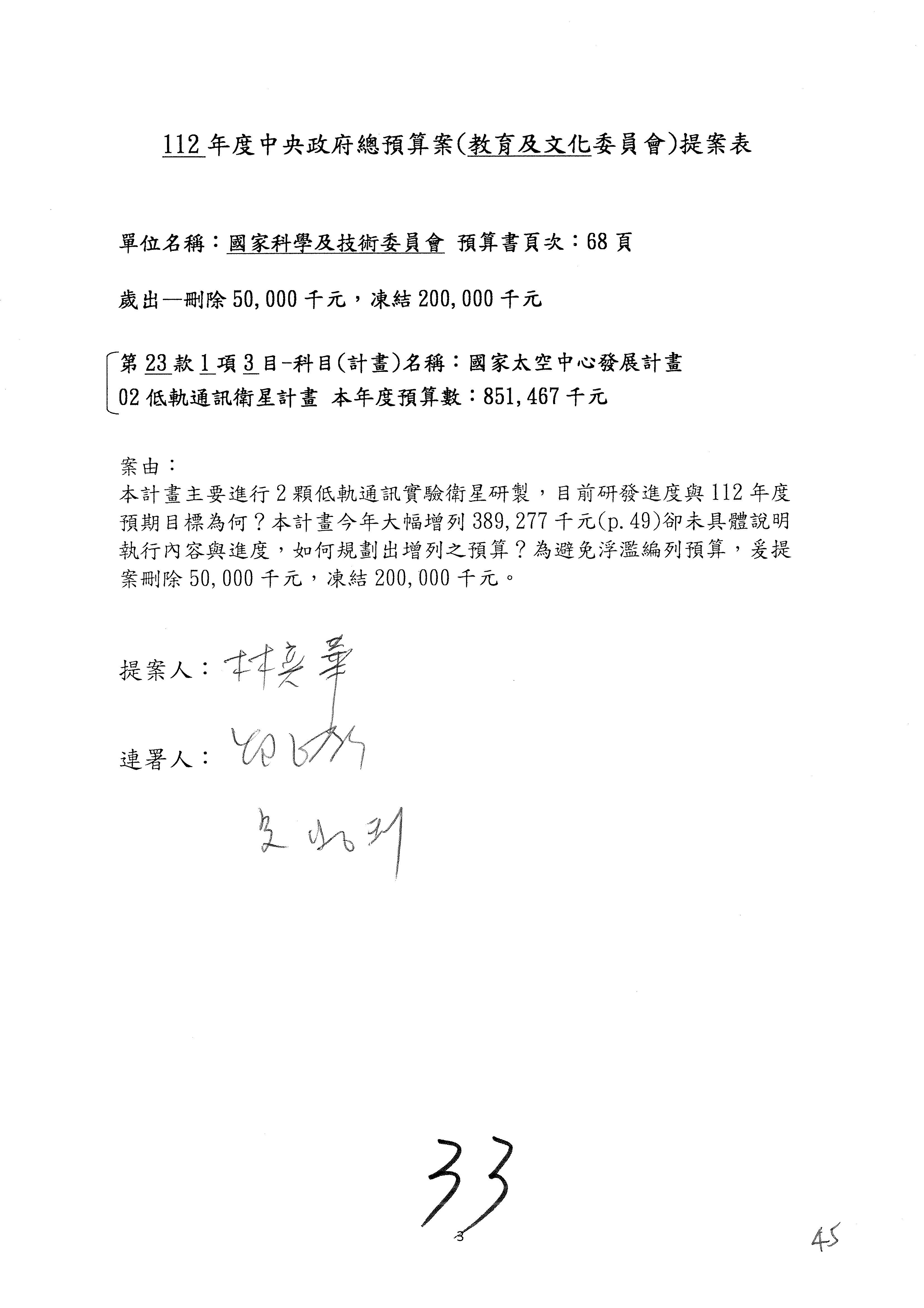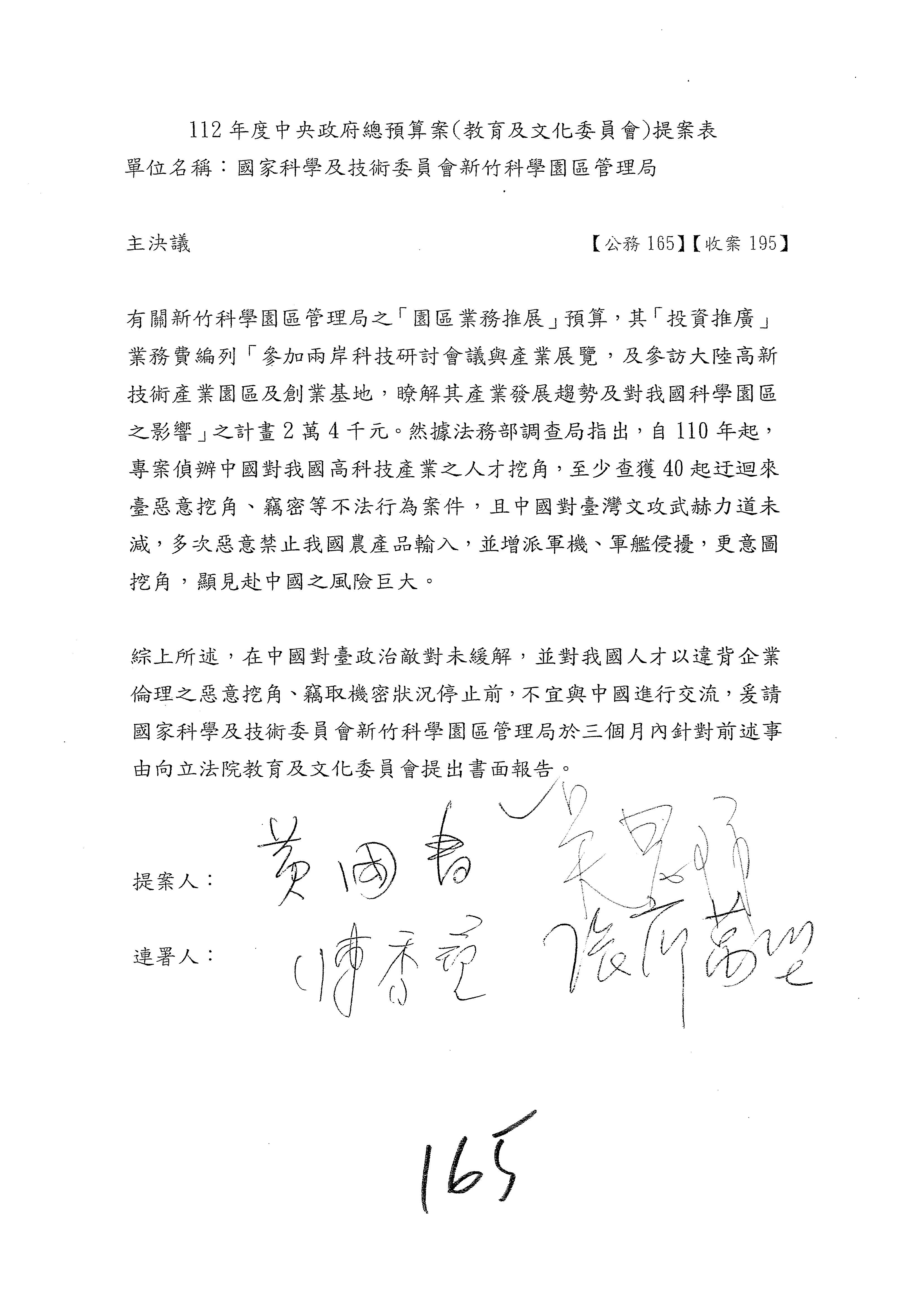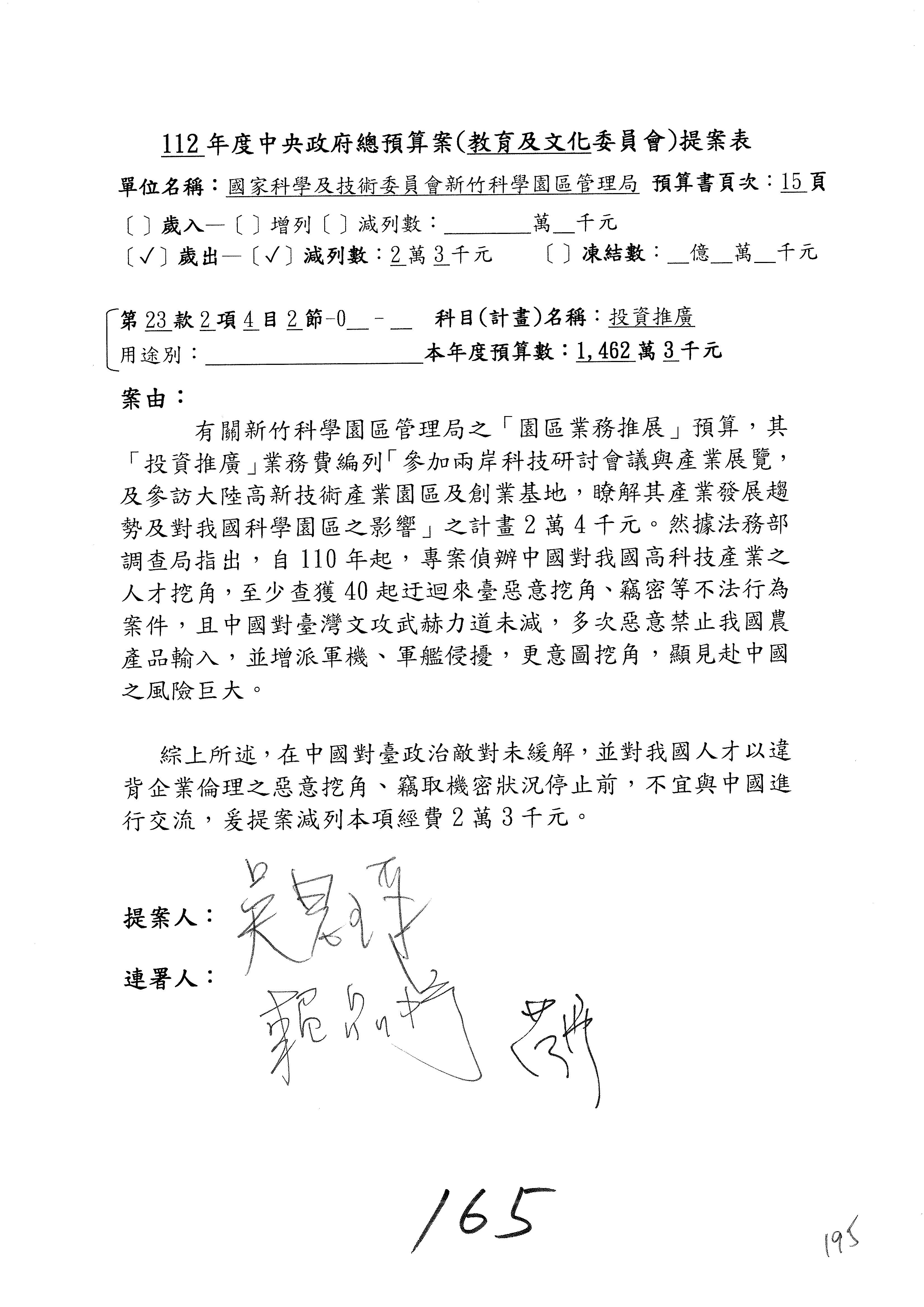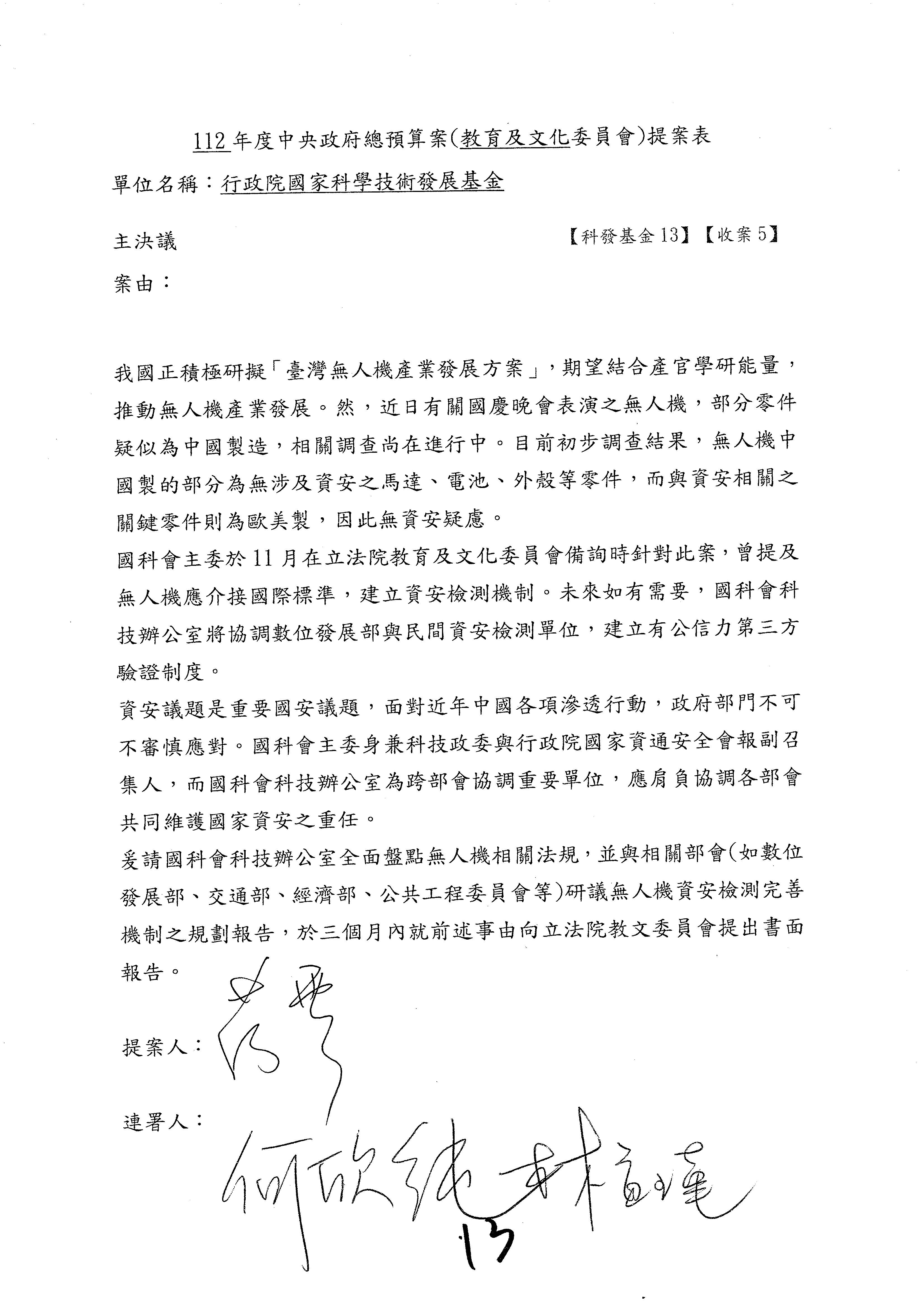 第8案是關於國際科技合作,這是跟晶片有關,臺灣晶片現在是國際上被討論的一個部分,原本這裡是編列8億7,490萬2,000元。在國際晶片戰爭當中,美日等國都運用不同的政策工具,希望削弱臺灣半導體的能量,所以希望國科會跟相關駐外科技組,對於這個部分能夠更敏銳,然後能有一些更有效的因應,所以針對112年度「推動整體科技發展計畫─國際科技合作」,希望能夠減列5,000萬元並凍結1億元,希望國科會就台積電前往美日設廠對臺灣半導體的影響做一個具體的說明跟評估,然後再予以動用。以上。謝謝。