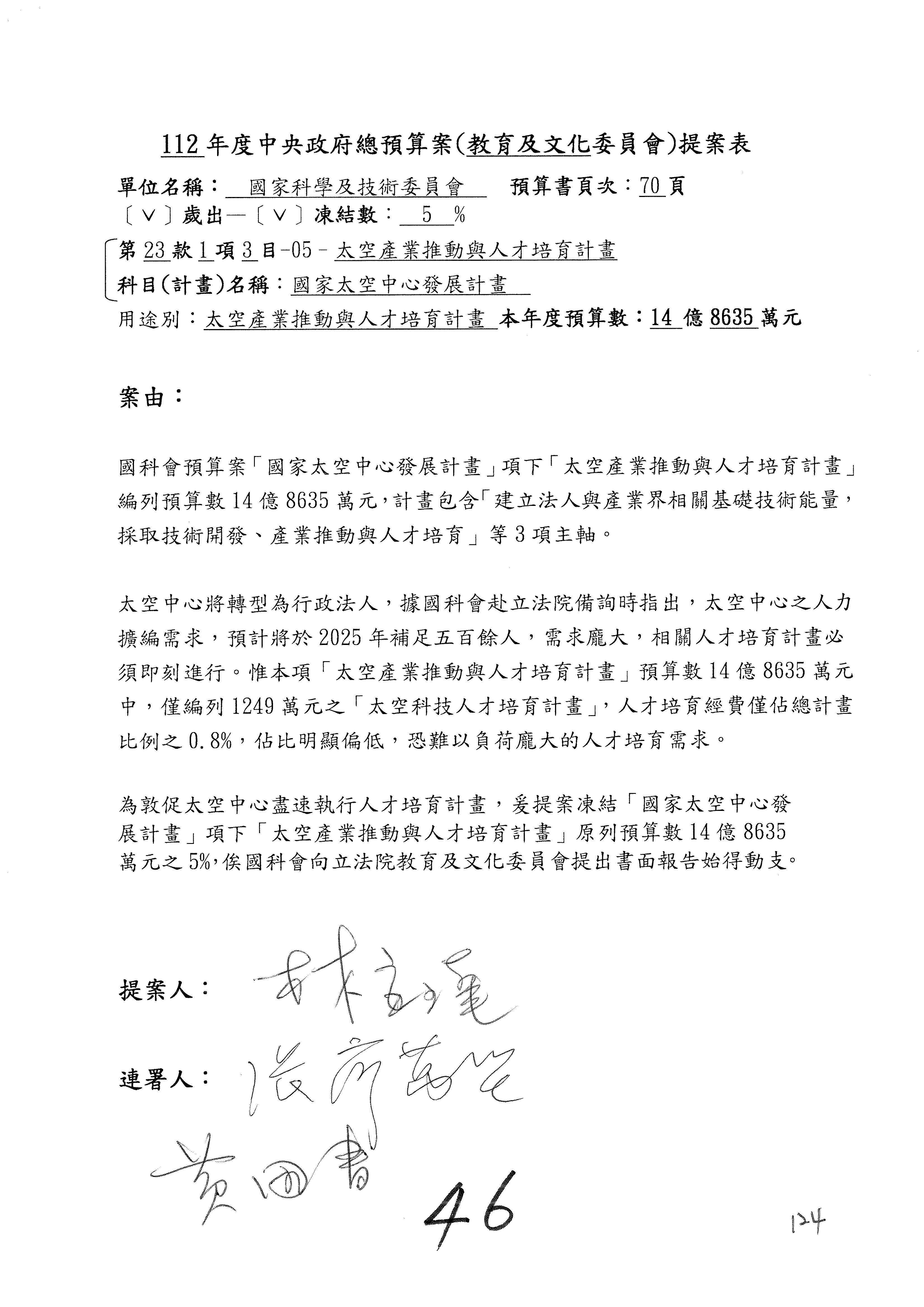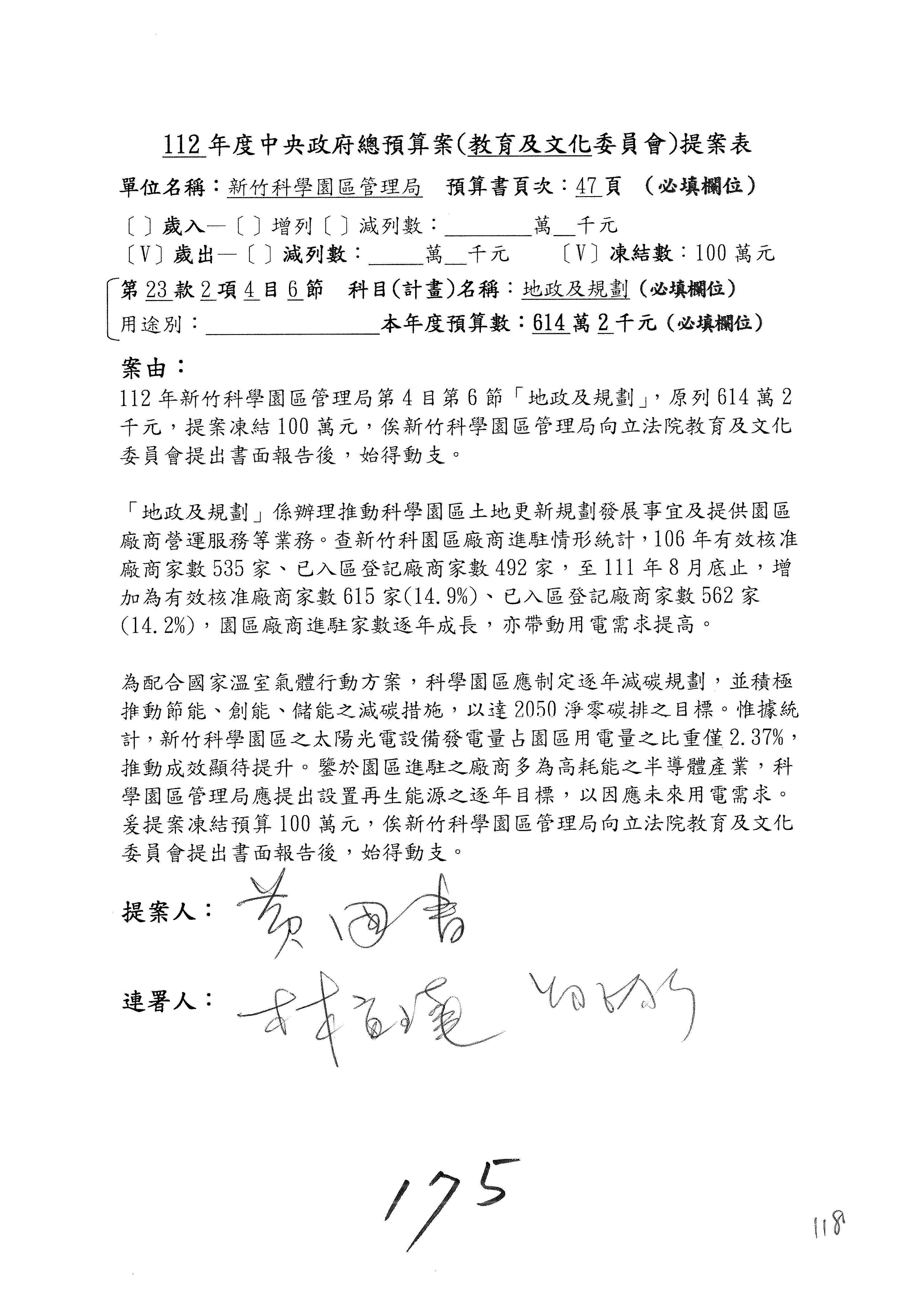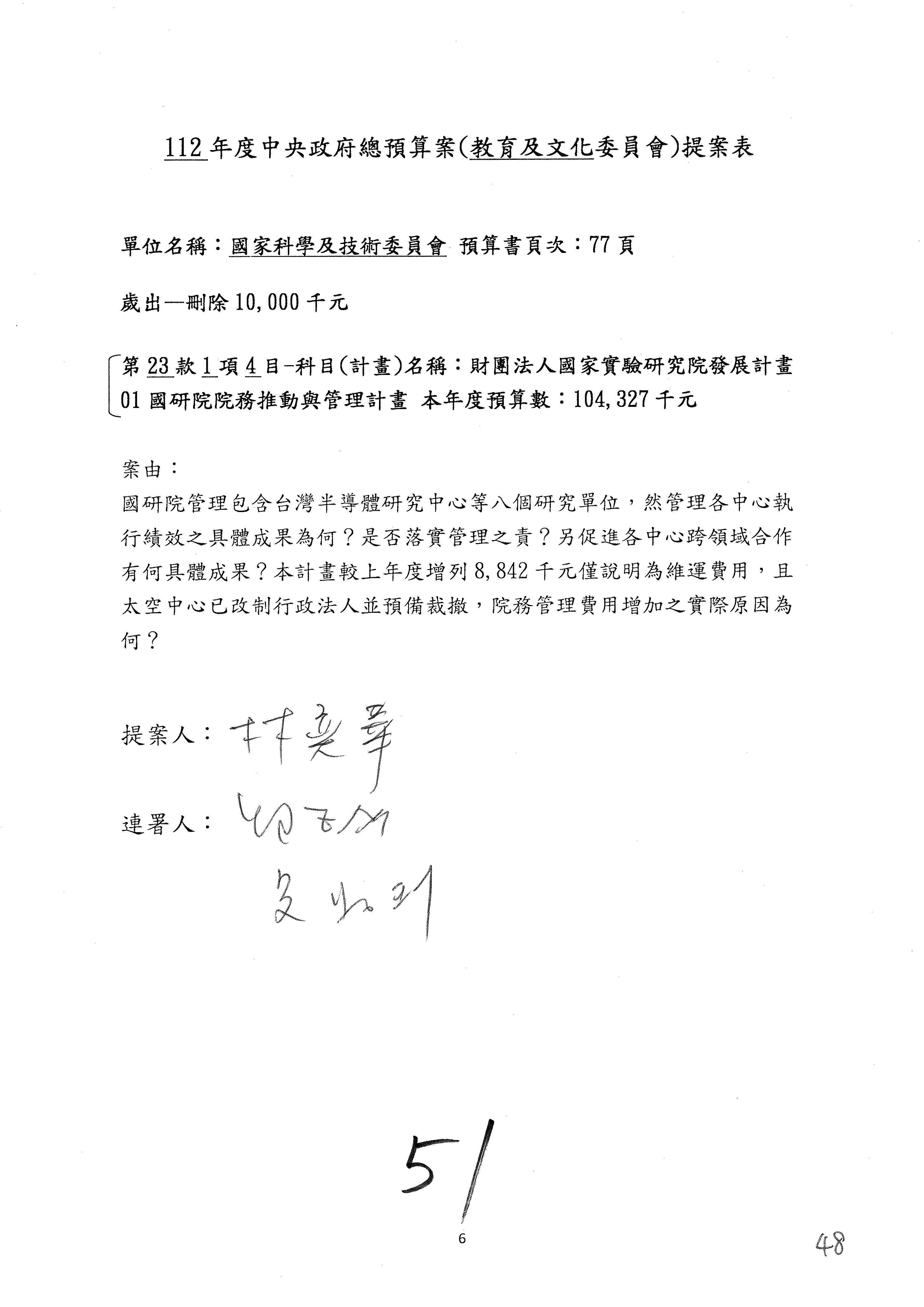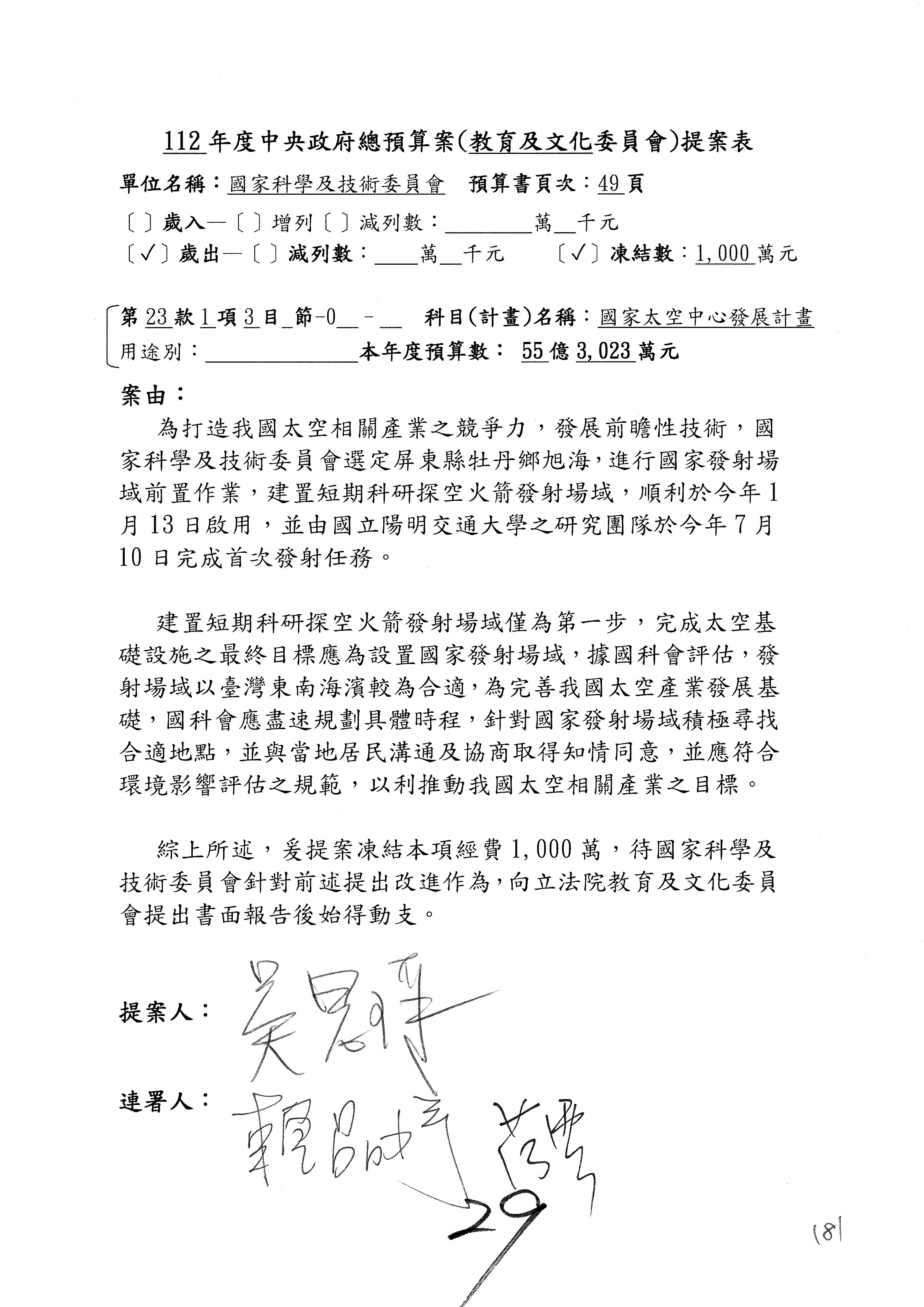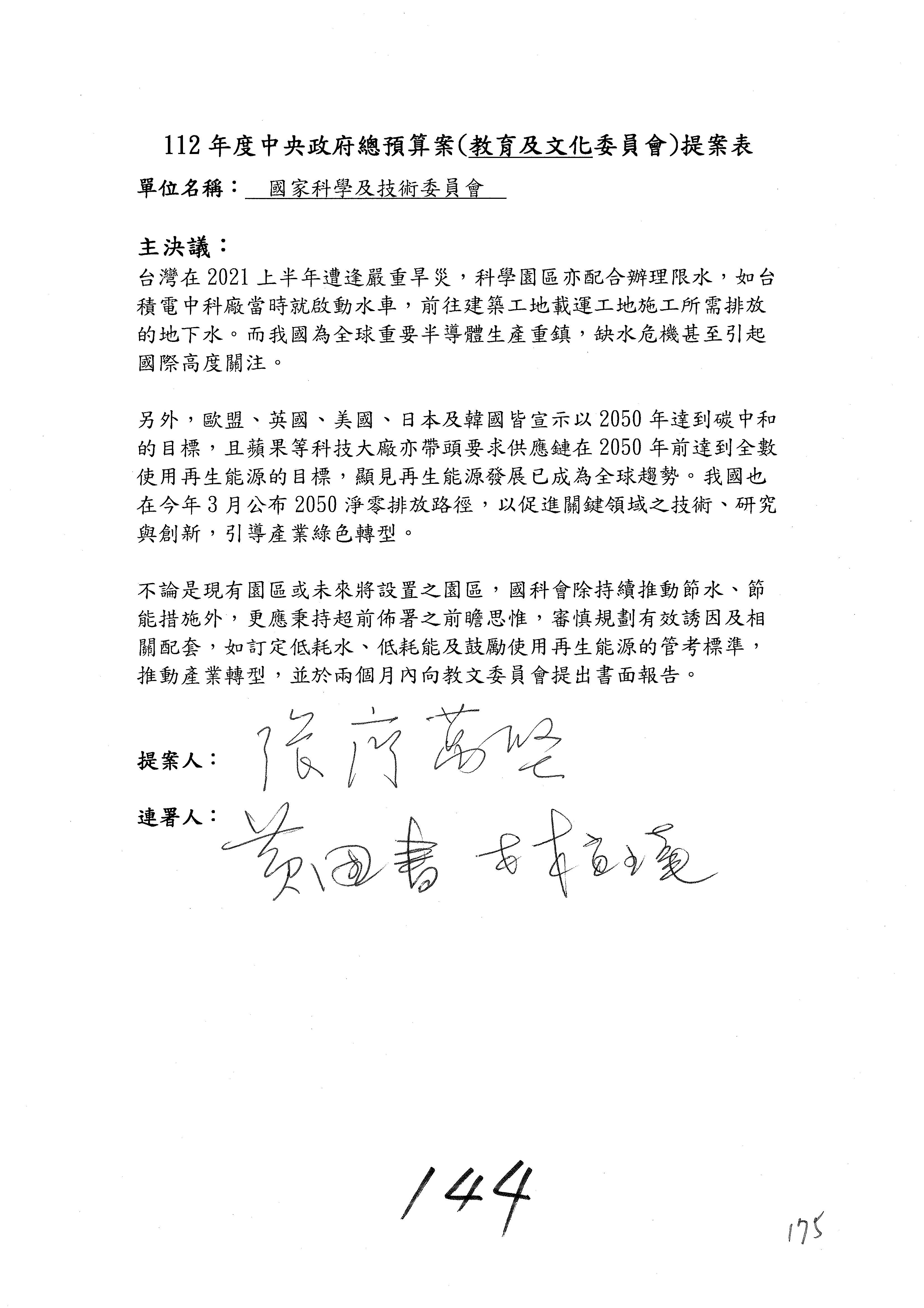 第8案是關於國際科技合作,這是跟晶片有關,臺灣晶片現在是國際上被討論的一個部分,原本這裡是編列8億7,490萬2,000元。在國際晶片戰爭當中,美日等國都運用不同的政策工具,希望削弱臺灣半導體的能量,所以希望國科會跟相關駐外科技組,對於這個部分能夠更敏銳,然後能有一些更有效的因應,所以針對112年度「推動整體科技發展計畫─國際科技合作」,希望能夠減列5,000萬元並凍結1億元,希望國科會就台積電前往美日設廠對臺灣半導體的影響做一個具體的說明跟評估,然後再予以動用。以上。謝謝。