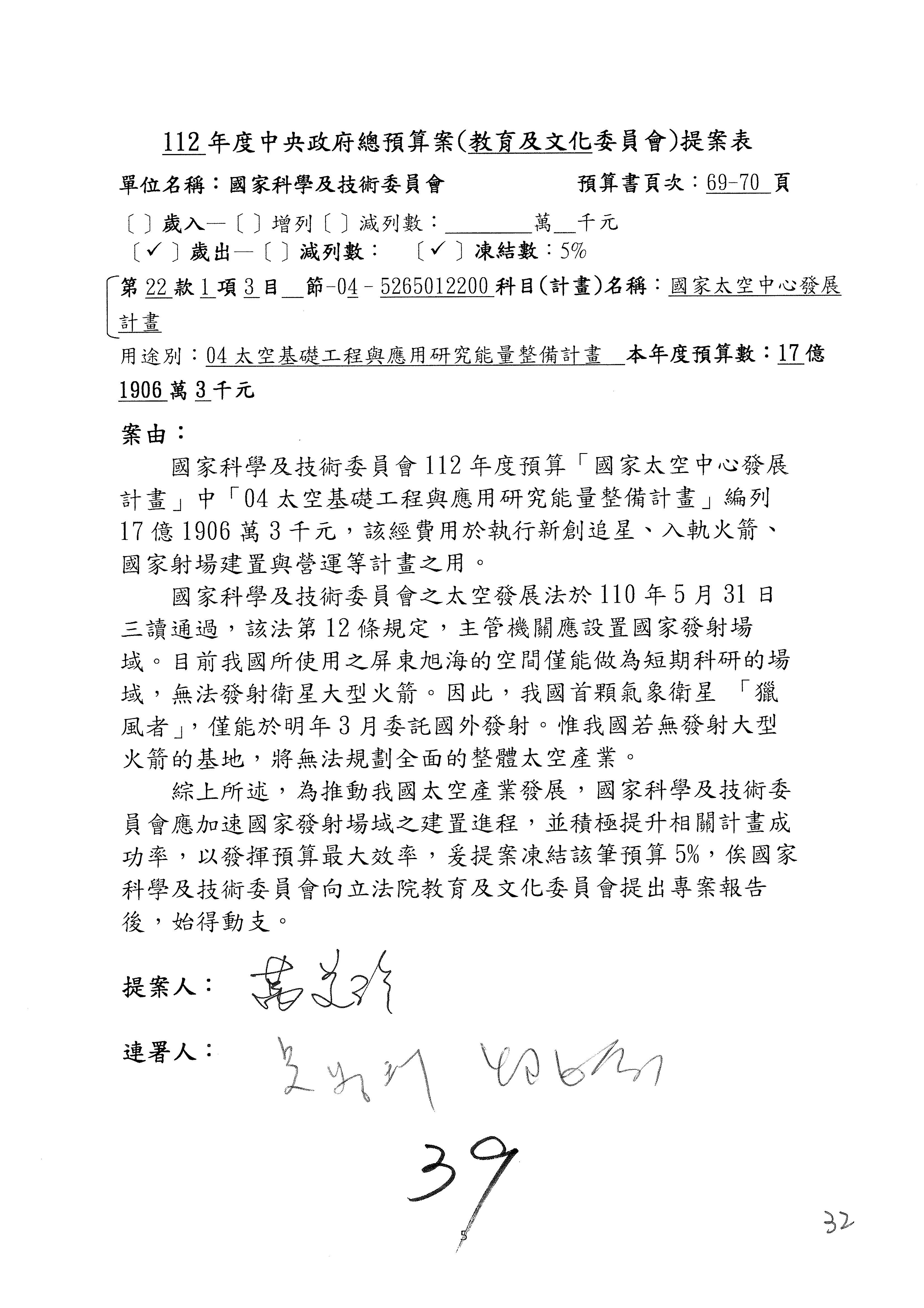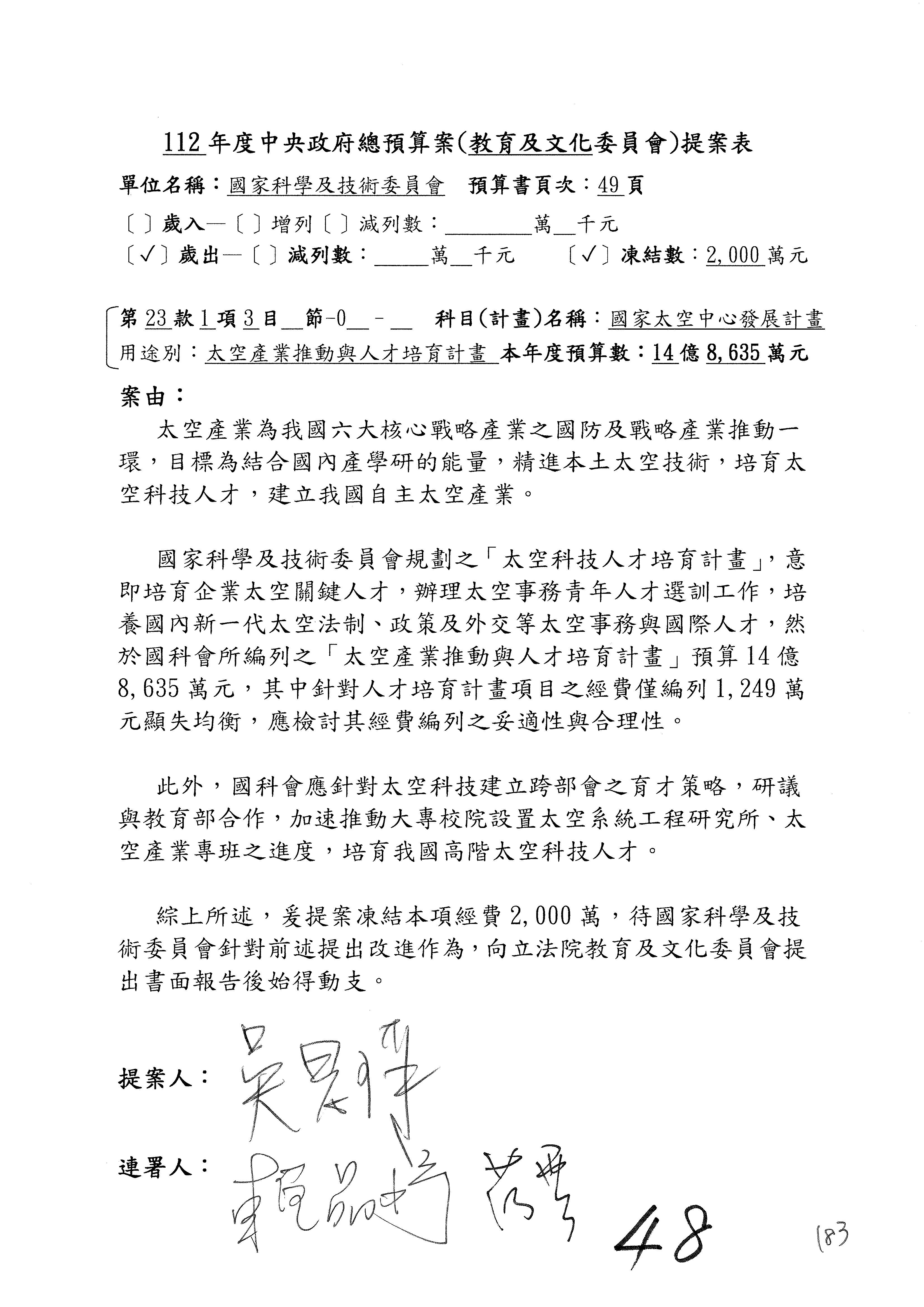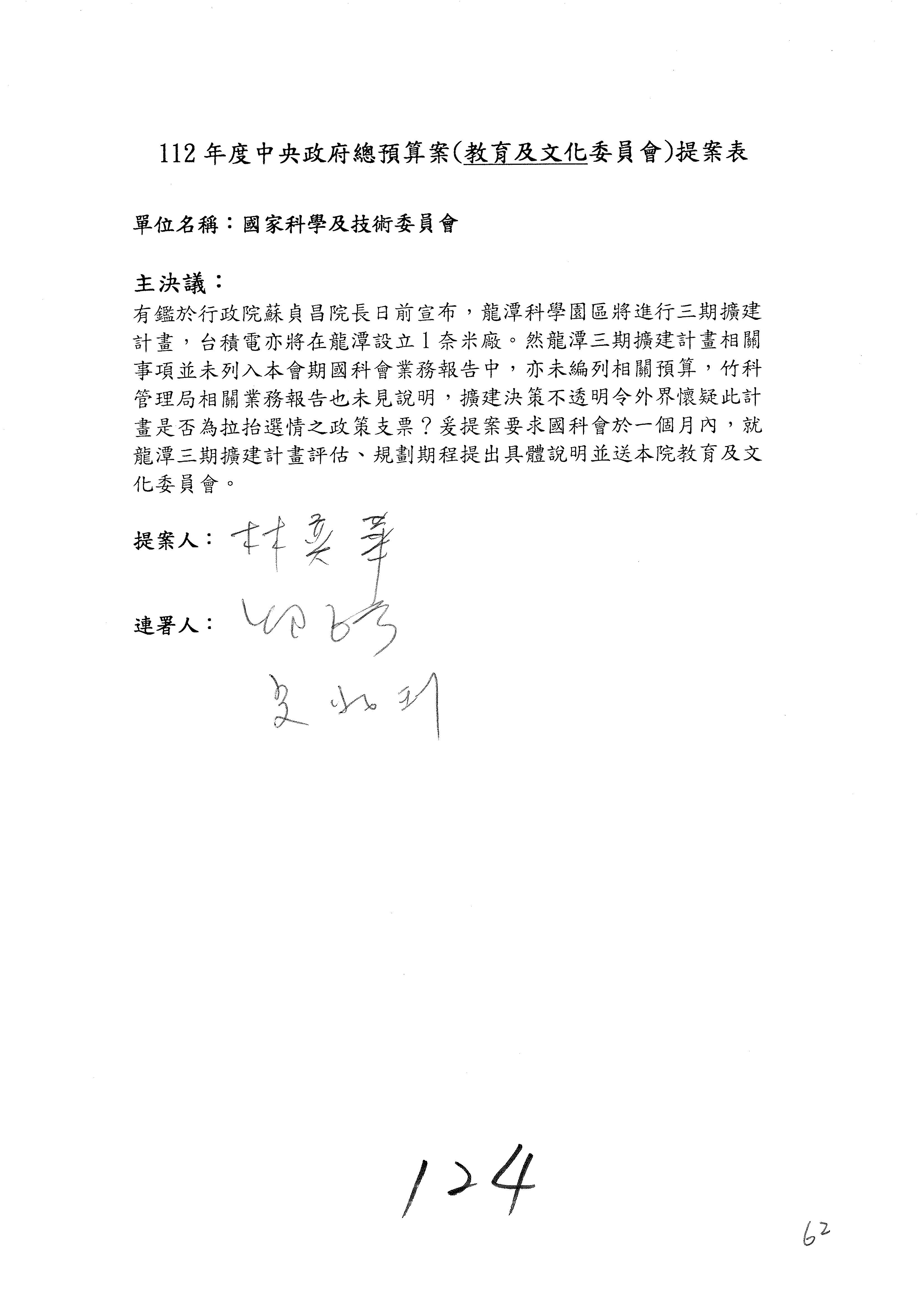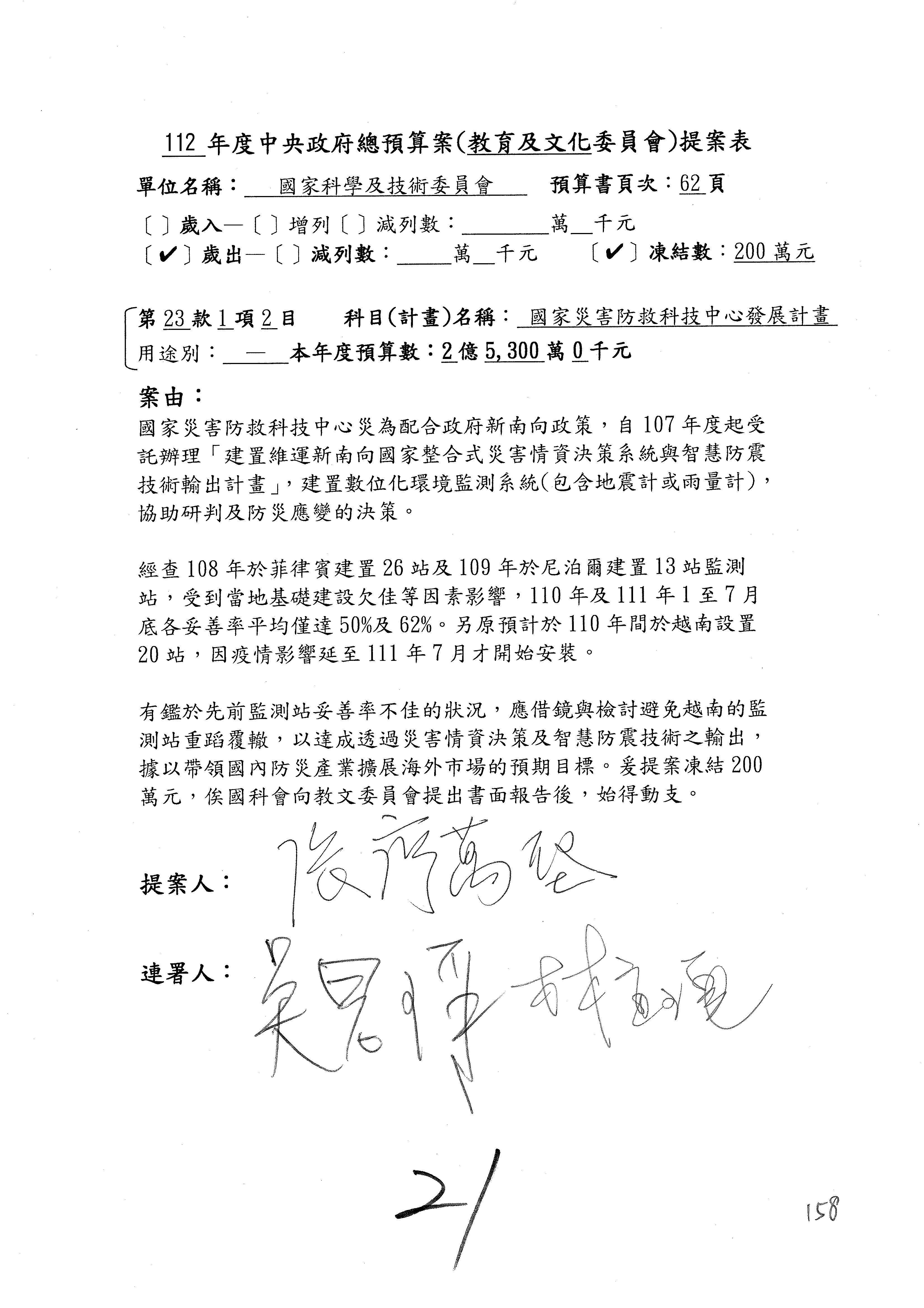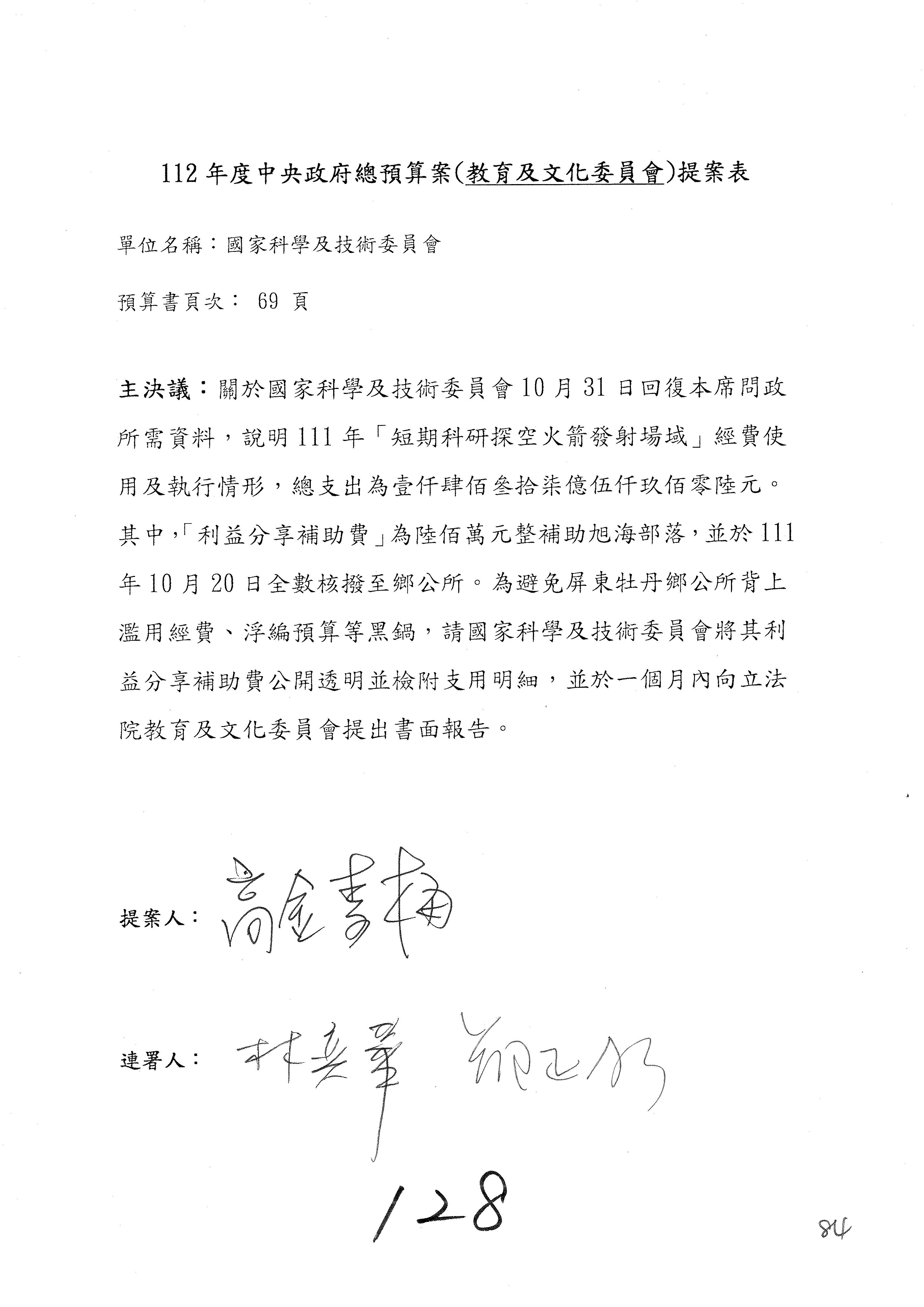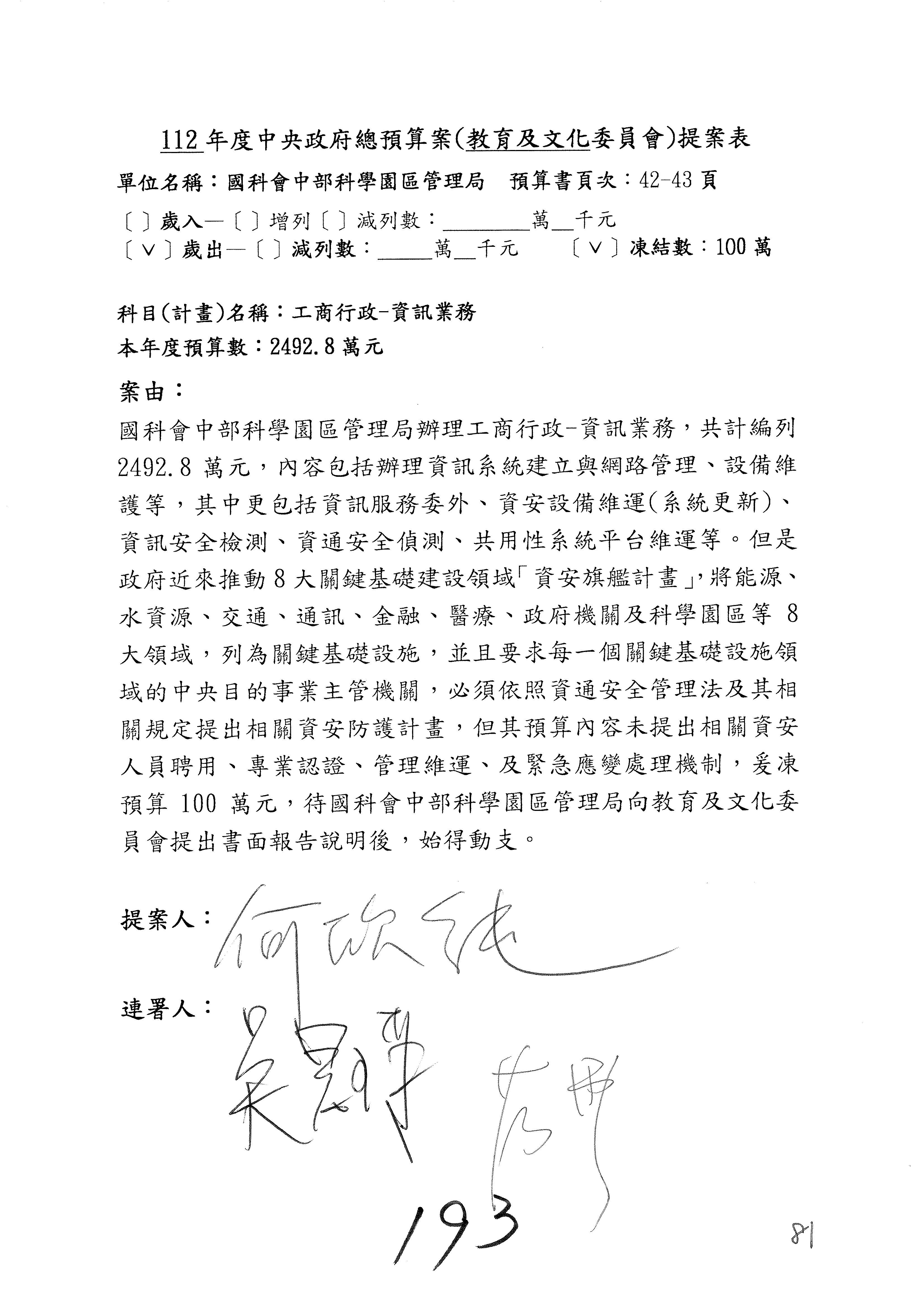 第8案是關於國際科技合作,這是跟晶片有關,臺灣晶片現在是國際上被討論的一個部分,原本這裡是編列8億7,490萬2,000元。在國際晶片戰爭當中,美日等國都運用不同的政策工具,希望削弱臺灣半導體的能量,所以希望國科會跟相關駐外科技組,對於這個部分能夠更敏銳,然後能有一些更有效的因應,所以針對112年度「推動整體科技發展計畫─國際科技合作」,希望能夠減列5,000萬元並凍結1億元,希望國科會就台積電前往美日設廠對臺灣半導體的影響做一個具體的說明跟評估,然後再予以動用。以上。謝謝。