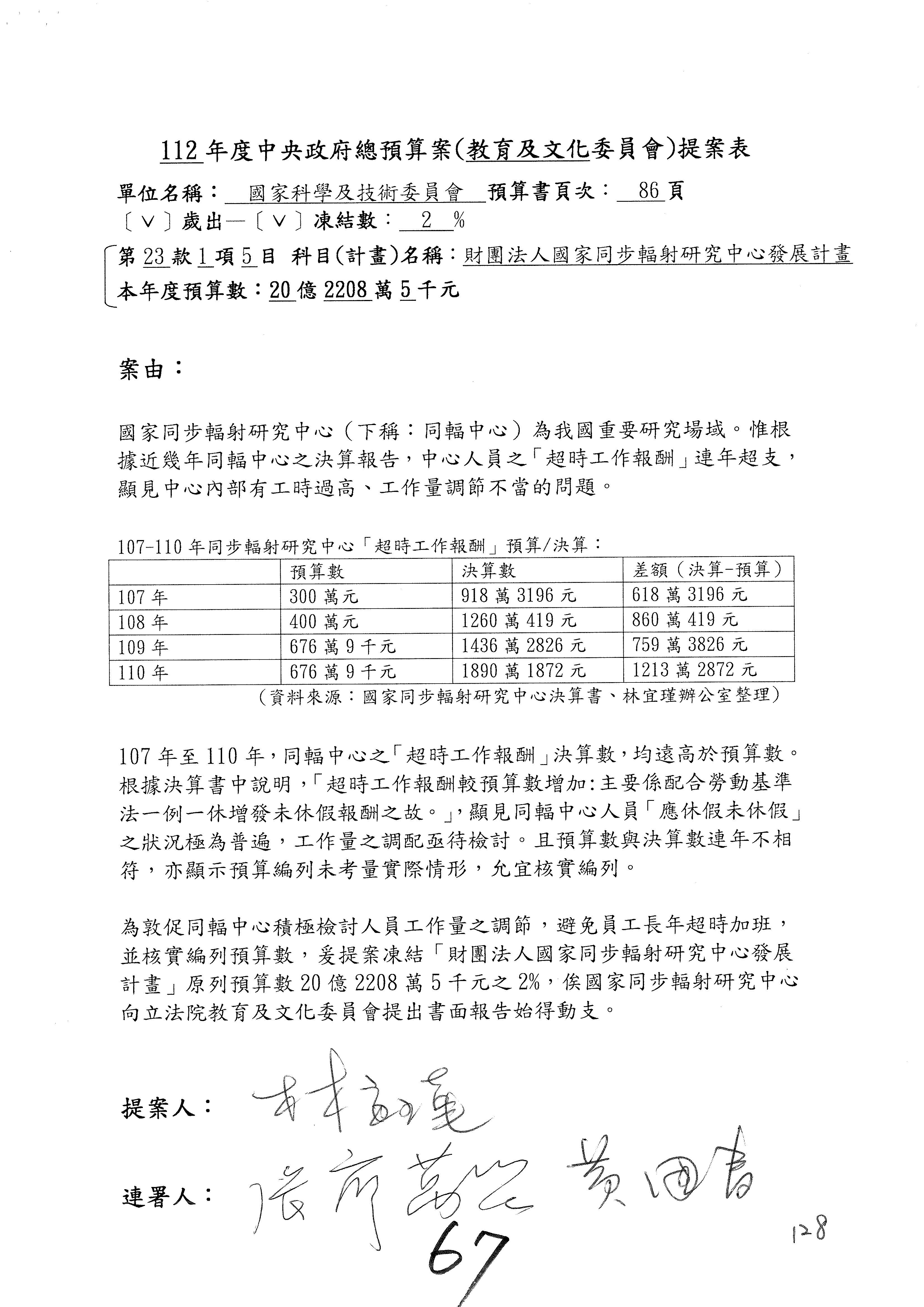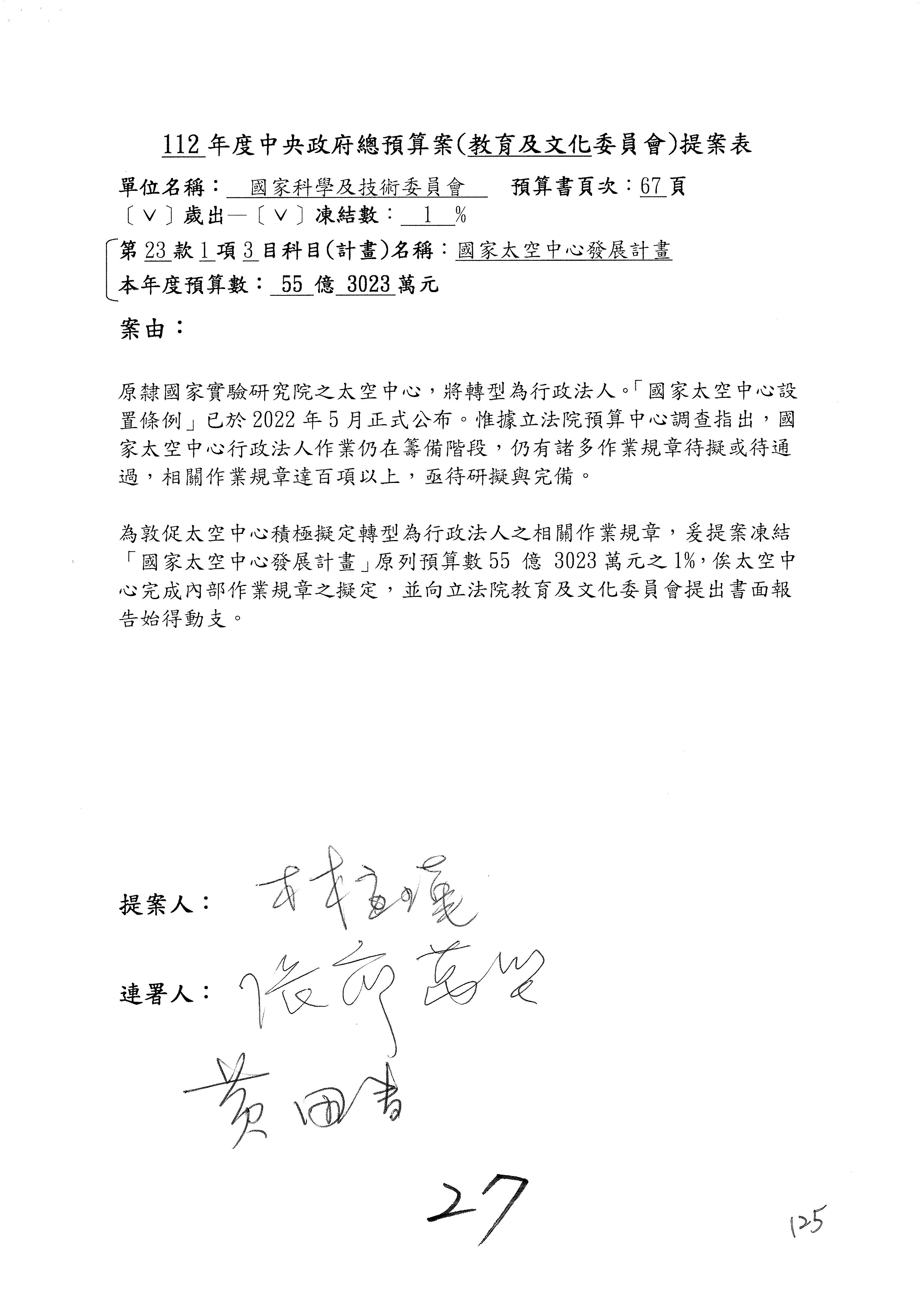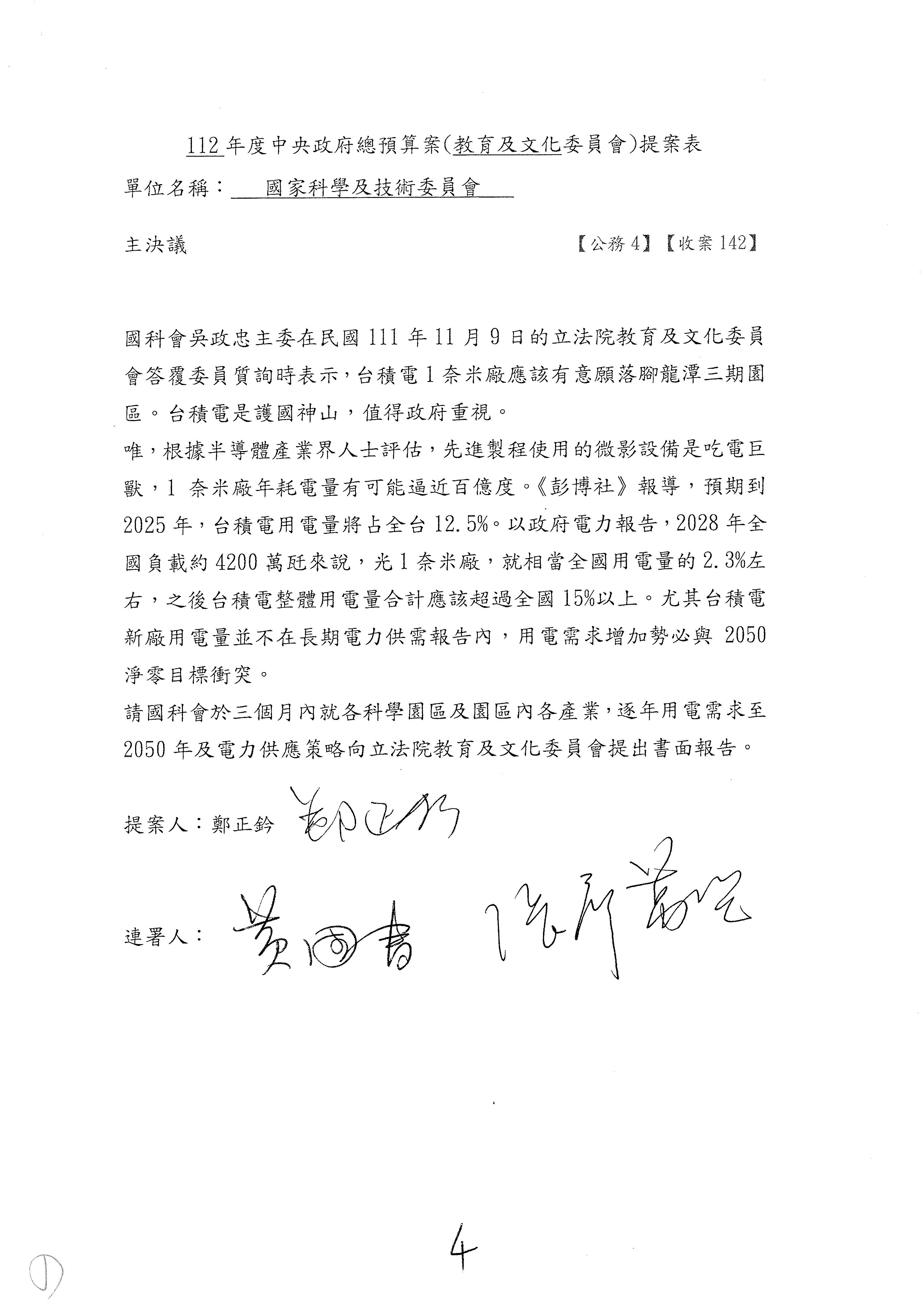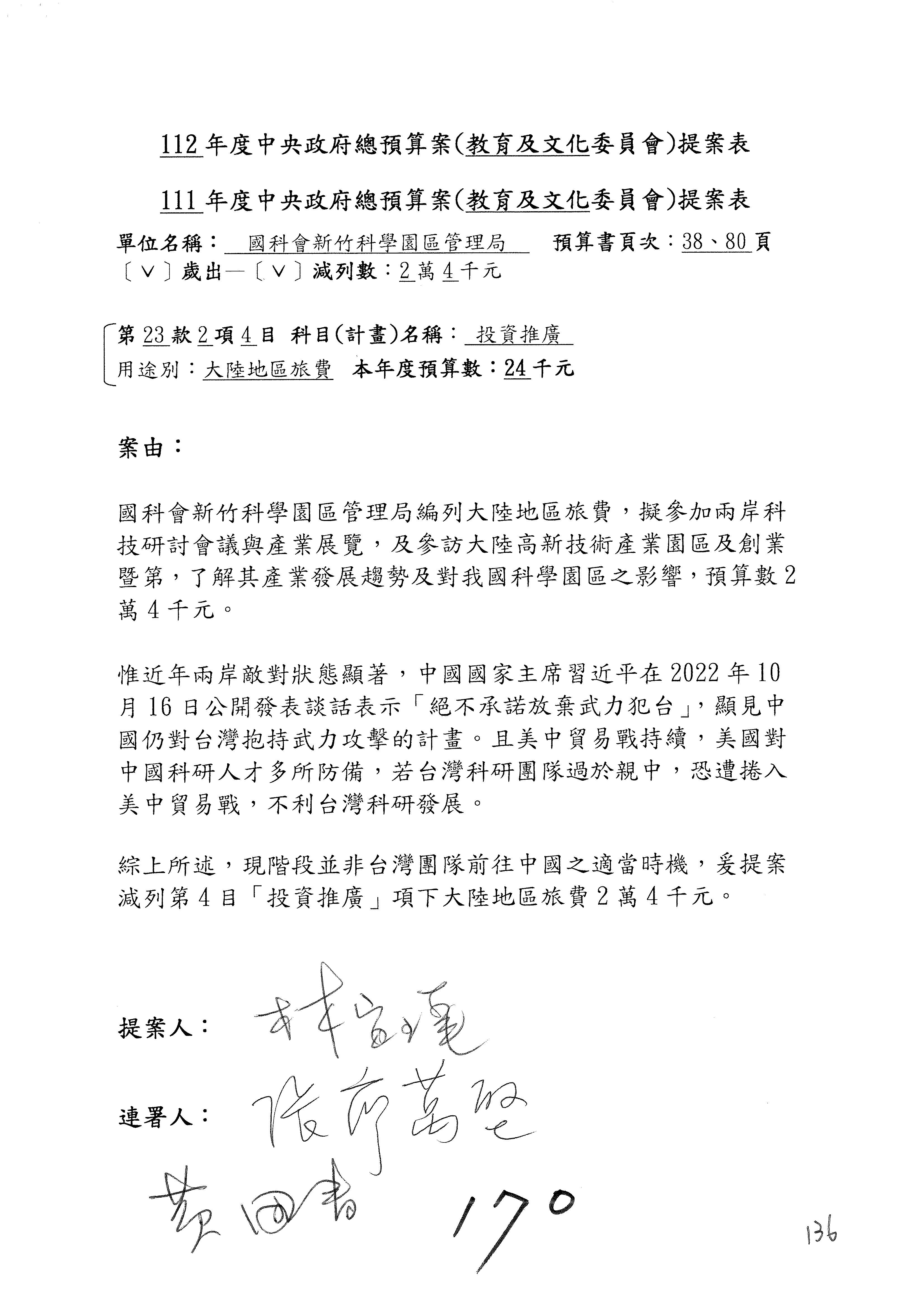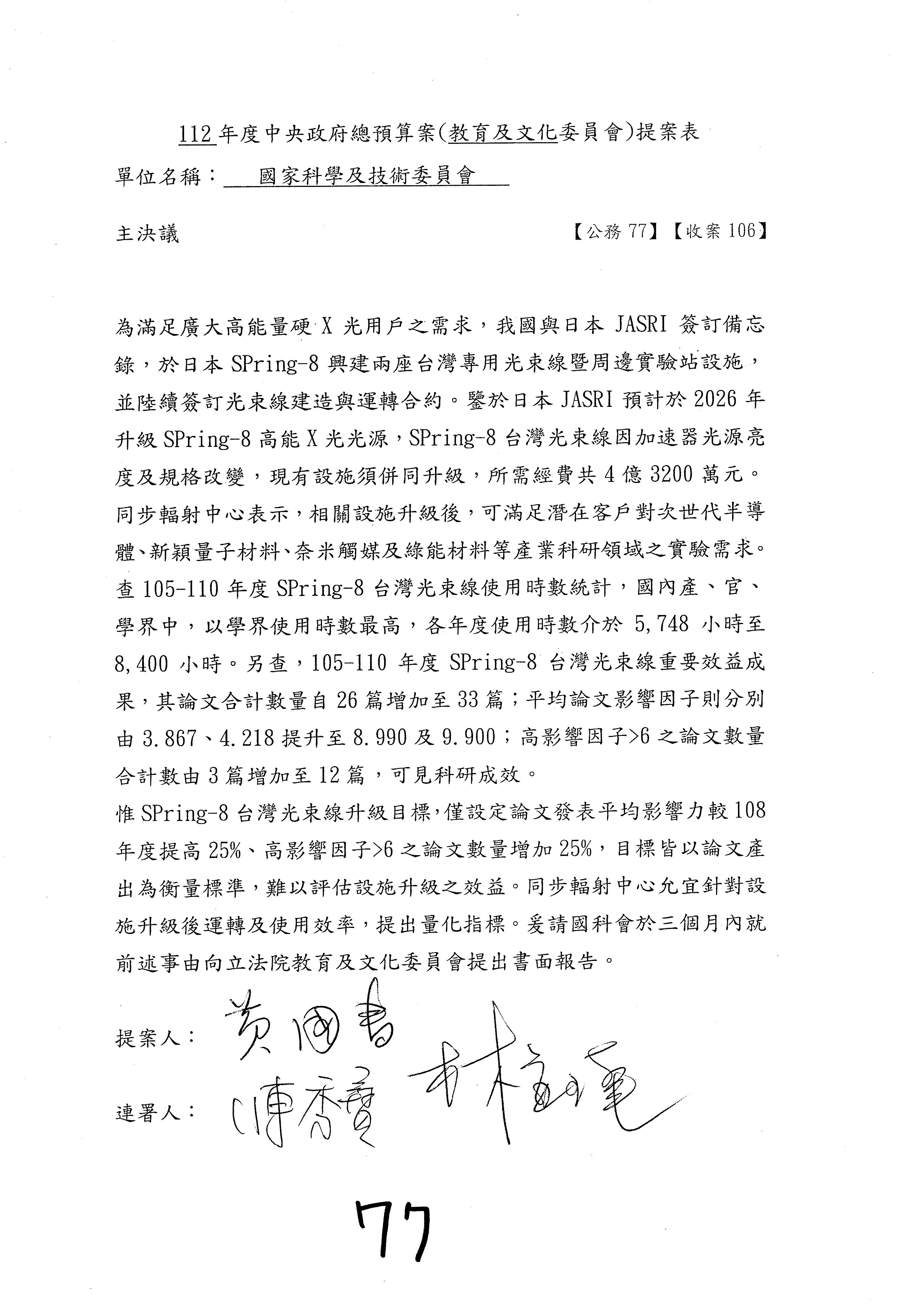 第8案是關於國際科技合作,這是跟晶片有關,臺灣晶片現在是國際上被討論的一個部分,原本這裡是編列8億7,490萬2,000元。在國際晶片戰爭當中,美日等國都運用不同的政策工具,希望削弱臺灣半導體的能量,所以希望國科會跟相關駐外科技組,對於這個部分能夠更敏銳,然後能有一些更有效的因應,所以針對112年度「推動整體科技發展計畫─國際科技合作」,希望能夠減列5,000萬元並凍結1億元,希望國科會就台積電前往美日設廠對臺灣半導體的影響做一個具體的說明跟評估,然後再予以動用。以上。謝謝。