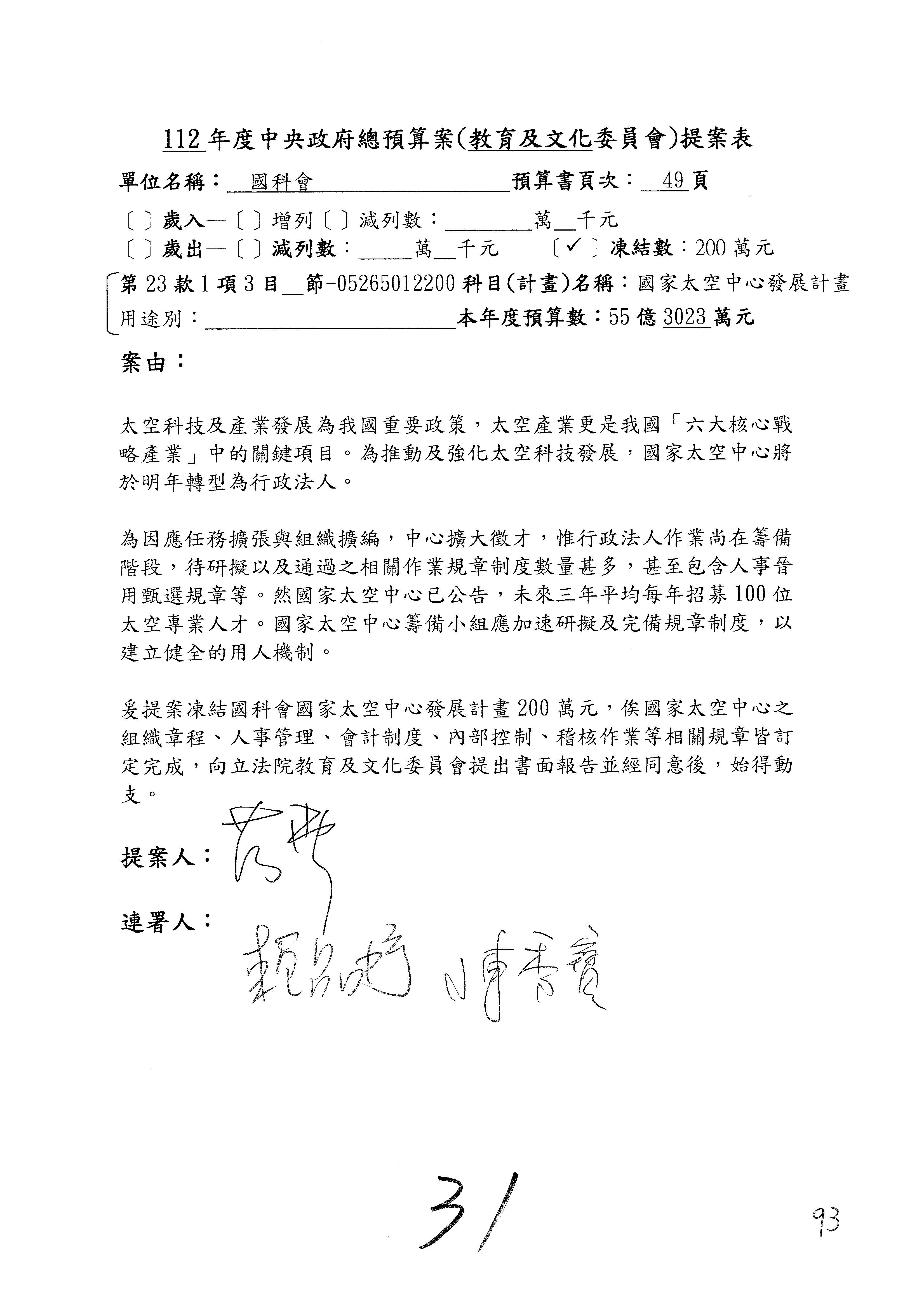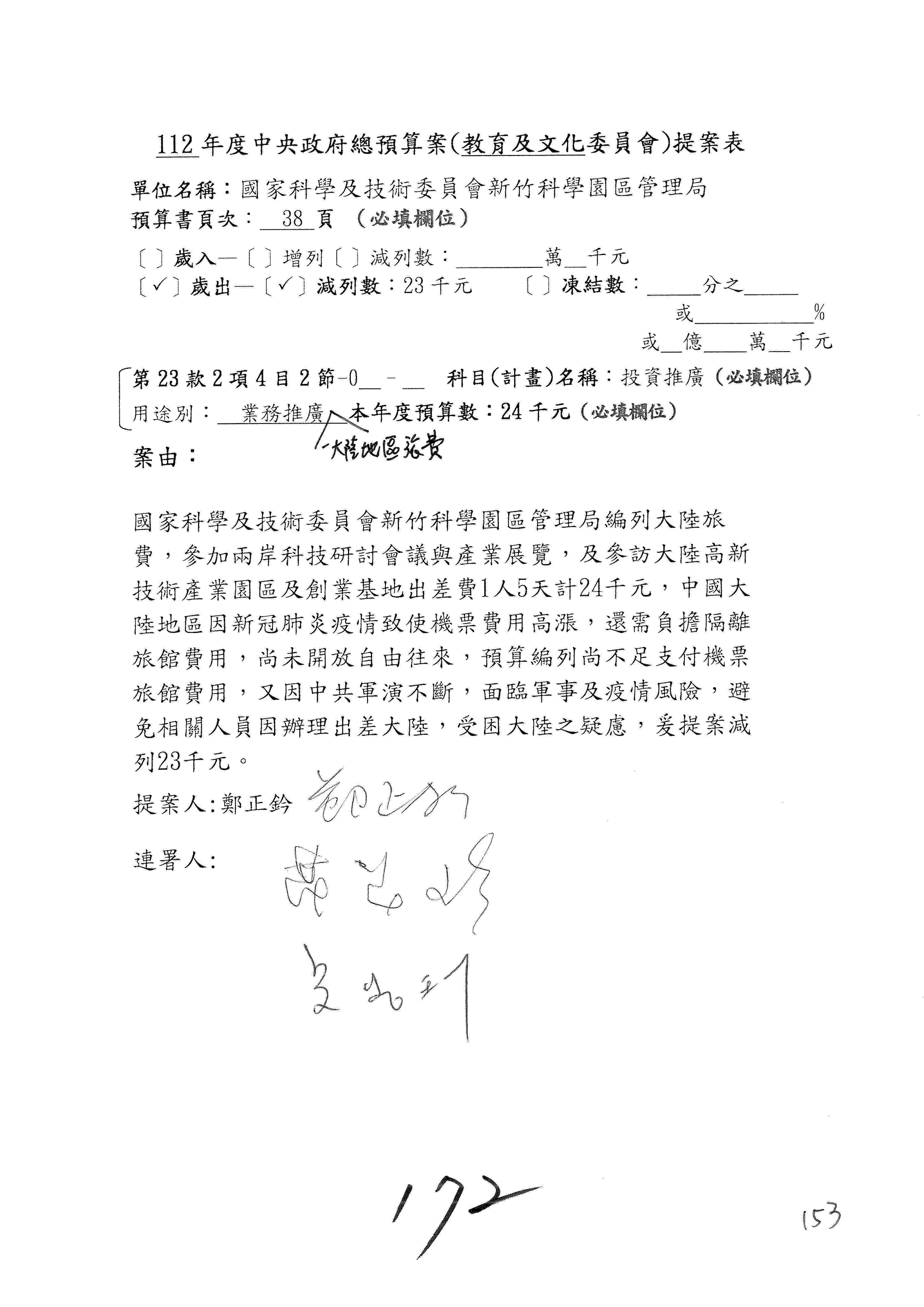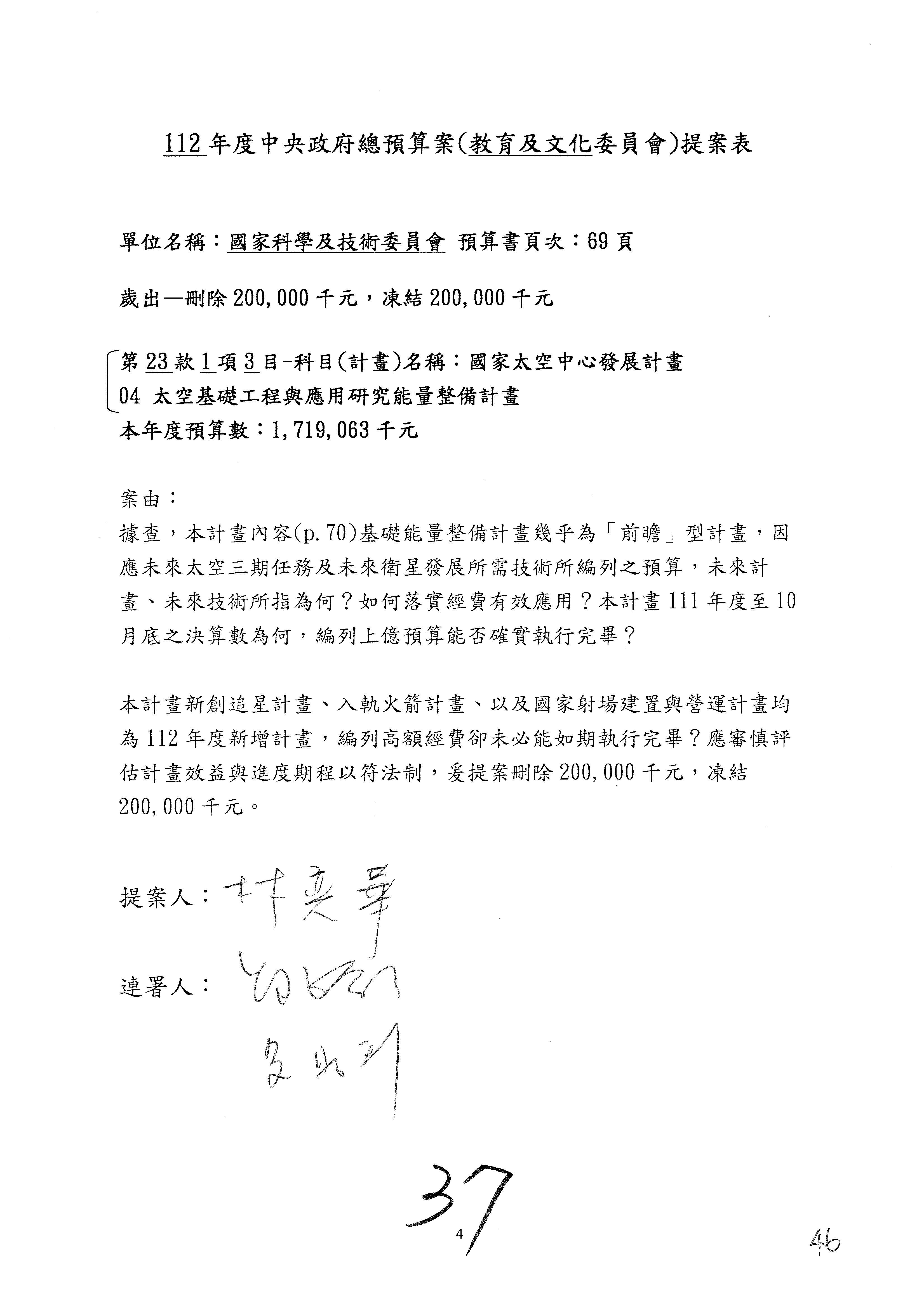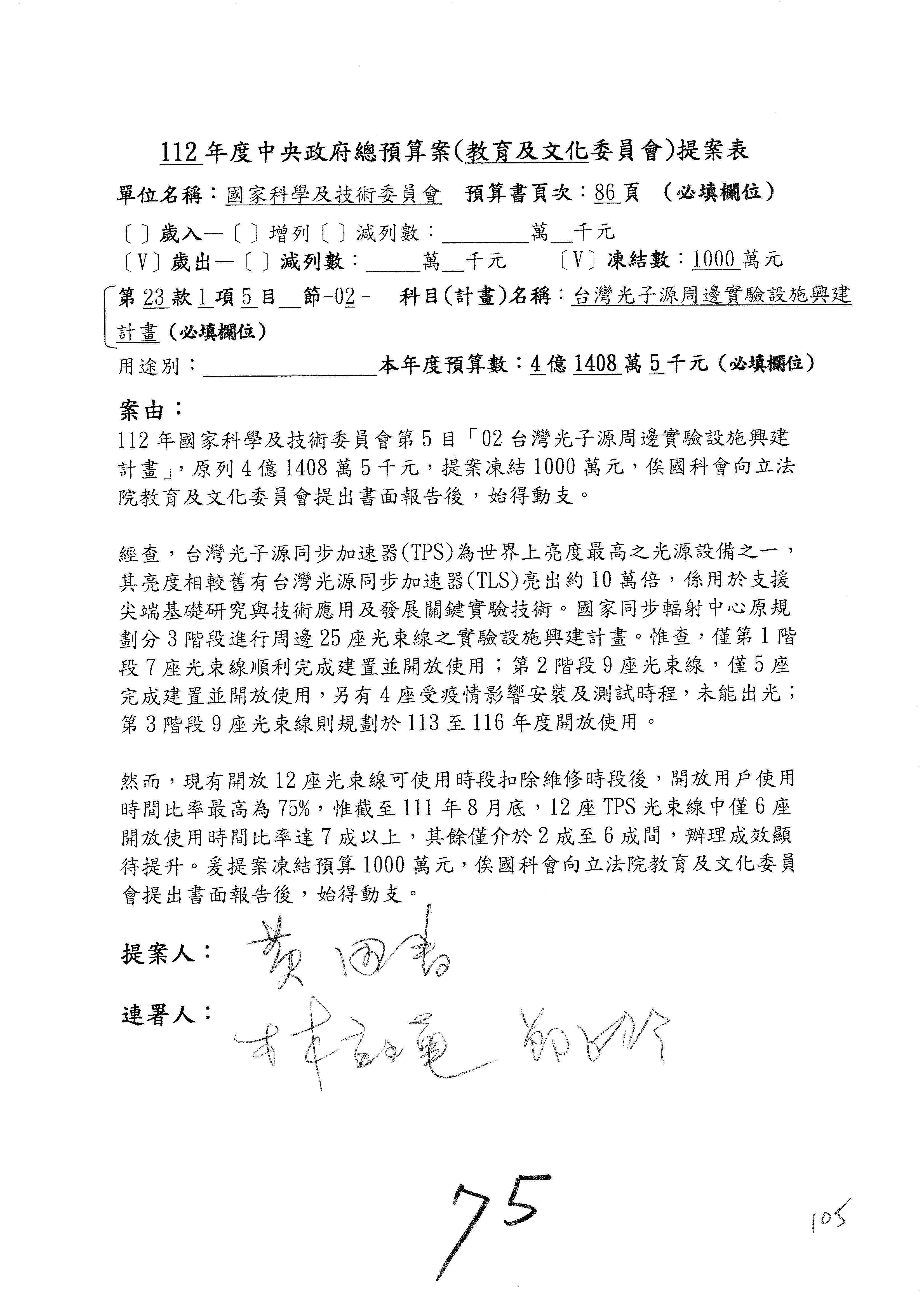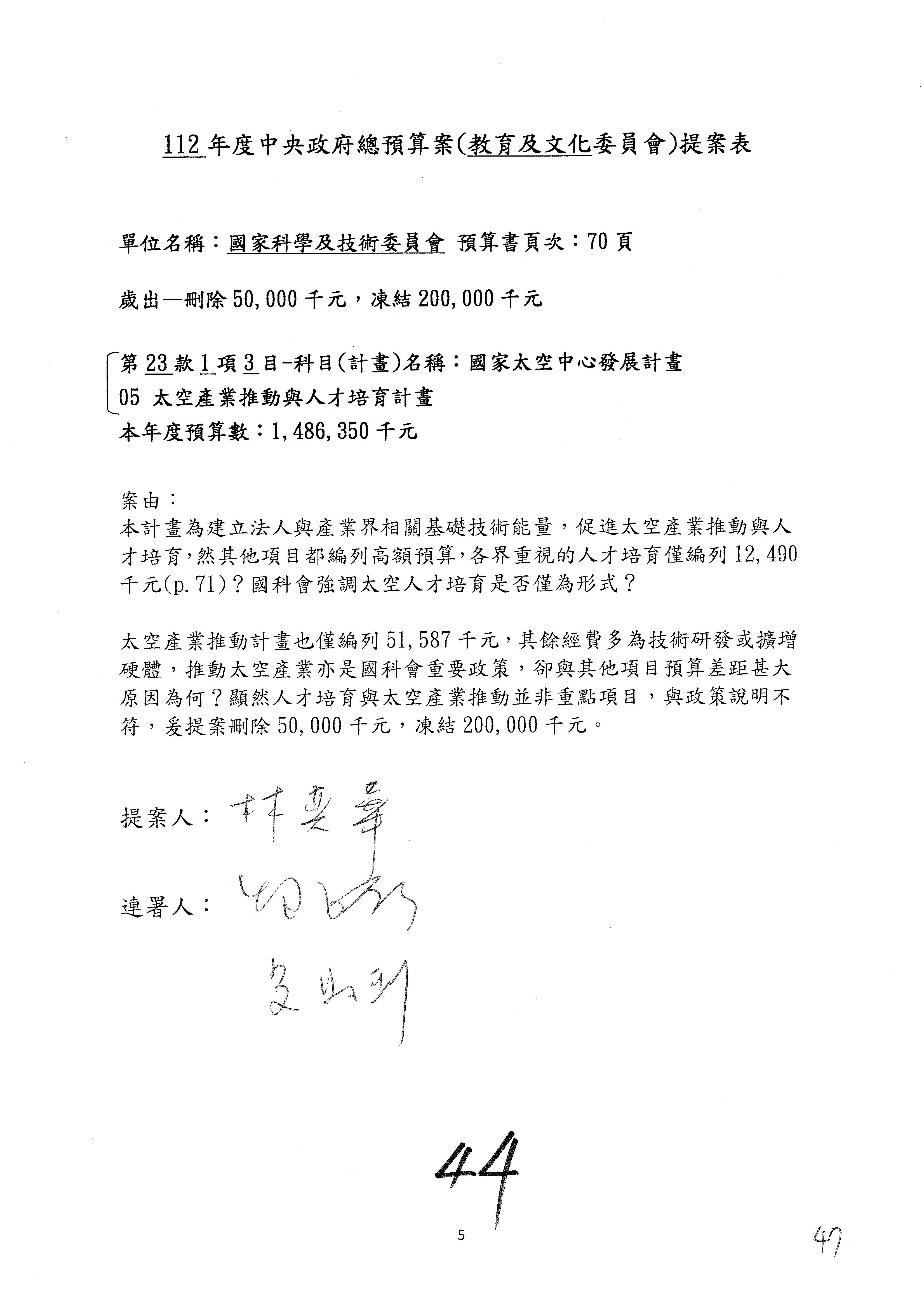 第8案是關於國際科技合作,這是跟晶片有關,臺灣晶片現在是國際上被討論的一個部分,原本這裡是編列8億7,490萬2,000元。在國際晶片戰爭當中,美日等國都運用不同的政策工具,希望削弱臺灣半導體的能量,所以希望國科會跟相關駐外科技組,對於這個部分能夠更敏銳,然後能有一些更有效的因應,所以針對112年度「推動整體科技發展計畫─國際科技合作」,希望能夠減列5,000萬元並凍結1億元,希望國科會就台積電前往美日設廠對臺灣半導體的影響做一個具體的說明跟評估,然後再予以動用。以上。謝謝。