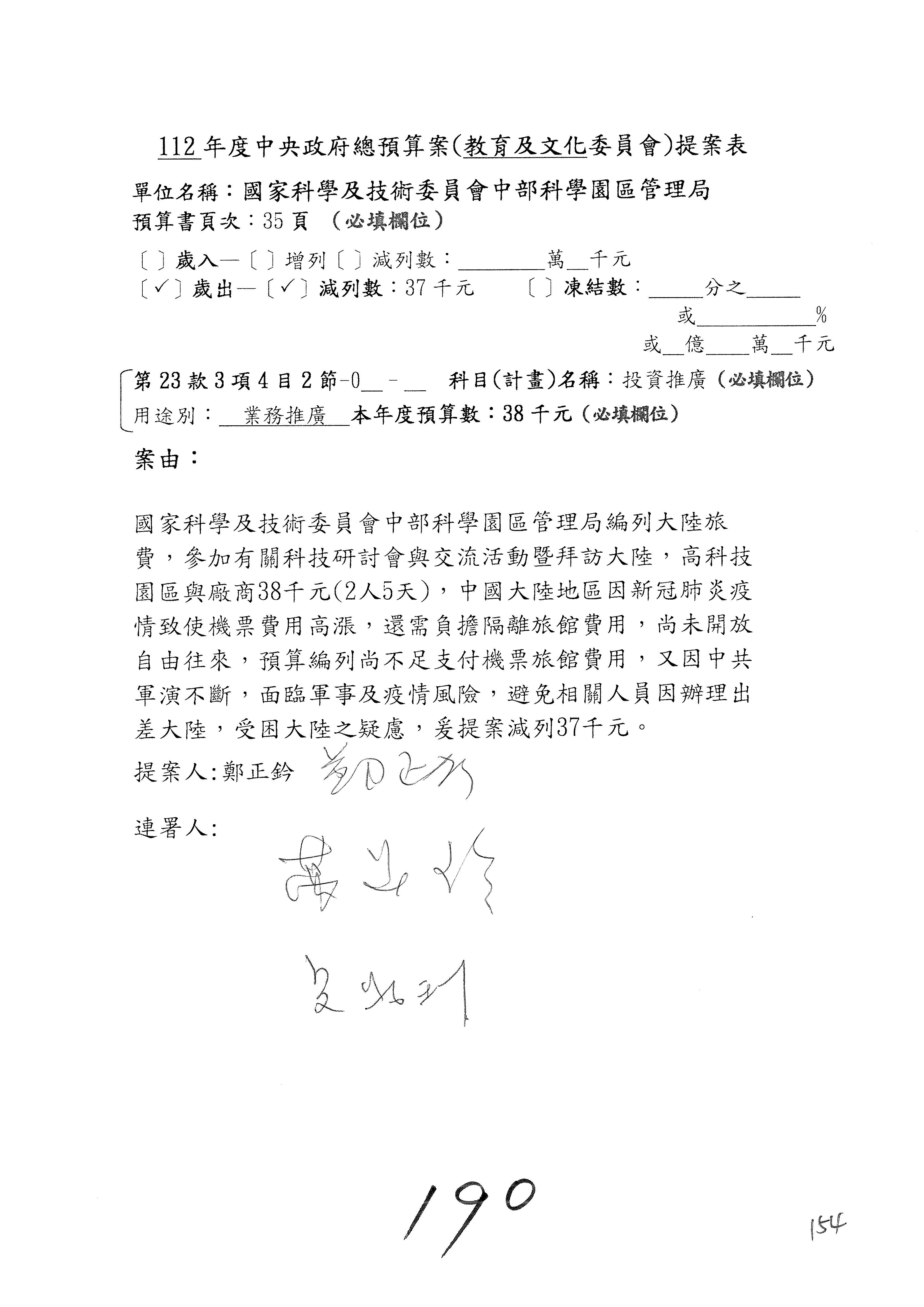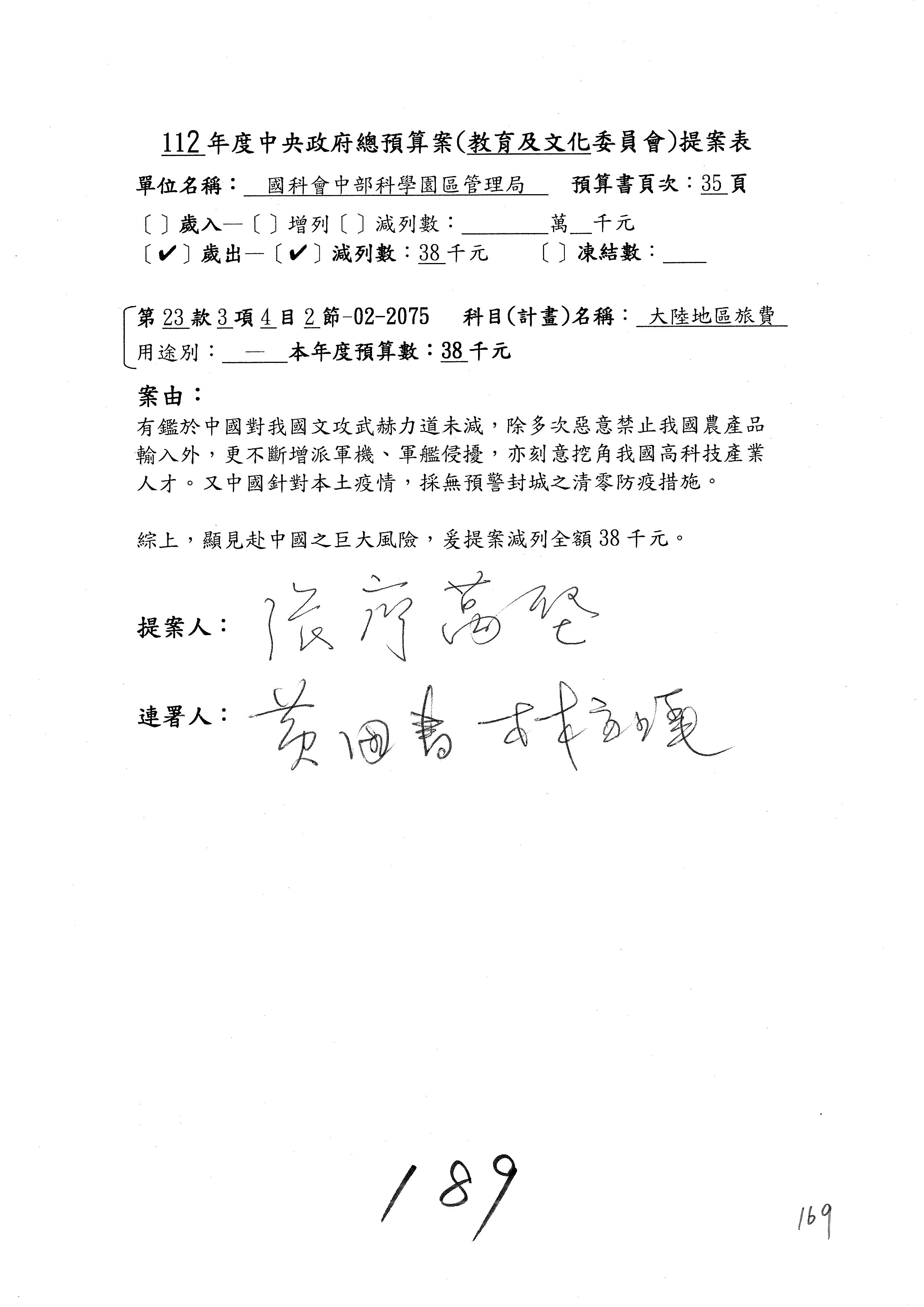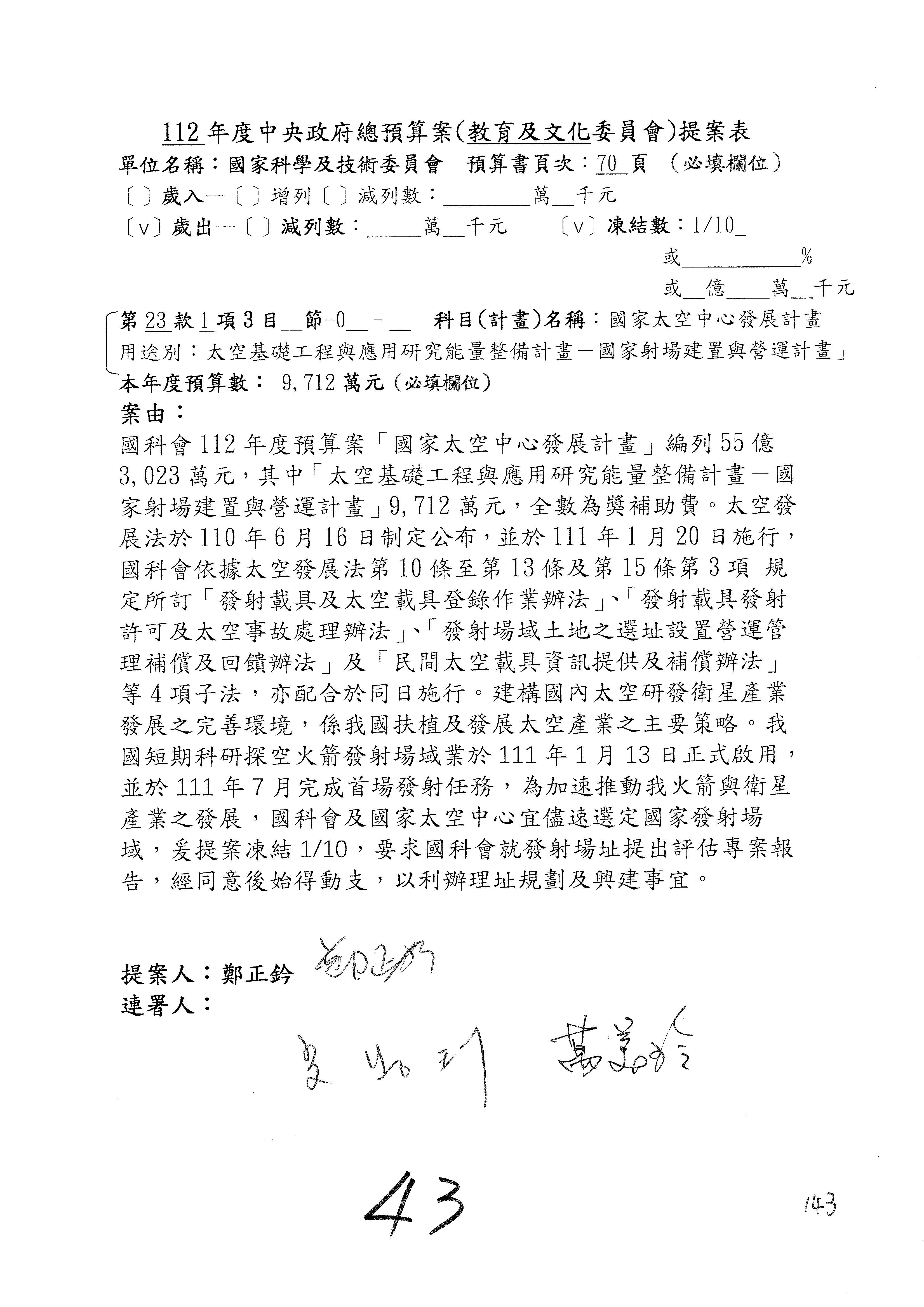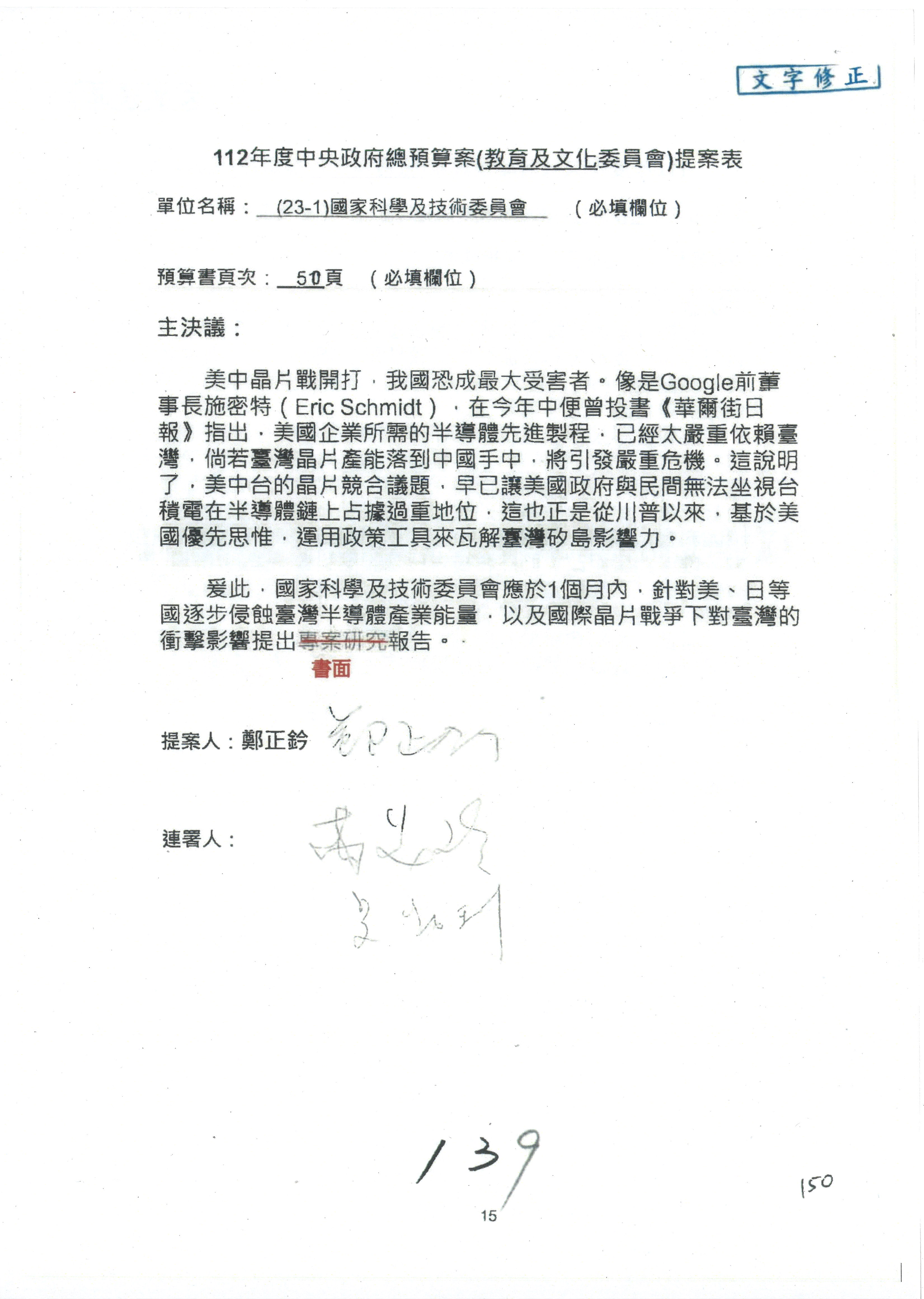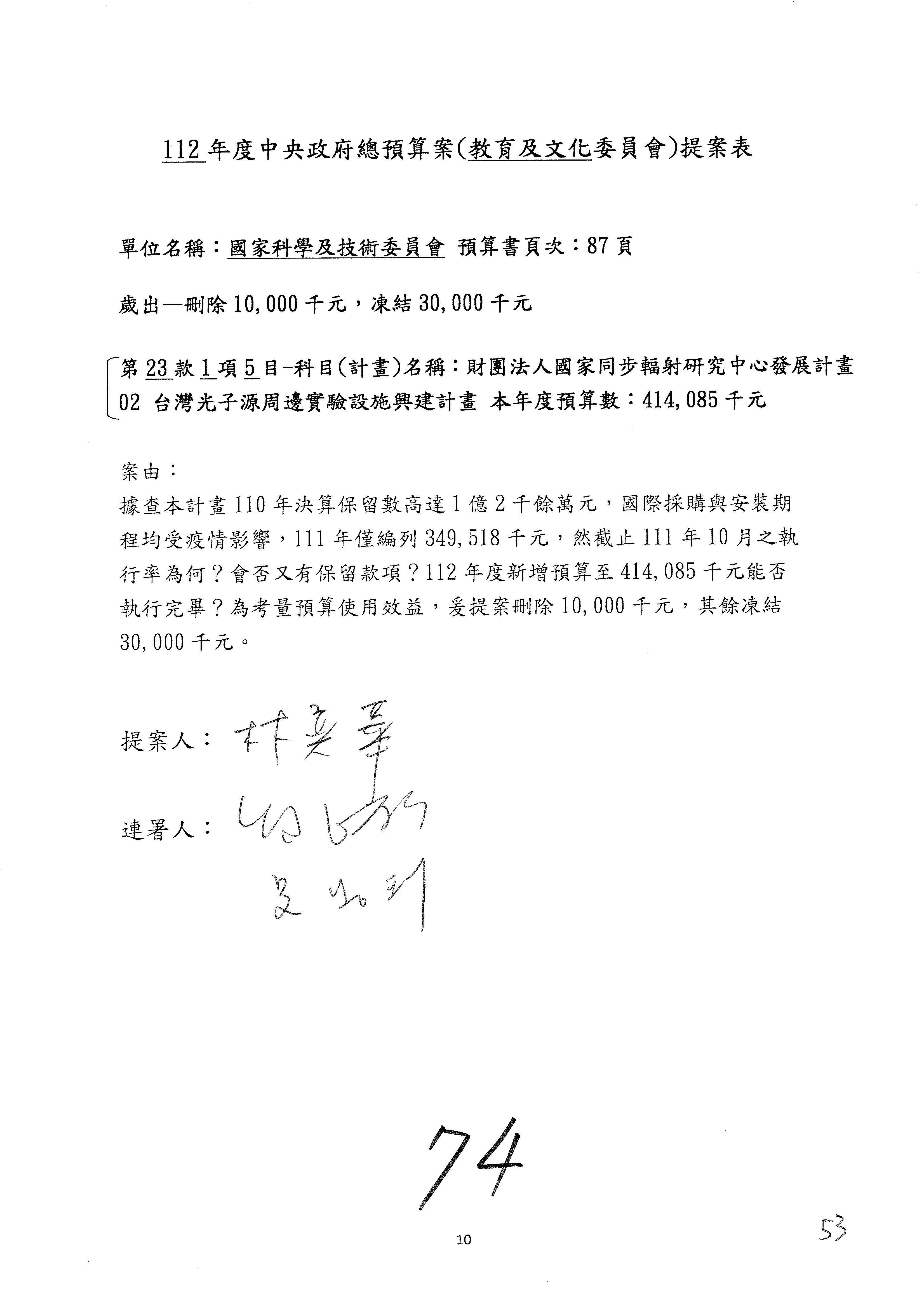 第8案是關於國際科技合作,這是跟晶片有關,臺灣晶片現在是國際上被討論的一個部分,原本這裡是編列8億7,490萬2,000元。在國際晶片戰爭當中,美日等國都運用不同的政策工具,希望削弱臺灣半導體的能量,所以希望國科會跟相關駐外科技組,對於這個部分能夠更敏銳,然後能有一些更有效的因應,所以針對112年度「推動整體科技發展計畫─國際科技合作」,希望能夠減列5,000萬元並凍結1億元,希望國科會就台積電前往美日設廠對臺灣半導體的影響做一個具體的說明跟評估,然後再予以動用。以上。謝謝。