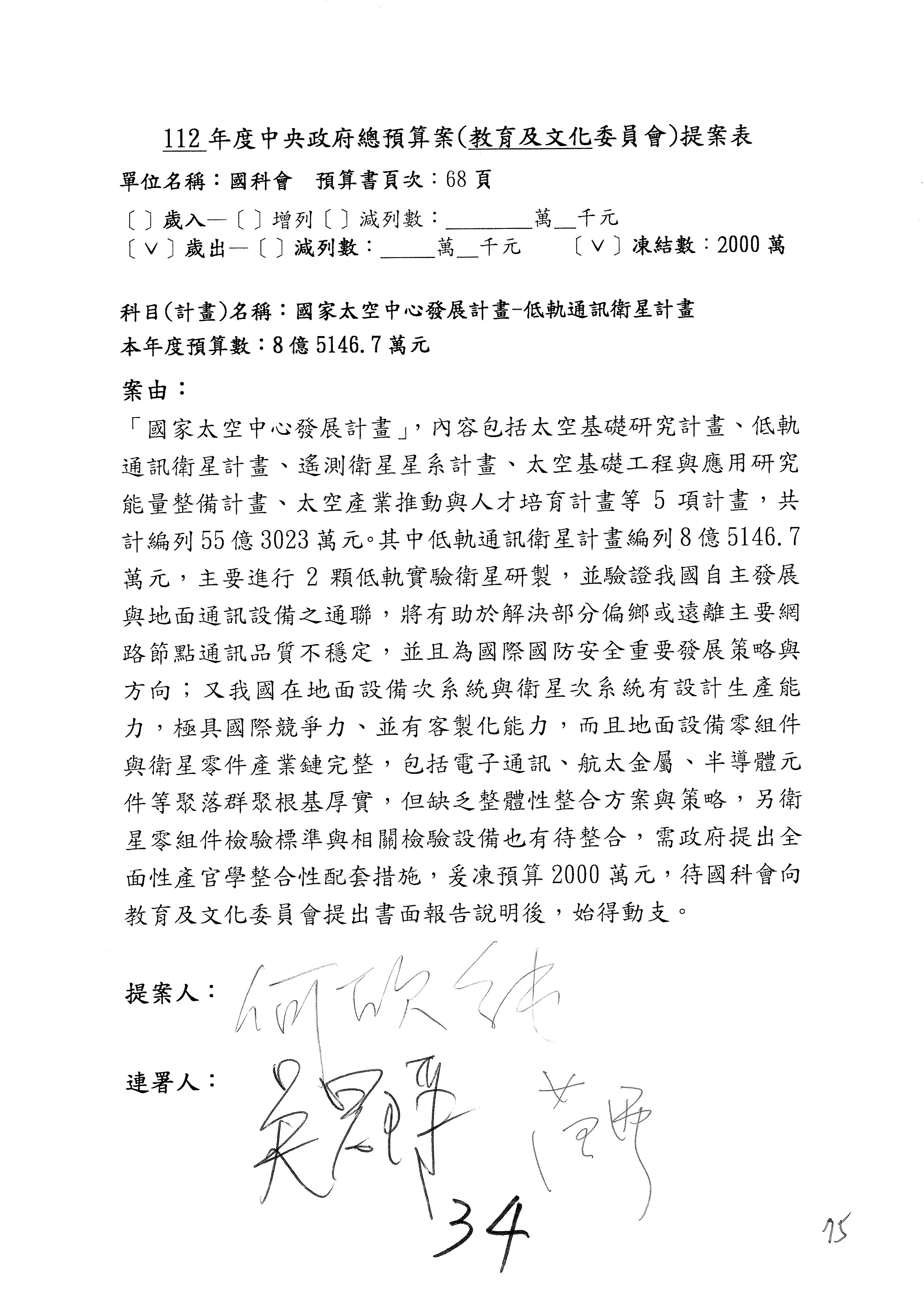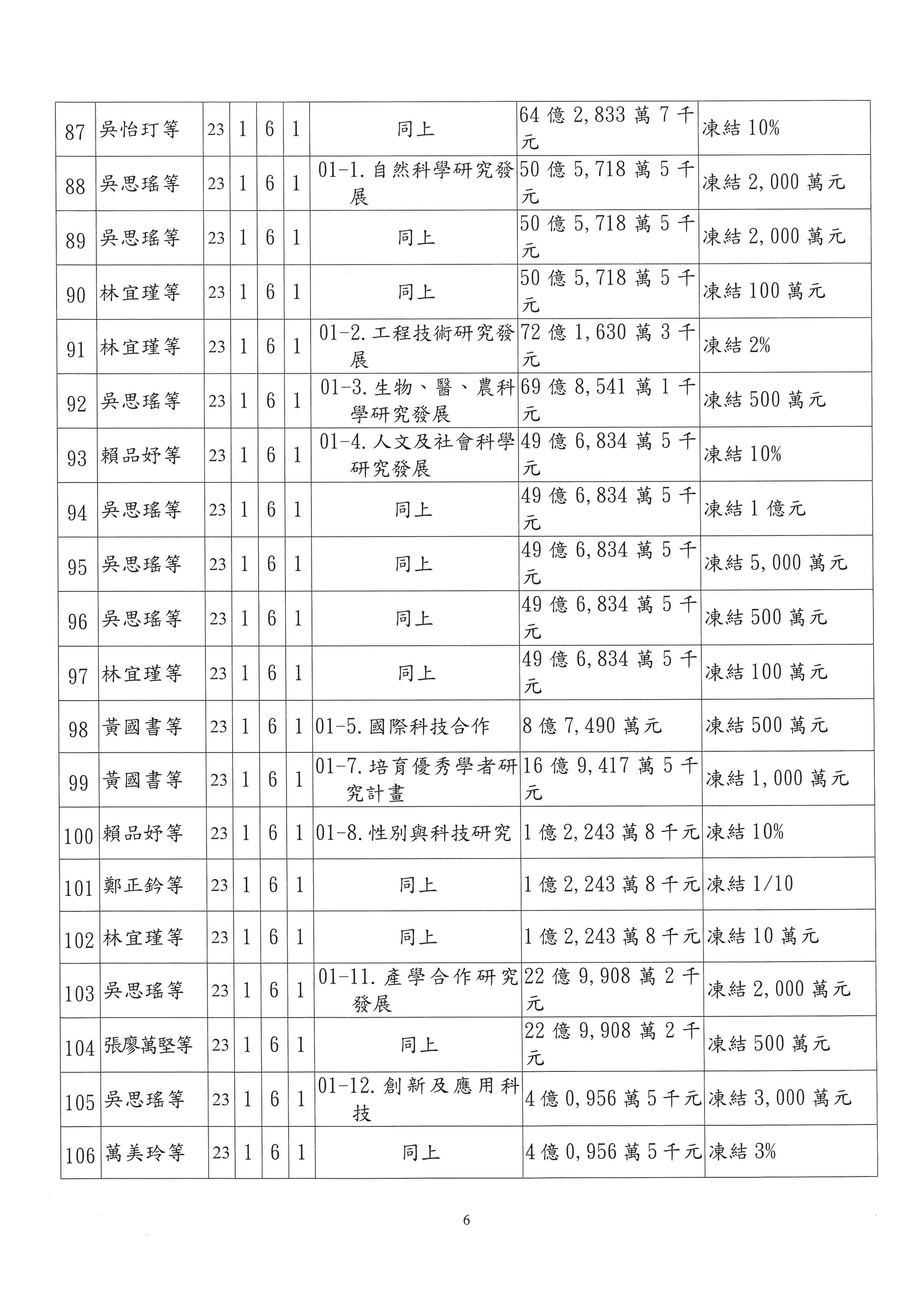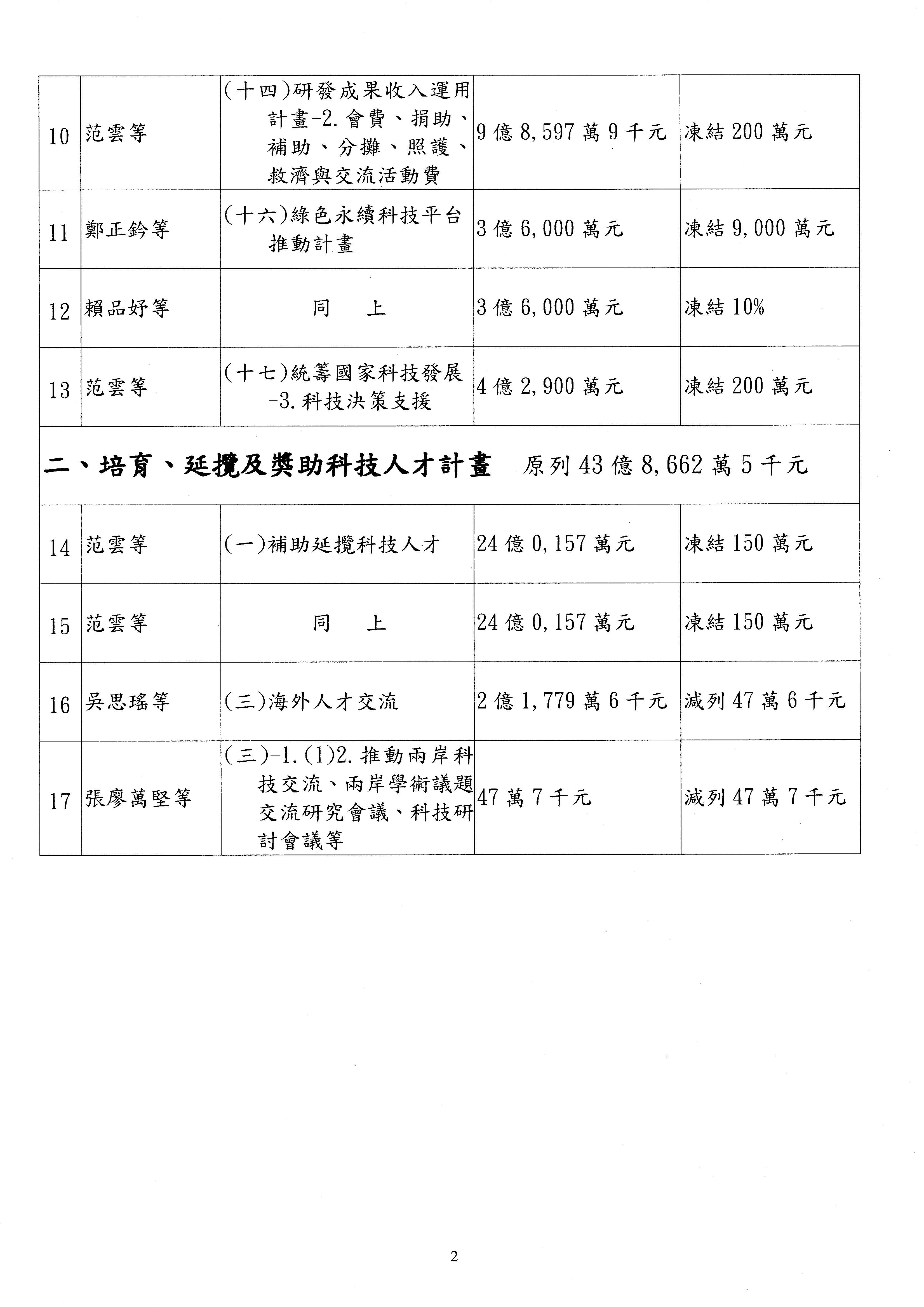 主席:好,現在就只剩我這邊凍結的數字比較高,如果主委都說2,000萬元的話,我就尊重,但對於整個科研計畫,希望你們能夠更有效地去發揮、去運用,好不好?