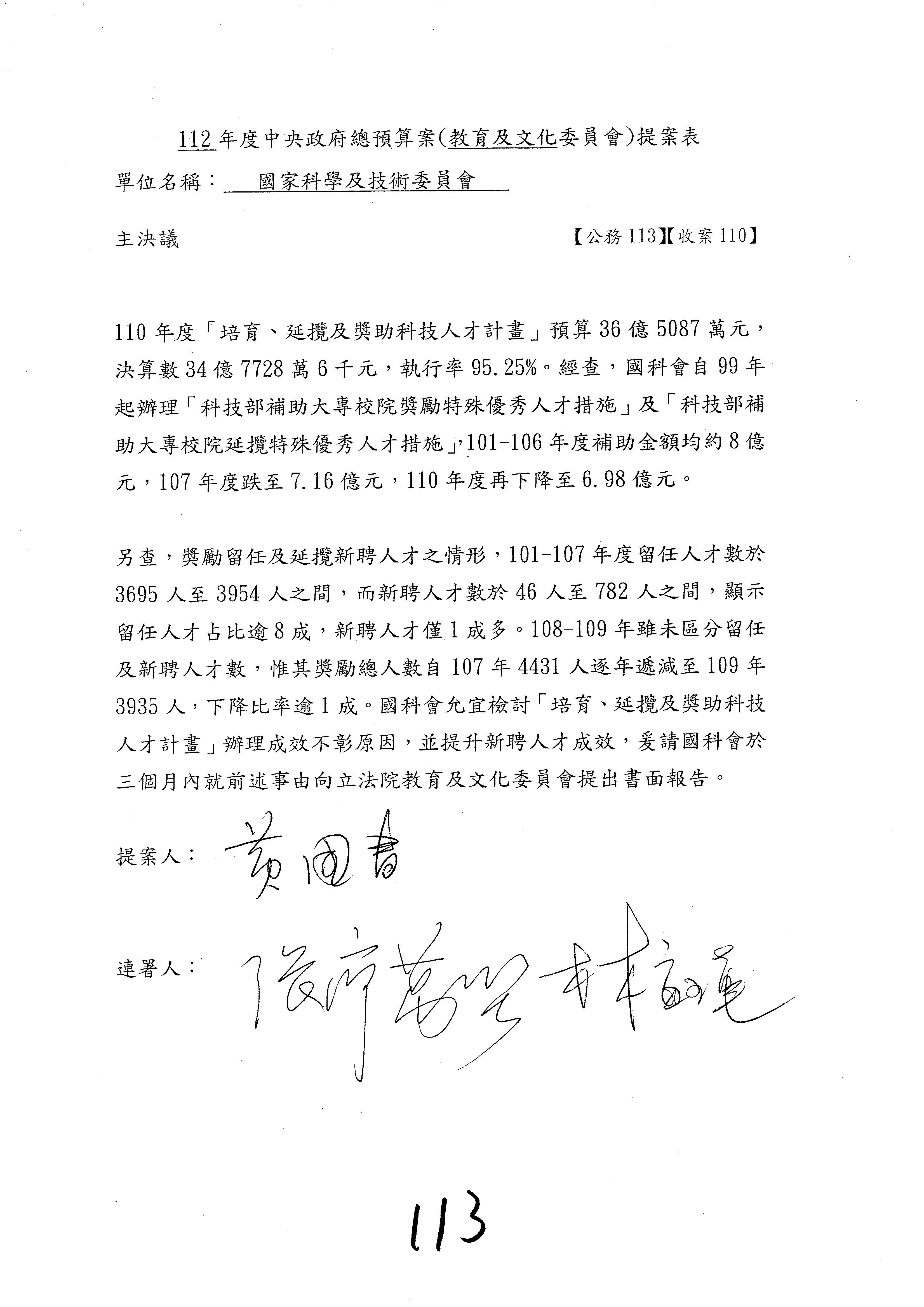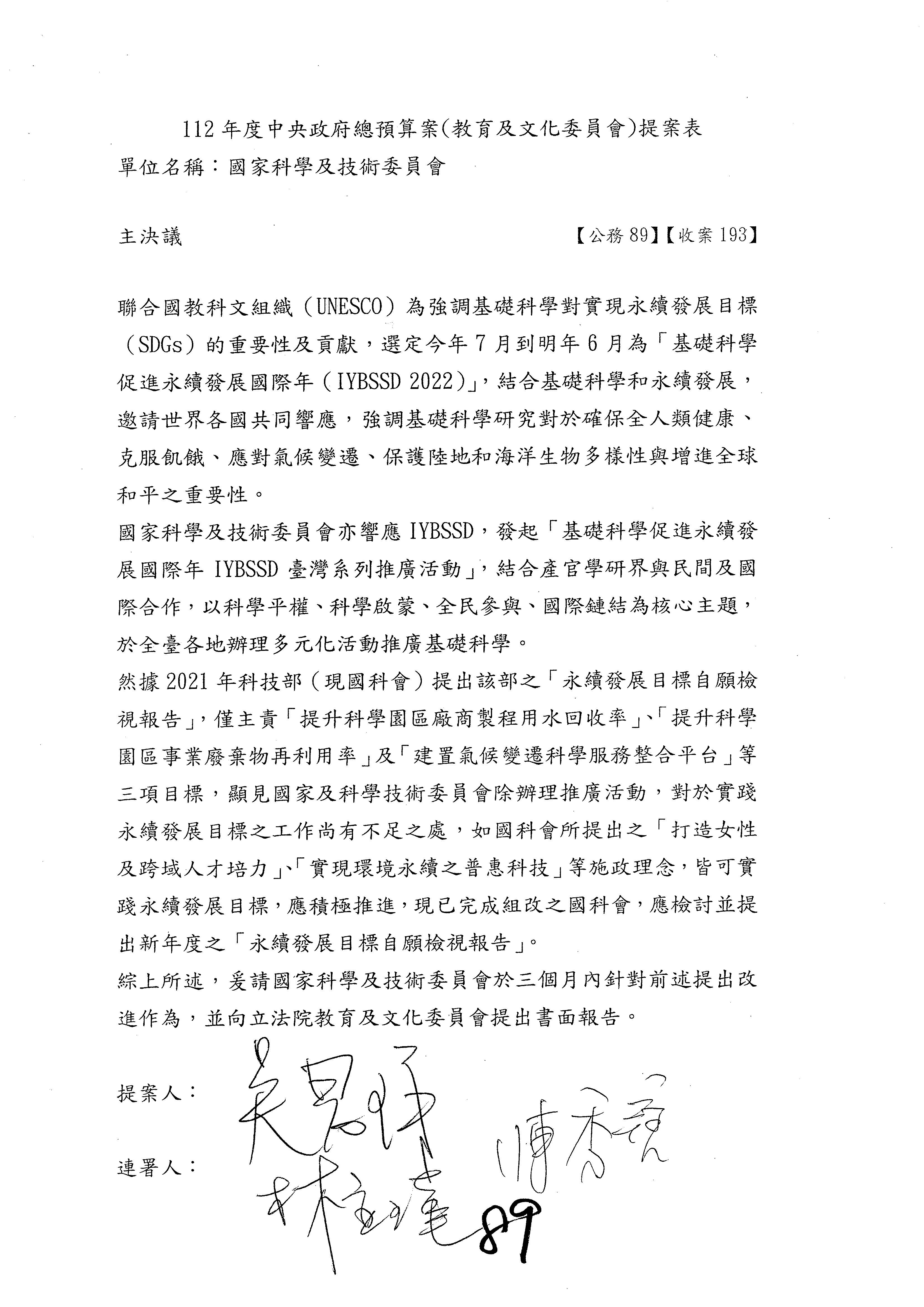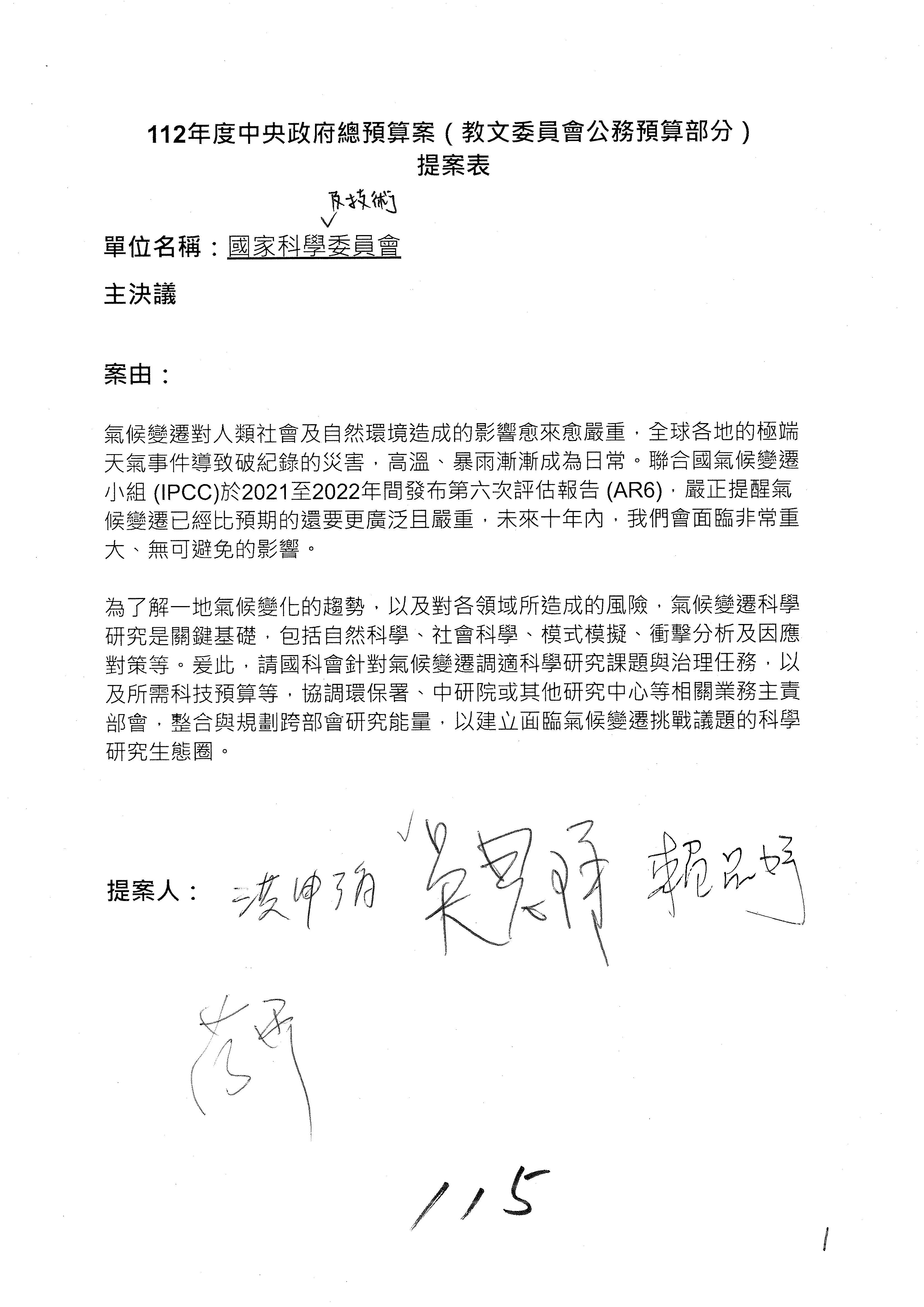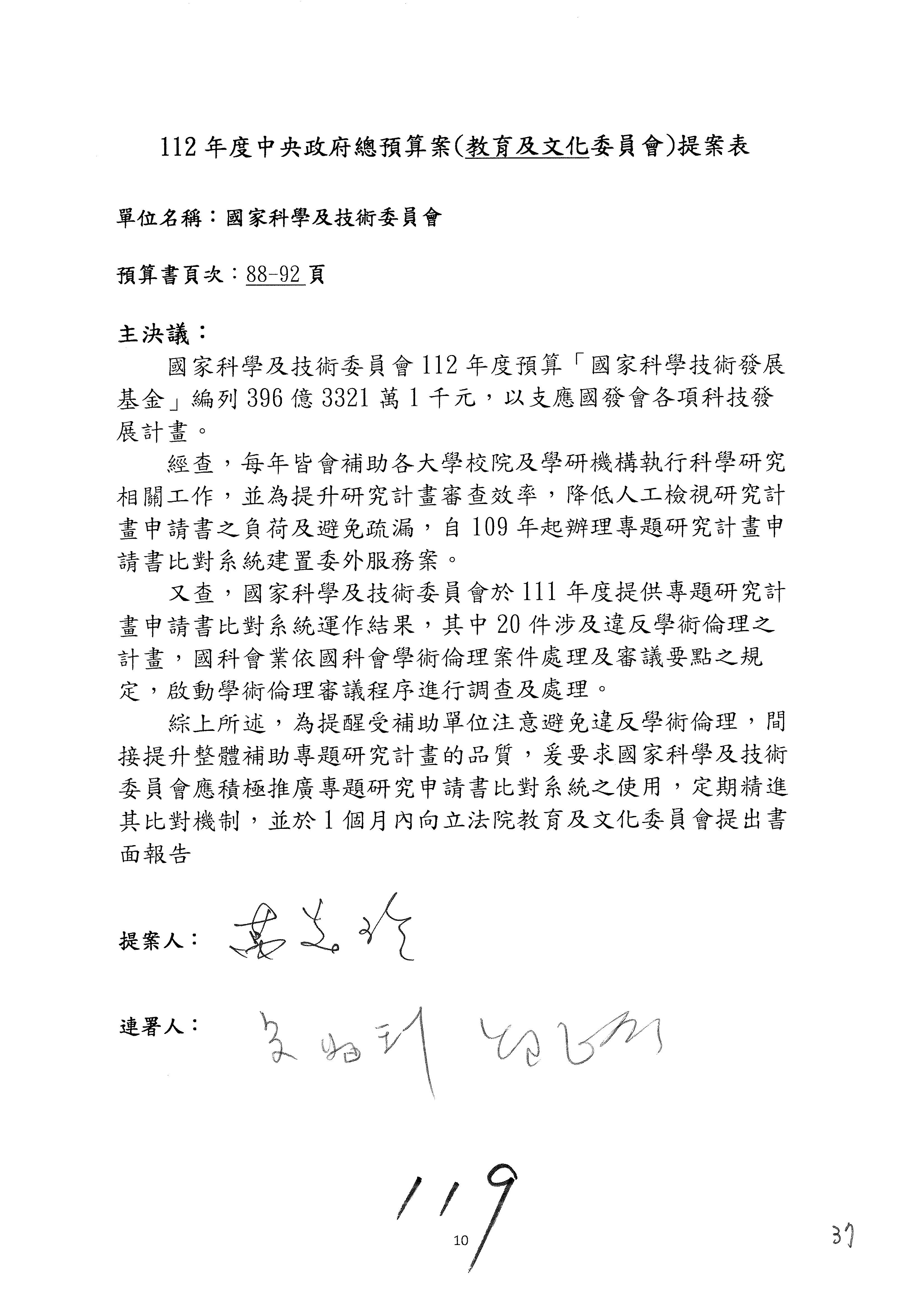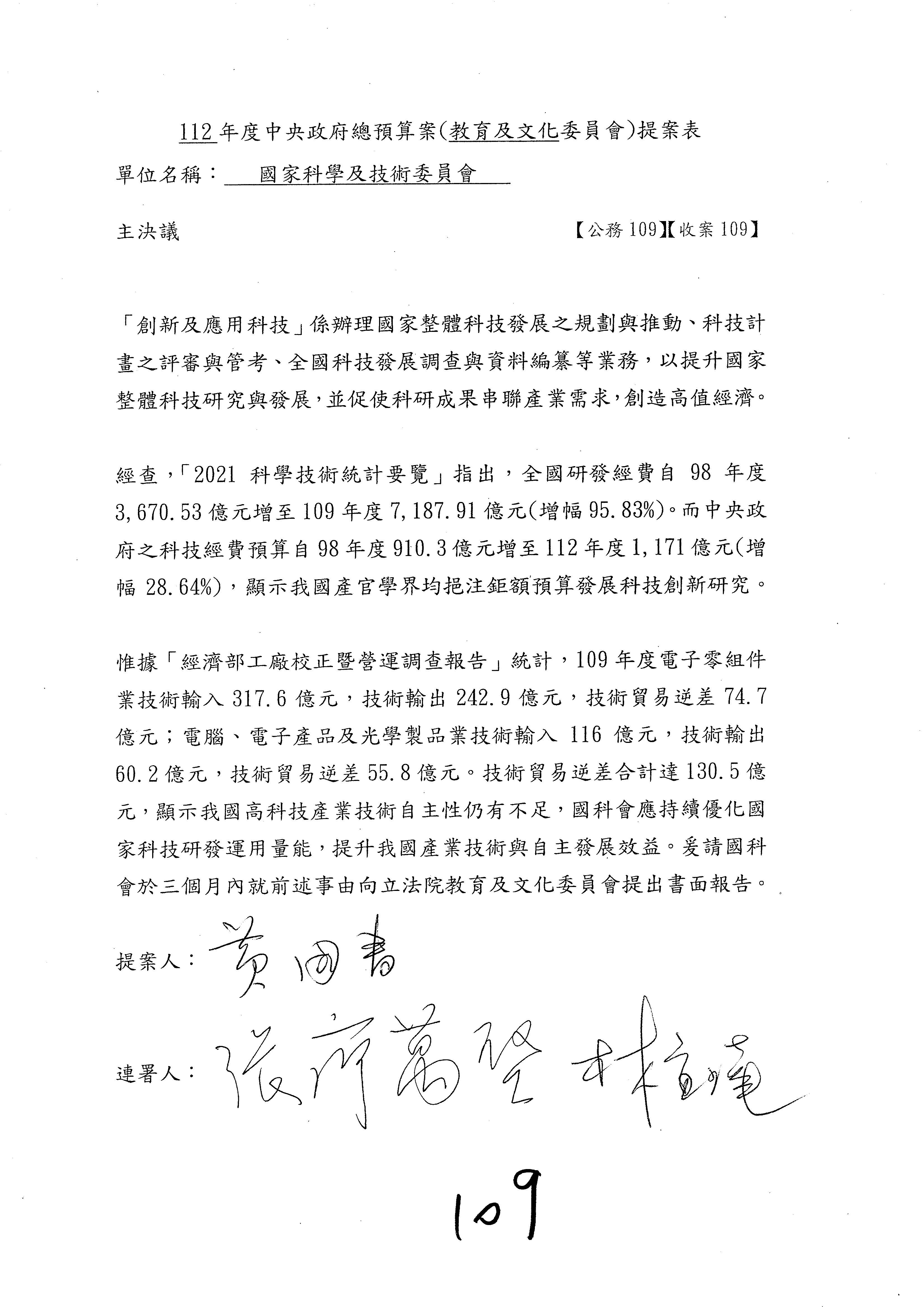 一、繼續審查112年度中央政府總預算案有關國家科學及技術委員會與所屬單位預算案。