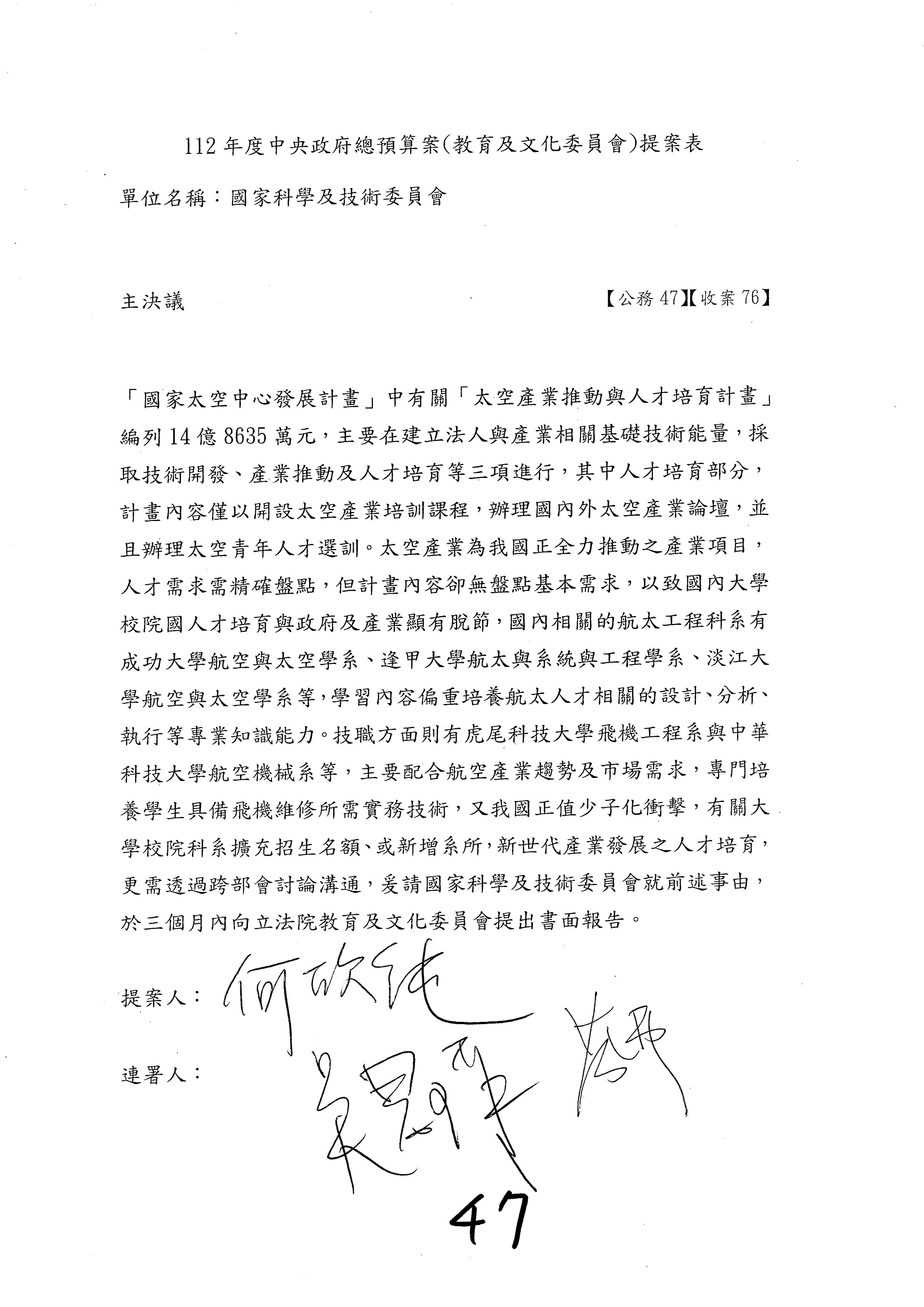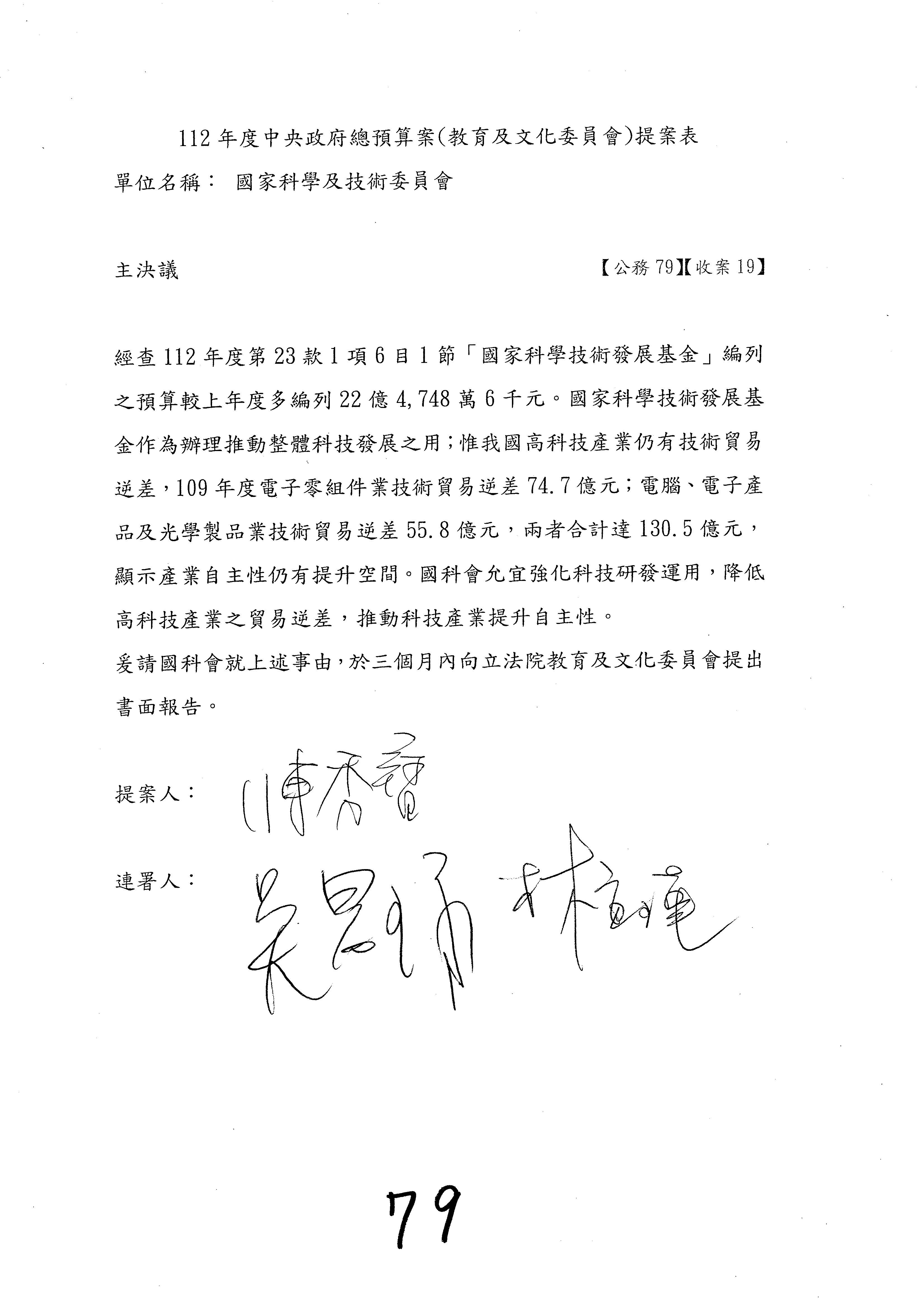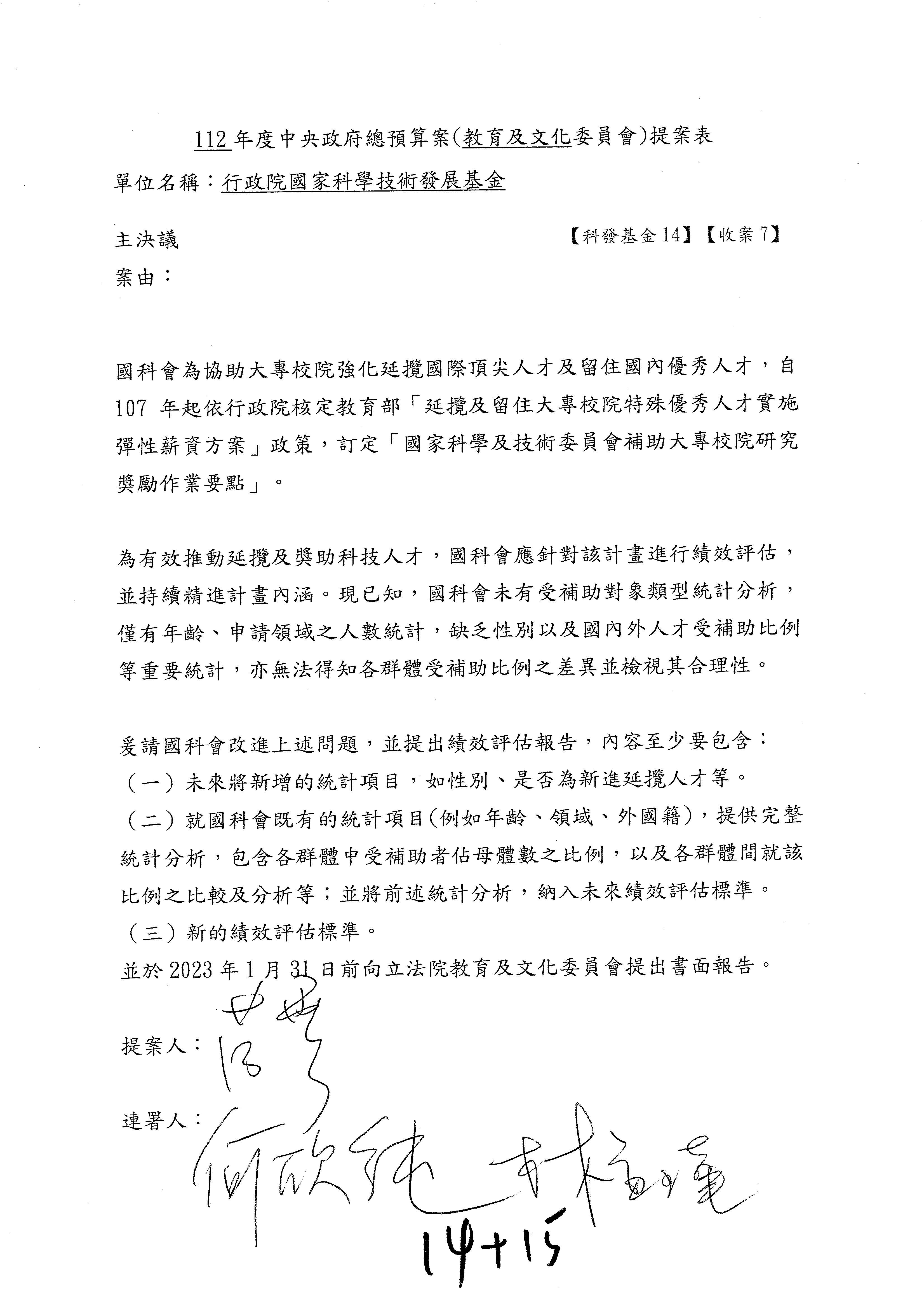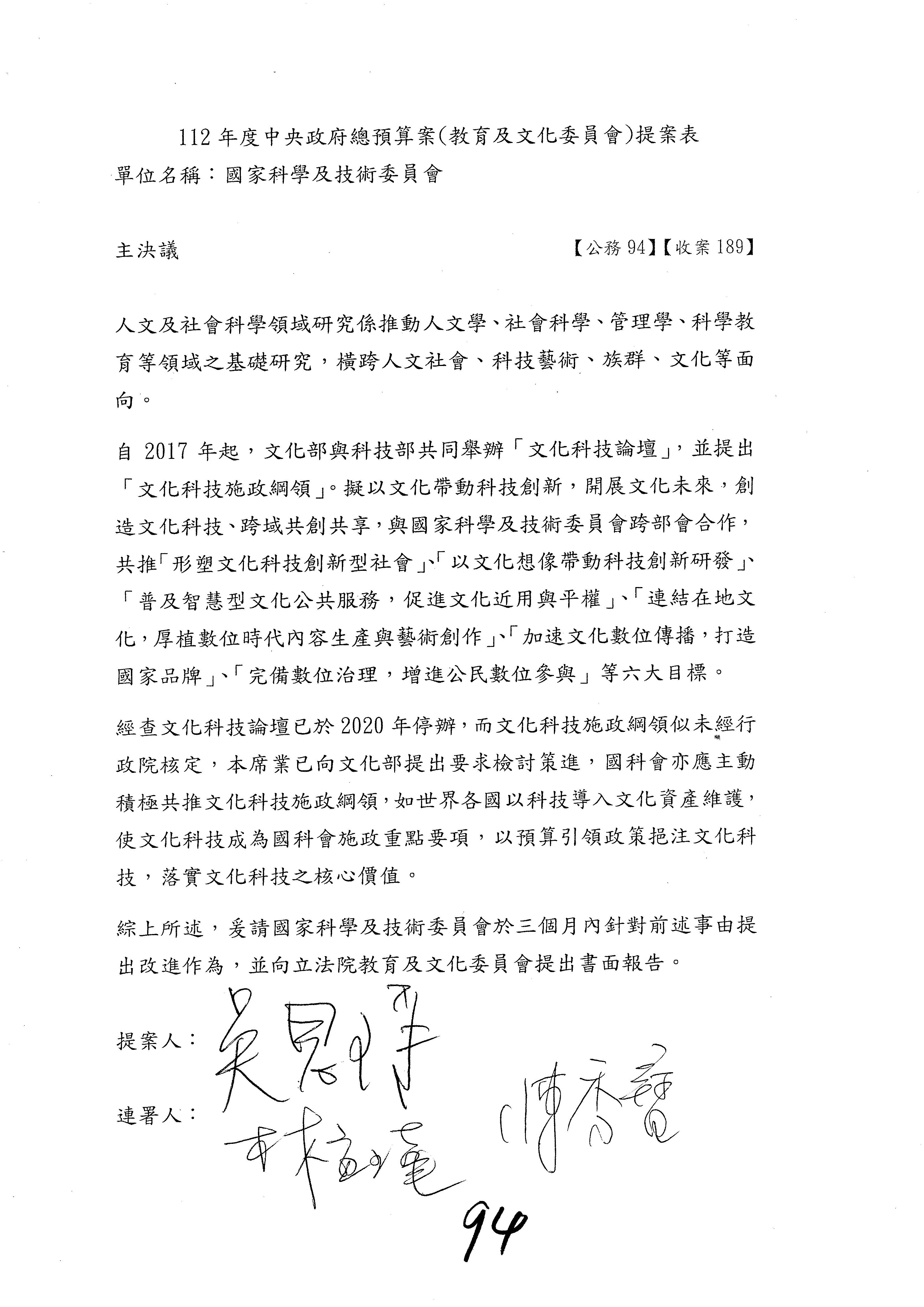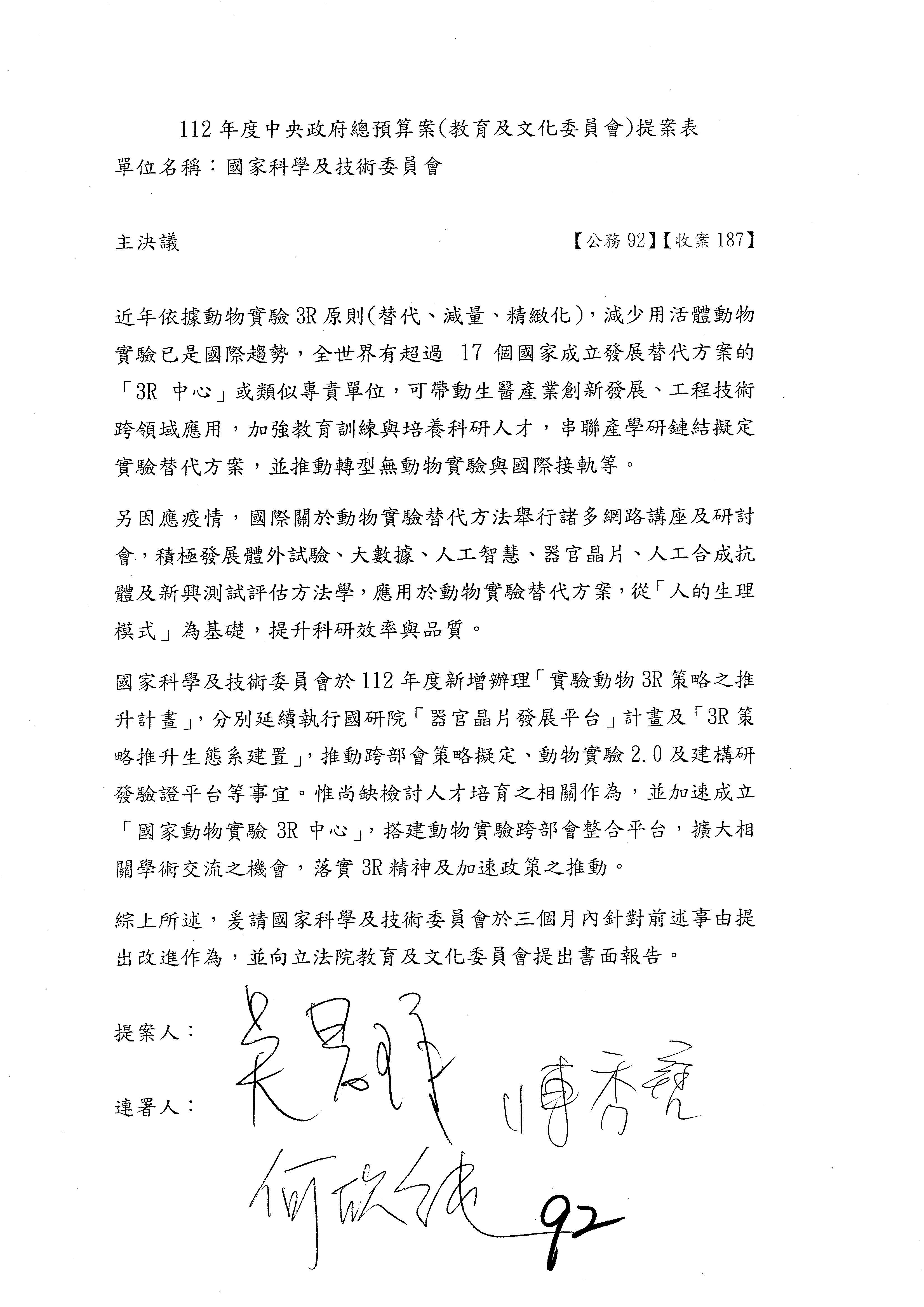 一、繼續審查112年度中央政府總預算案有關國家科學及技術委員會與所屬單位預算案。