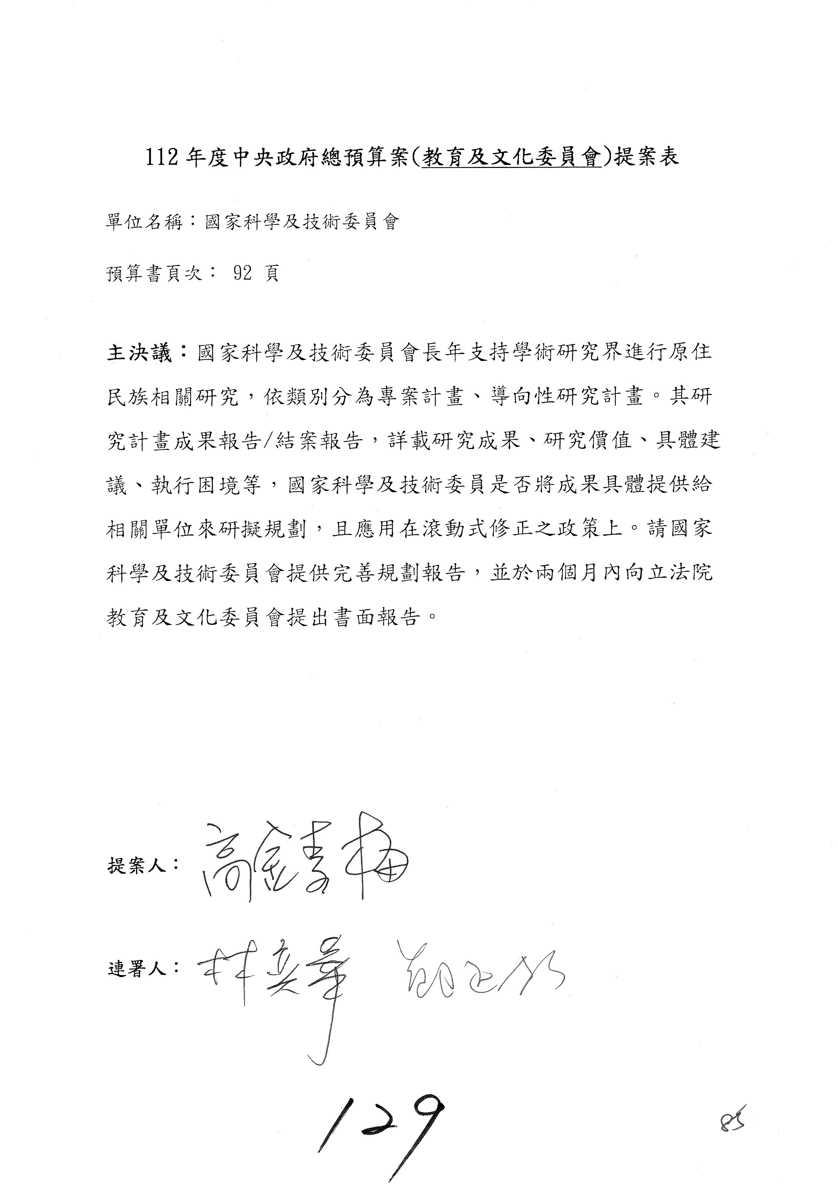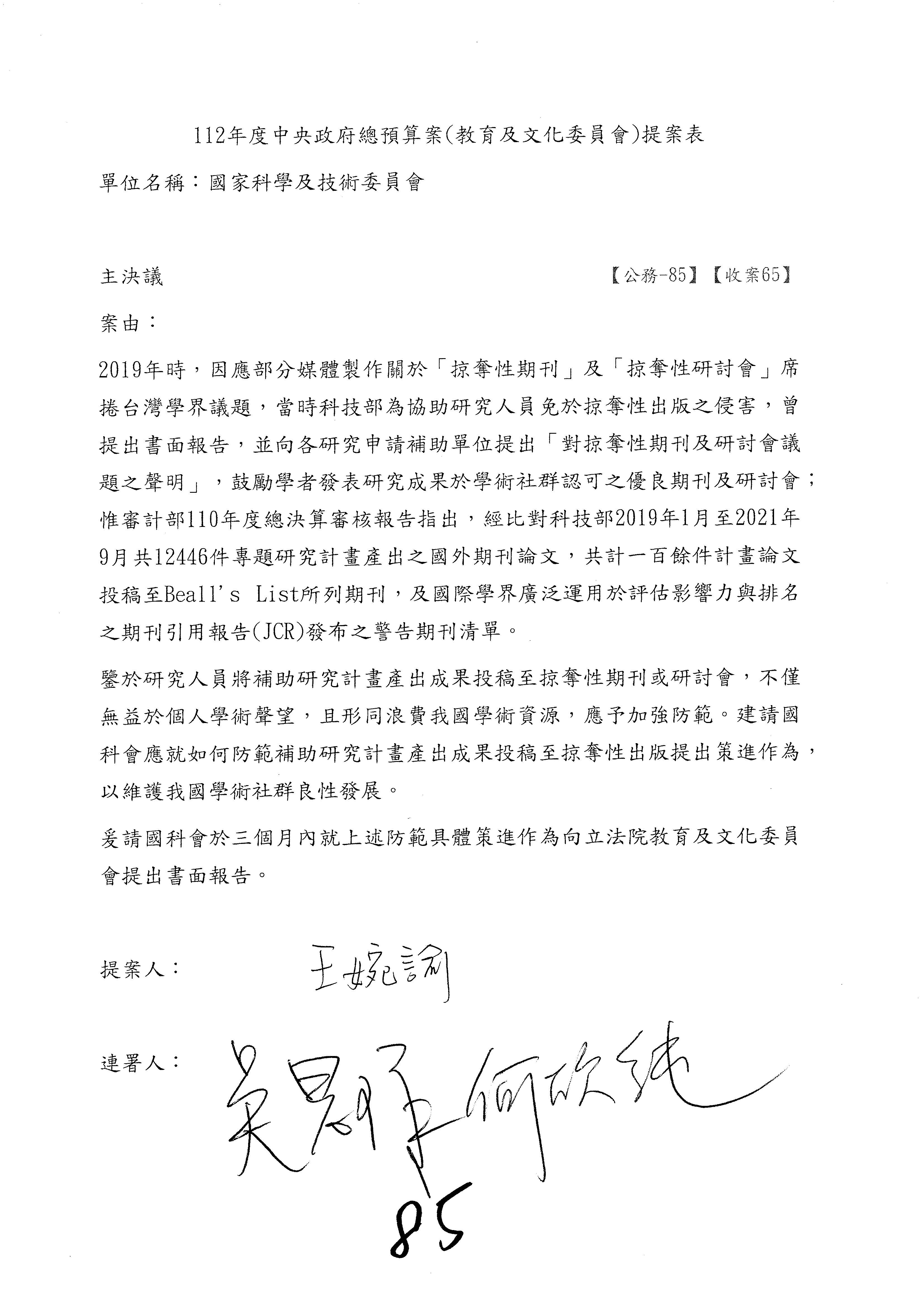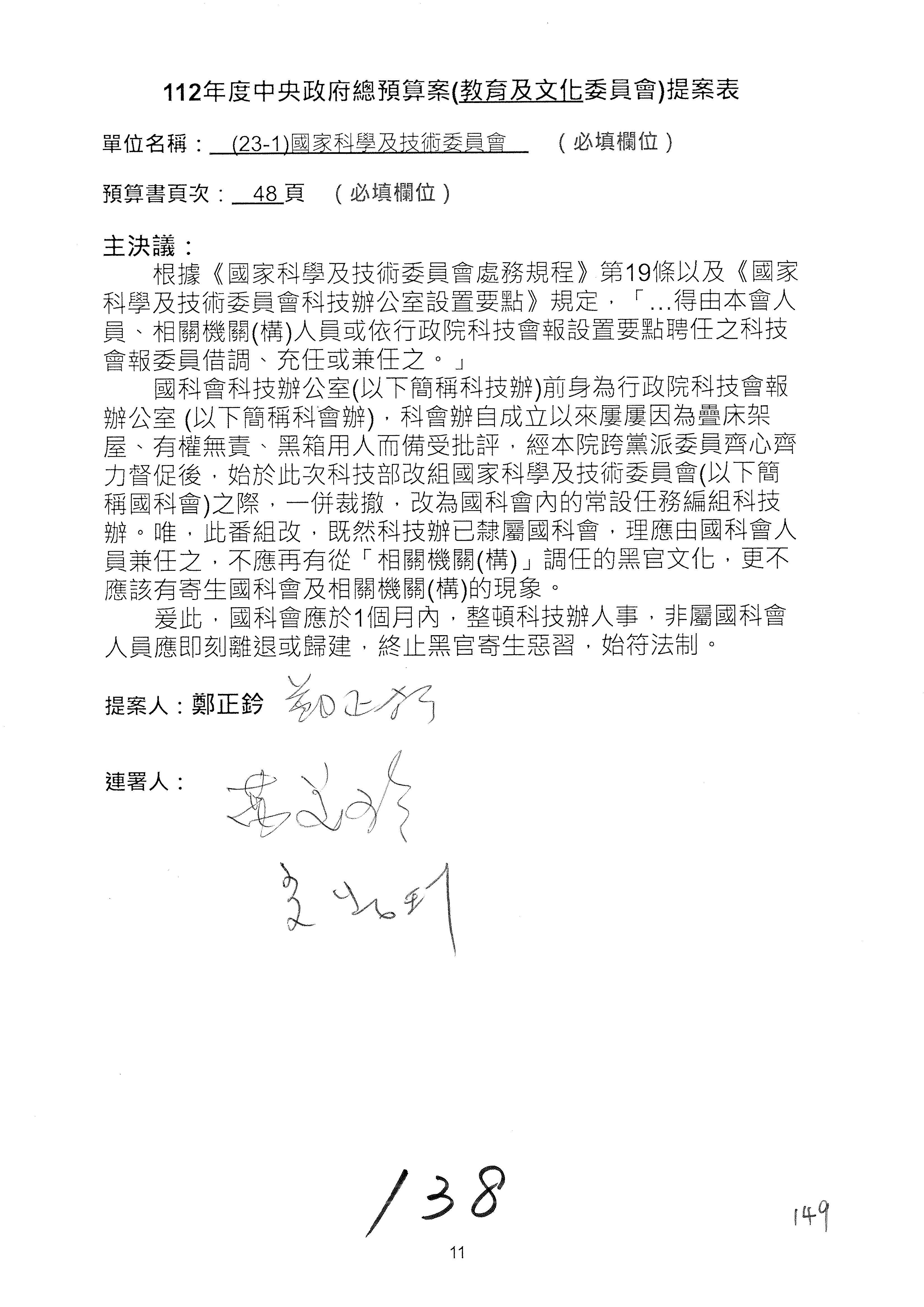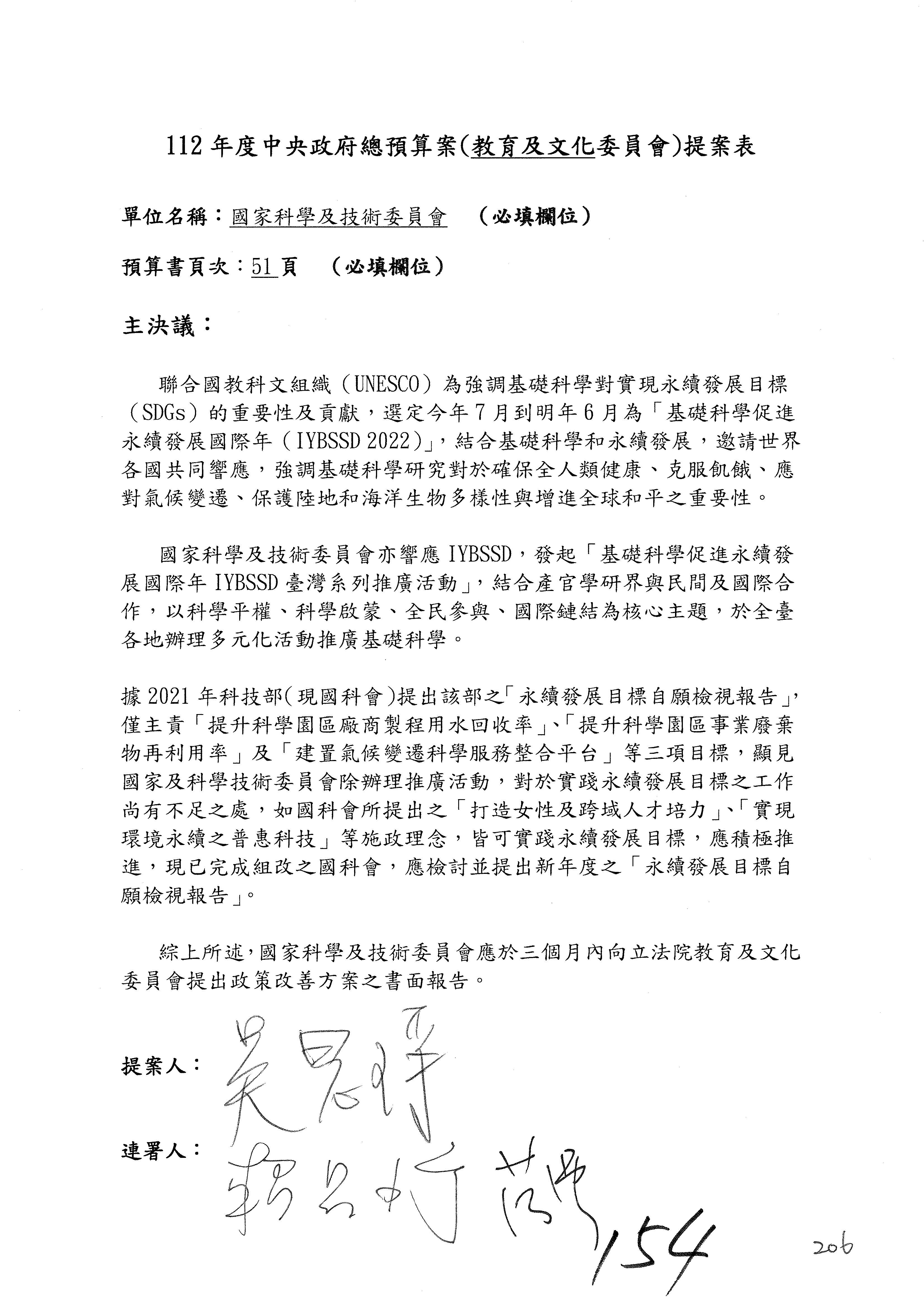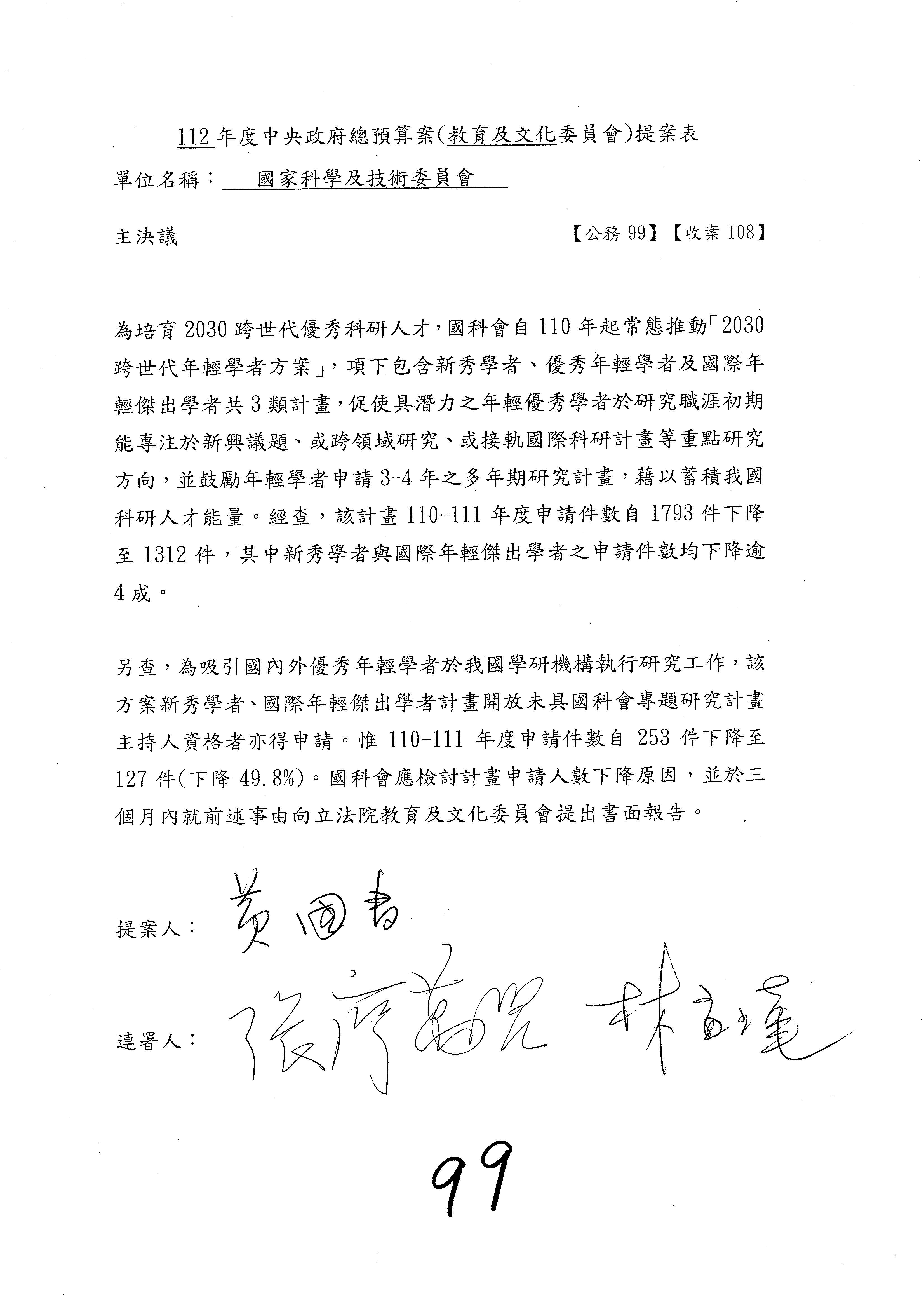 一、繼續審查112年度中央政府總預算案有關國家科學及技術委員會與所屬單位預算案。