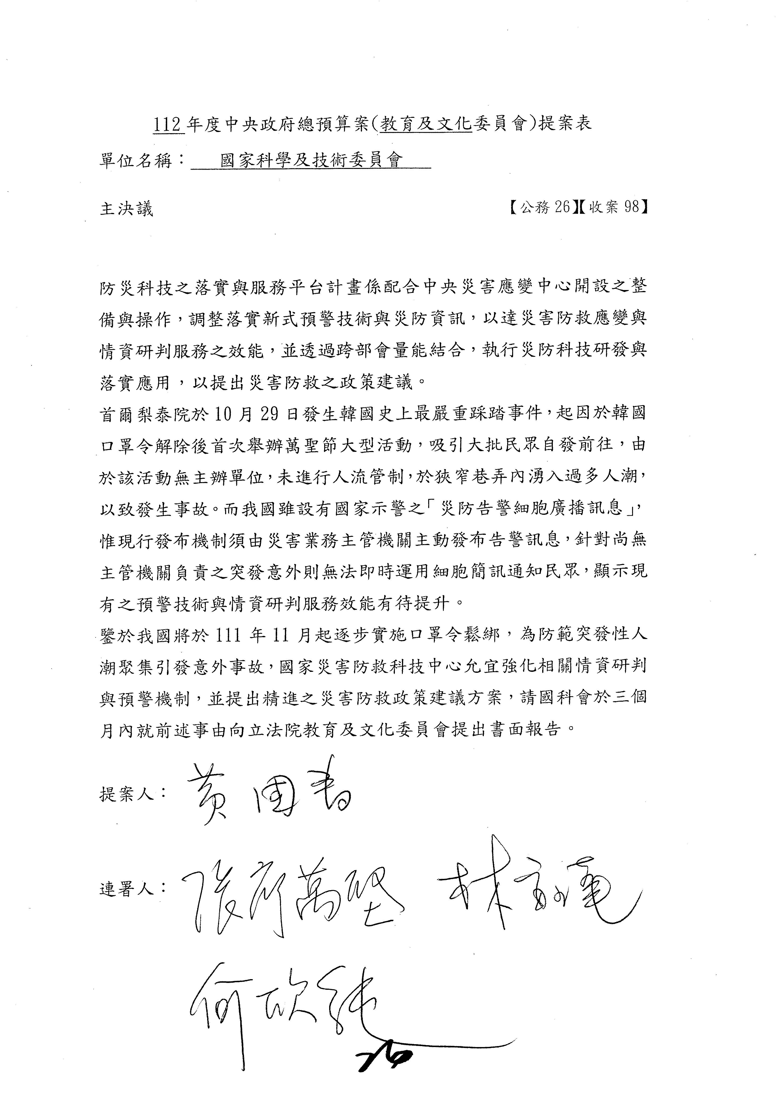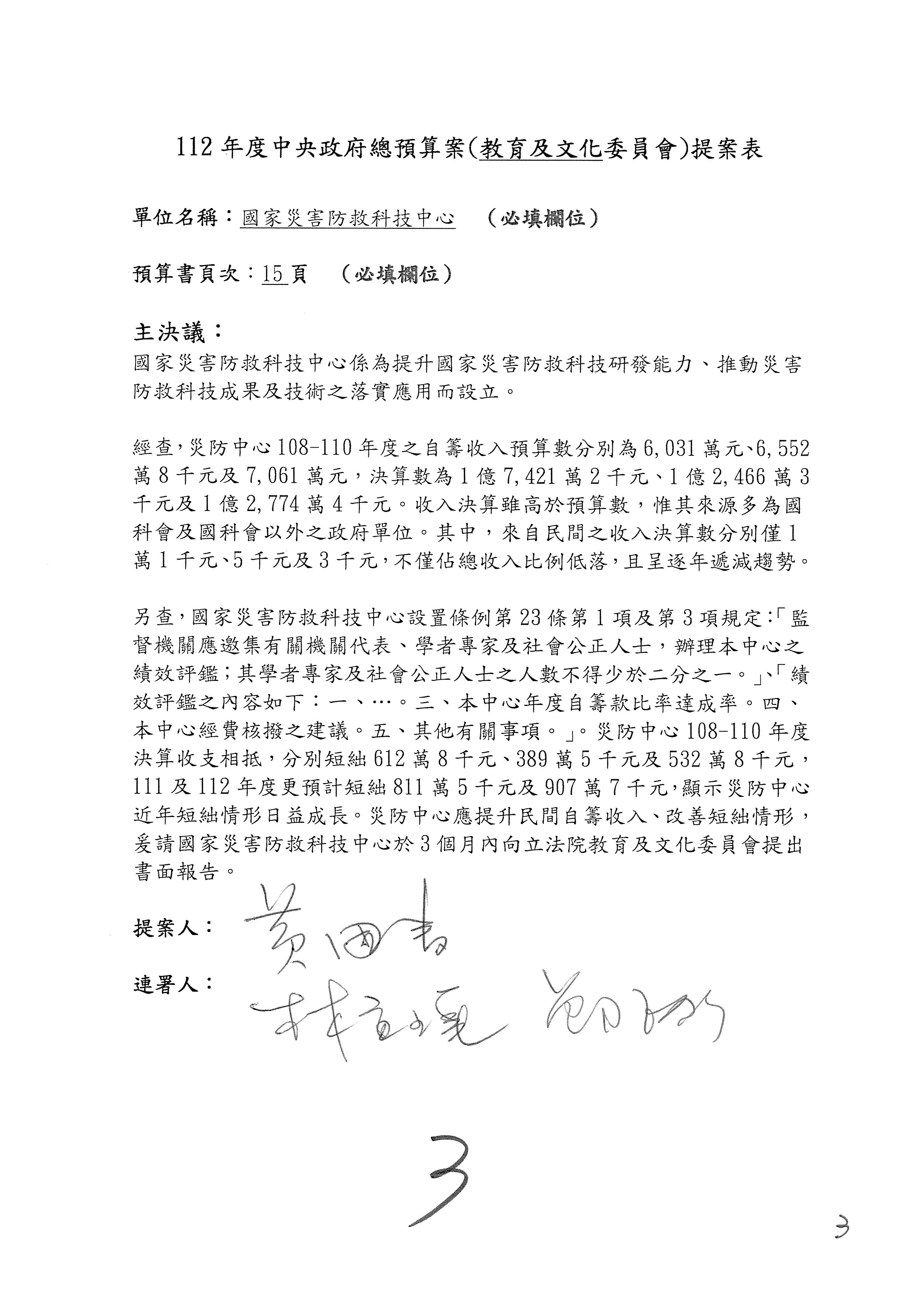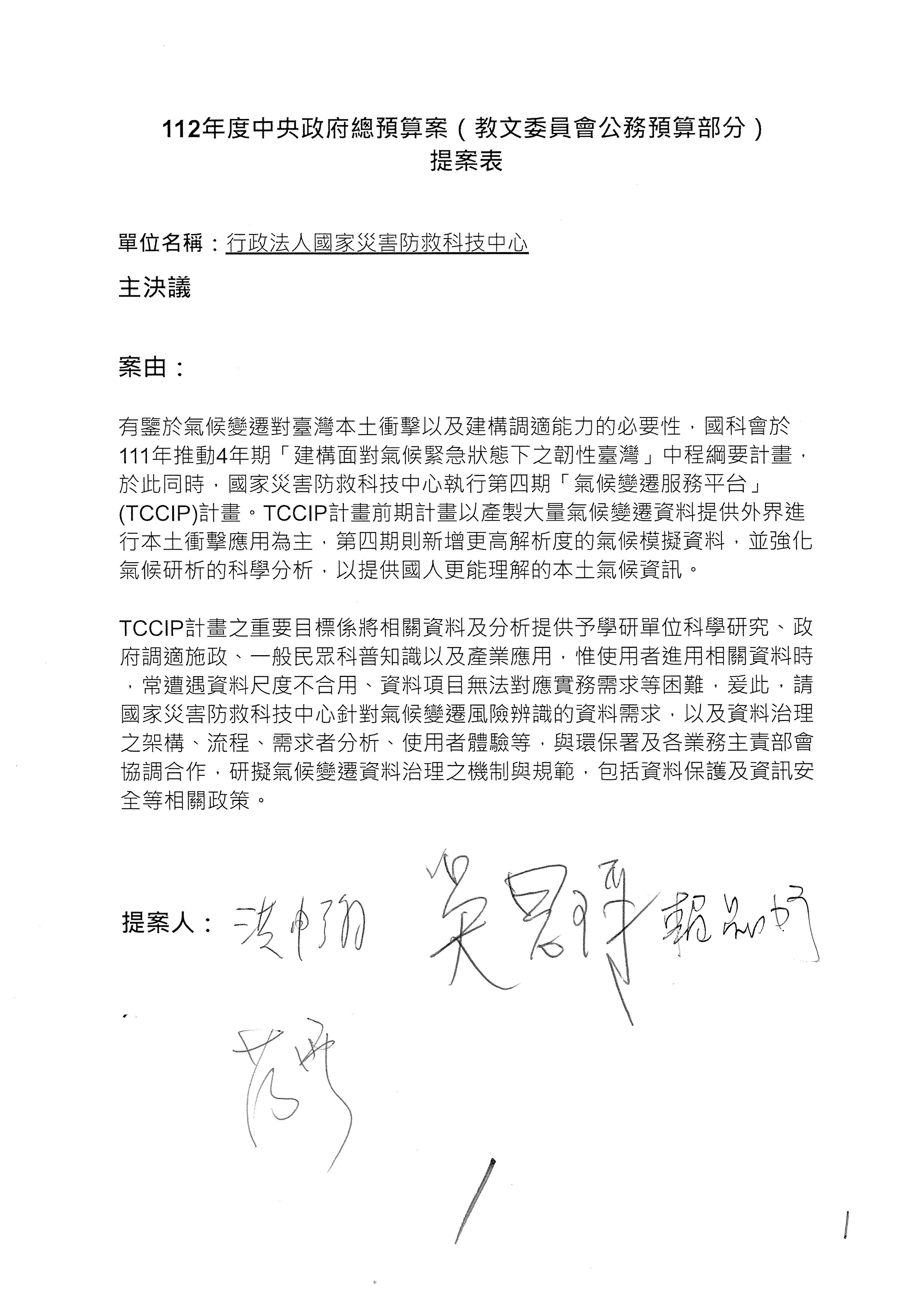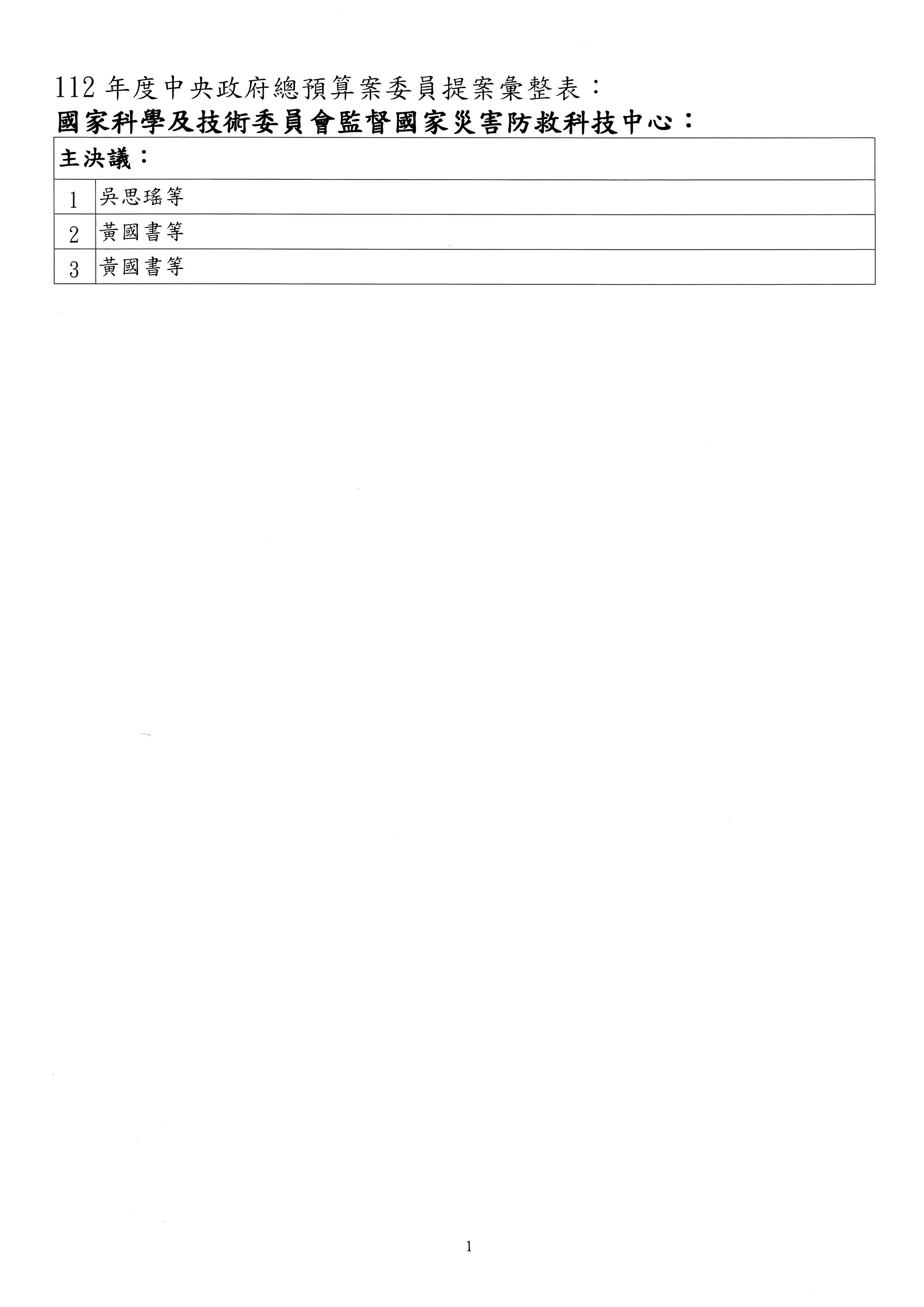 接下來處理國家科學及技術委員會監督國家災害防救科技中心預算,有三個主決議,這三個主決議都是照案通過,請問各位有沒有什麼意見?