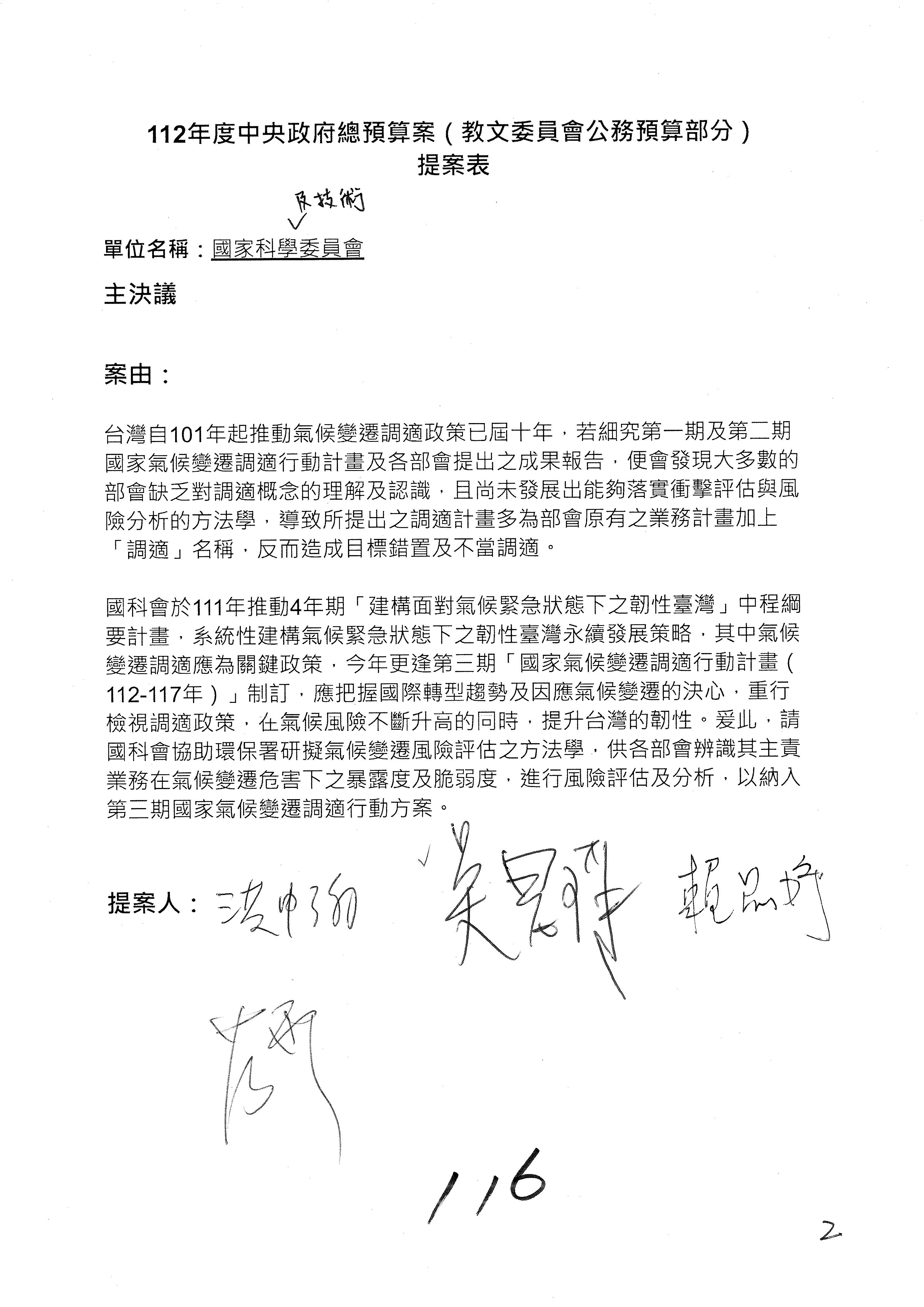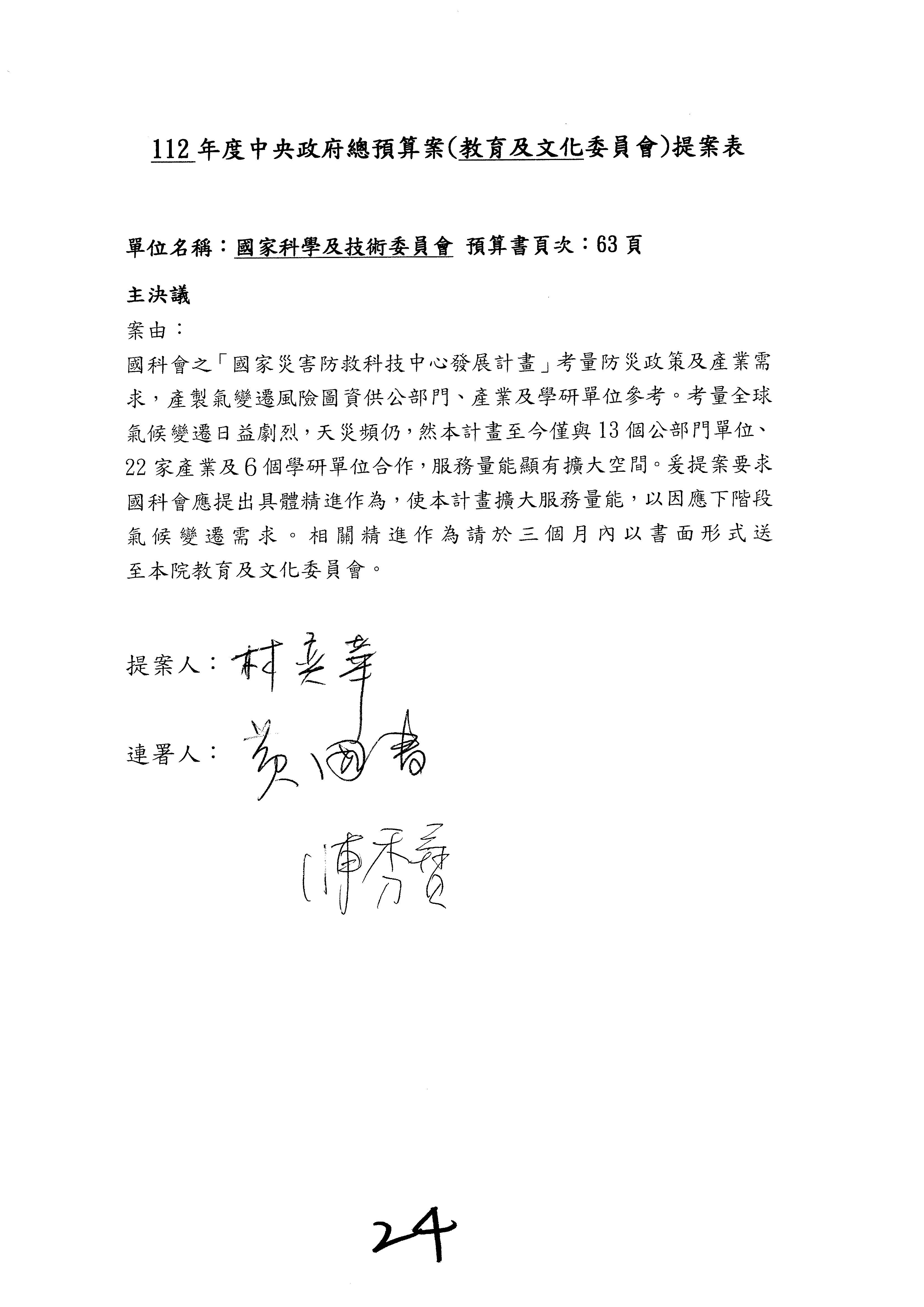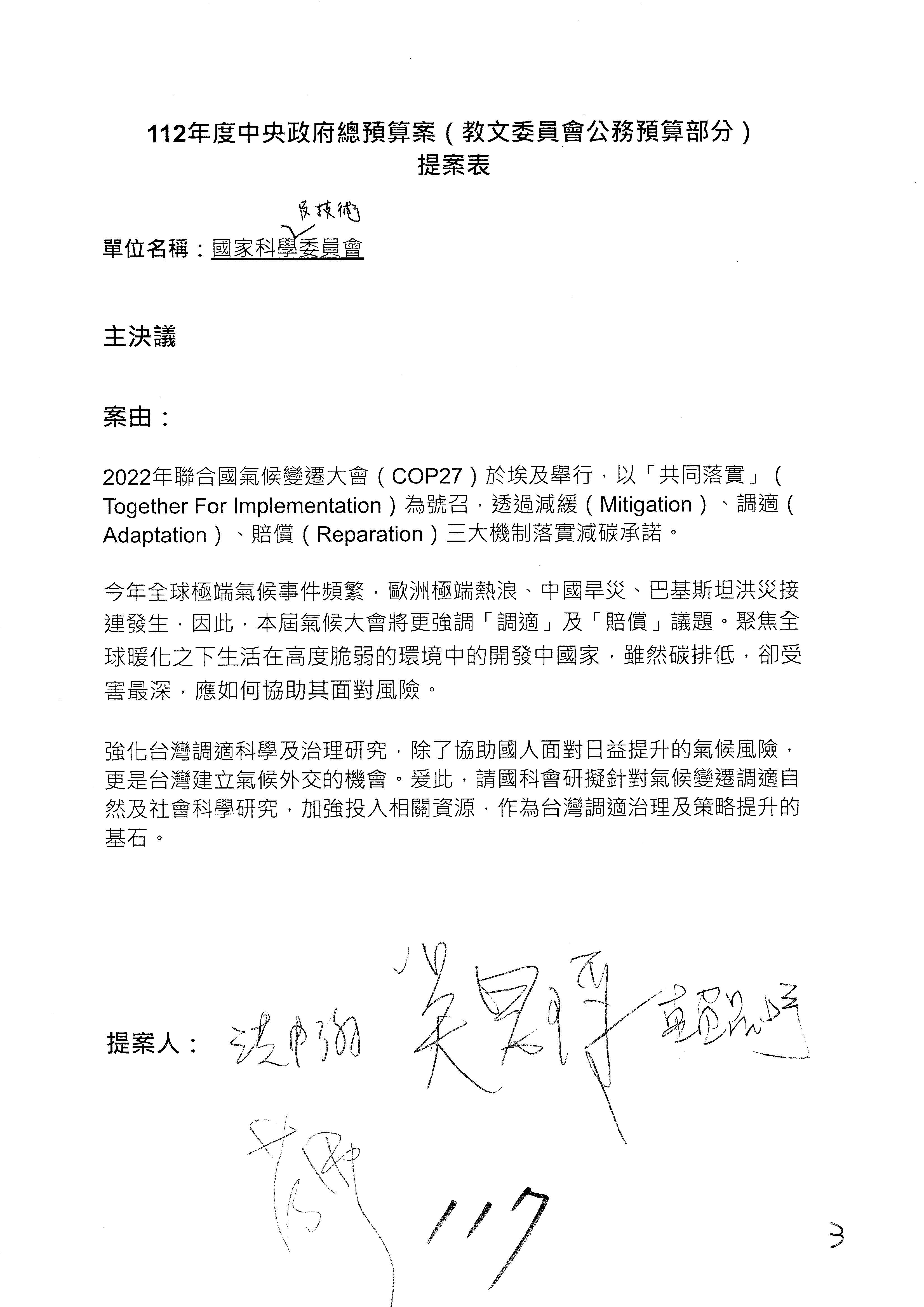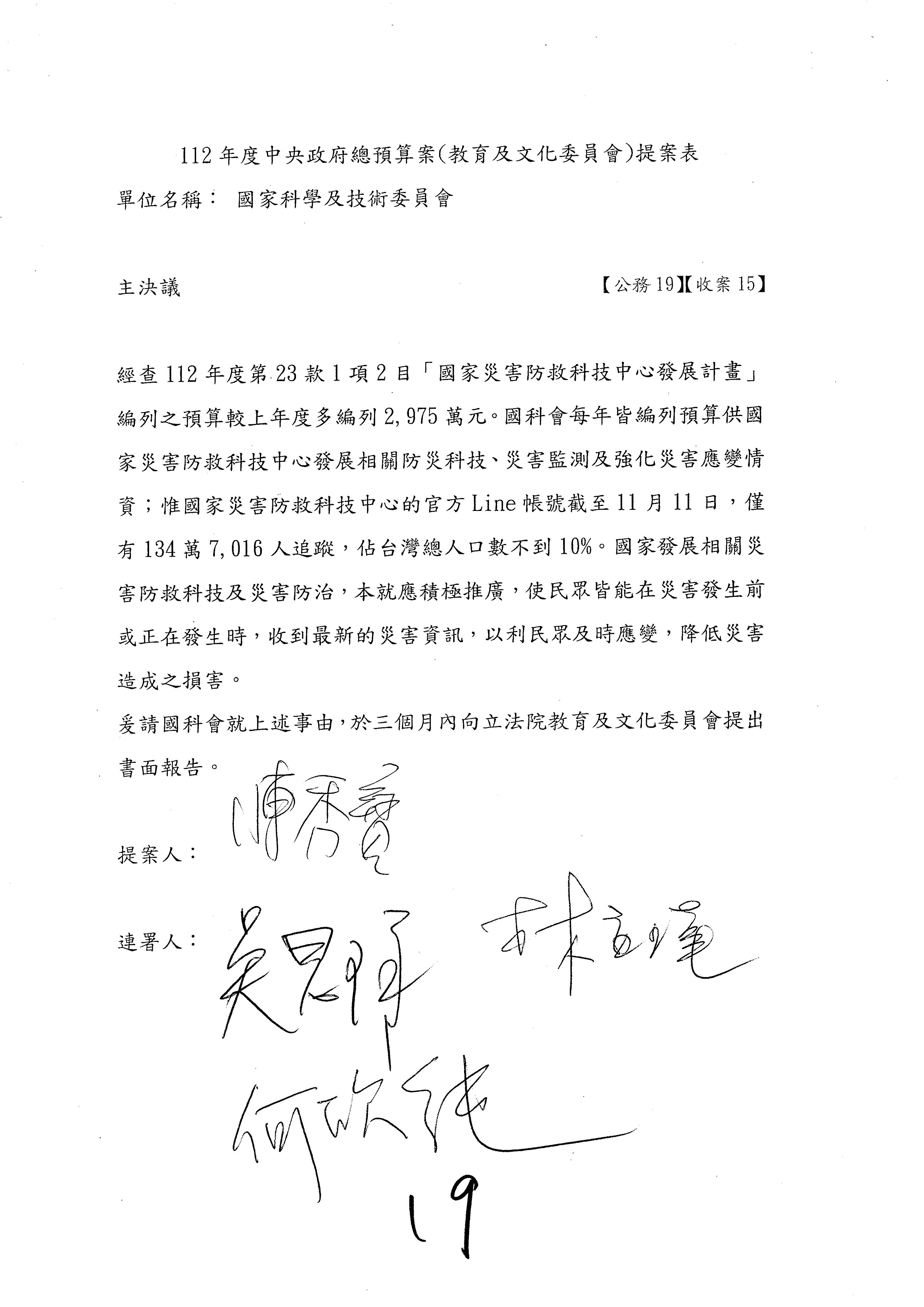 接下來處理國家科學及技術委員會監督國家災害防救科技中心預算,有三個主決議,這三個主決議都是照案通過,請問各位有沒有什麼意見?