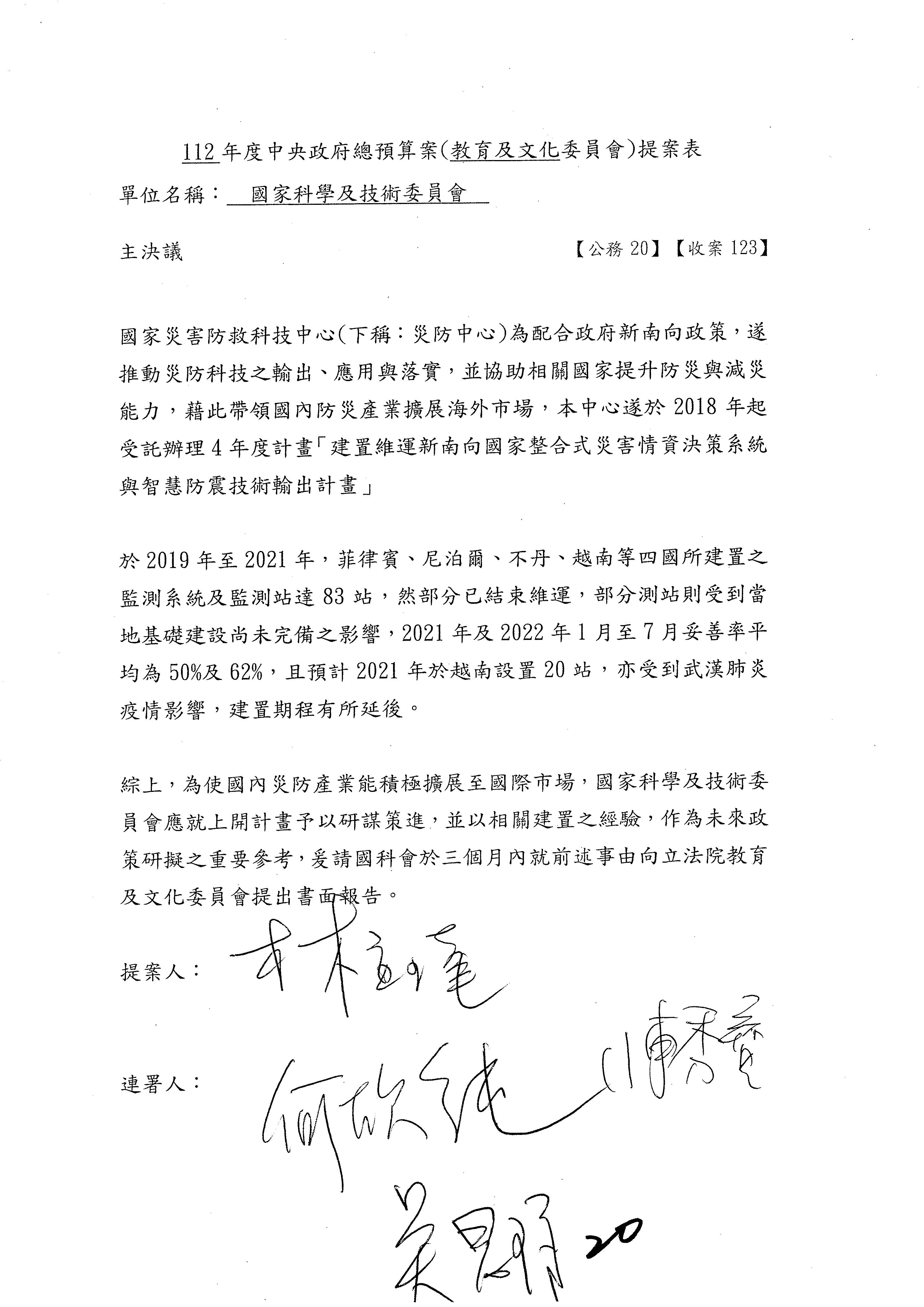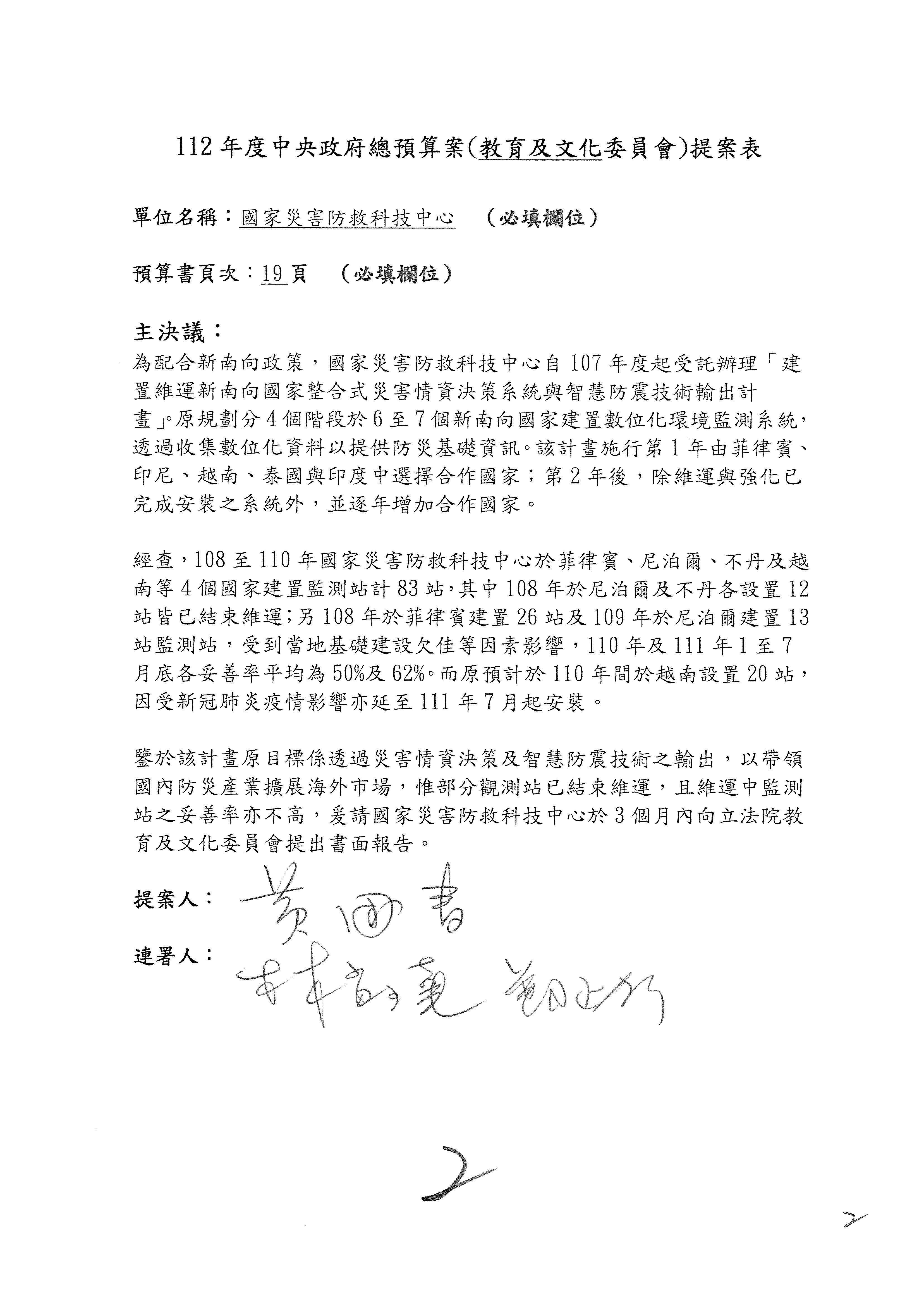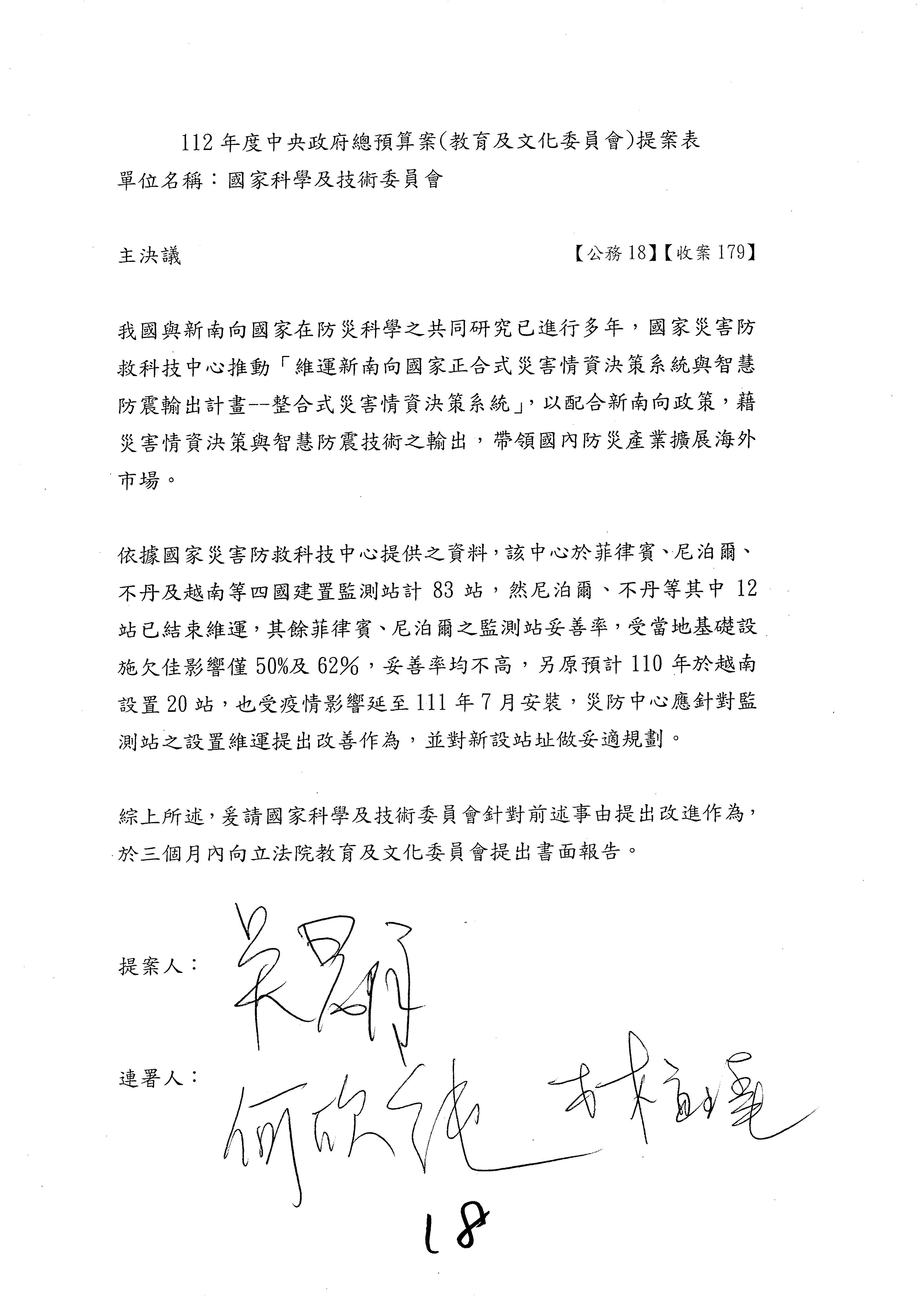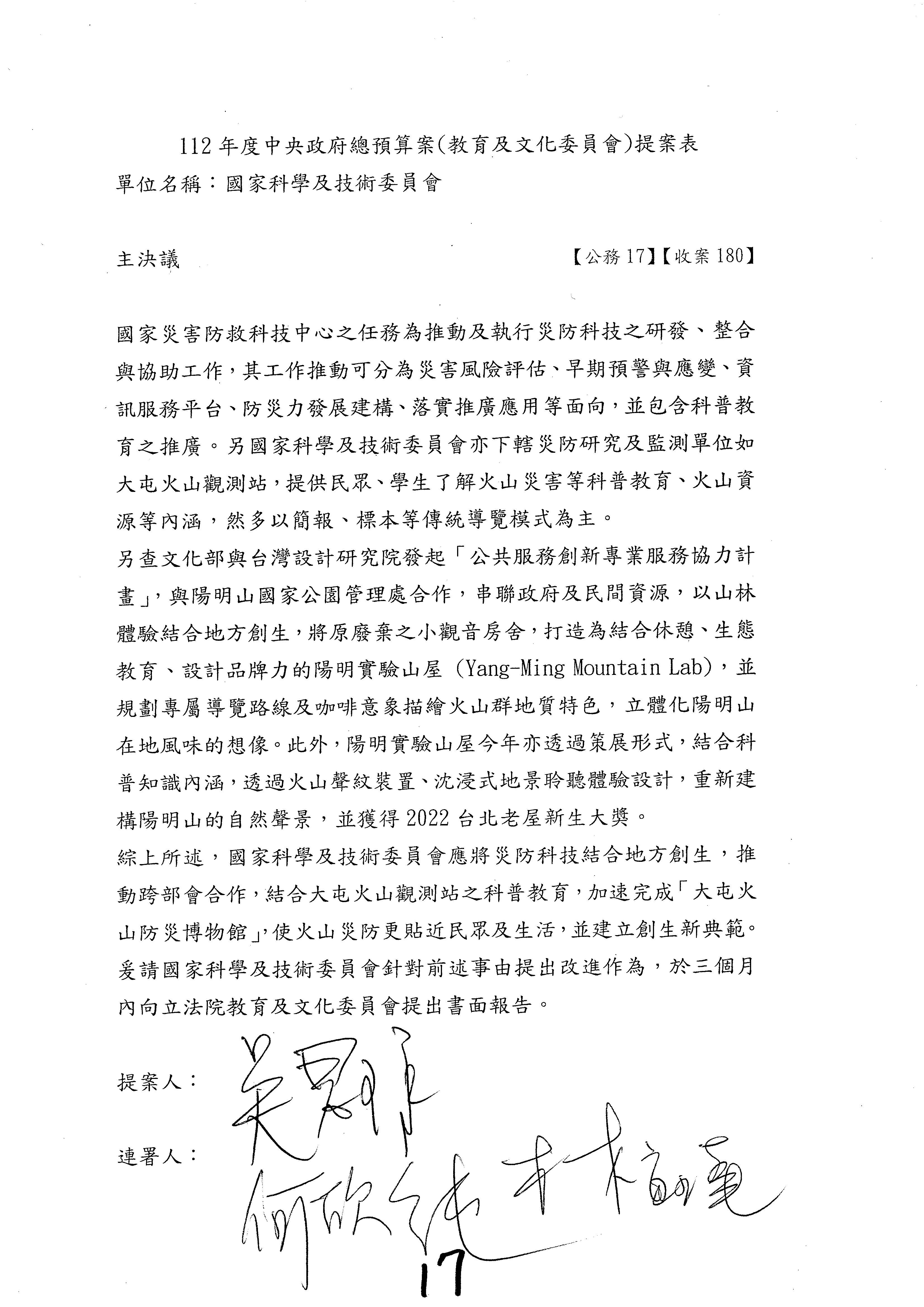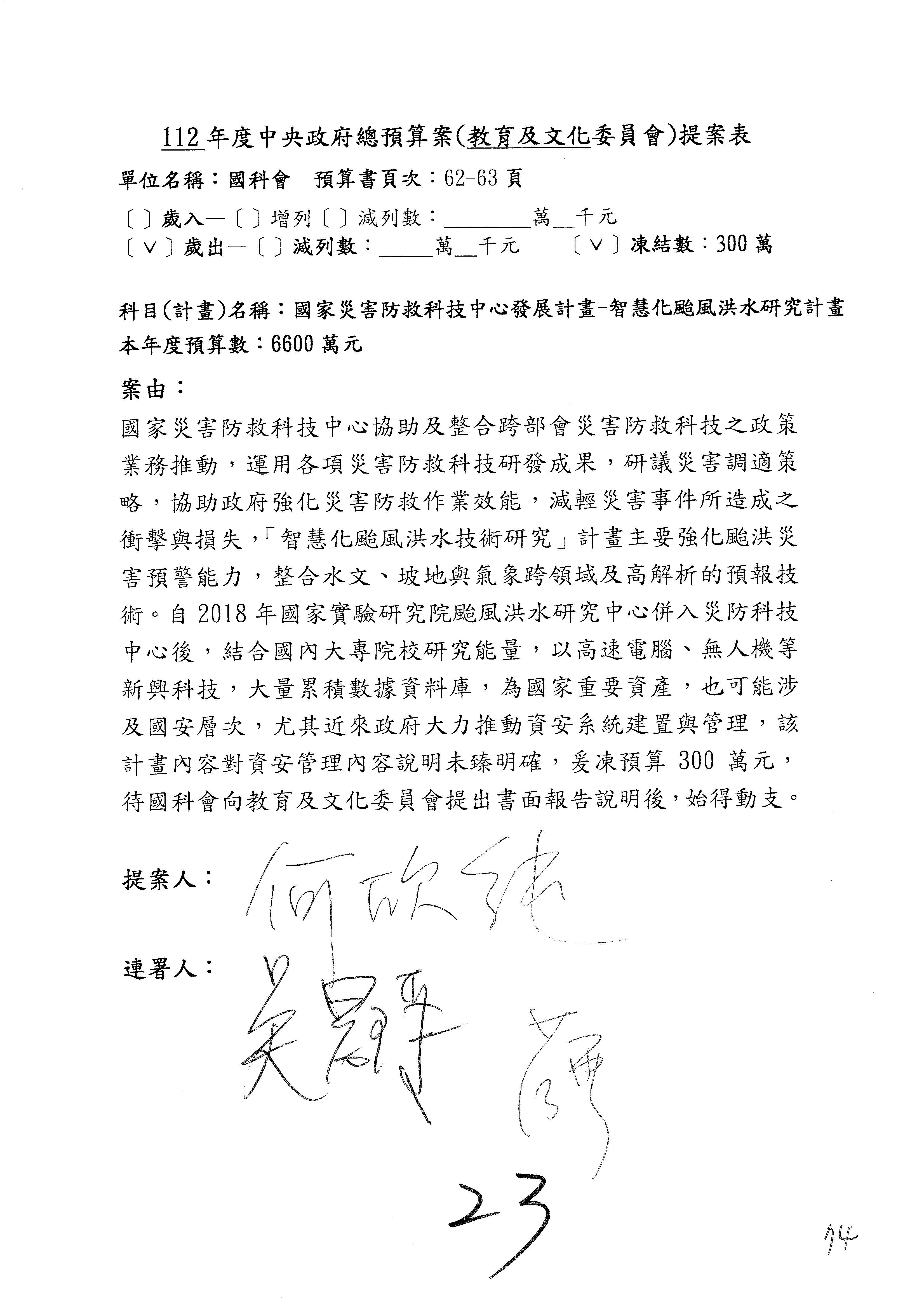 接下來處理國家科學及技術委員會監督國家災害防救科技中心預算,有三個主決議,這三個主決議都是照案通過,請問各位有沒有什麼意見?