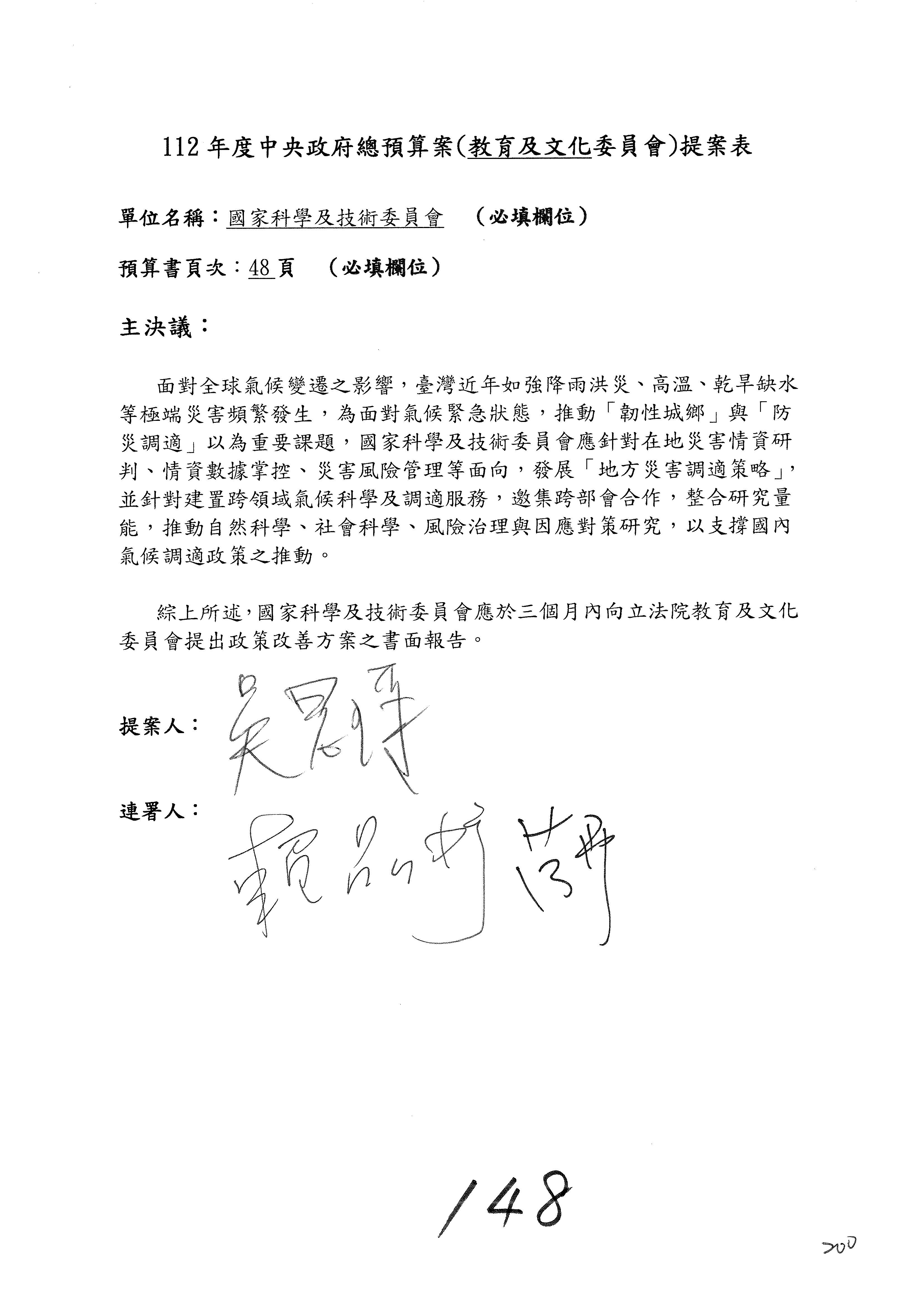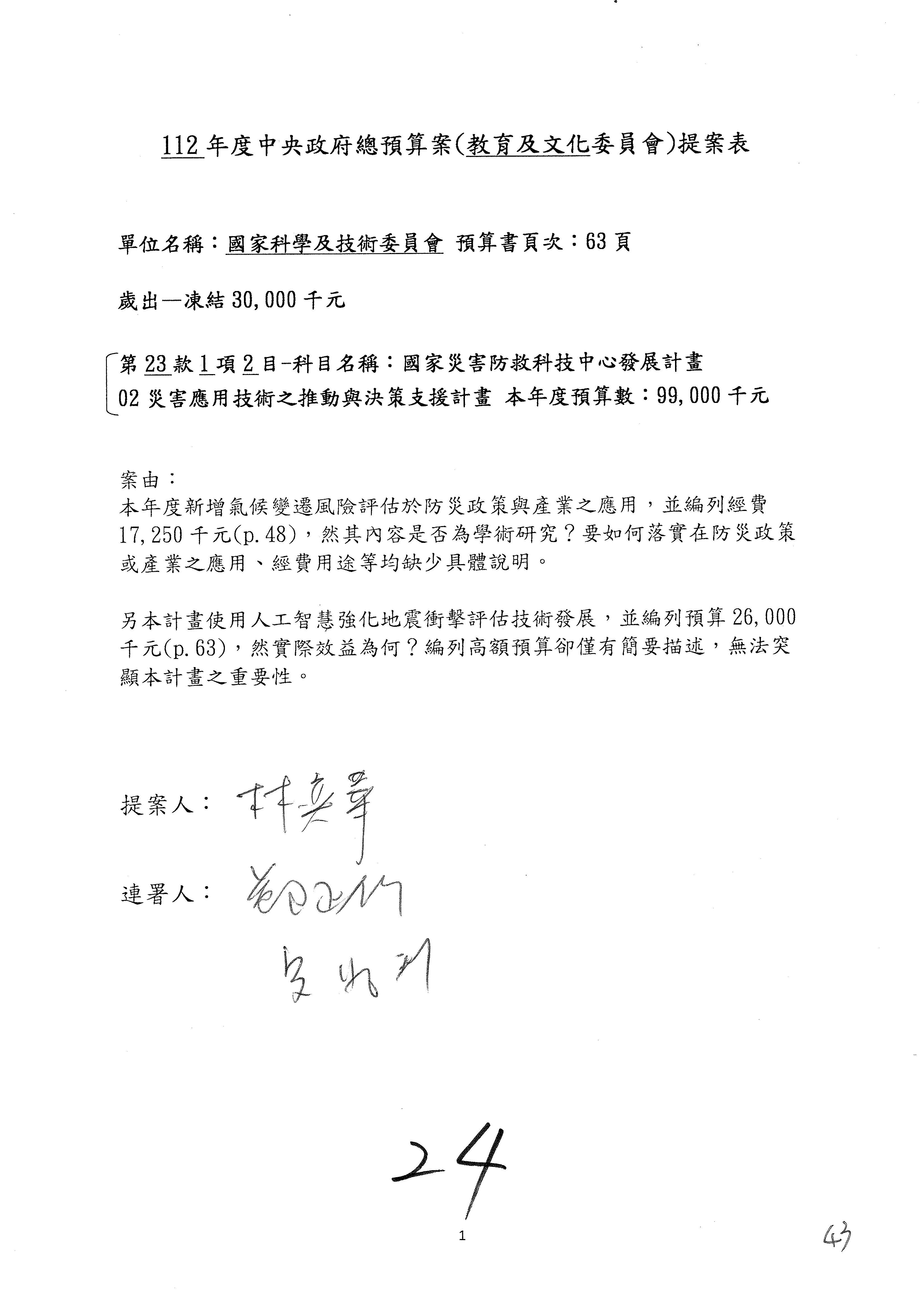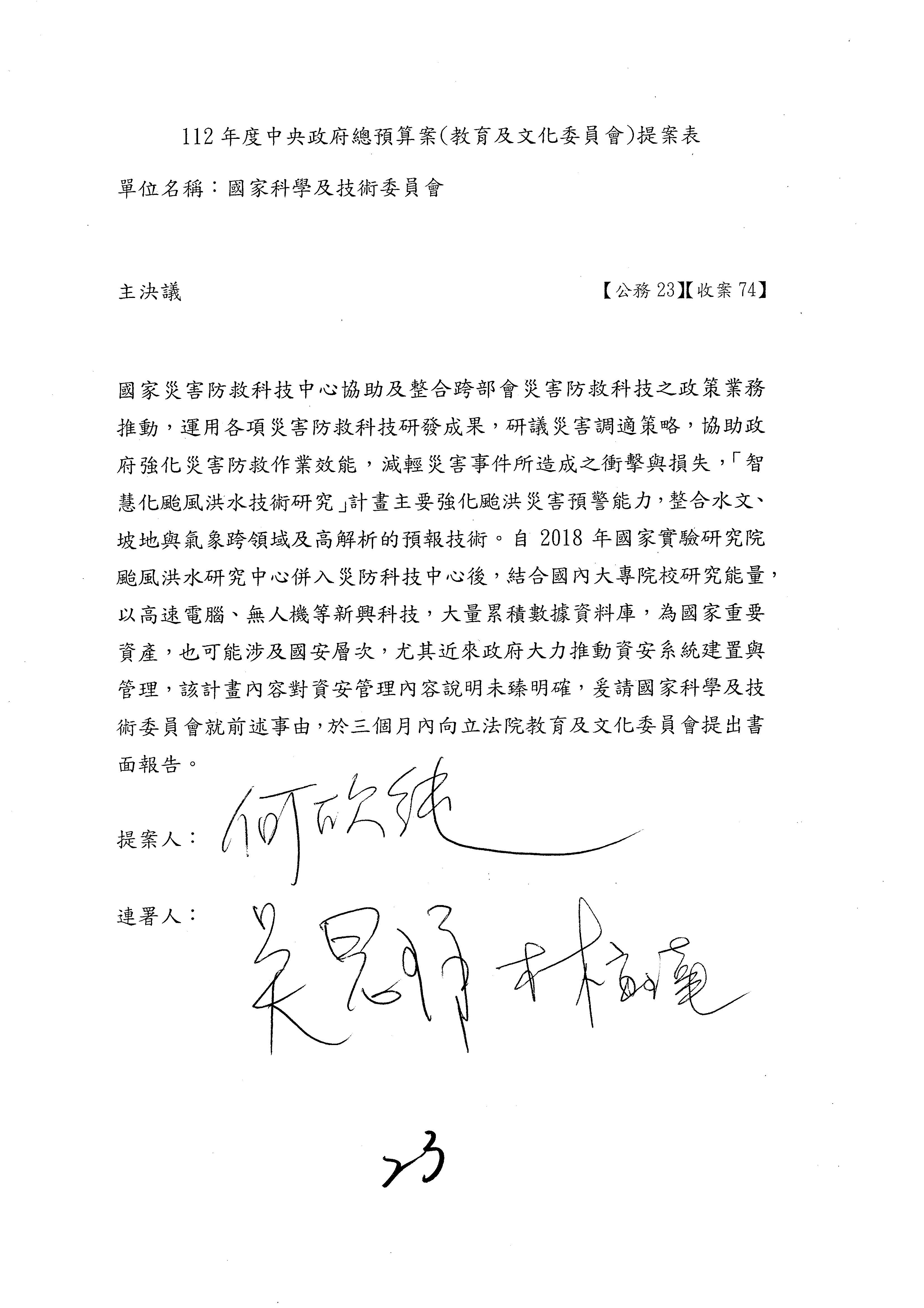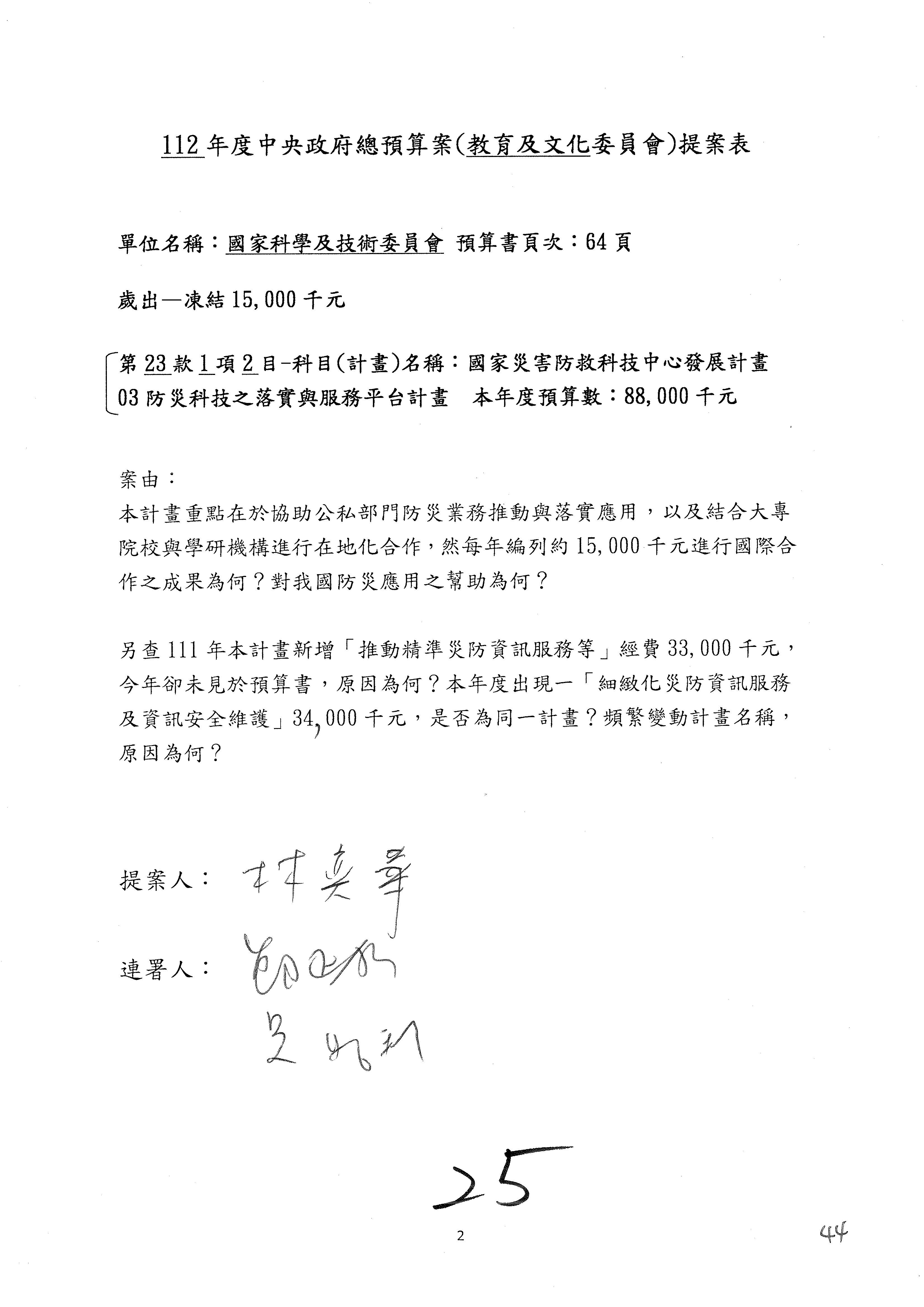 接下來處理國家科學及技術委員會監督國家災害防救科技中心預算,有三個主決議,這三個主決議都是照案通過,請問各位有沒有什麼意見?