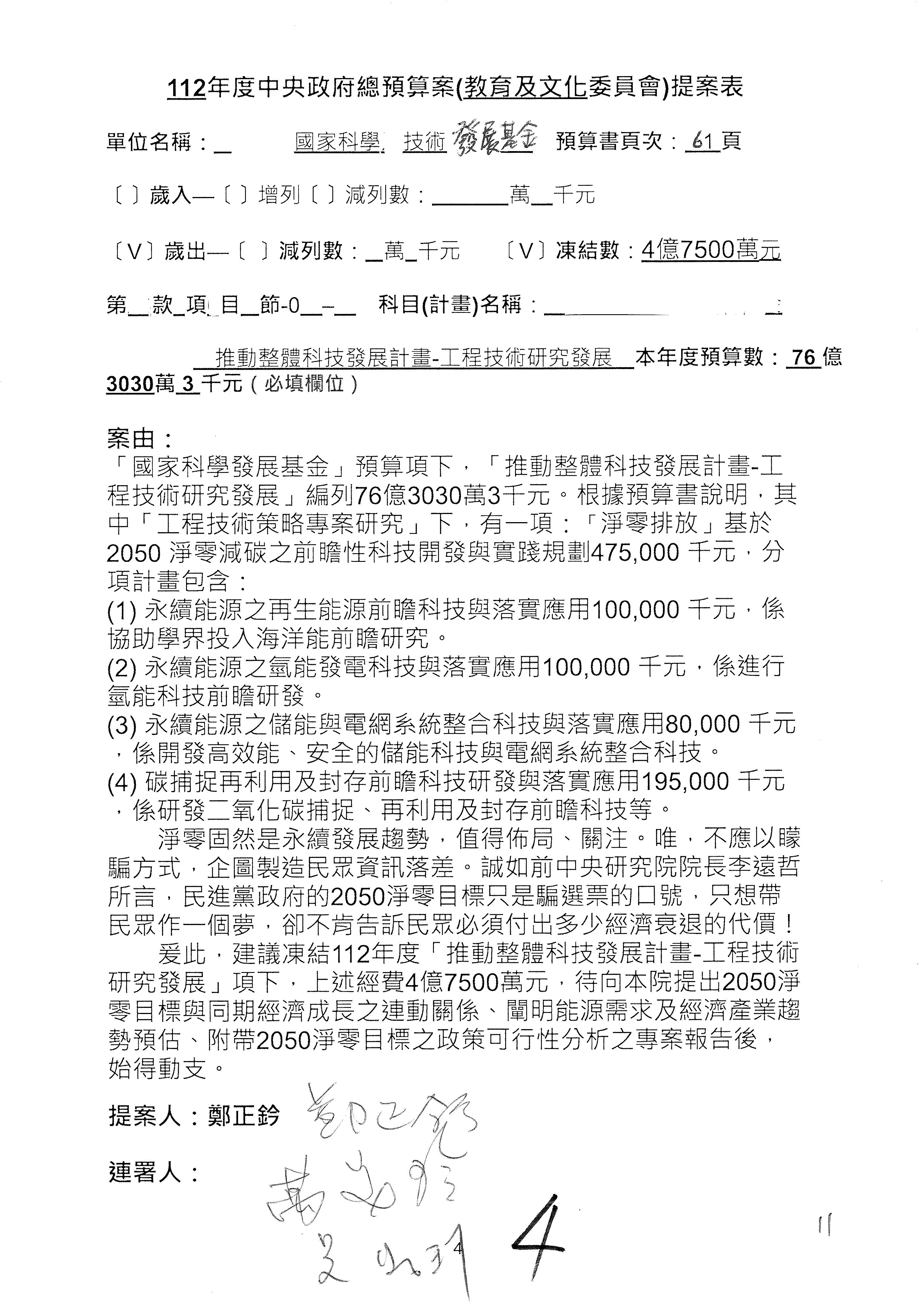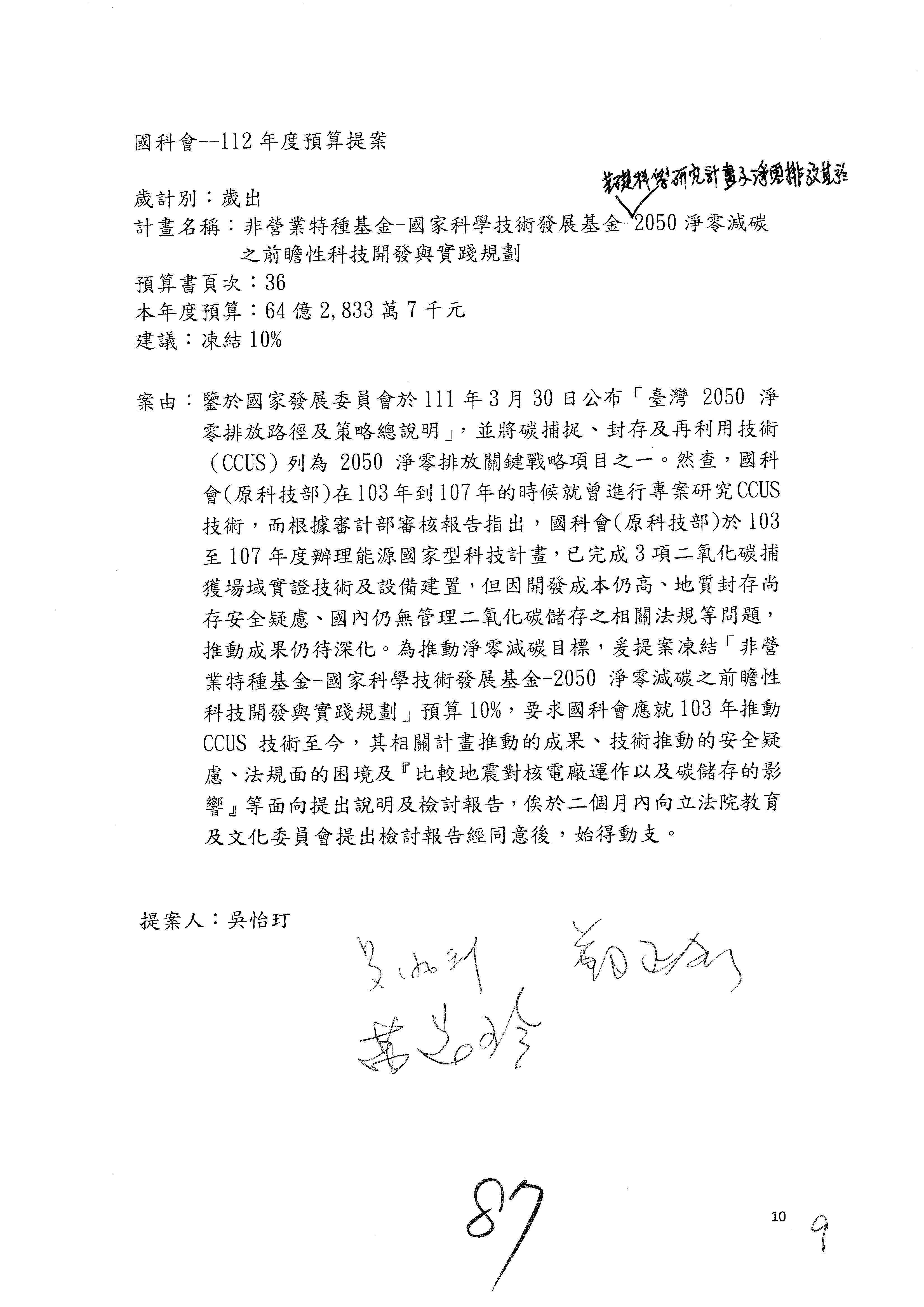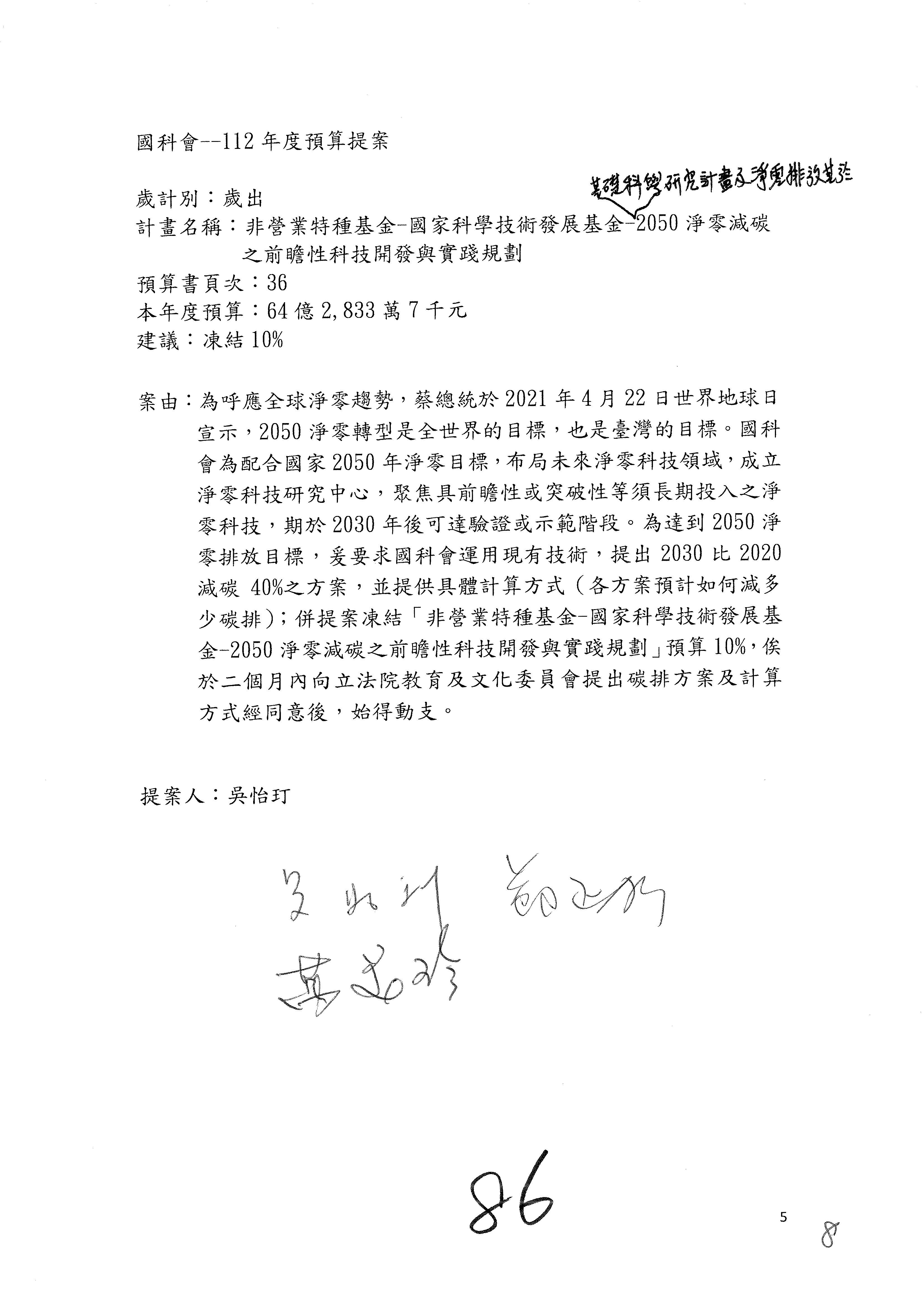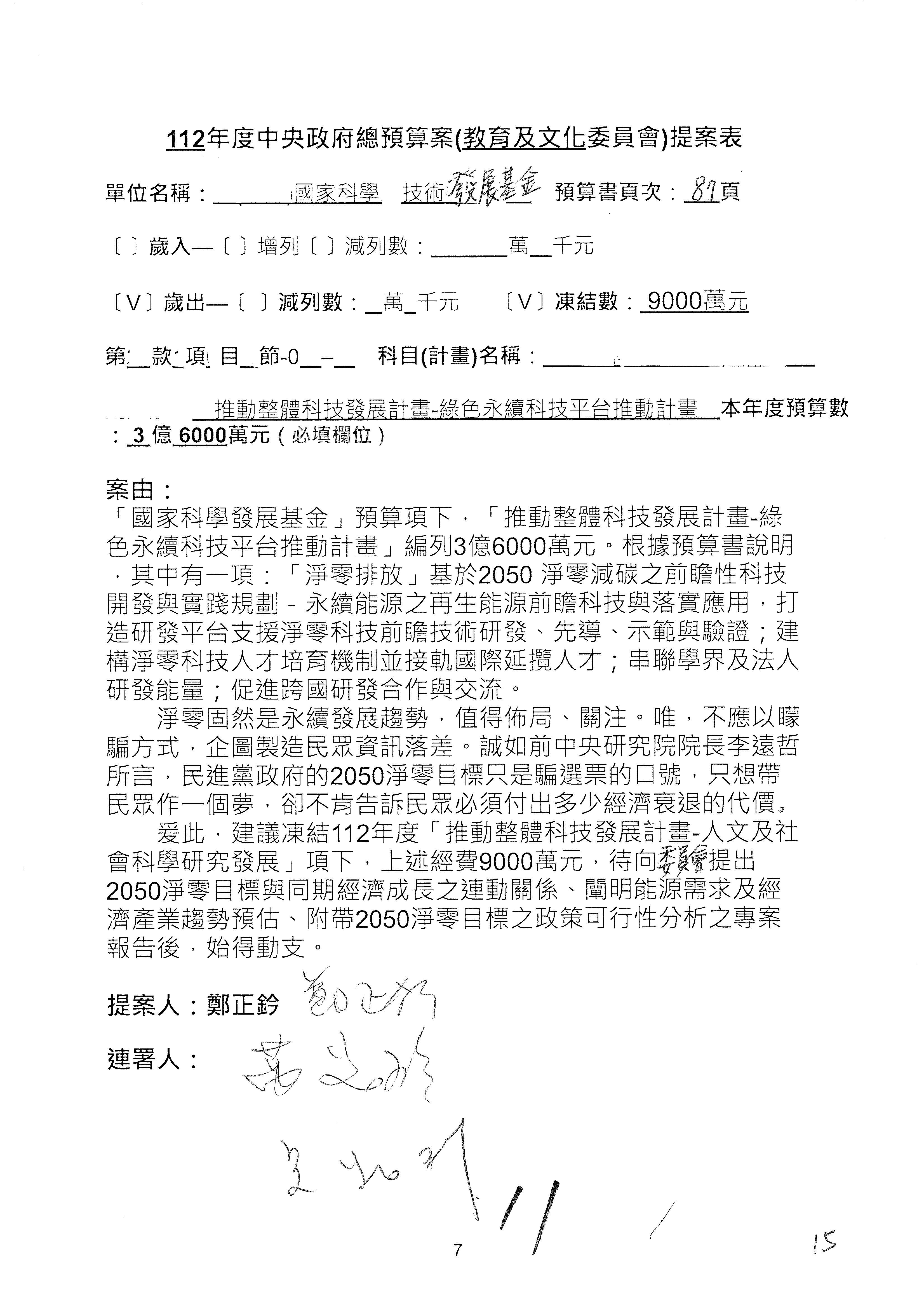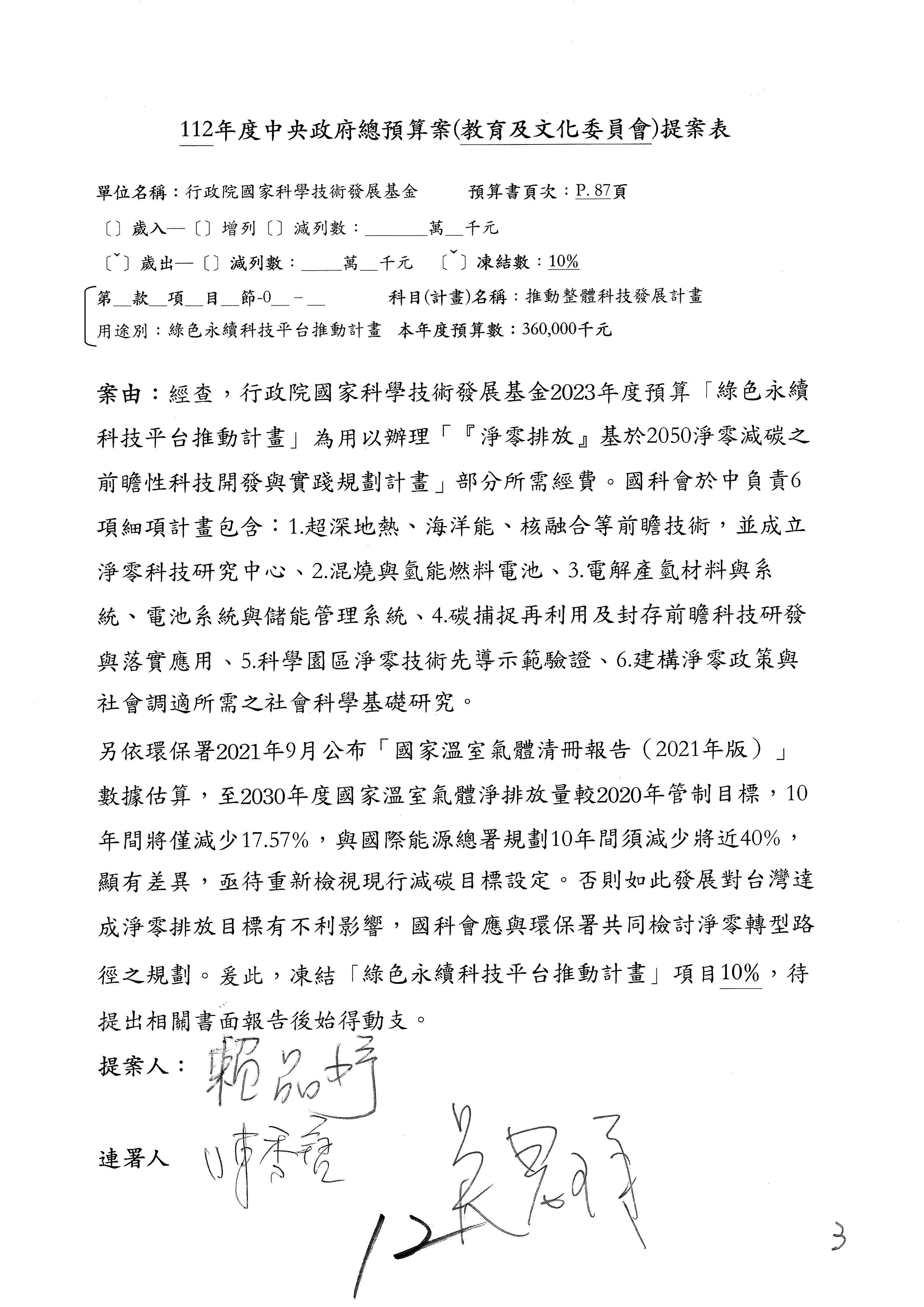 這個部分本席有提案,就是第3案、第4案、第7案、第9案及第11案,基本上都跟2050淨零排放有關,因為整個政府在淨零排放相關政策上,其實並沒有那麼完整,所以我們希望能一個有更清楚的相關計畫跟說明,然後才能動用。因為那些都是相關的,我就不逐一就個案進行說明了,原則上我都有凍結一個相當的金額。