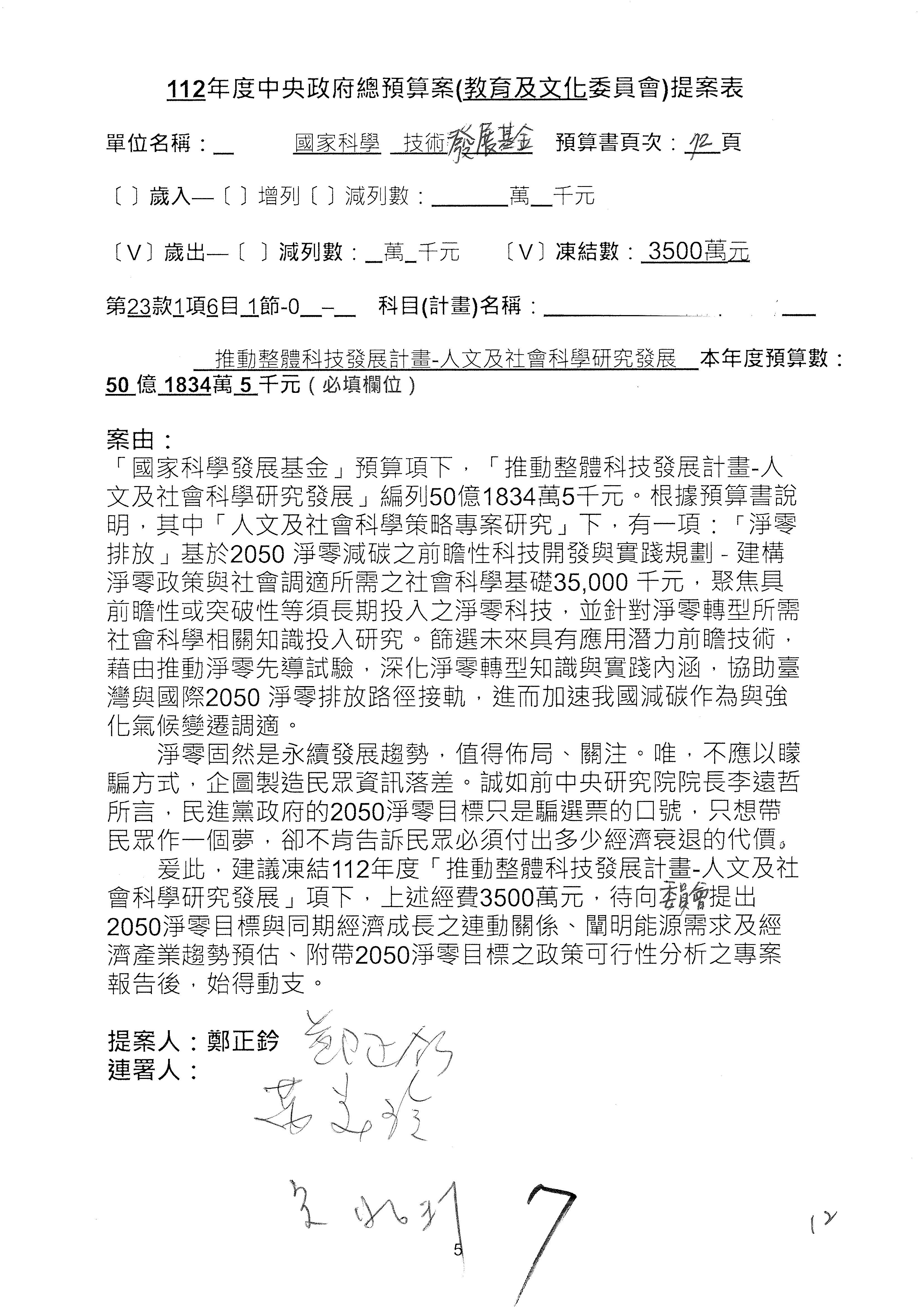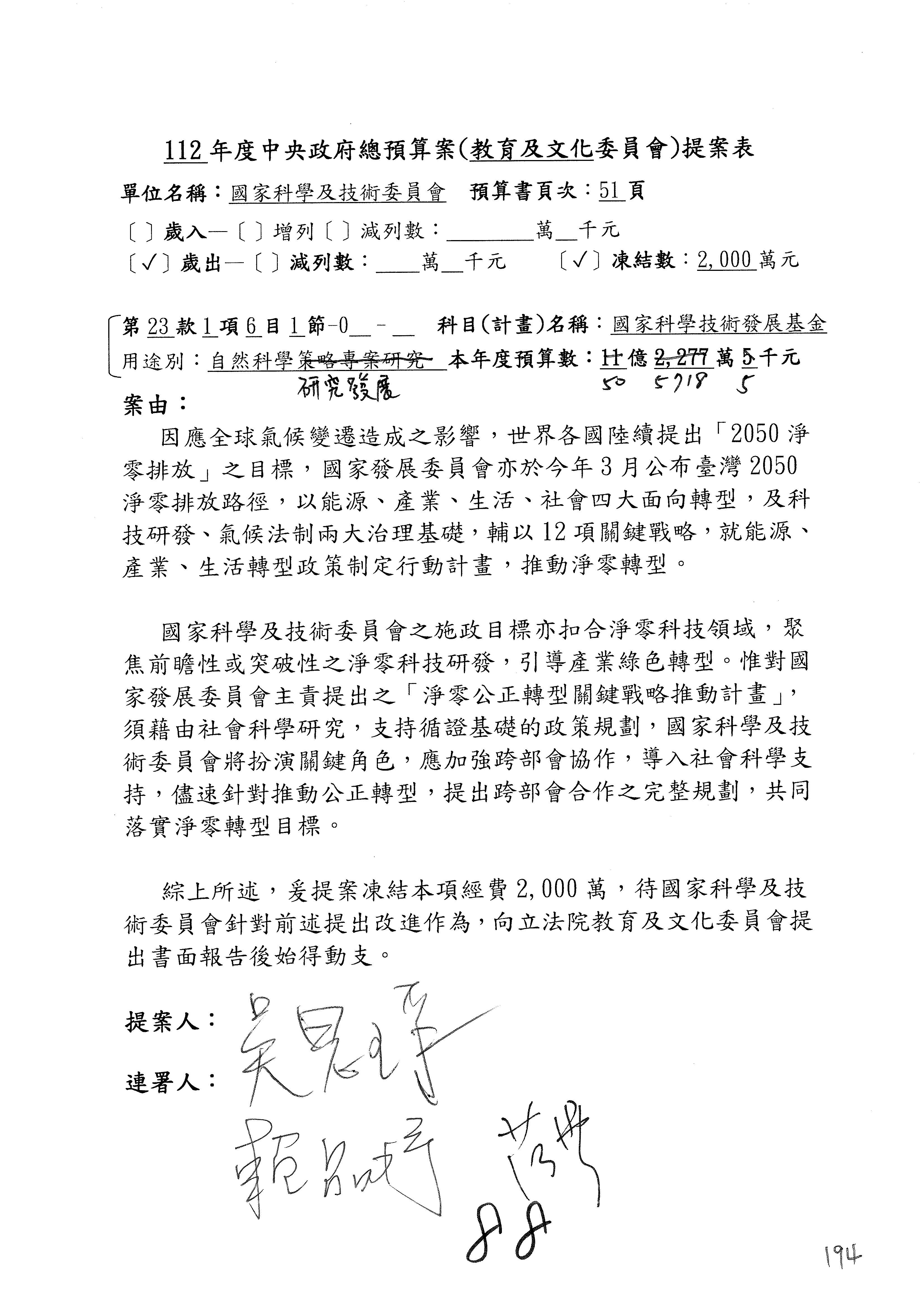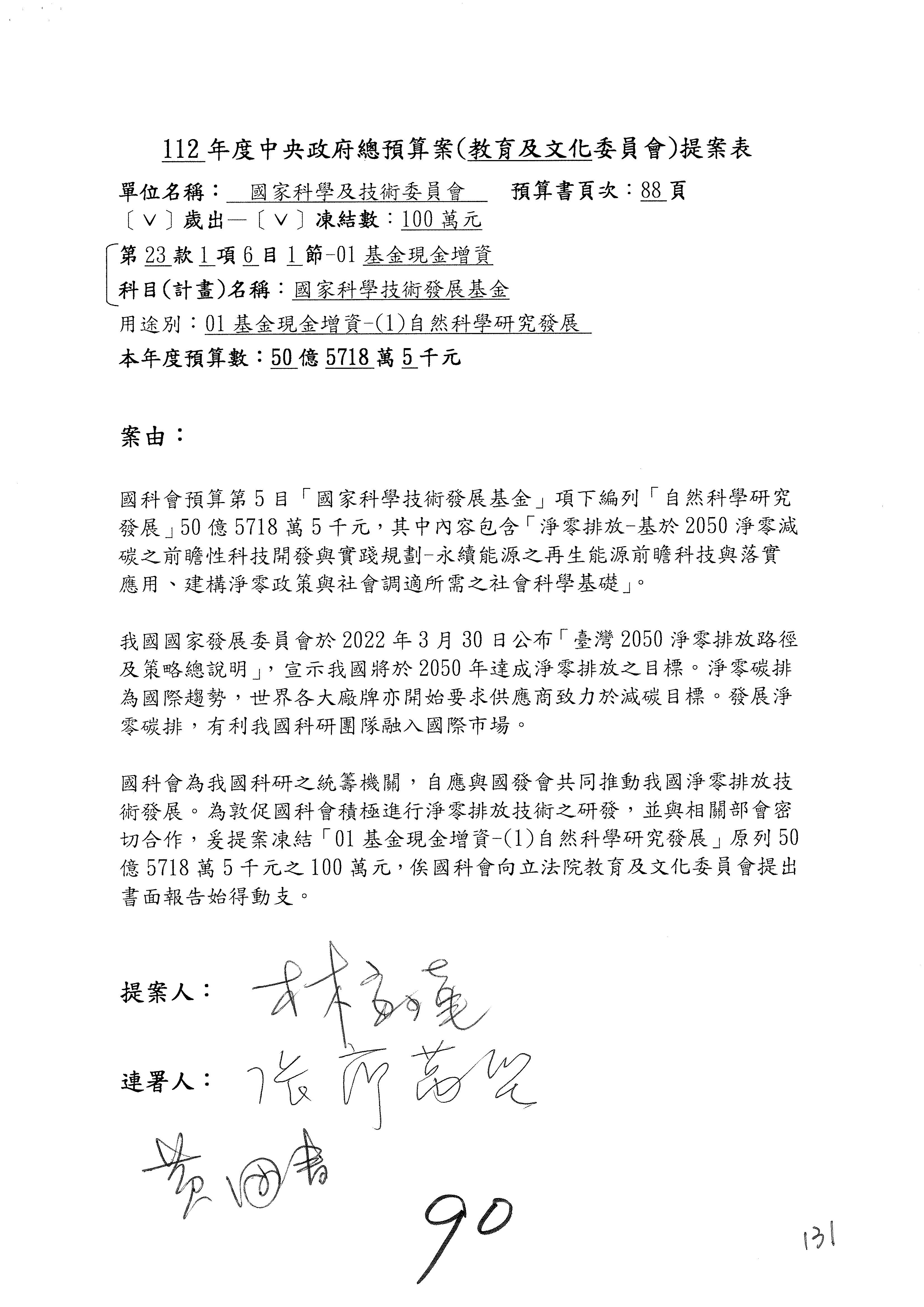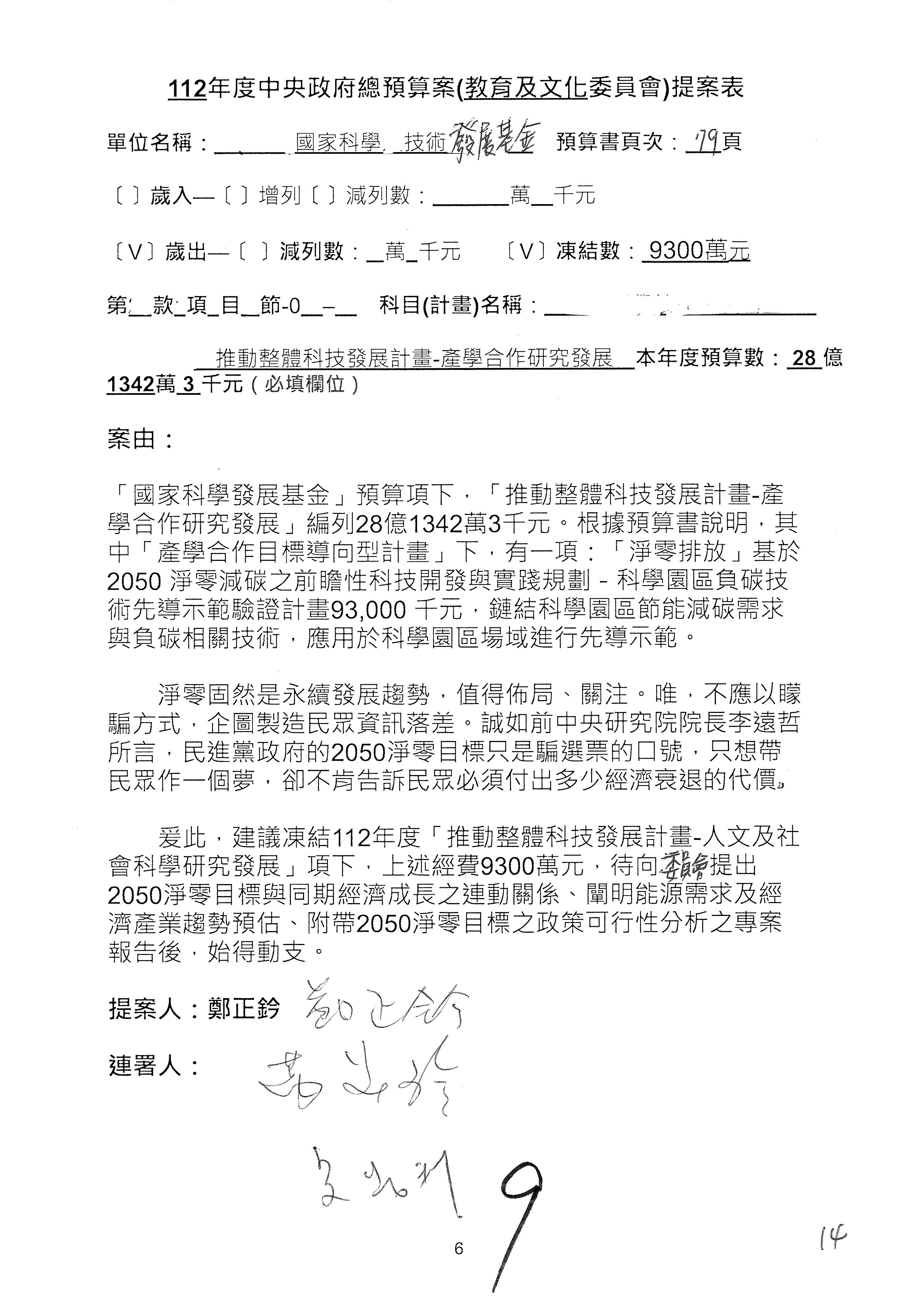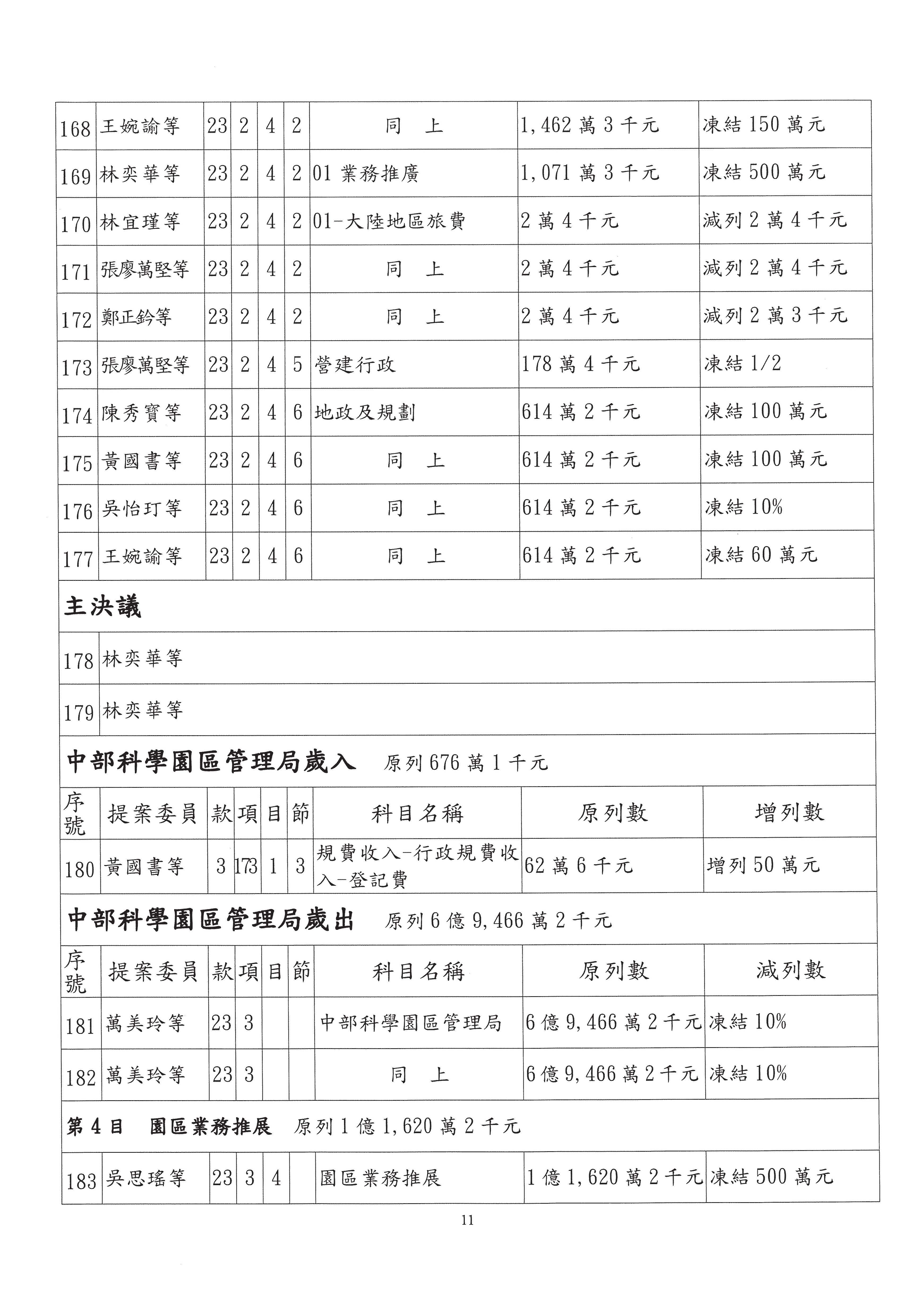 這個部分本席有提案,就是第3案、第4案、第7案、第9案及第11案,基本上都跟2050淨零排放有關,因為整個政府在淨零排放相關政策上,其實並沒有那麼完整,所以我們希望能一個有更清楚的相關計畫跟說明,然後才能動用。因為那些都是相關的,我就不逐一就個案進行說明了,原則上我都有凍結一個相當的金額。