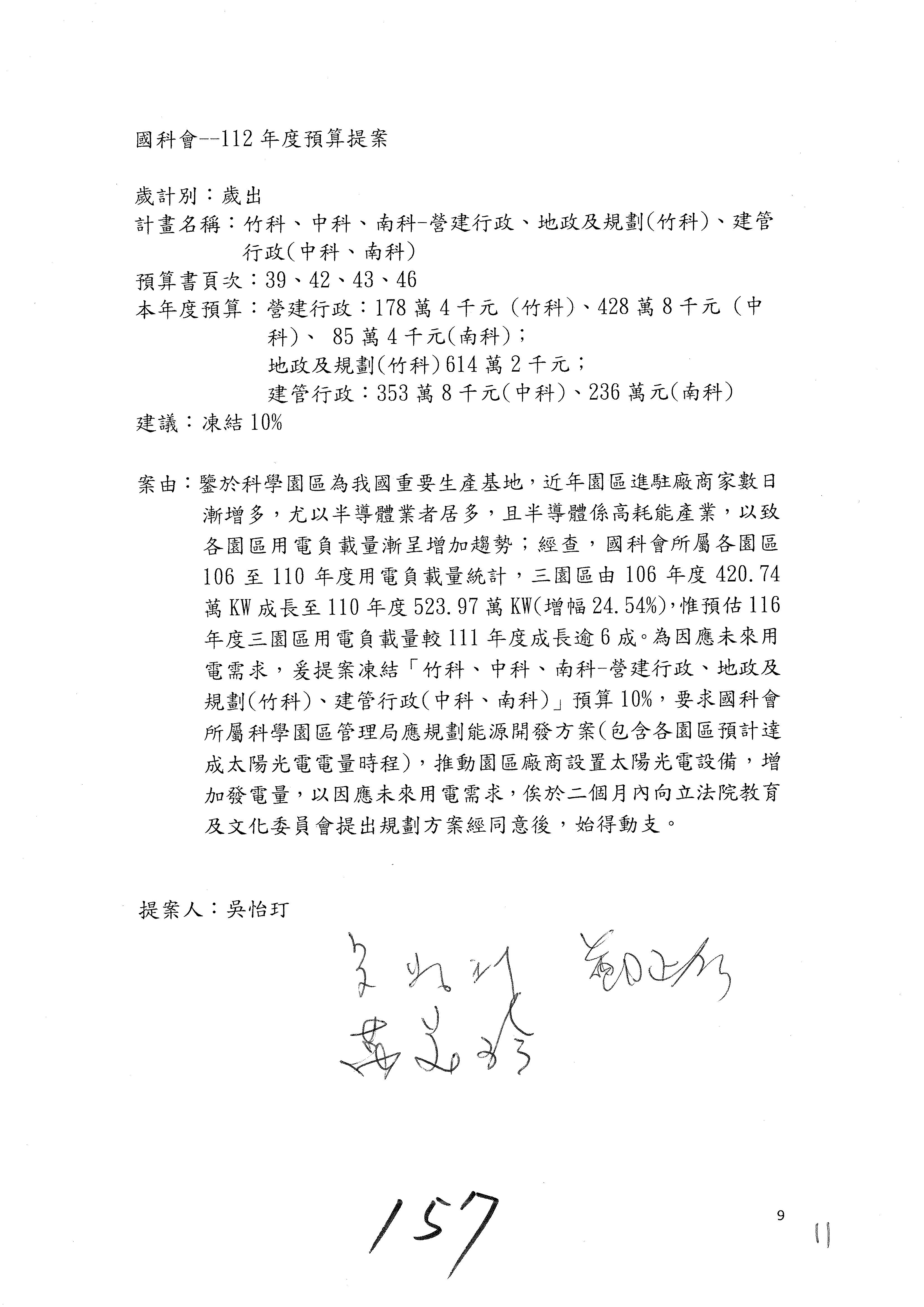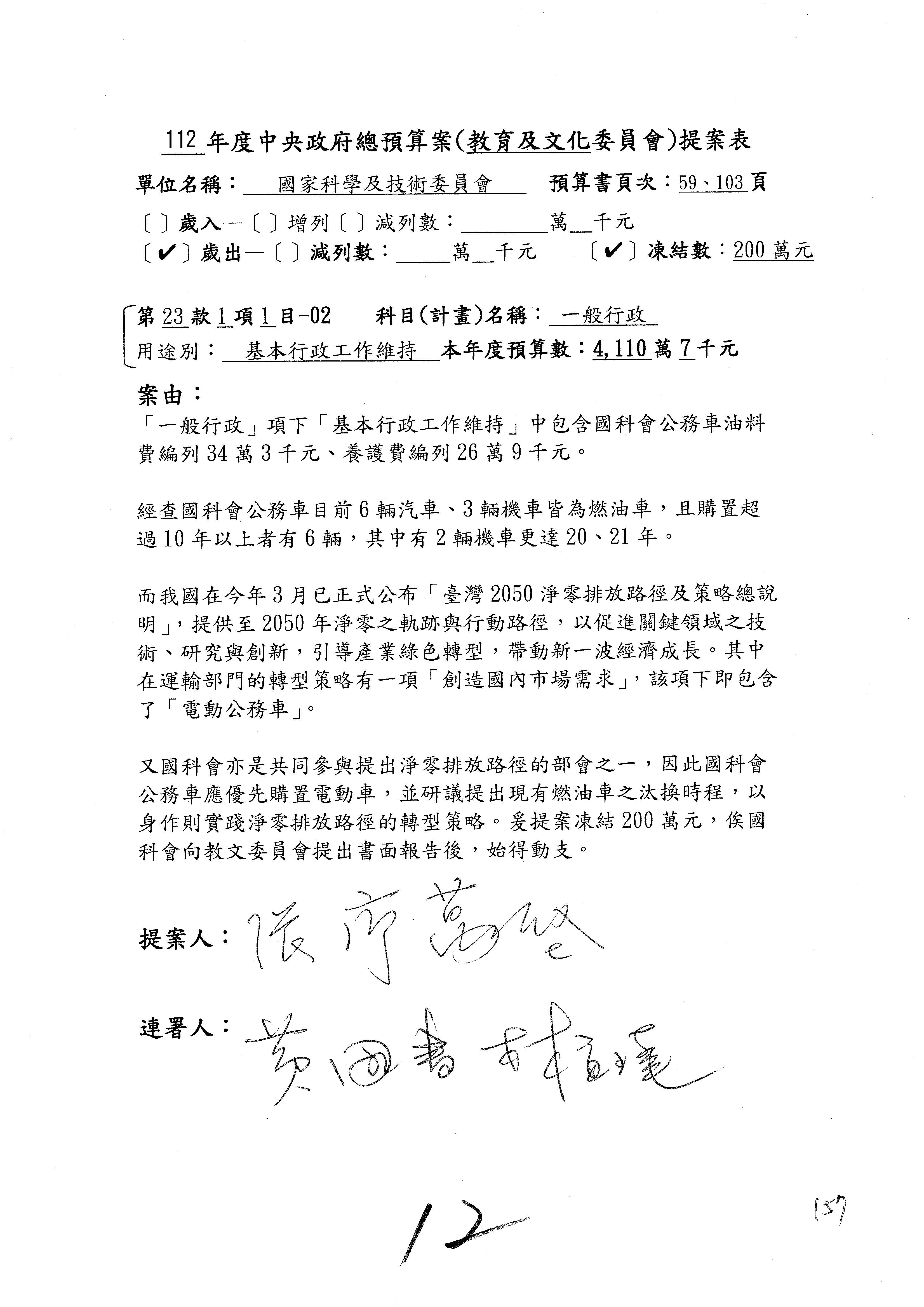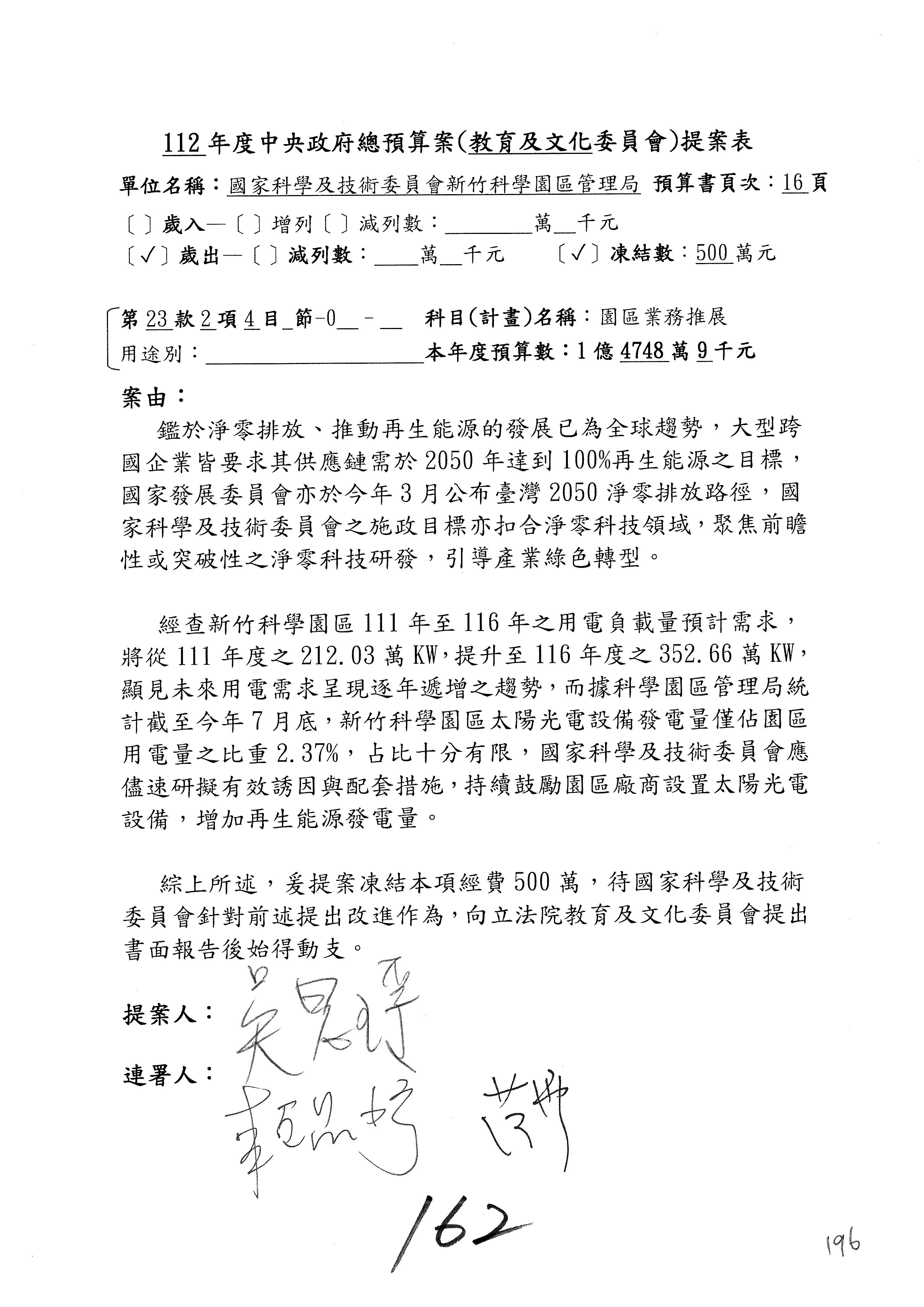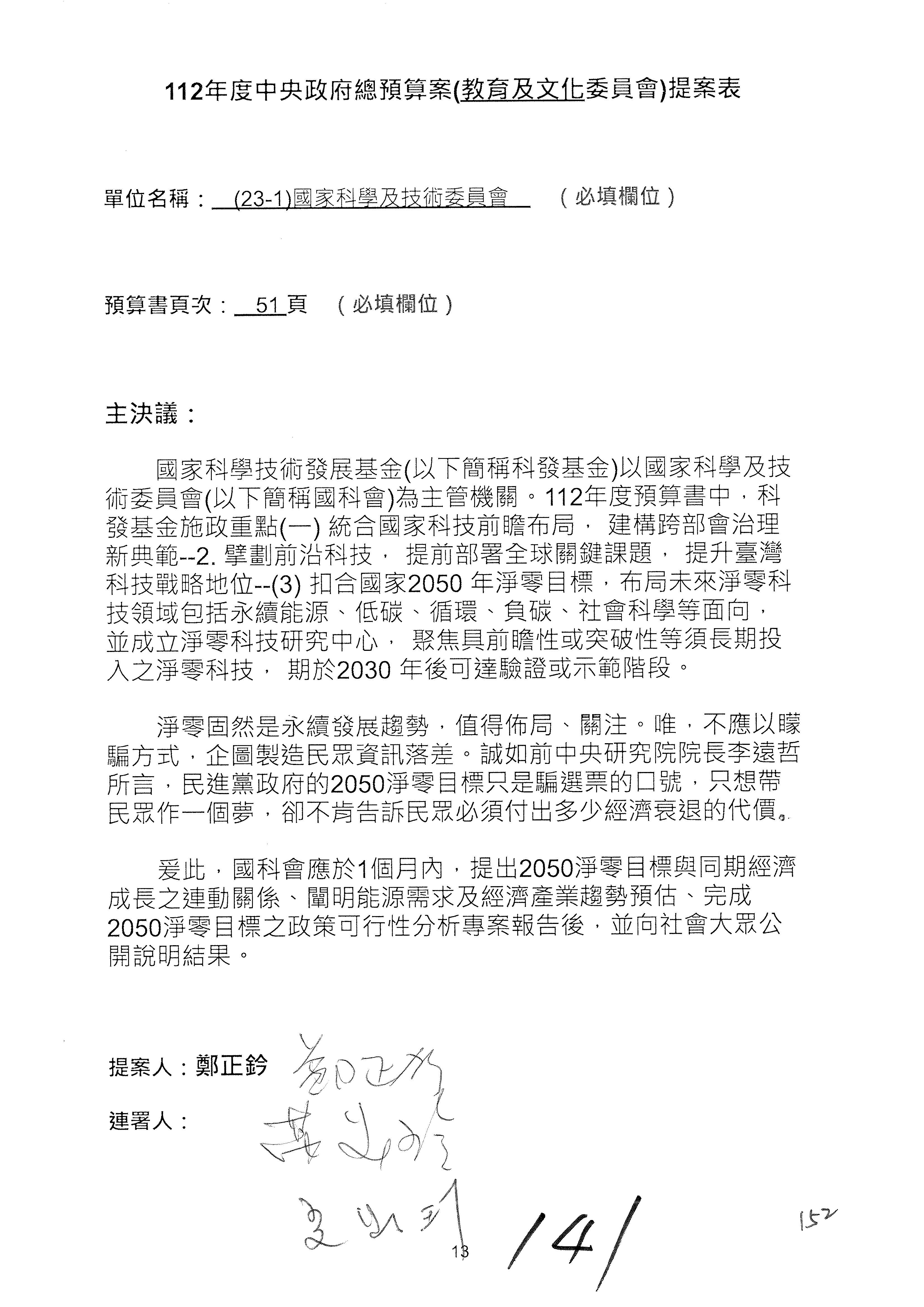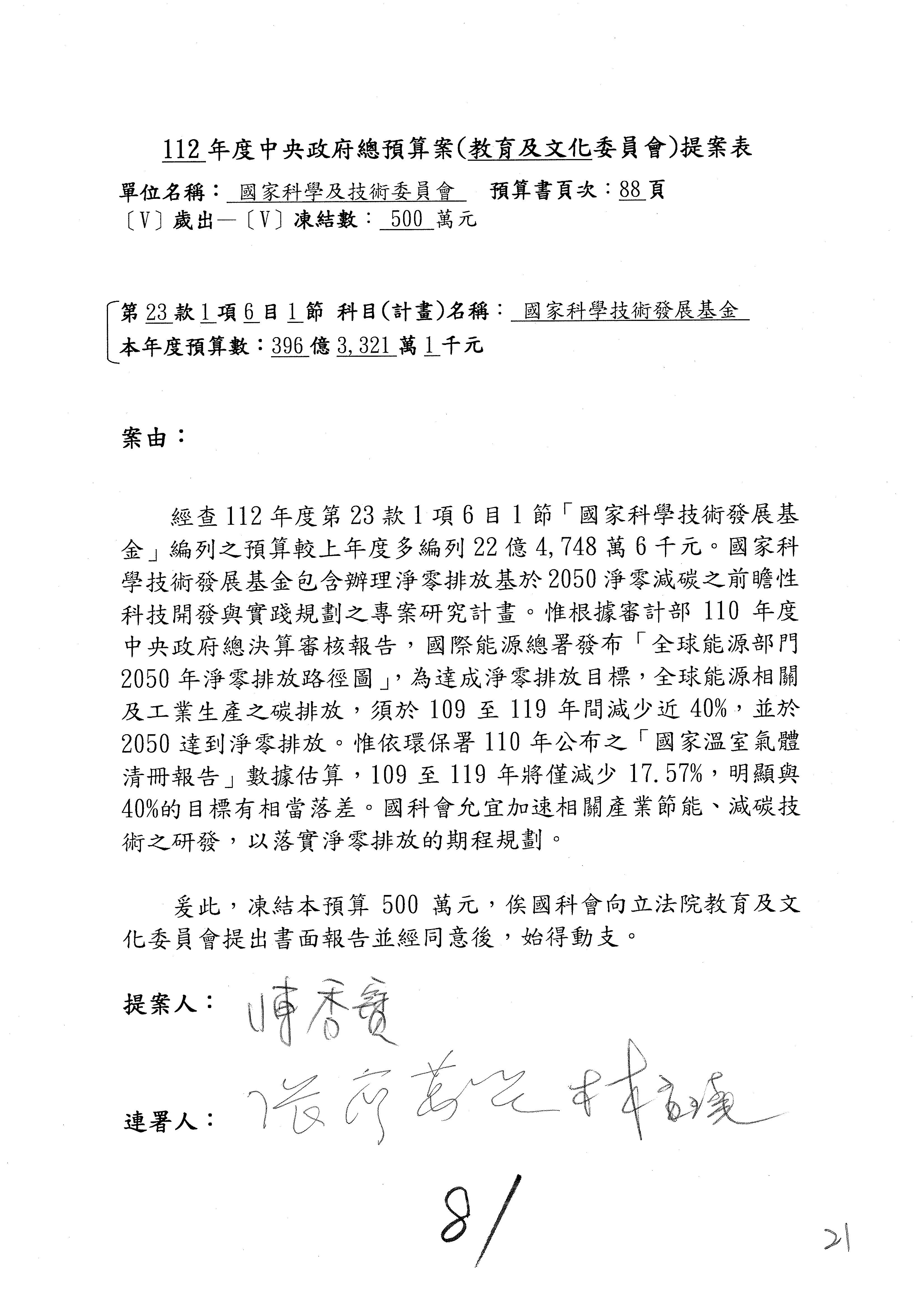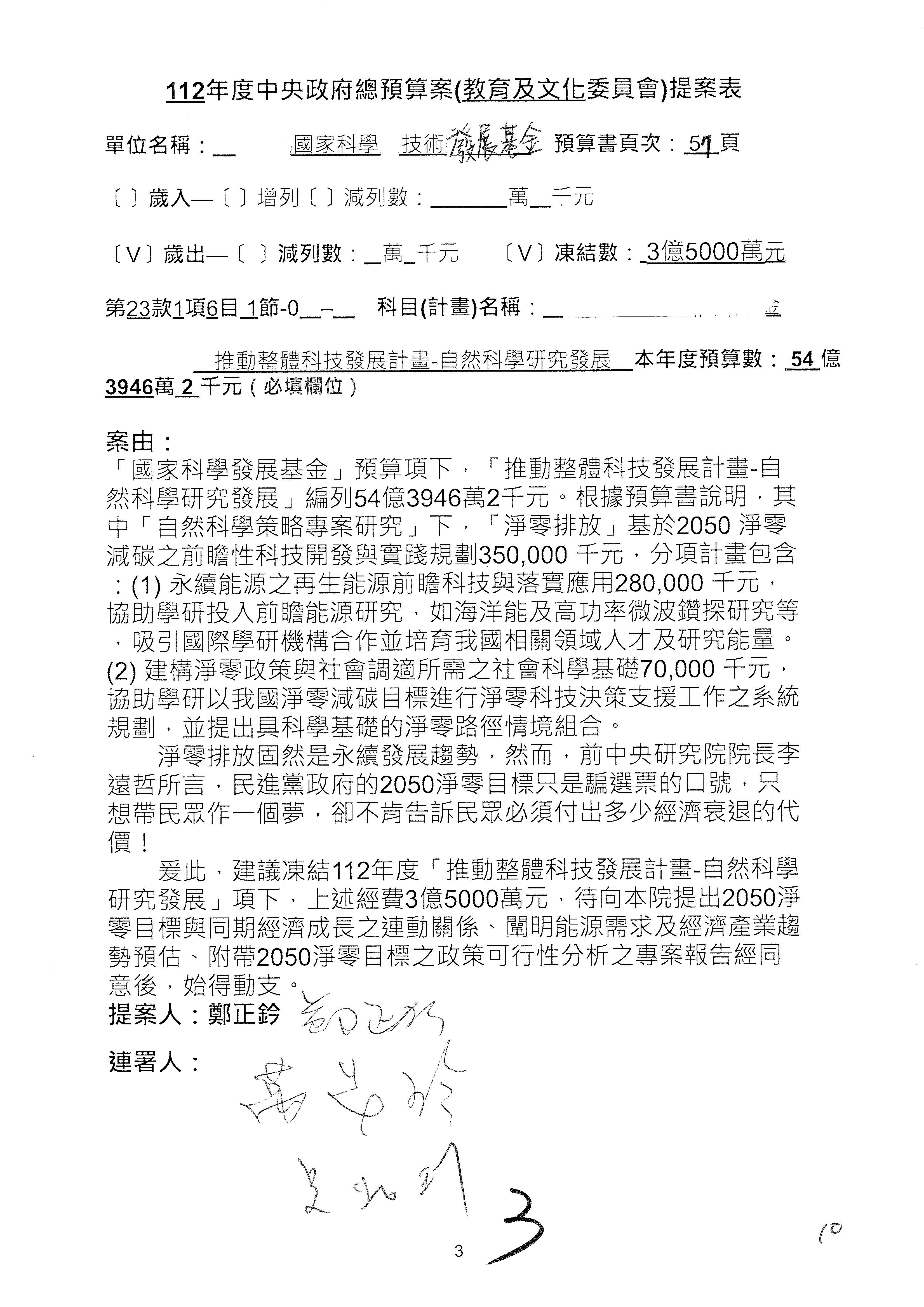 這個部分本席有提案,就是第3案、第4案、第7案、第9案及第11案,基本上都跟2050淨零排放有關,因為整個政府在淨零排放相關政策上,其實並沒有那麼完整,所以我們希望能一個有更清楚的相關計畫跟說明,然後才能動用。因為那些都是相關的,我就不逐一就個案進行說明了,原則上我都有凍結一個相當的金額。