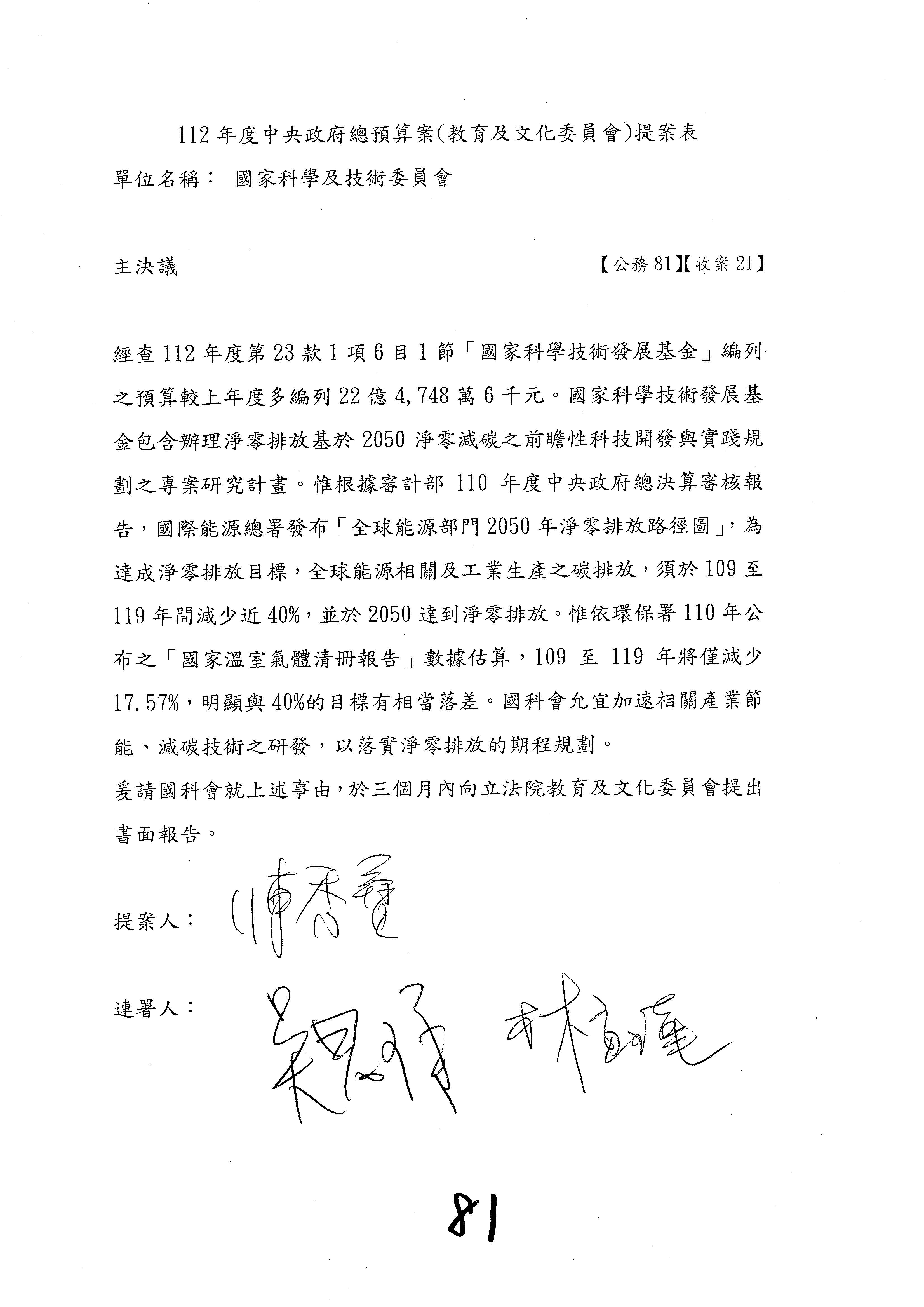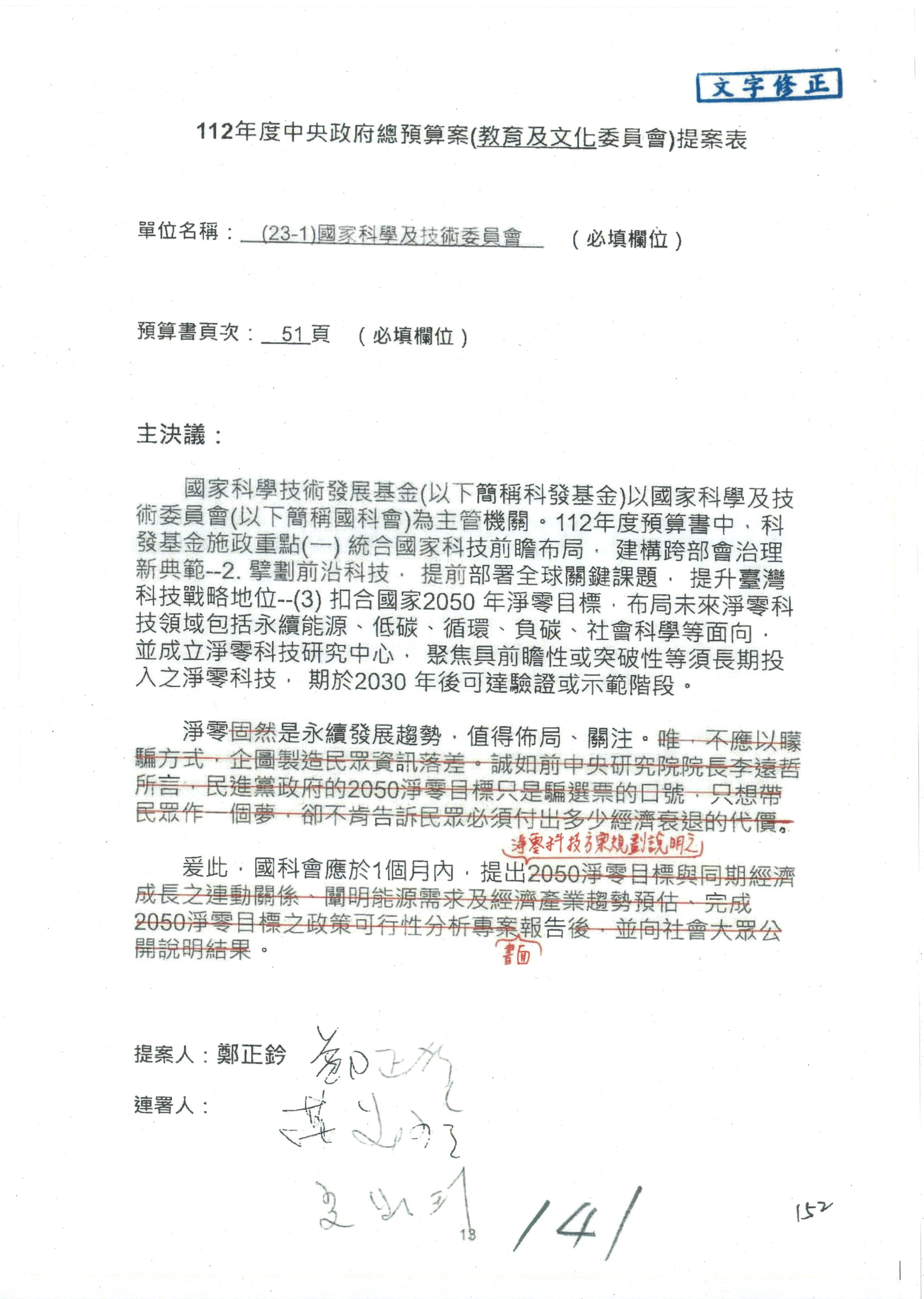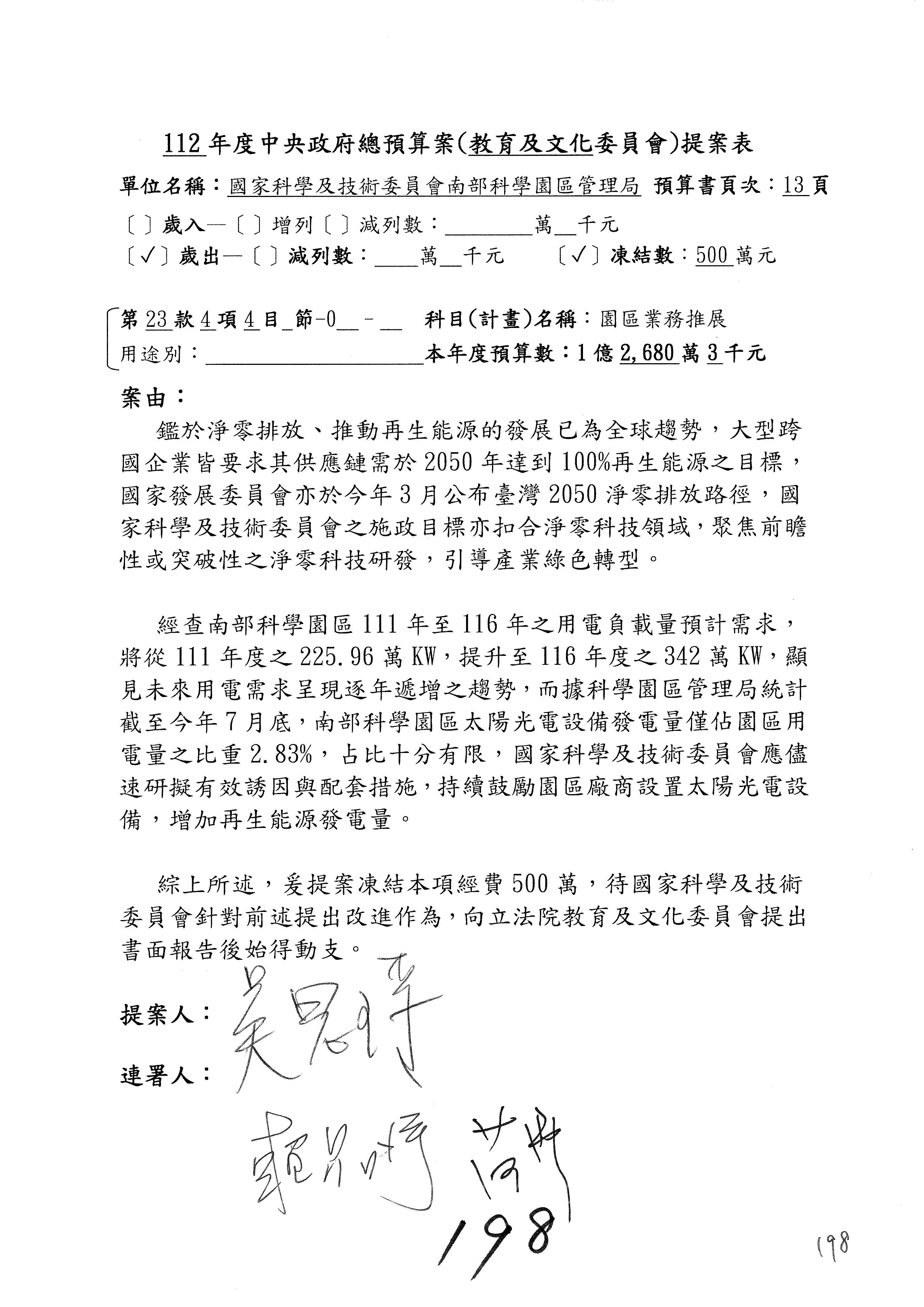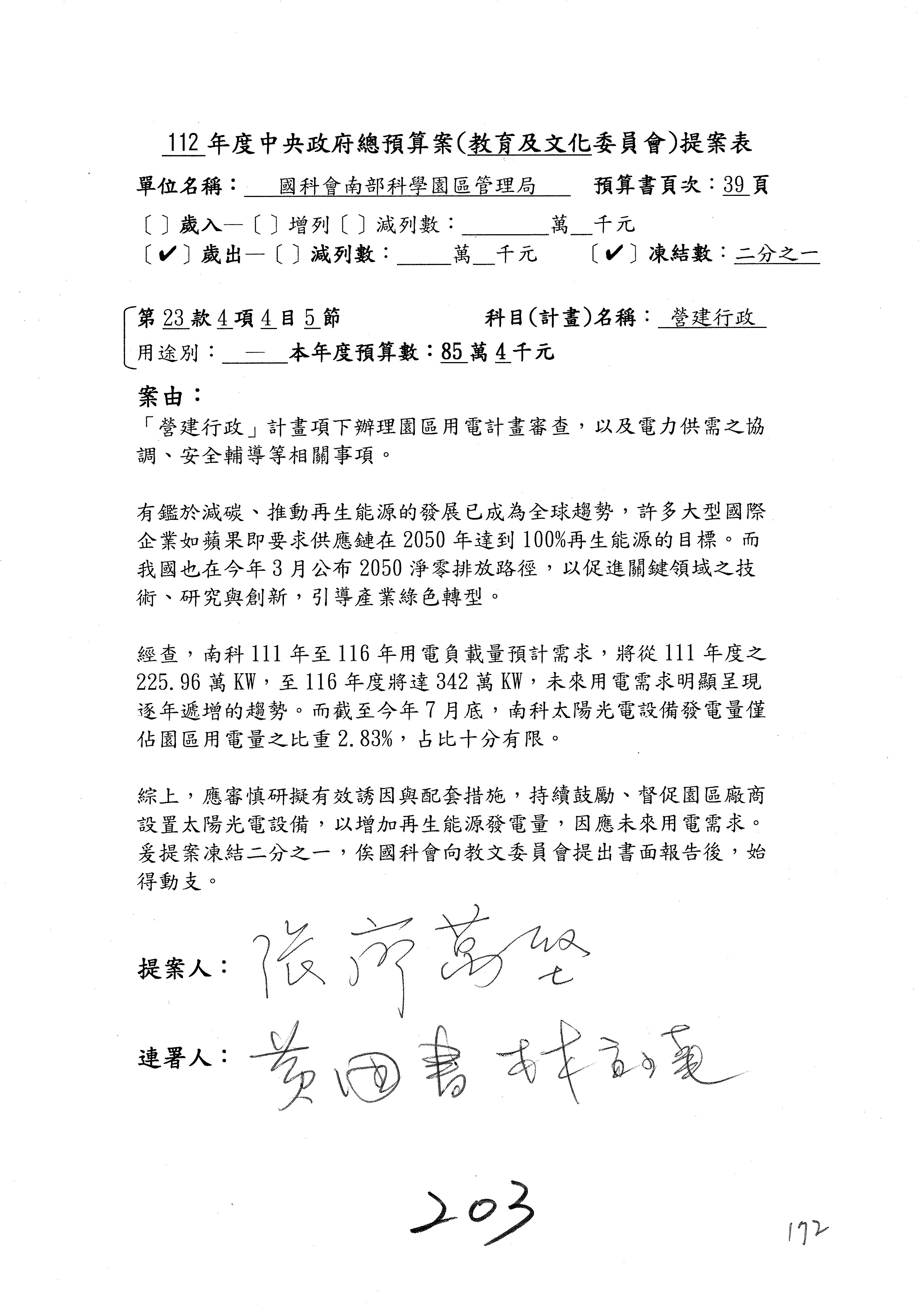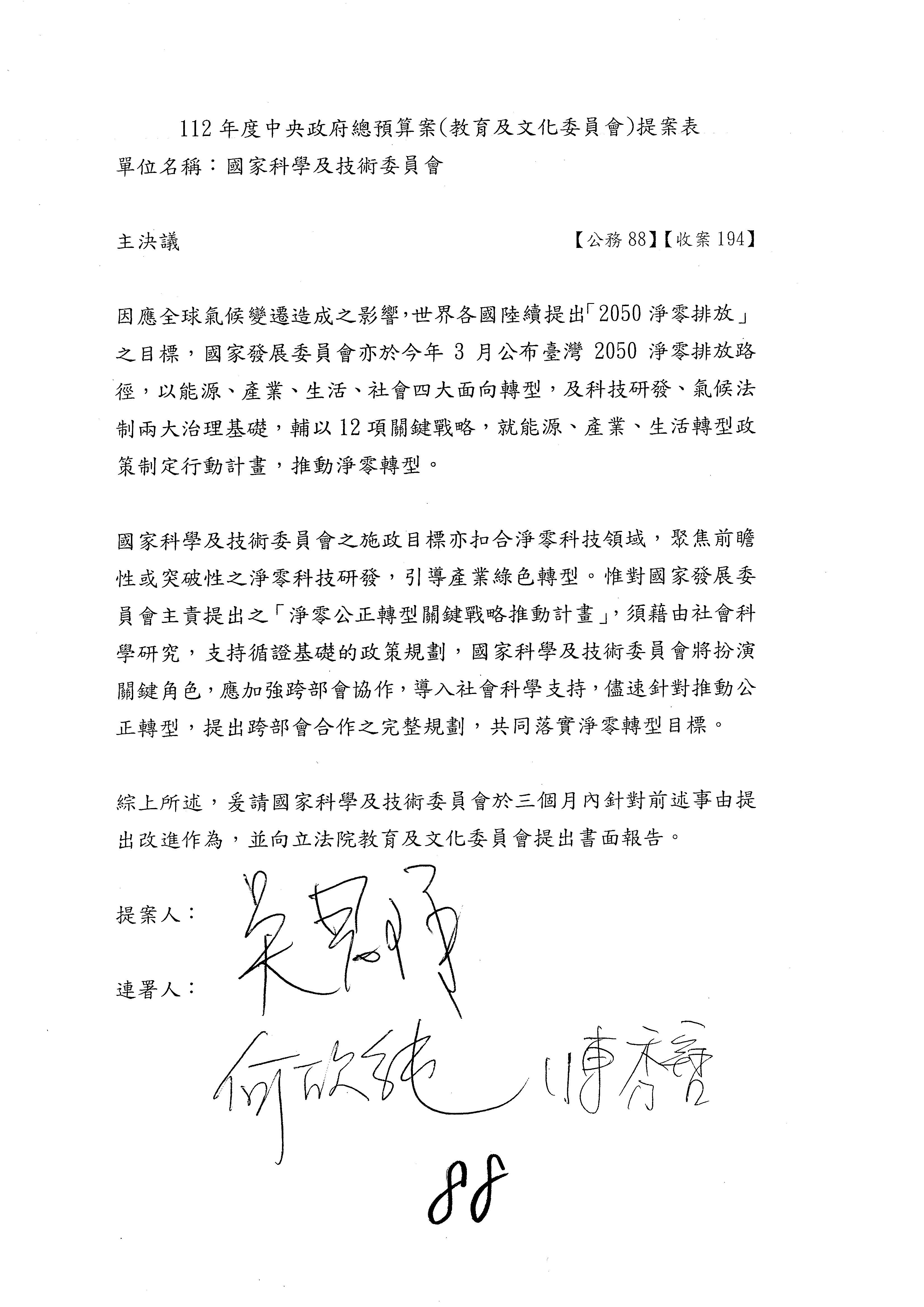 這個部分本席有提案,就是第3案、第4案、第7案、第9案及第11案,基本上都跟2050淨零排放有關,因為整個政府在淨零排放相關政策上,其實並沒有那麼完整,所以我們希望能一個有更清楚的相關計畫跟說明,然後才能動用。因為那些都是相關的,我就不逐一就個案進行說明了,原則上我都有凍結一個相當的金額。