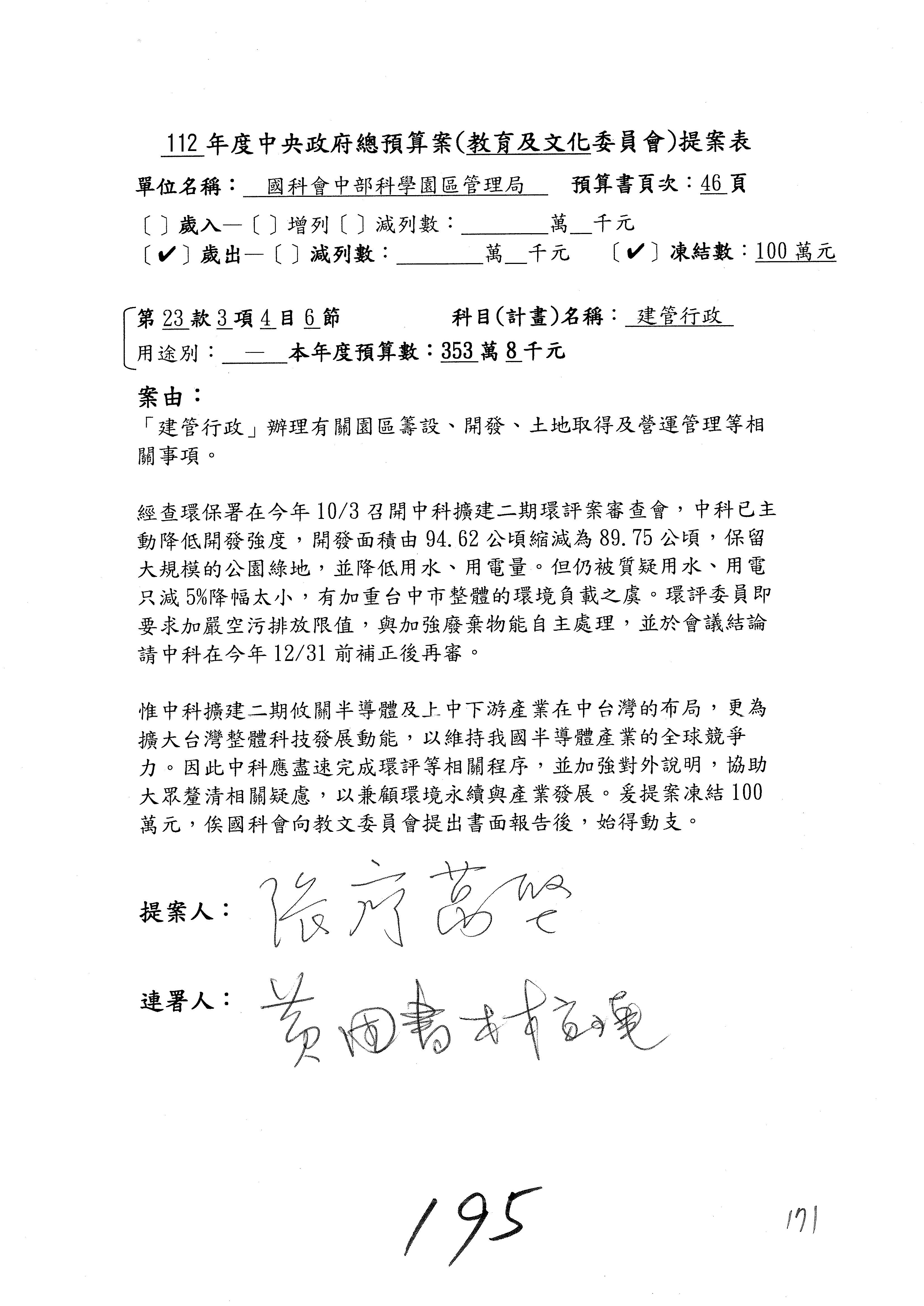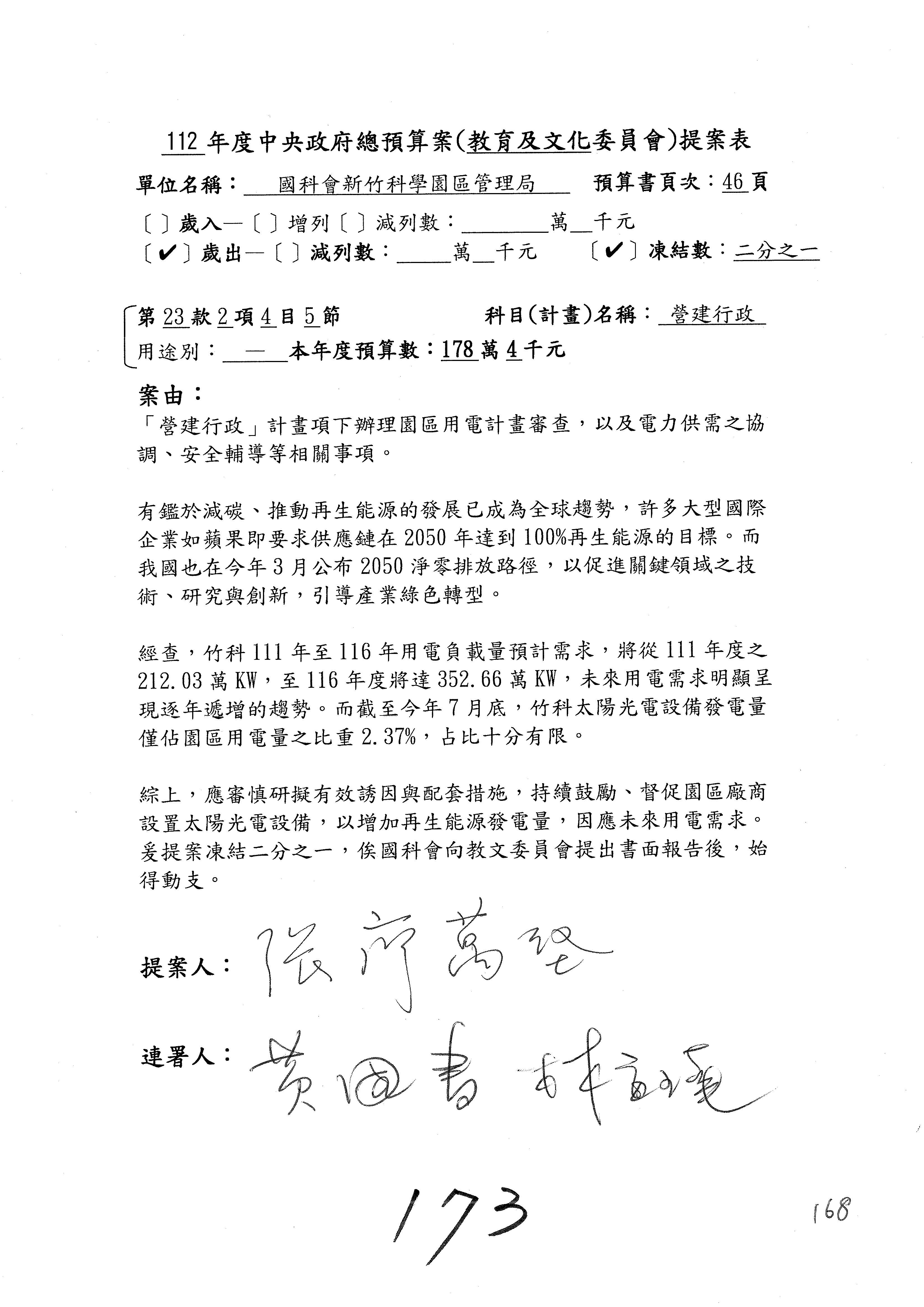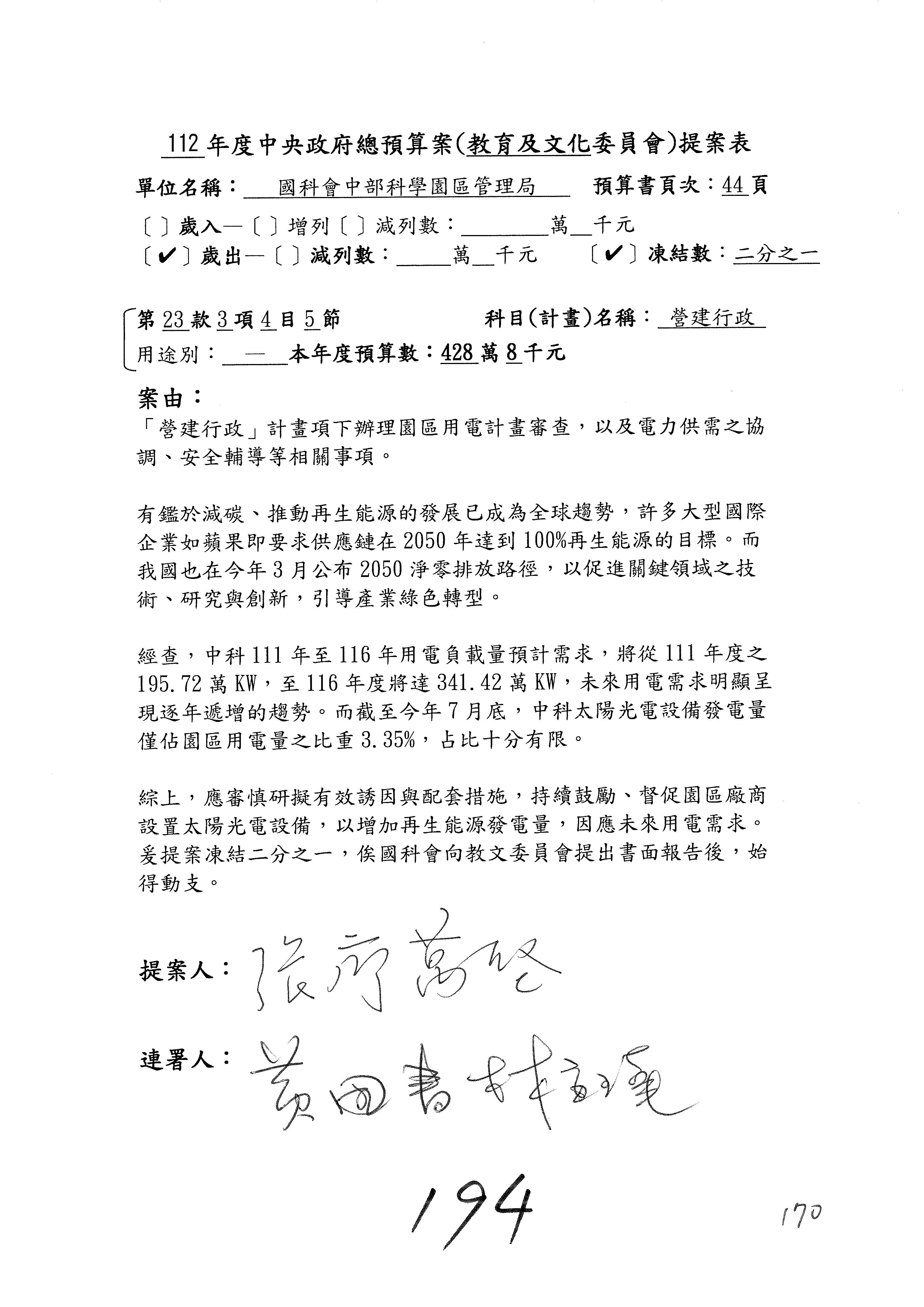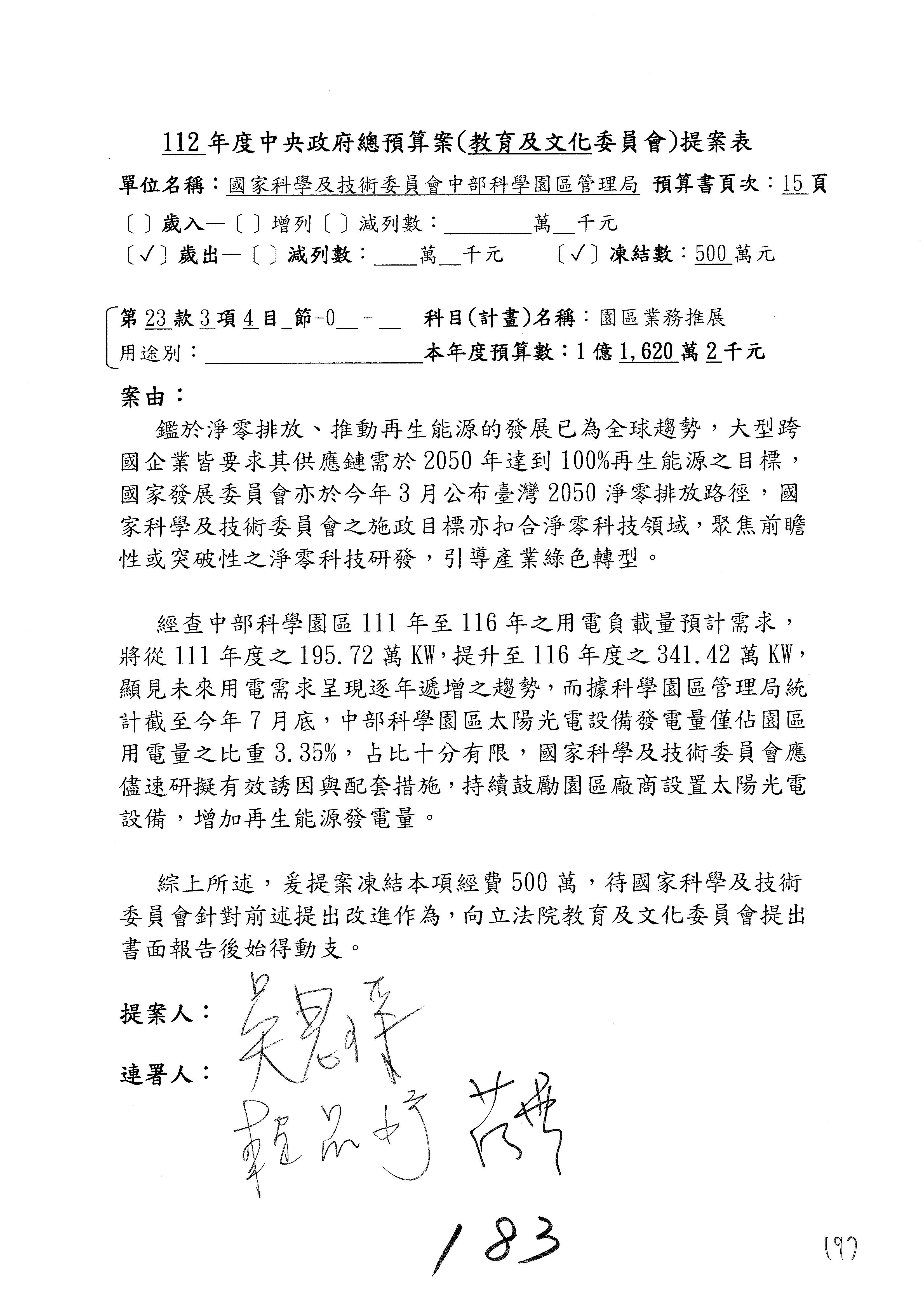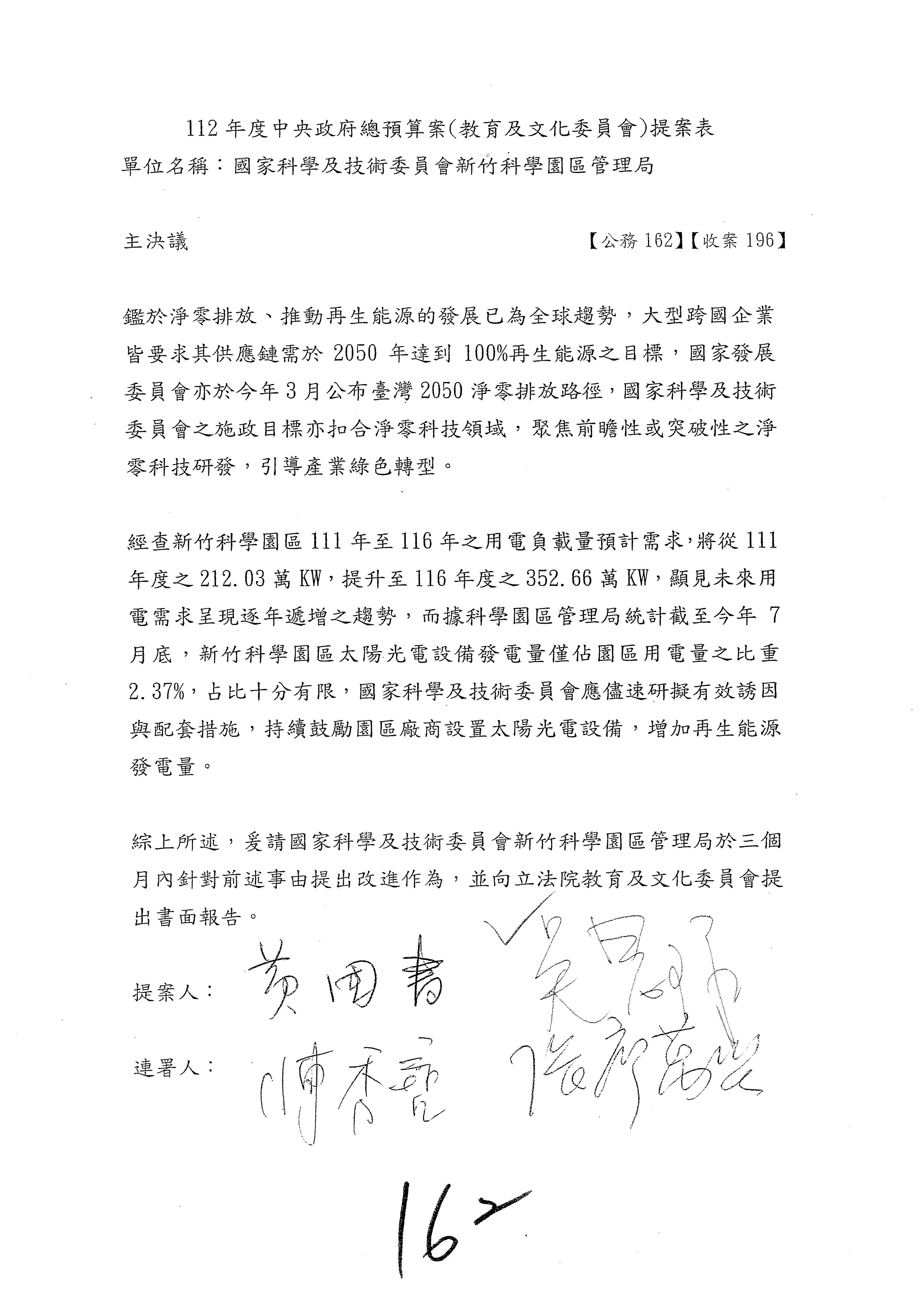 這個部分本席有提案,就是第3案、第4案、第7案、第9案及第11案,基本上都跟2050淨零排放有關,因為整個政府在淨零排放相關政策上,其實並沒有那麼完整,所以我們希望能一個有更清楚的相關計畫跟說明,然後才能動用。因為那些都是相關的,我就不逐一就個案進行說明了,原則上我都有凍結一個相當的金額。