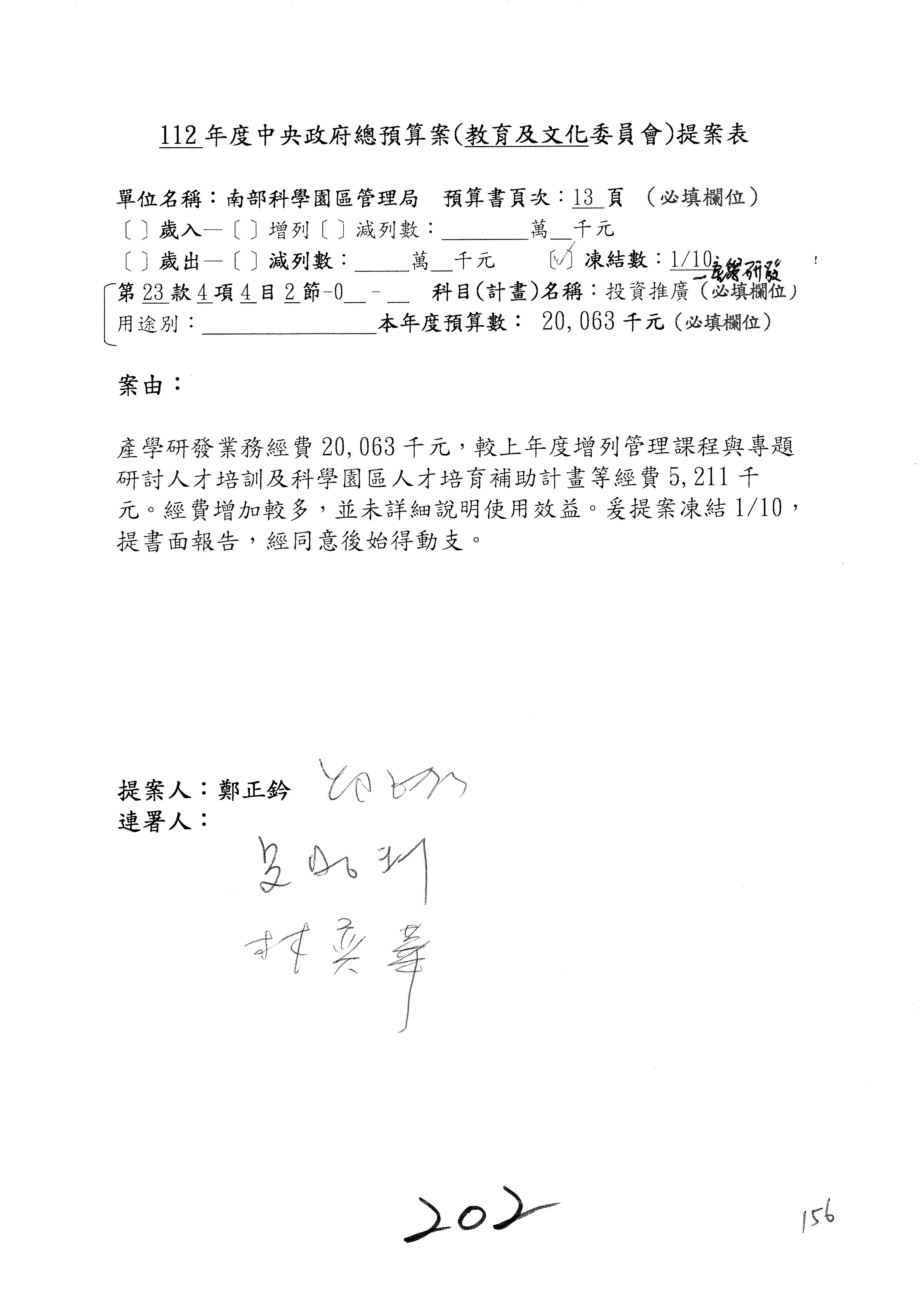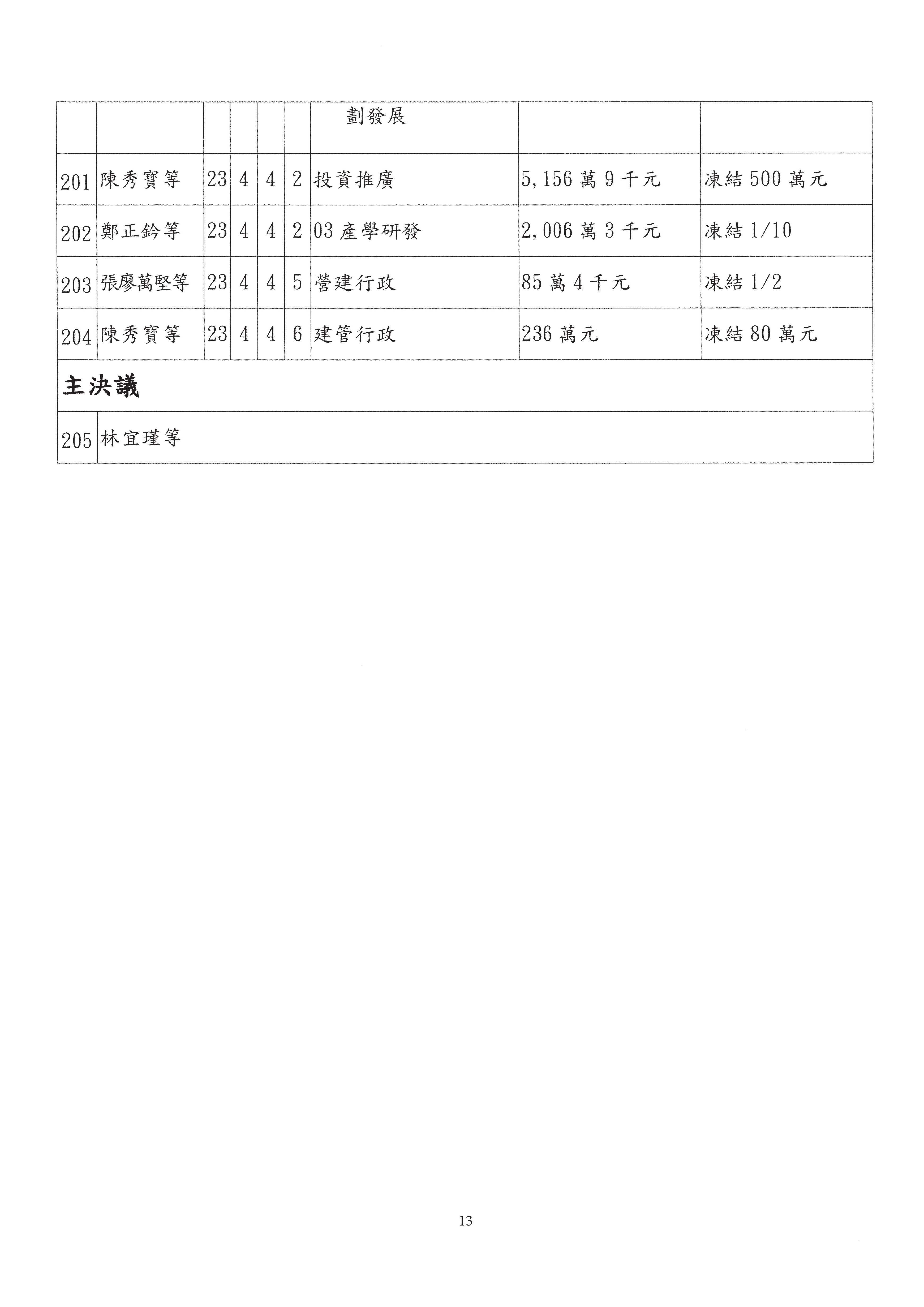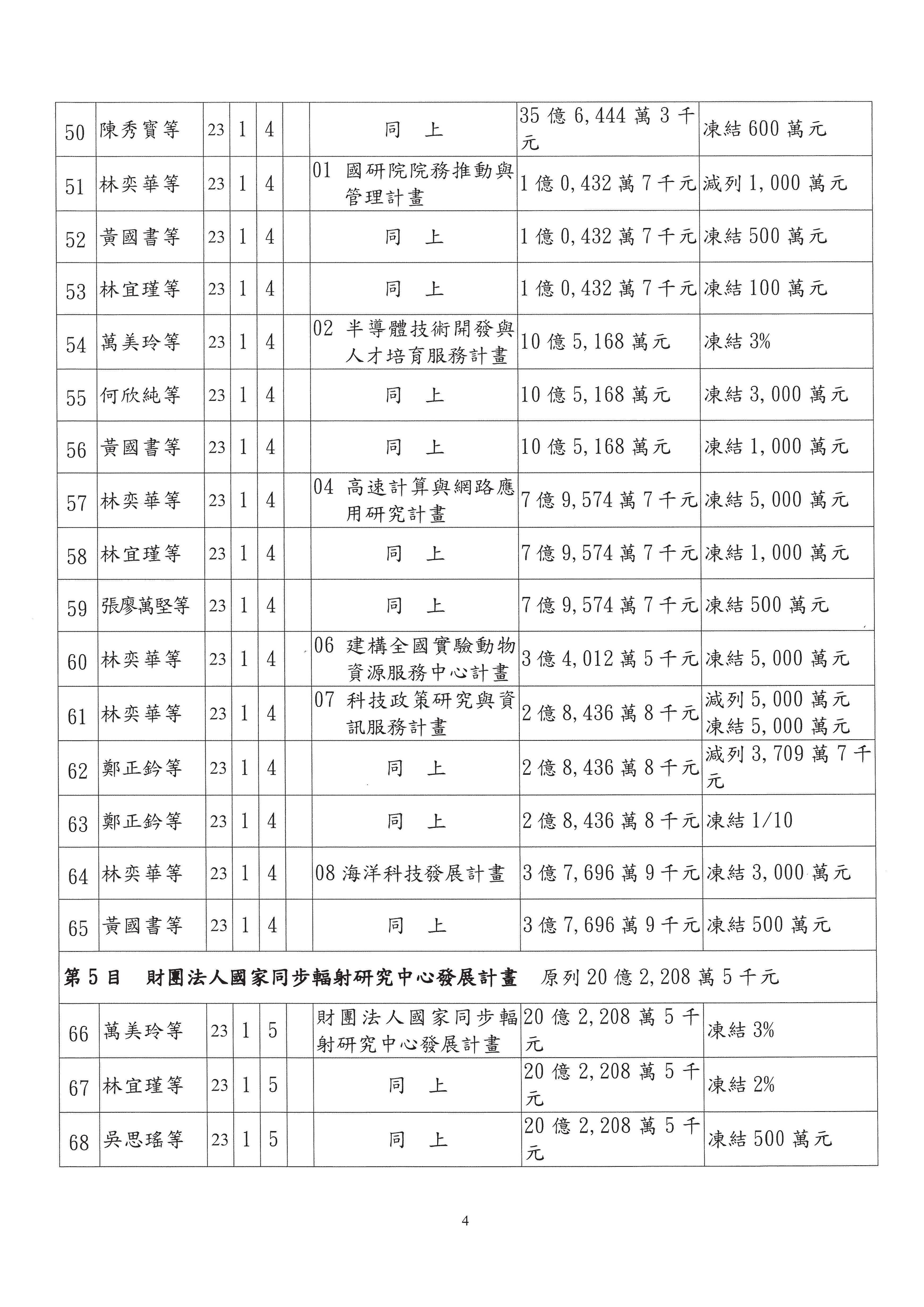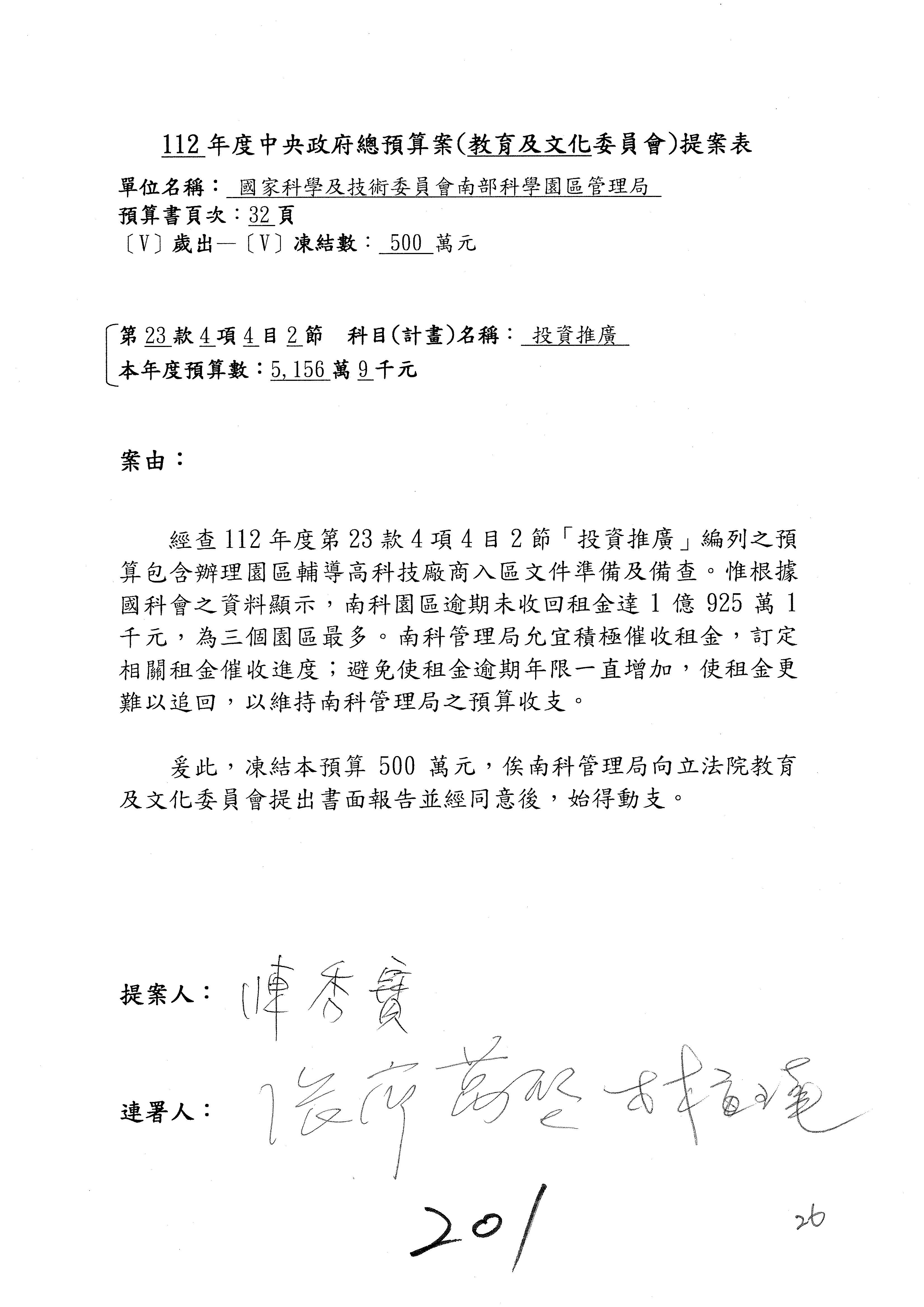 陳委員秀寳:在我的第201案裡面,這個計畫的預算數是5,156萬元,我本來的提凍金額是500萬元,可以不要凍那麼多,但一定要凍,總之,我可以凍50萬元。