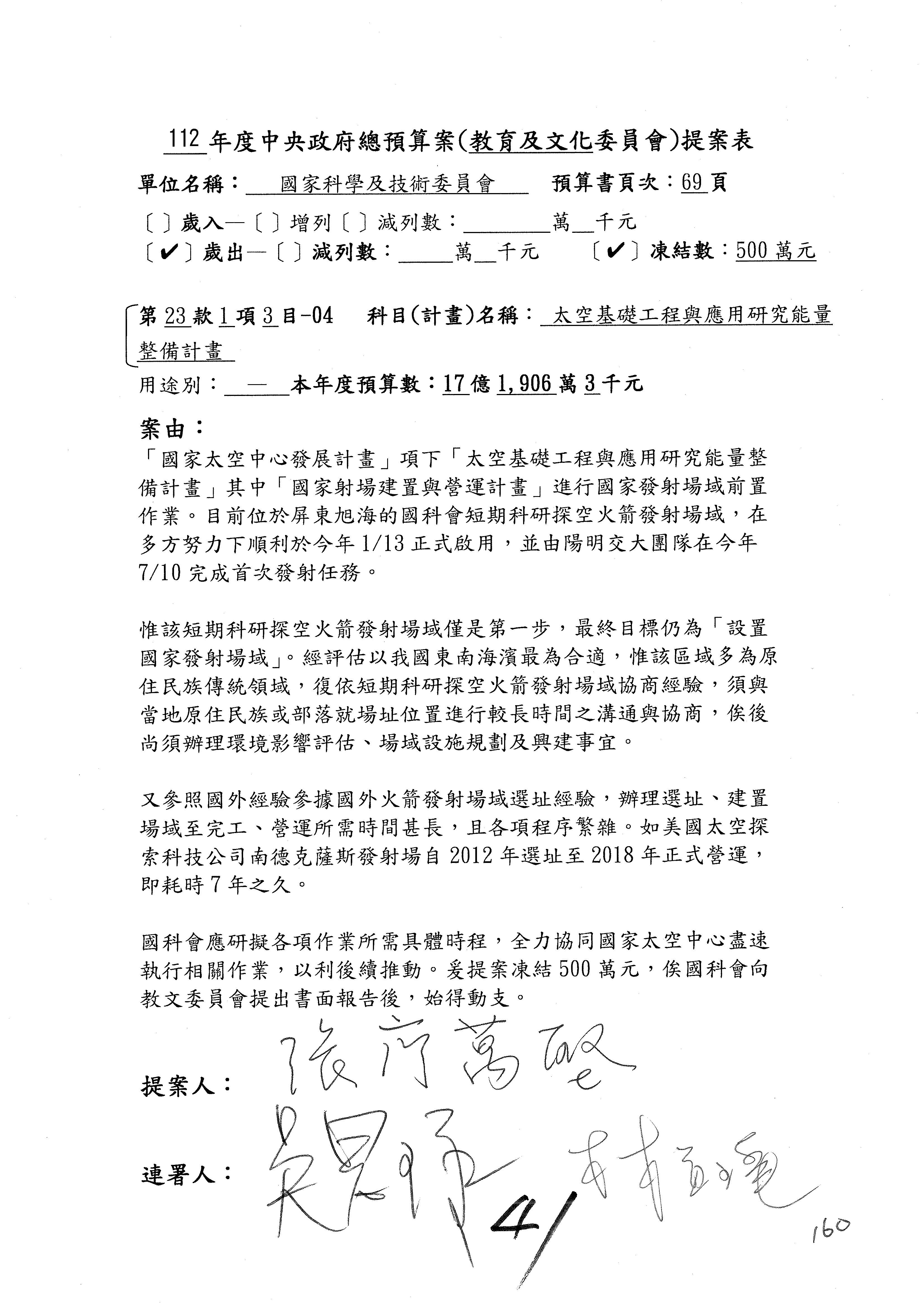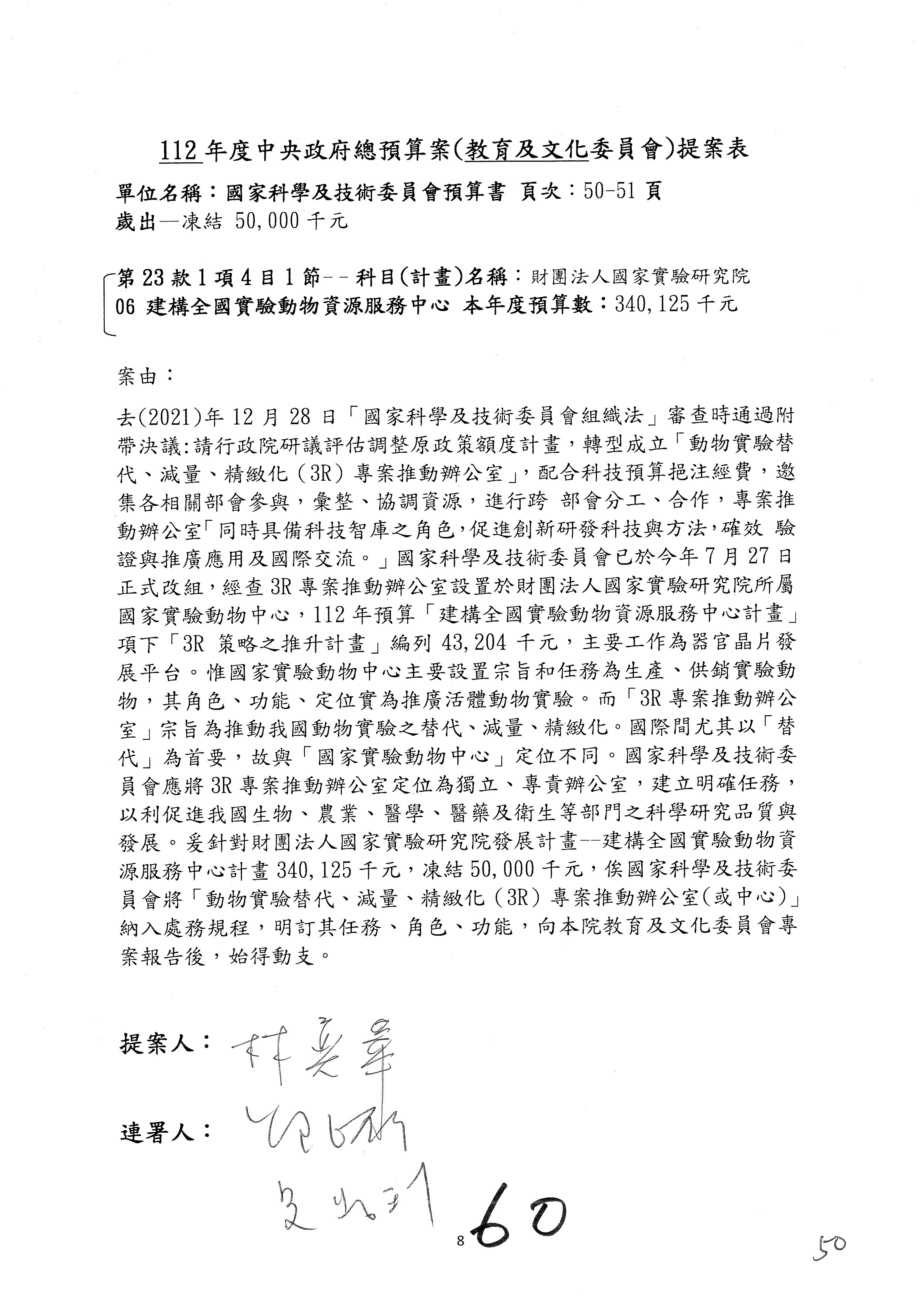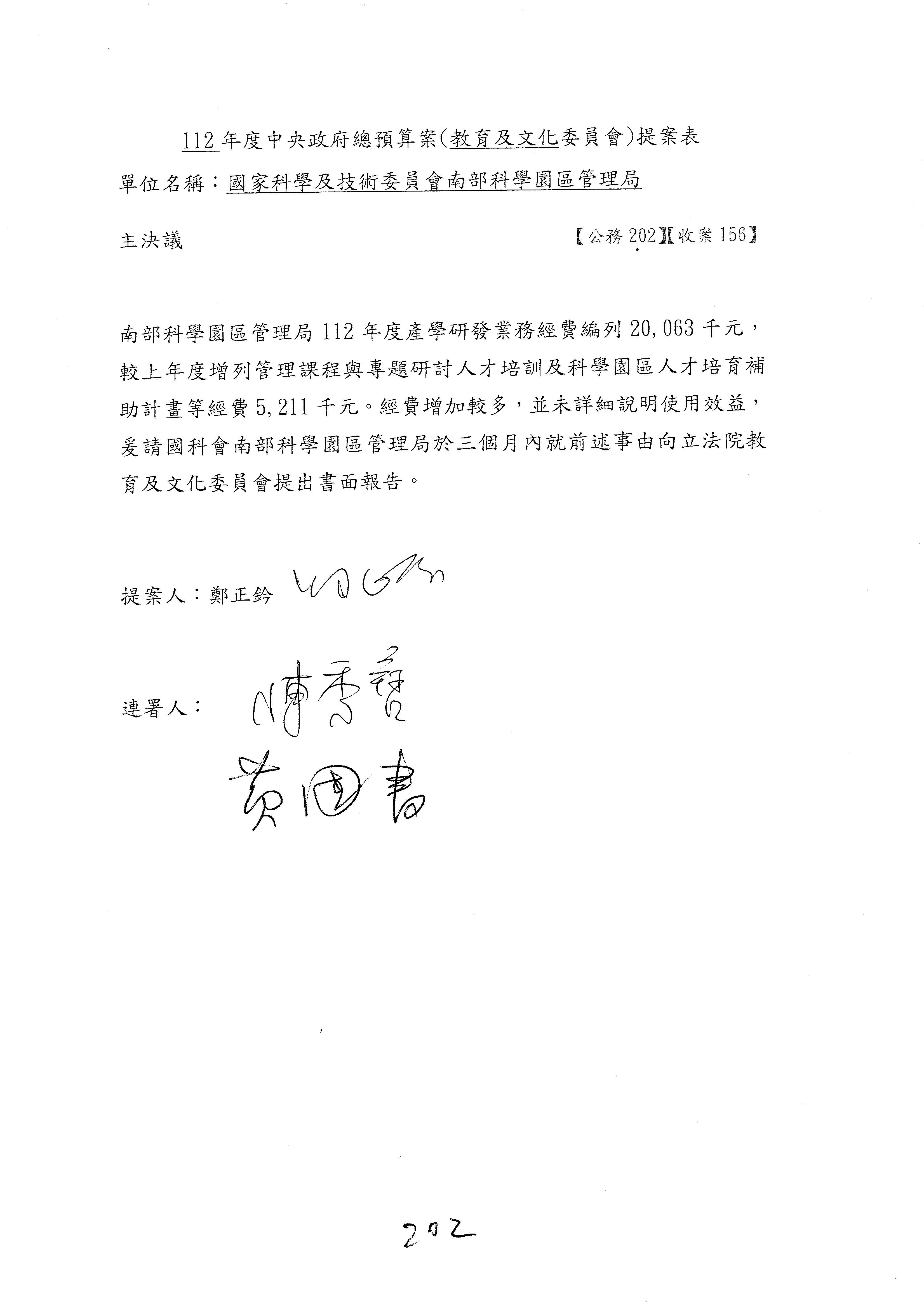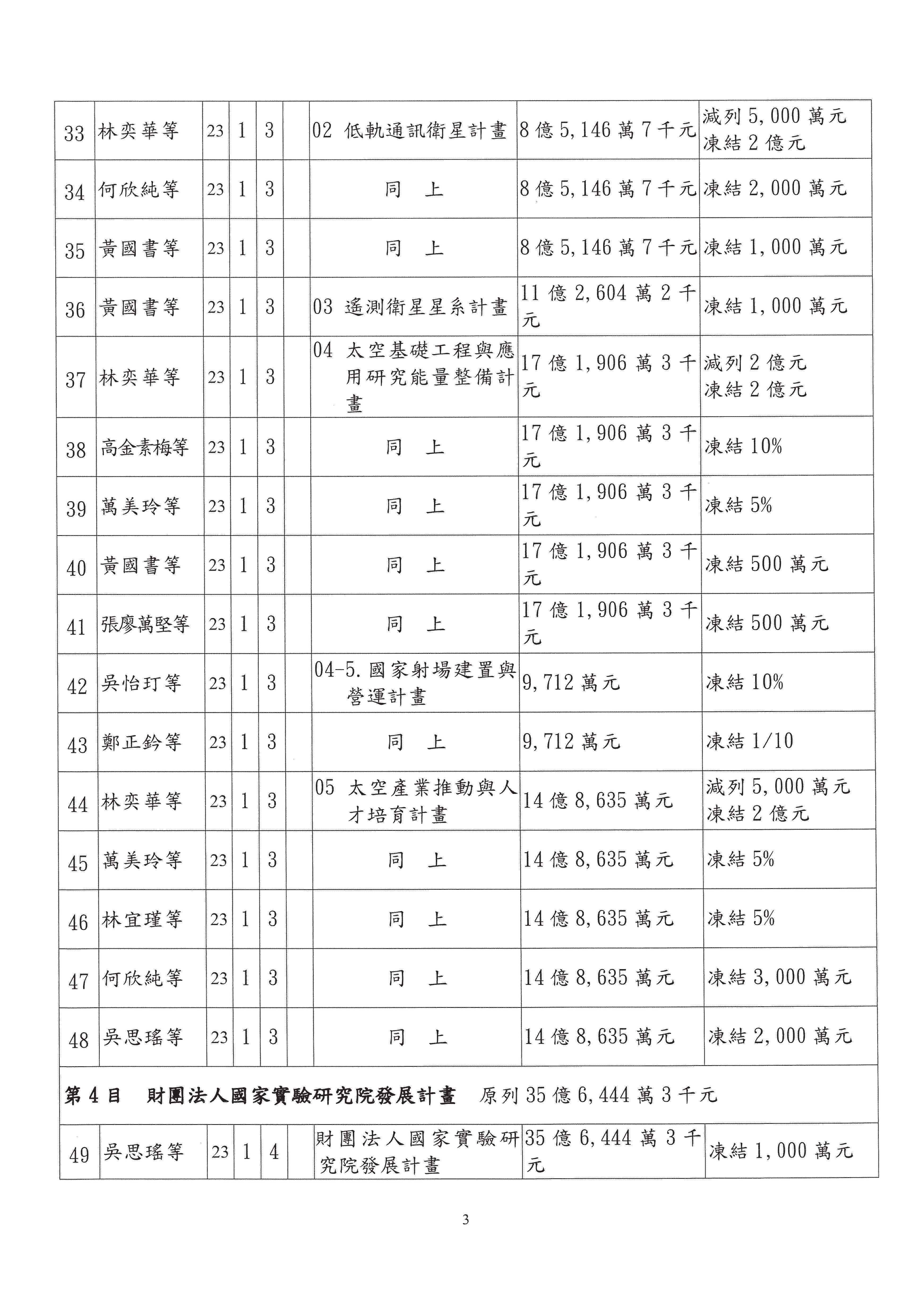 陳委員秀寳:在我的第201案裡面,這個計畫的預算數是5,156萬元,我本來的提凍金額是500萬元,可以不要凍那麼多,但一定要凍,總之,我可以凍50萬元。