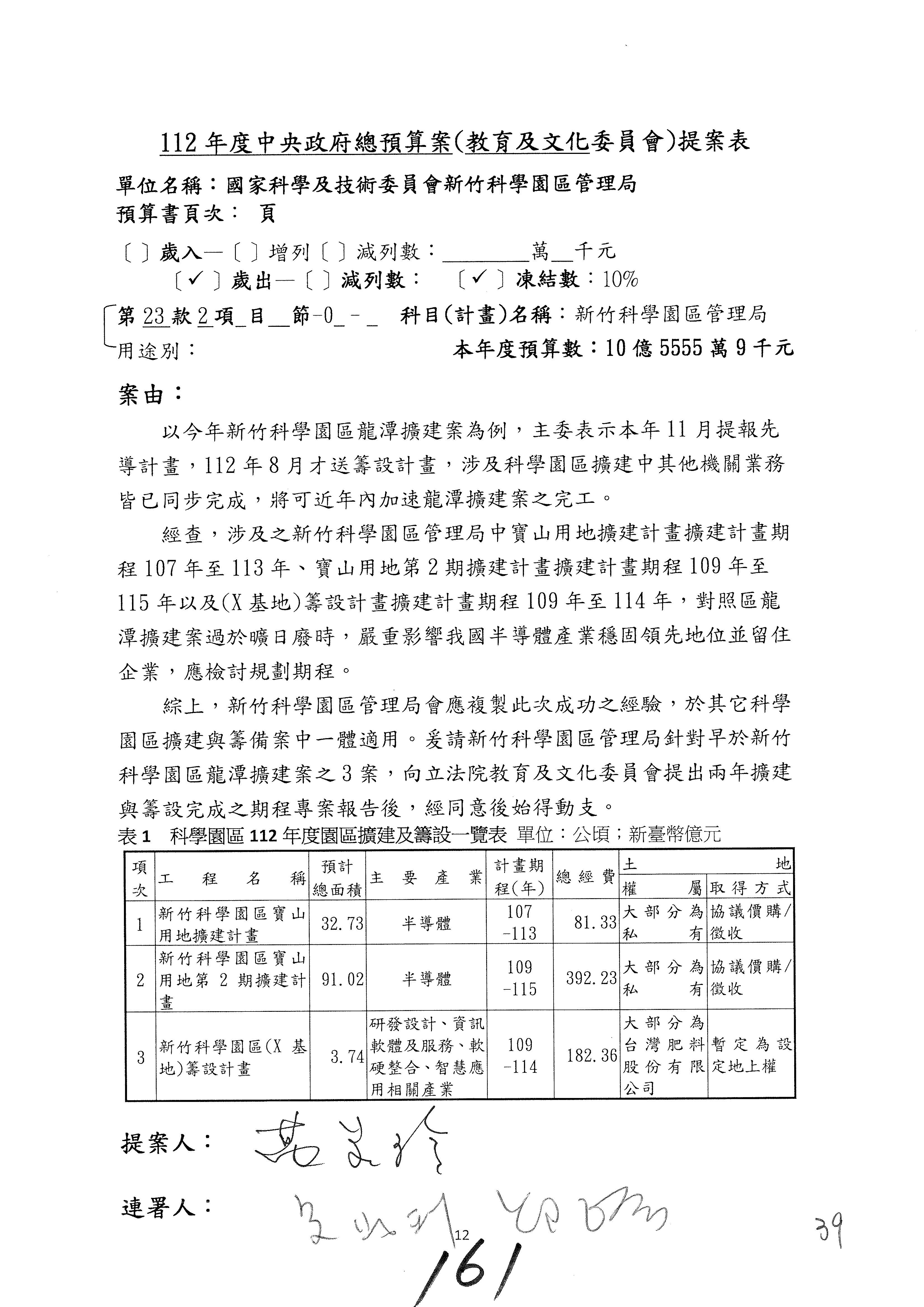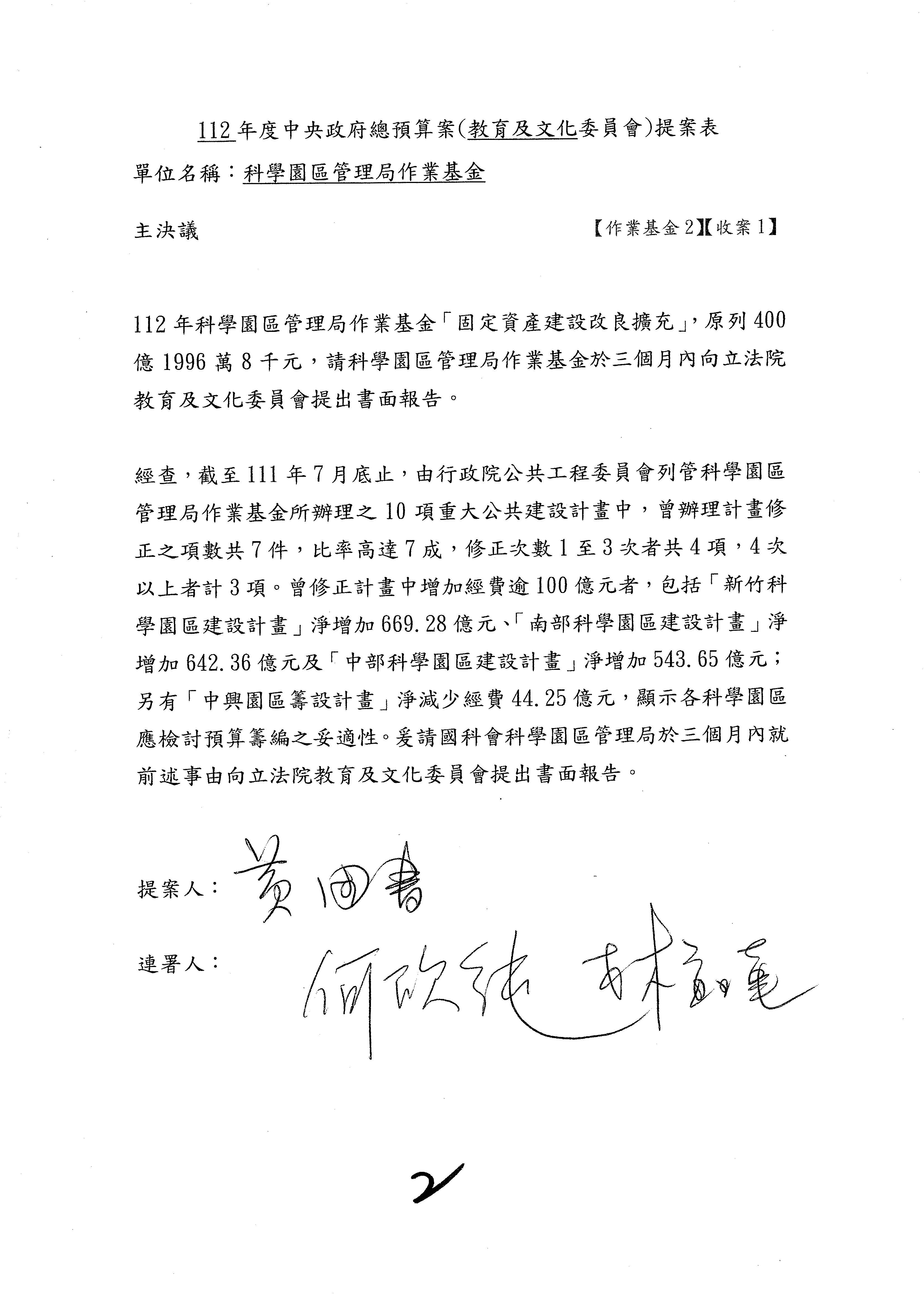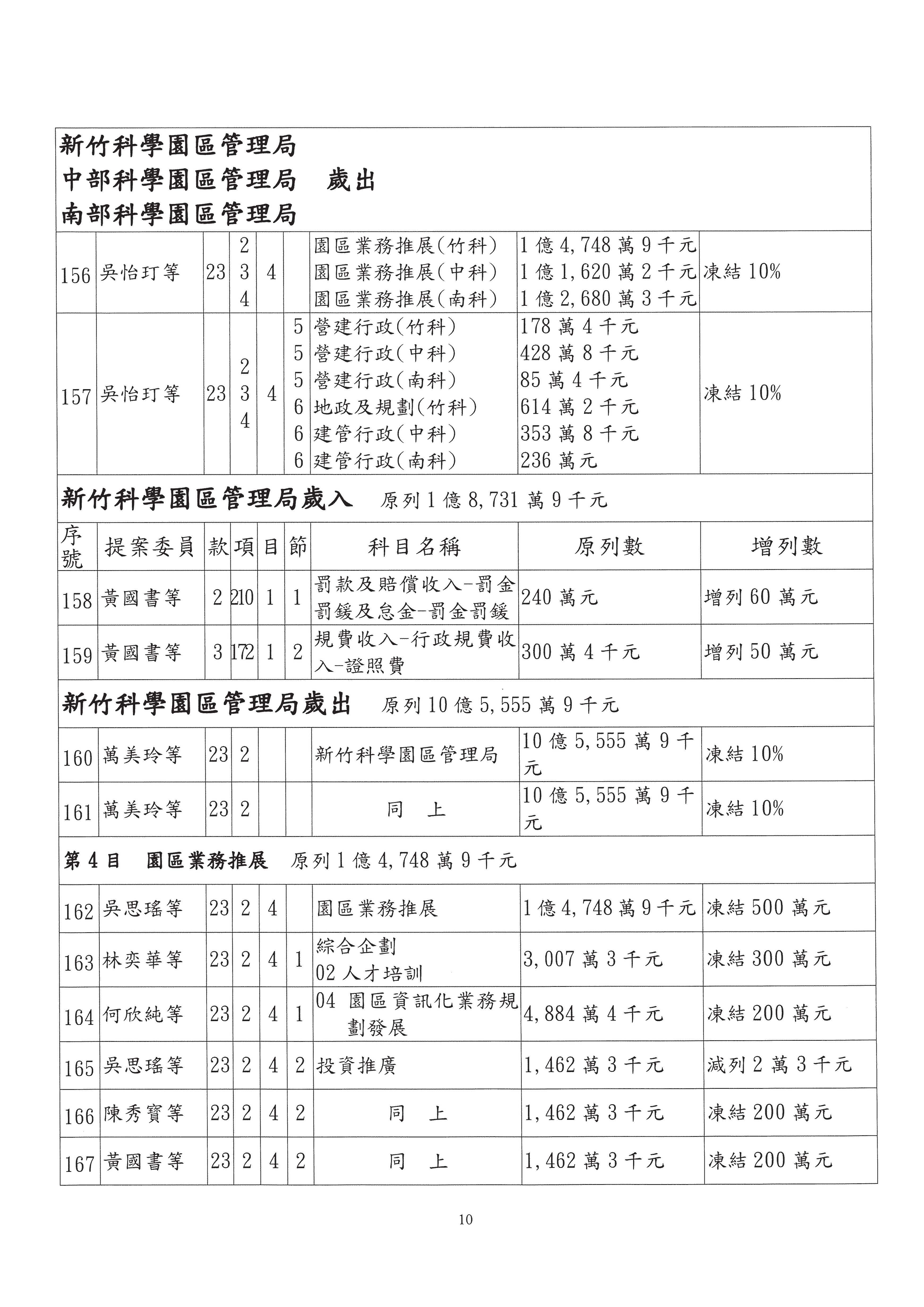 黃委員國書:你們列的十項重大公共建設計畫中,曾辦理計畫修正的項目,比例還滿高,高達七成,但修正計畫中增加的經費超過100億元的還不少,竹科增加六百多億元、南科增加六百多億元、中科增加五百多億元,中興園區籌設計畫經費減少了四十幾億元,所以你們要不要去檢討一下各個科學園區預算籌編的妥適性,固定資產建設改良擴充這一筆預算,你們應該要去做妥適性的檢討,以上是我的意見。