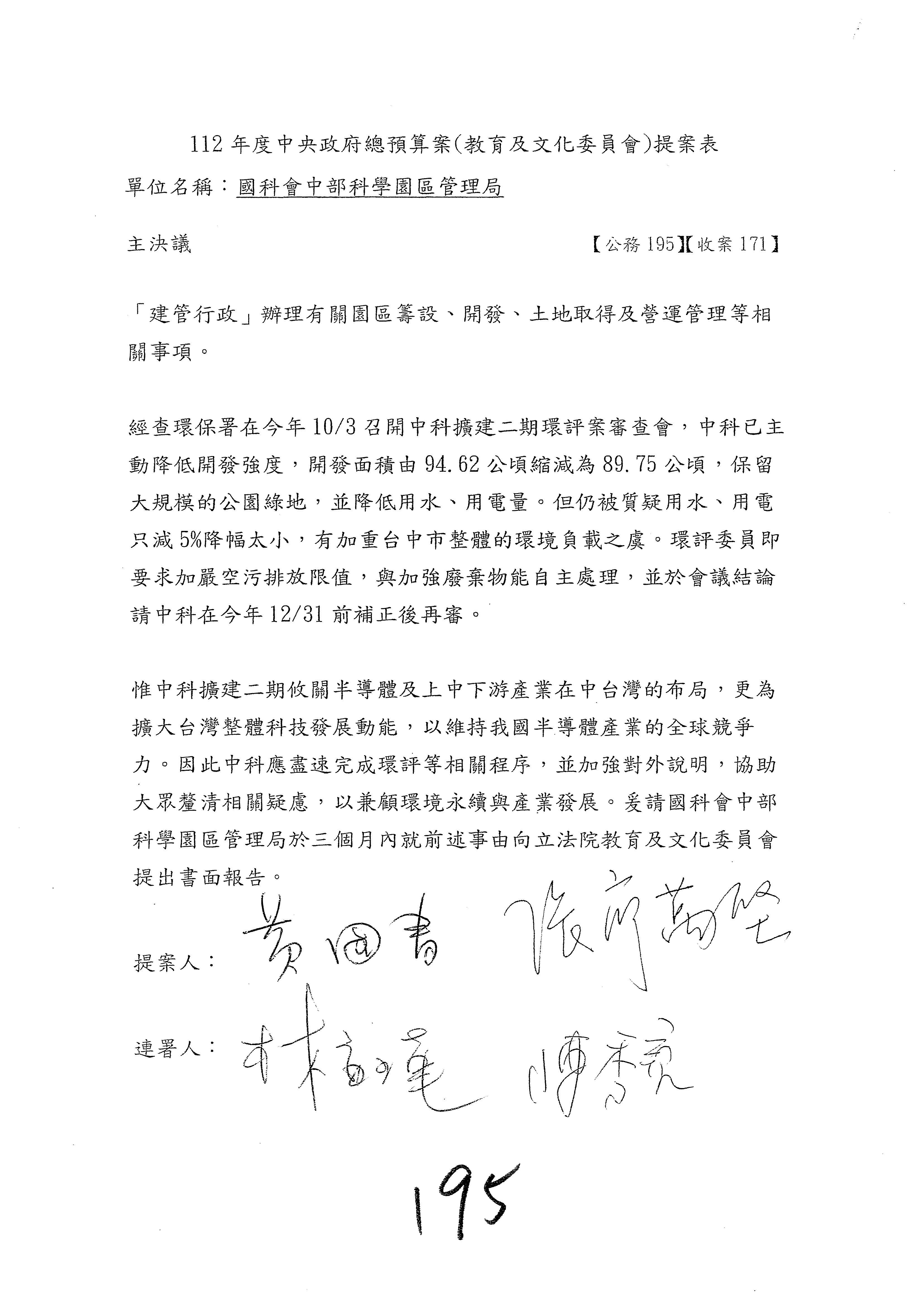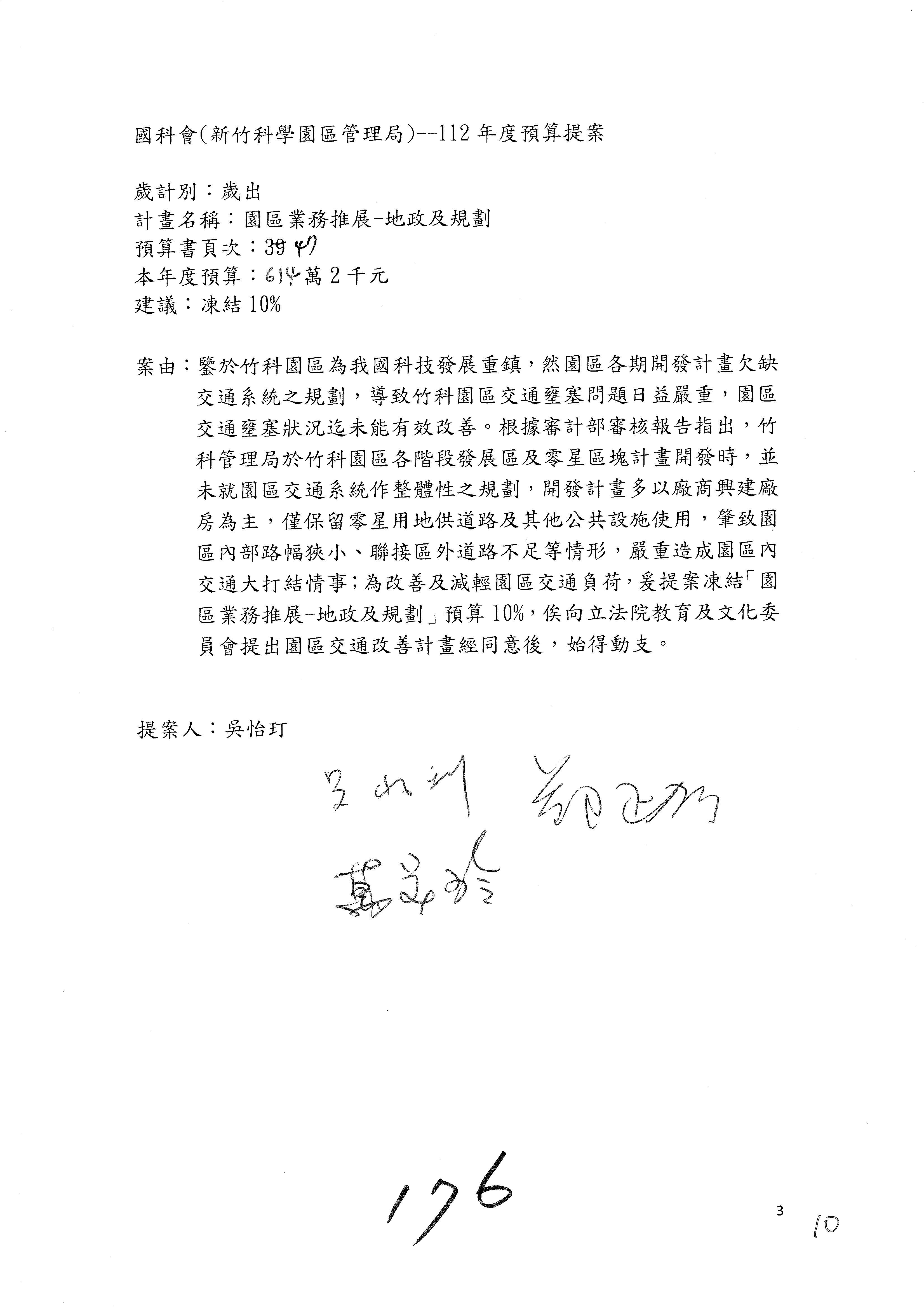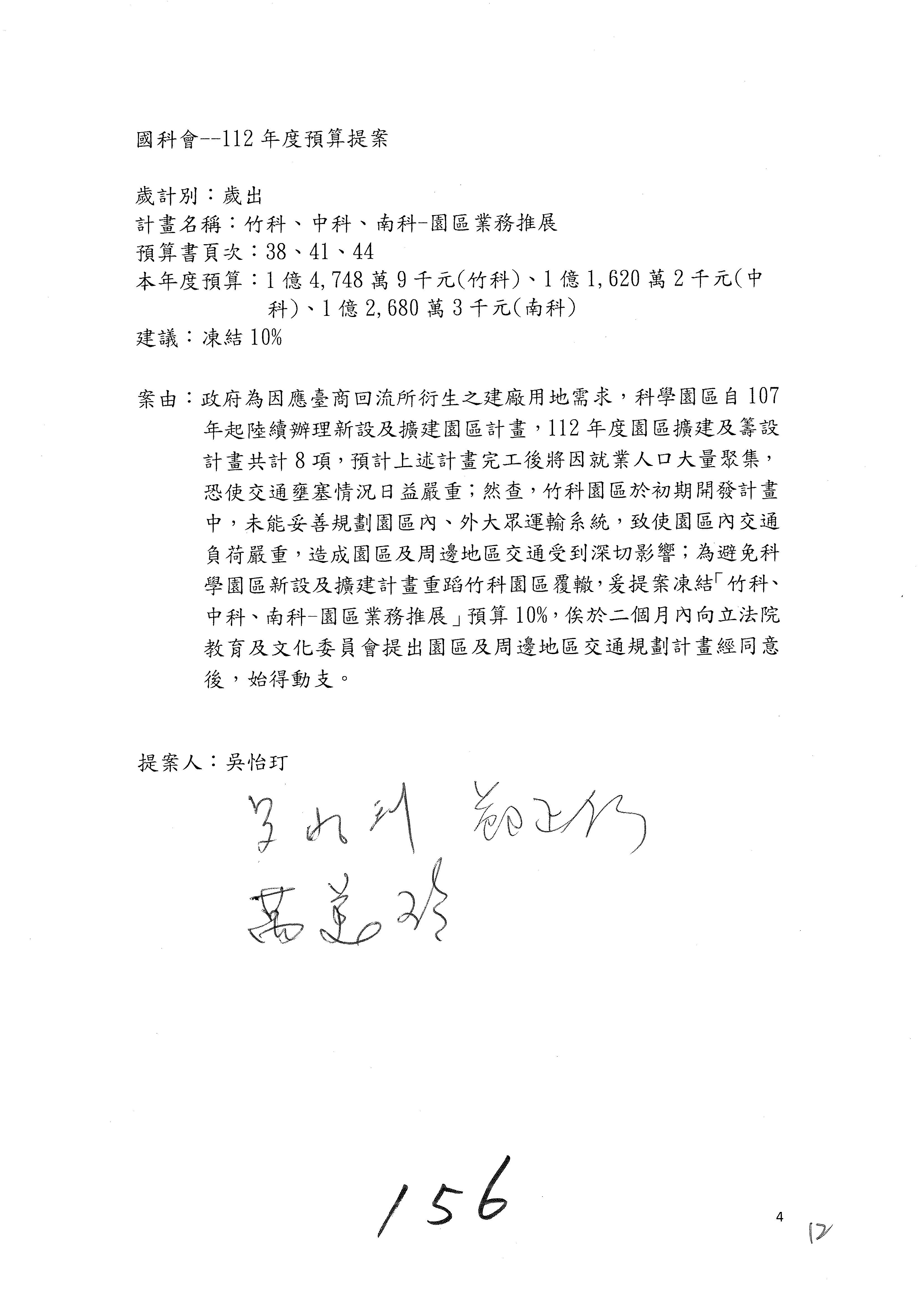 黃委員國書:你們列的十項重大公共建設計畫中,曾辦理計畫修正的項目,比例還滿高,高達七成,但修正計畫中增加的經費超過100億元的還不少,竹科增加六百多億元、南科增加六百多億元、中科增加五百多億元,中興園區籌設計畫經費減少了四十幾億元,所以你們要不要去檢討一下各個科學園區預算籌編的妥適性,固定資產建設改良擴充這一筆預算,你們應該要去做妥適性的檢討,以上是我的意見。